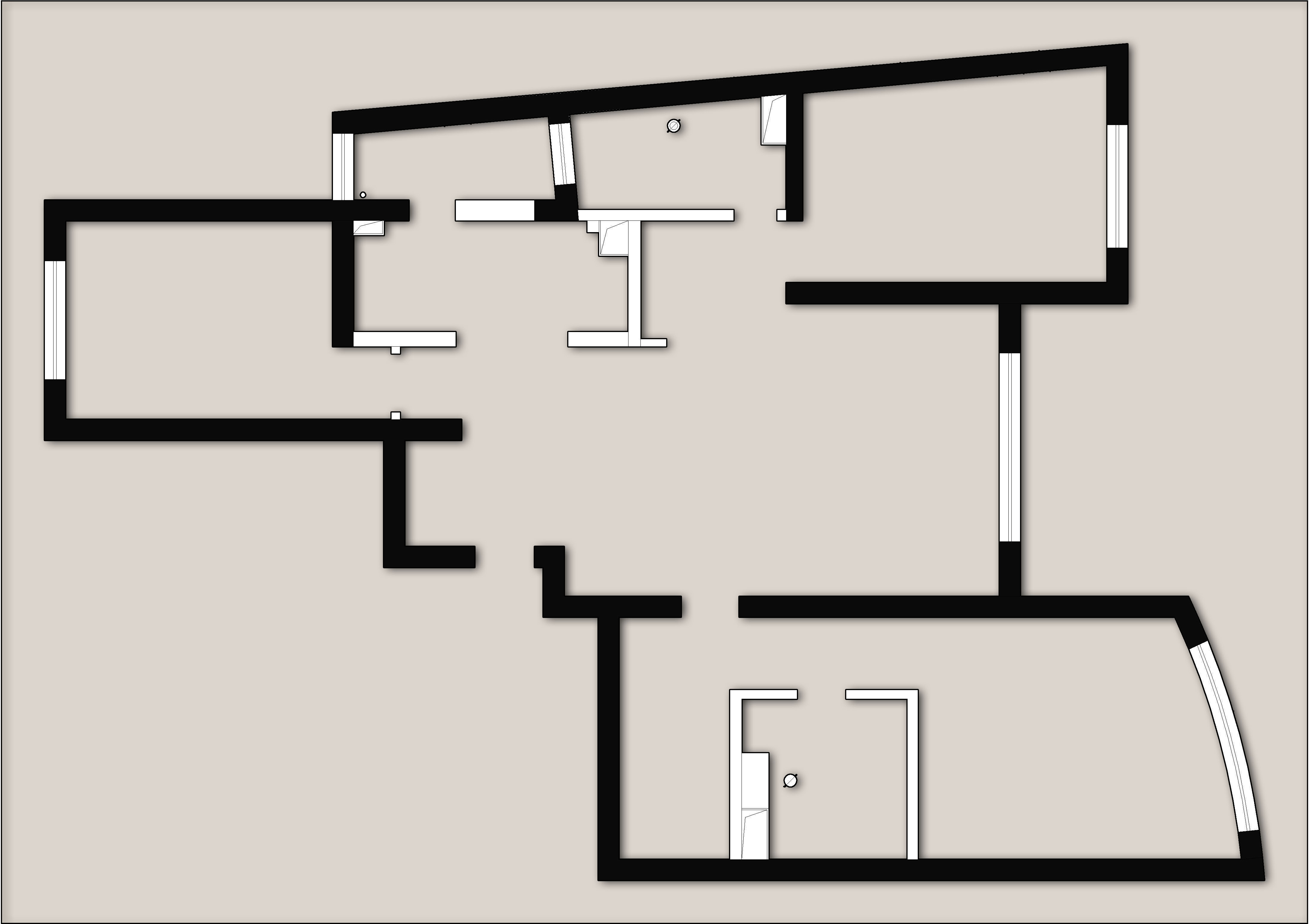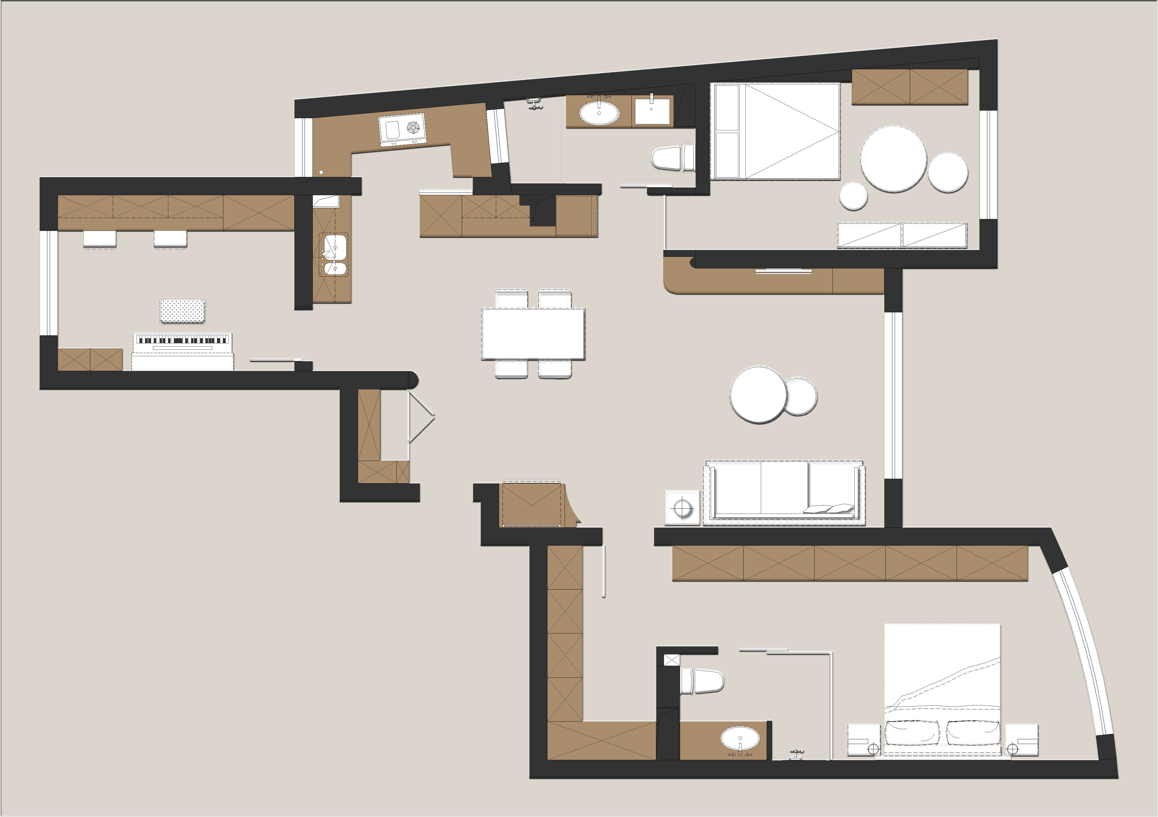 如图所示,这是一个高阶版不规则“手枪”户型。 私区居两端,公区站中间,虽然每个独立空间的面积都不小,但问题也相当棘手。 ① 进门即对厨房。 ② 门洞较多,更显闭塞。 ③ 没有餐厅,餐桌摆在入口右侧的拐角处。 ④ 阳台窗户很小且朝北,几乎没有阳光直射。 ⑤ 厨房卫生间都属于暗室,光线很差。 因此,不仅需要解决以上客观存在的问题,还需要增加大量的储物空间,以满足一家三口越来越丰富的生活日常。