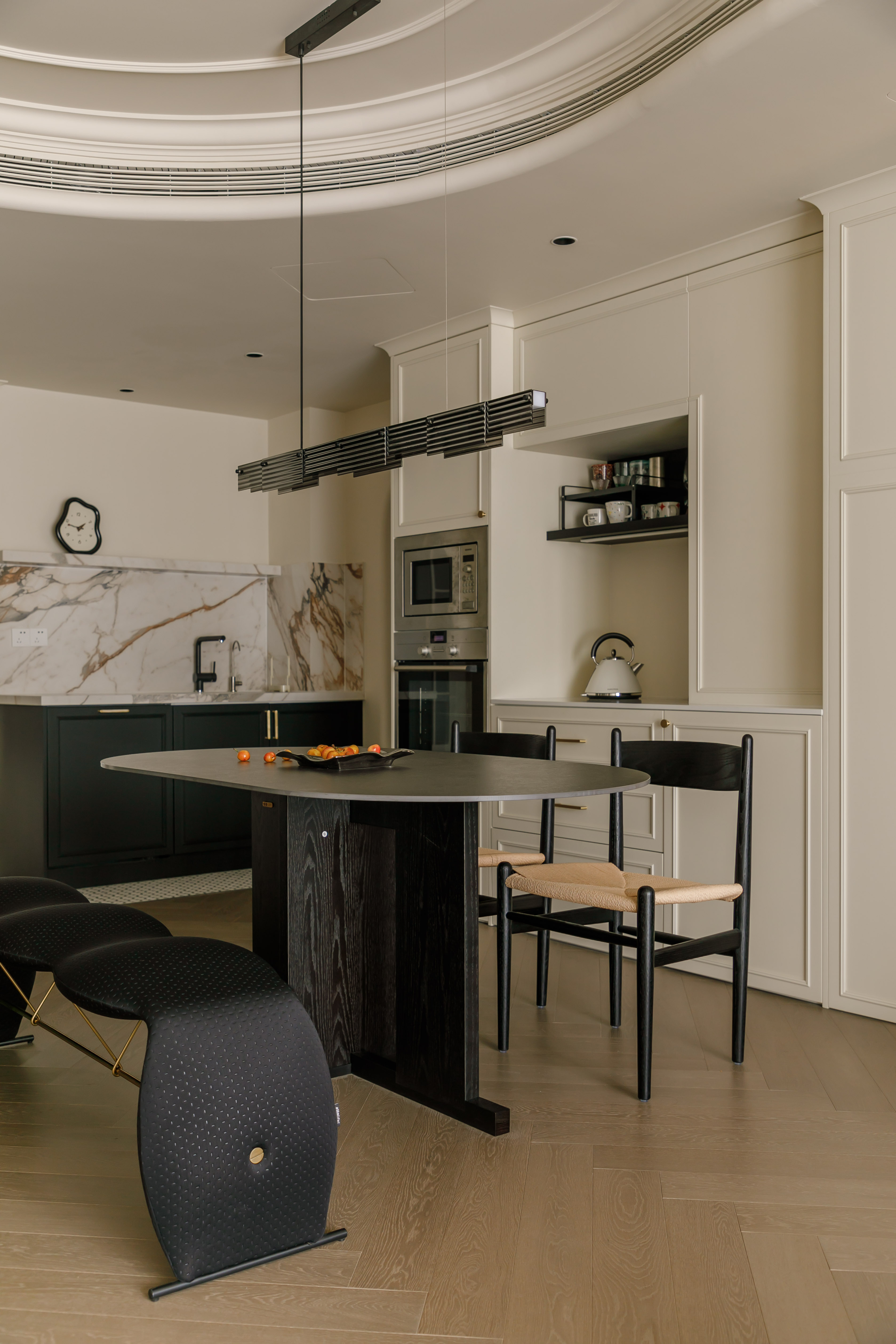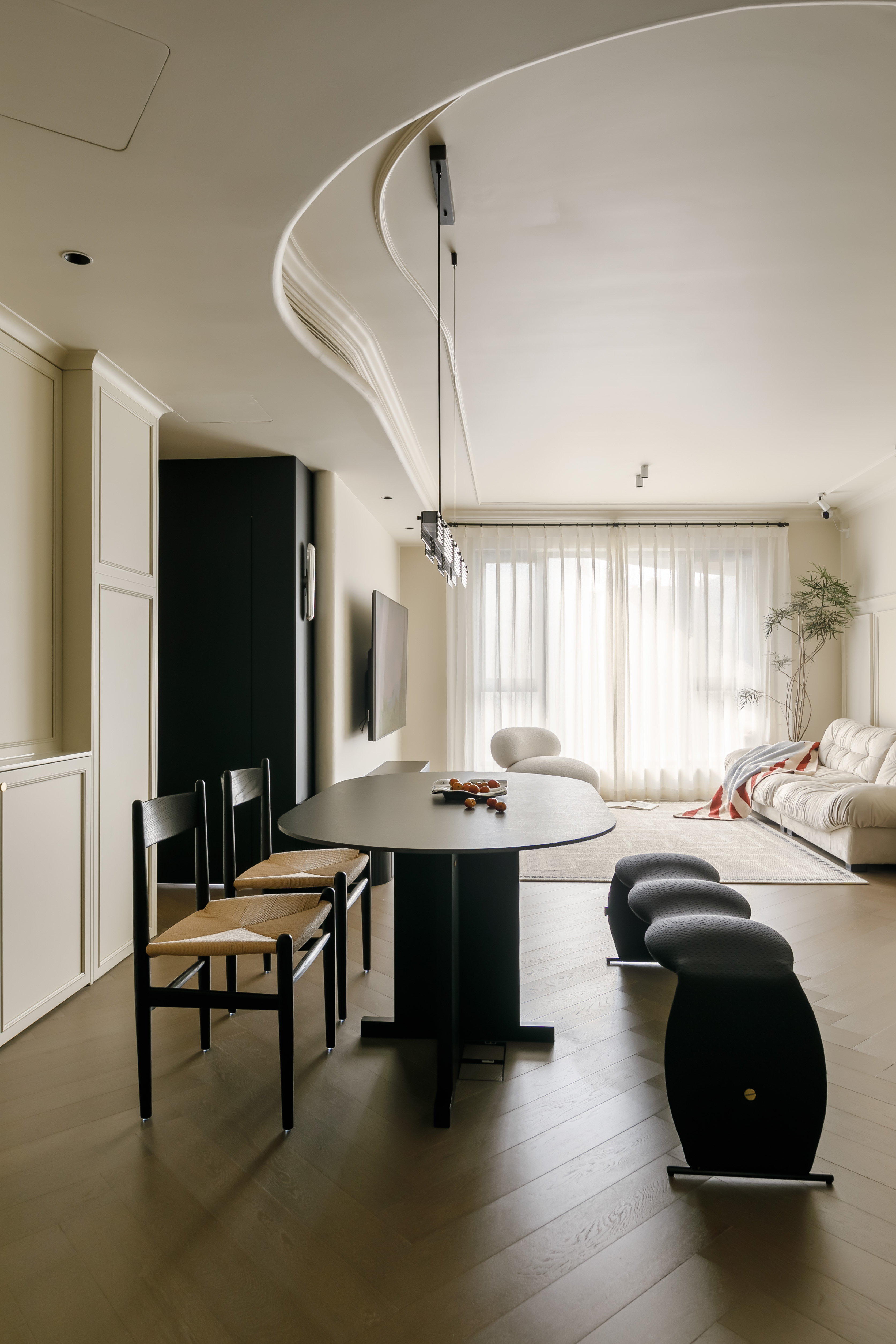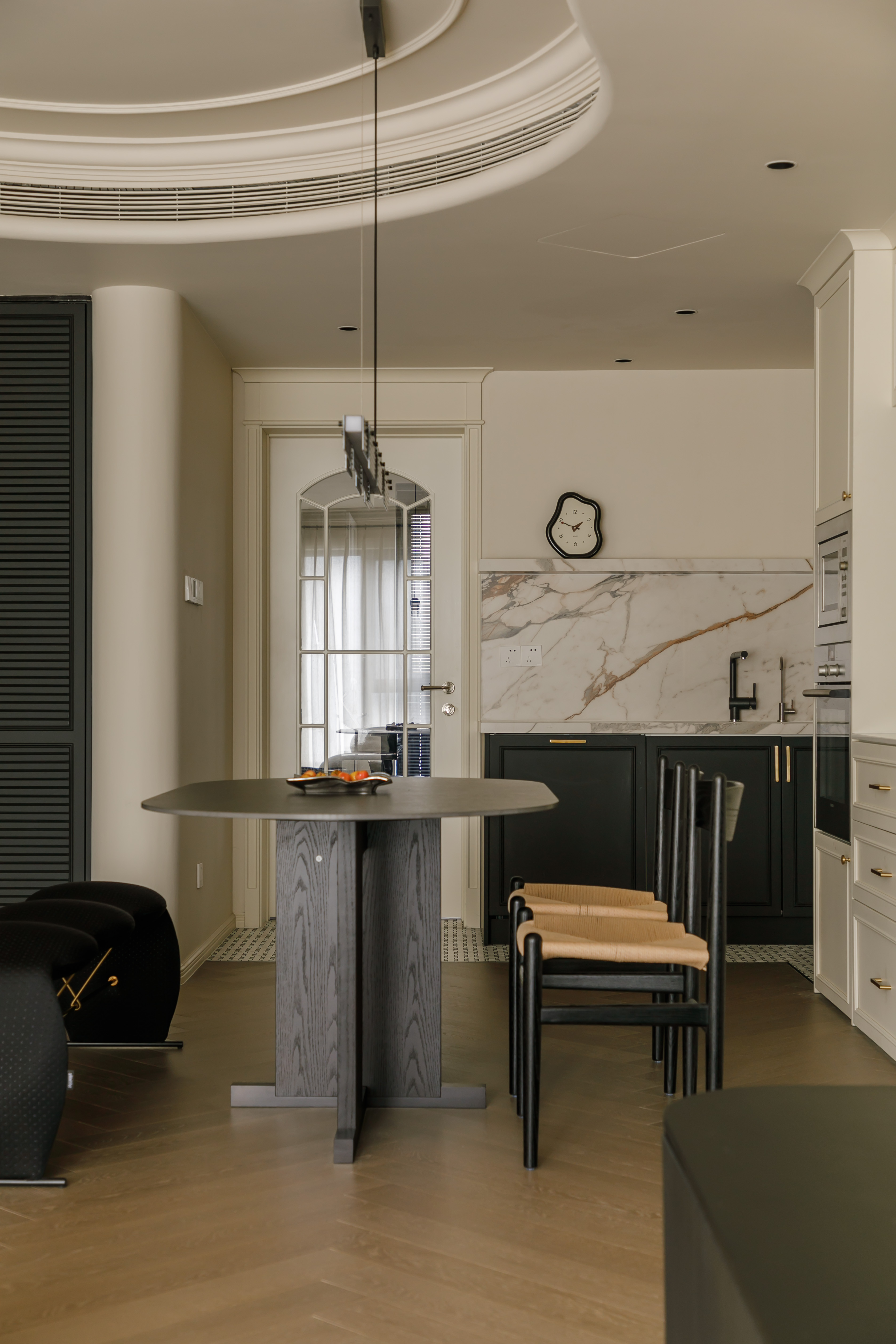 弧形的结构带来空间形体上的沉稳流畅性,墙顶统一调制的奶白底色也给空间带来温润的质感,水吧上的天然纹理岩板成为空间的点缀色,书房木框玻璃门与餐桌椅在这里都成为了彼此的对景,生活的场景似乎在此变得温馨而精彩。