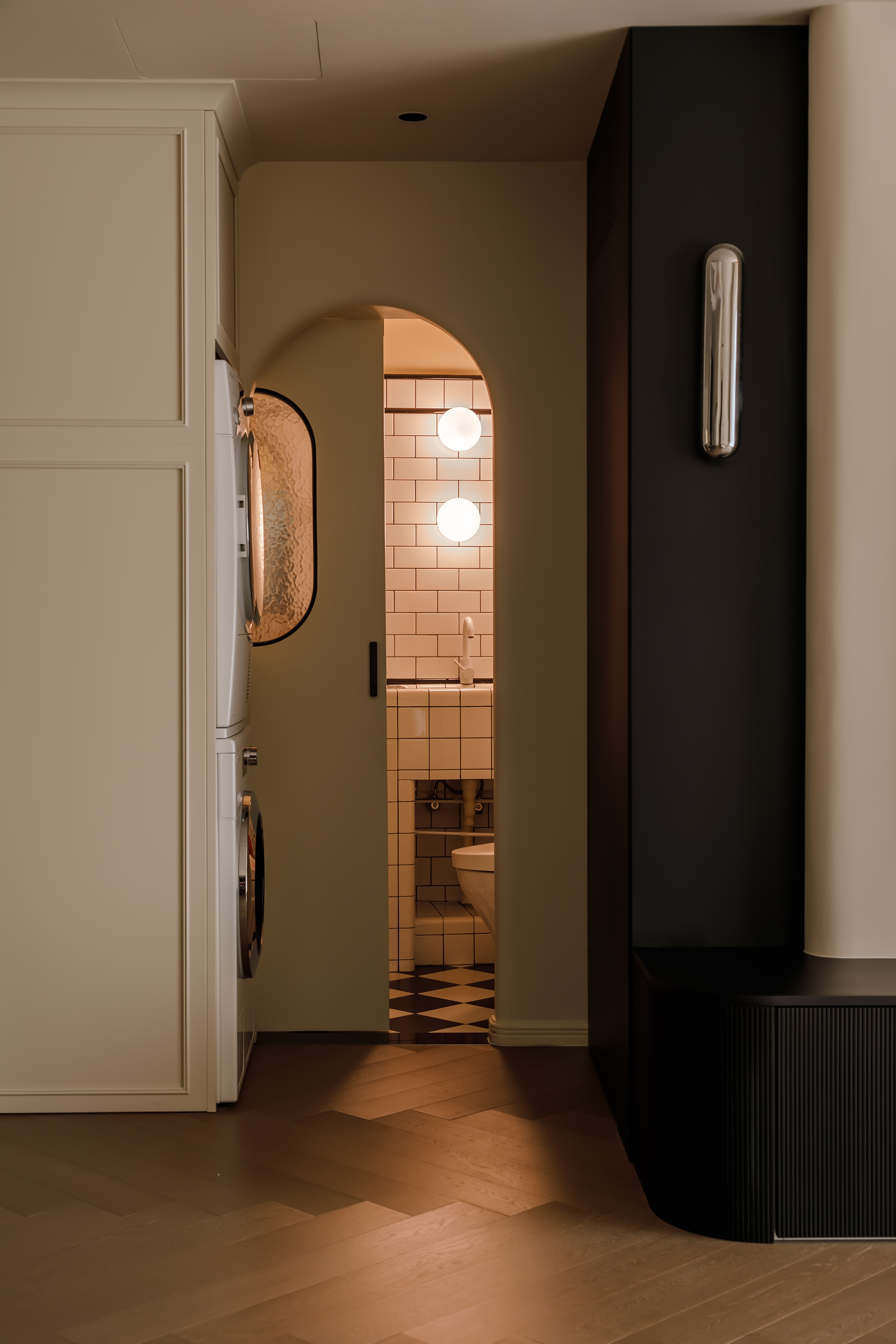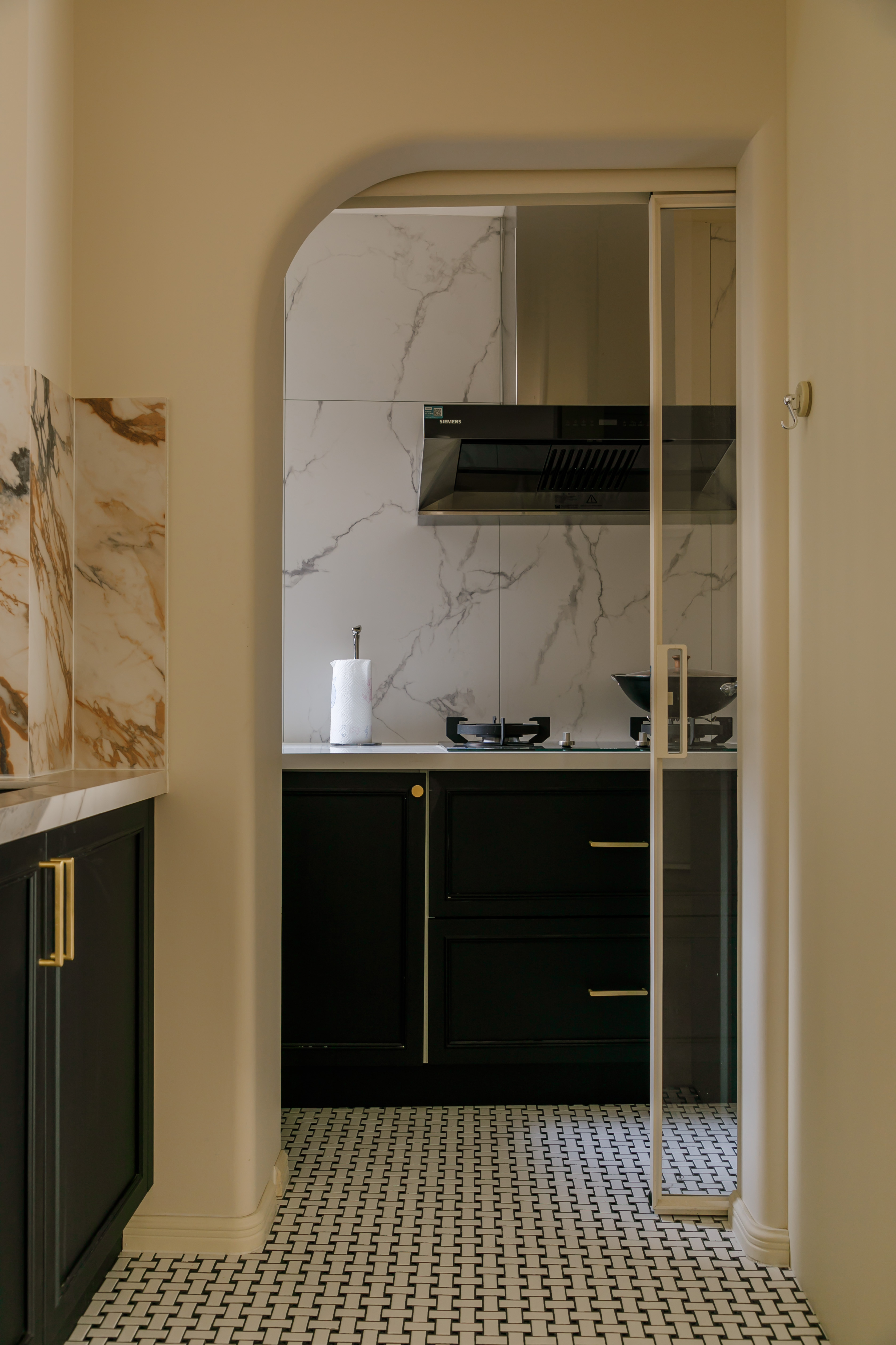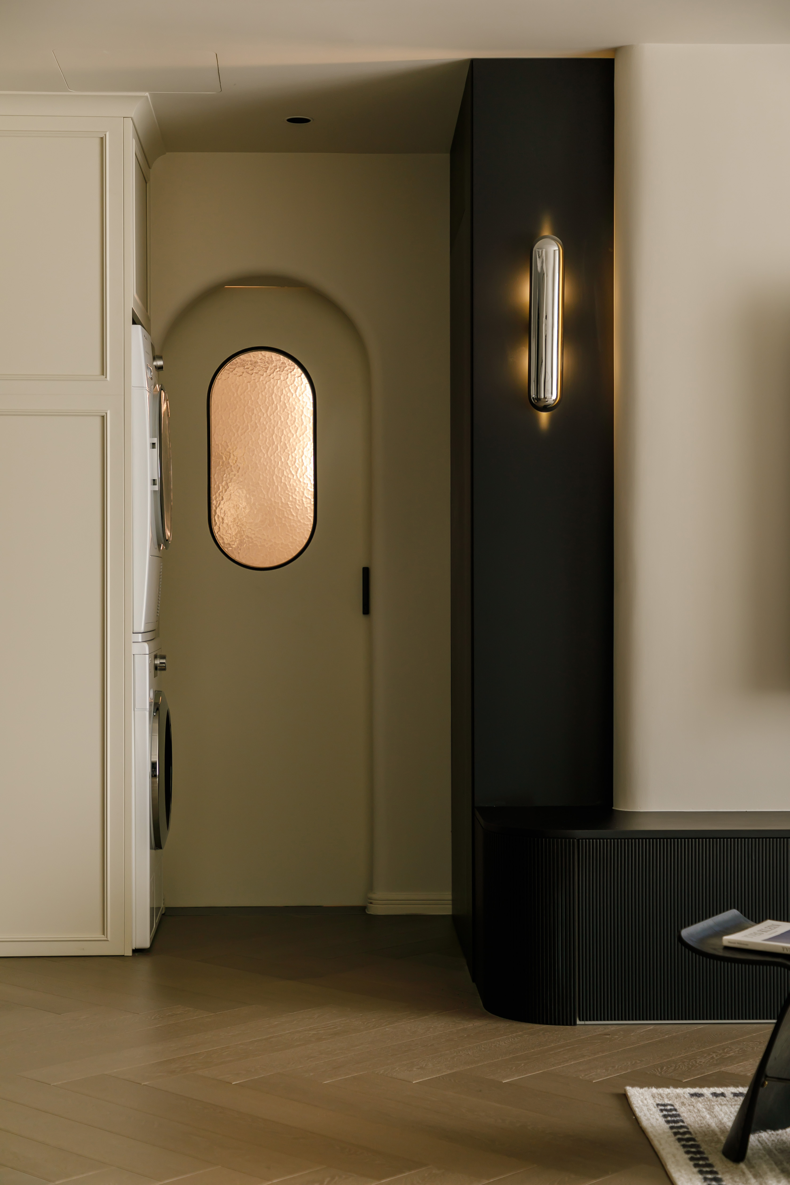 厨房门洞的半弧形和墙面倒圆角处理,再一次激发出空间现象,呼应着空间主题。玻璃推拉门隐藏其后,隔出了若隐若现的厨房光景。将厨房移至北阳台后,不仅满足了屋主对厨房的全明需求,也将空间细节轻松拿捏。