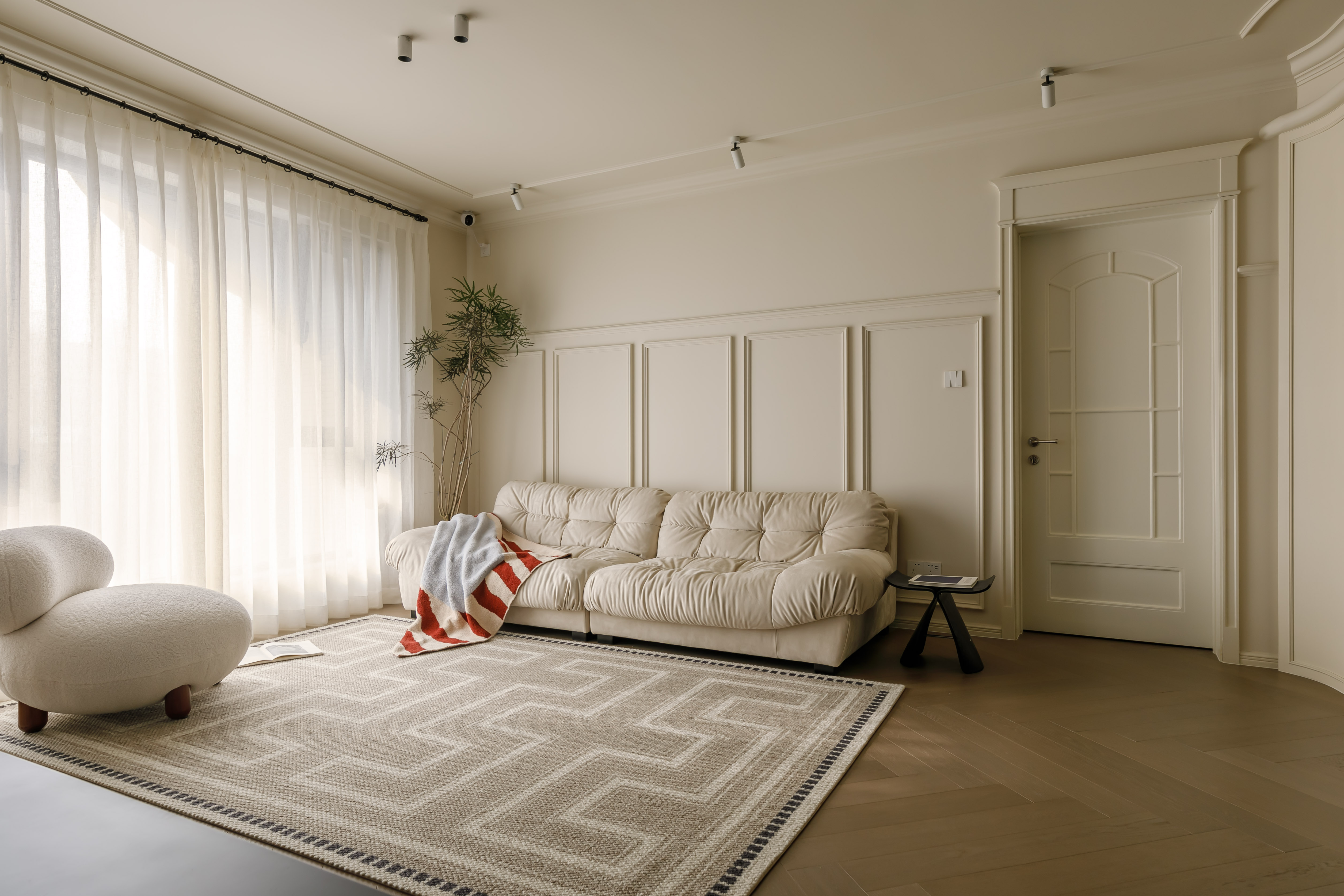 在角落里,摇曳的绿植为空间注入了生机与活力。中古茶几、半高石膏线条和精致的法式门头,这些简单的元素足以构成一个温馨的角落。大面积的奶白色,通过原木地板的衬托给空间带来温润的质感,红色条纹毯成为空间的点缀色。
