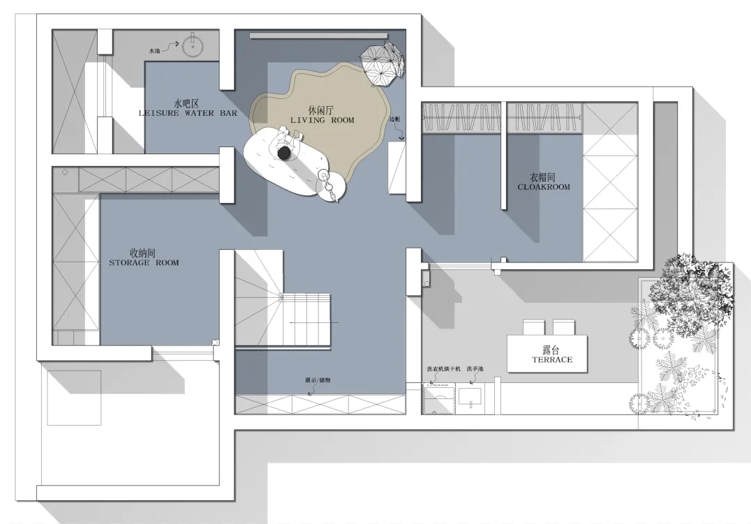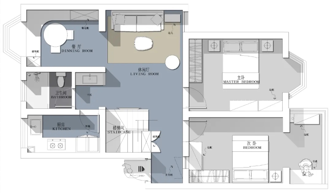 原始结构有很多是承重墙不可以做调整,但是在现有人口结构以及以后还有宝宝的环境下我们还是保留楼下2间卧室,楼上1间多功能卧室的格局。并将原来的一间卧室打开作为餐厅及休闲茶室,将原来楼梯的位置做了调整及优化,将楼梯置于入户位置,并利用楼梯下的空间给业主设计了入户储物间,后期可以收纳小朋友的车具等物料,在二楼我们设计了一个家庭厅做为业主娱乐影音使用,一间茶水吧台作为娱乐区的功能补充,以及一间功能性的衣帽间和多功能的收纳卧室。