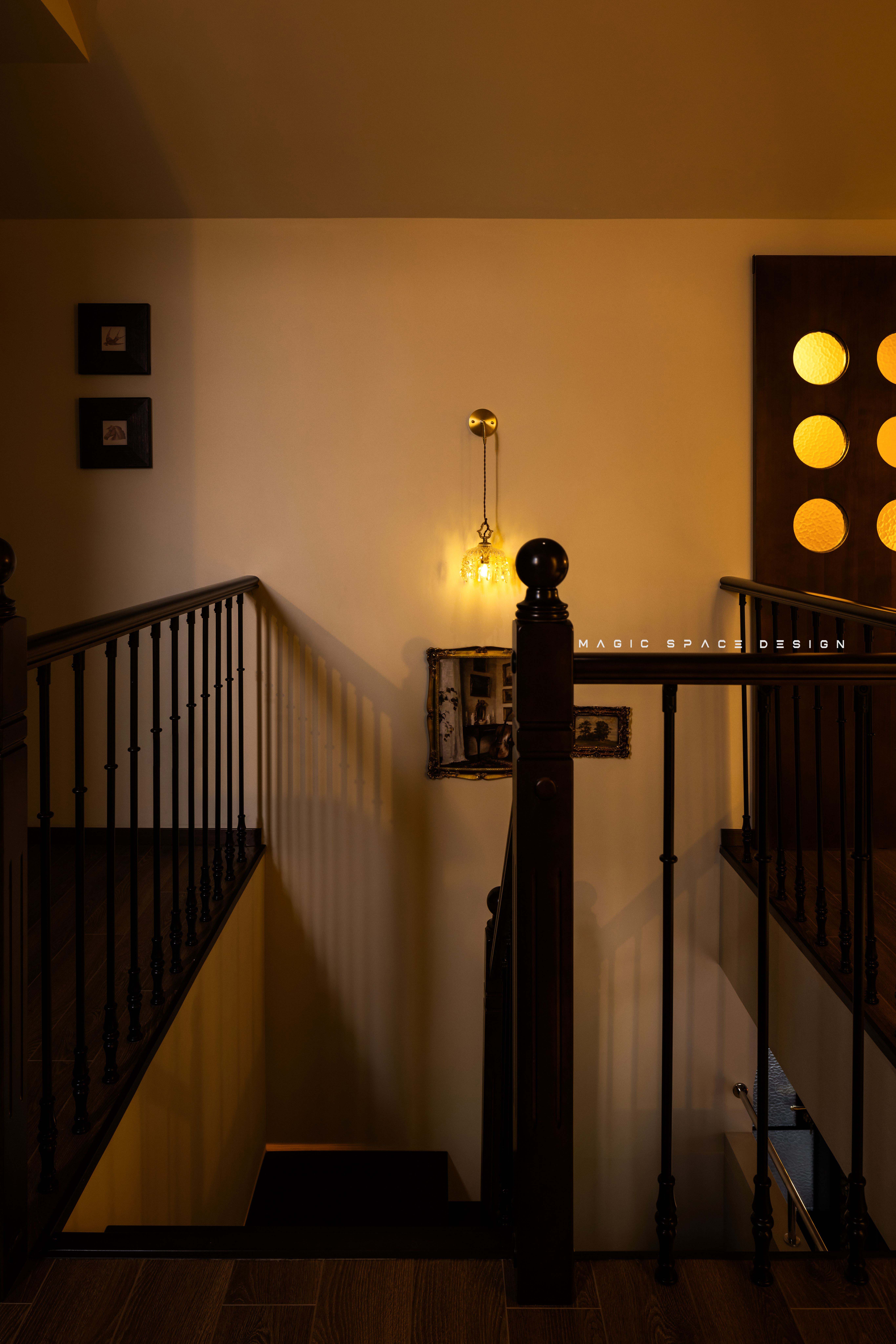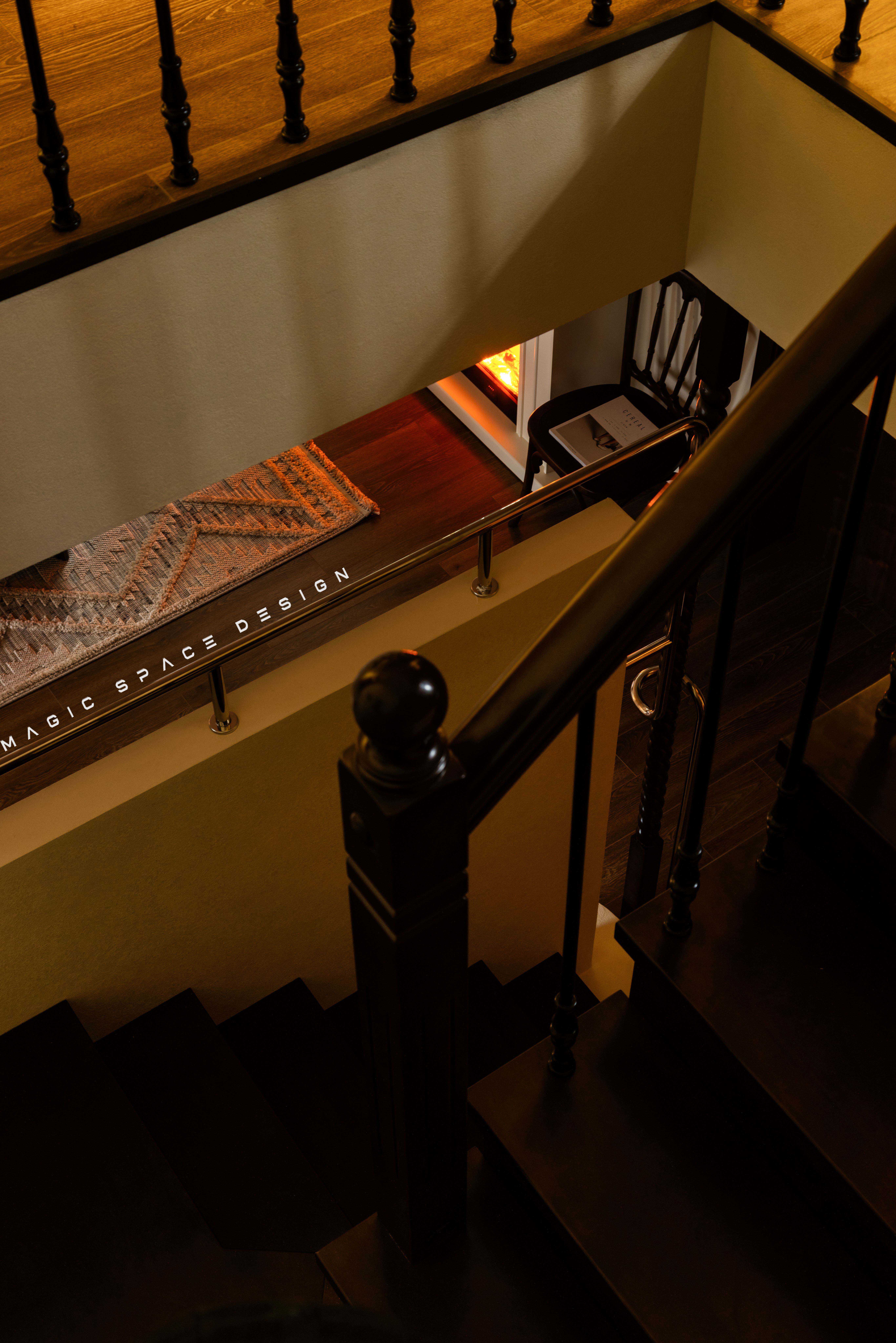 在材质的选择上我们没有一味的追求统一,在温润的木质材质跟艺术漆的肌理感外增加了部分金属的点缀,比如楼梯处的造型原色不锈钢扶手,金属造型门,金属入户玻璃屏风造型,漆面墙顶同色,让空间材质不至于全是木质的燥热,希望通过这些现代的硬一点的质感让空间再像公共空间一样让人产生少许的距离感。