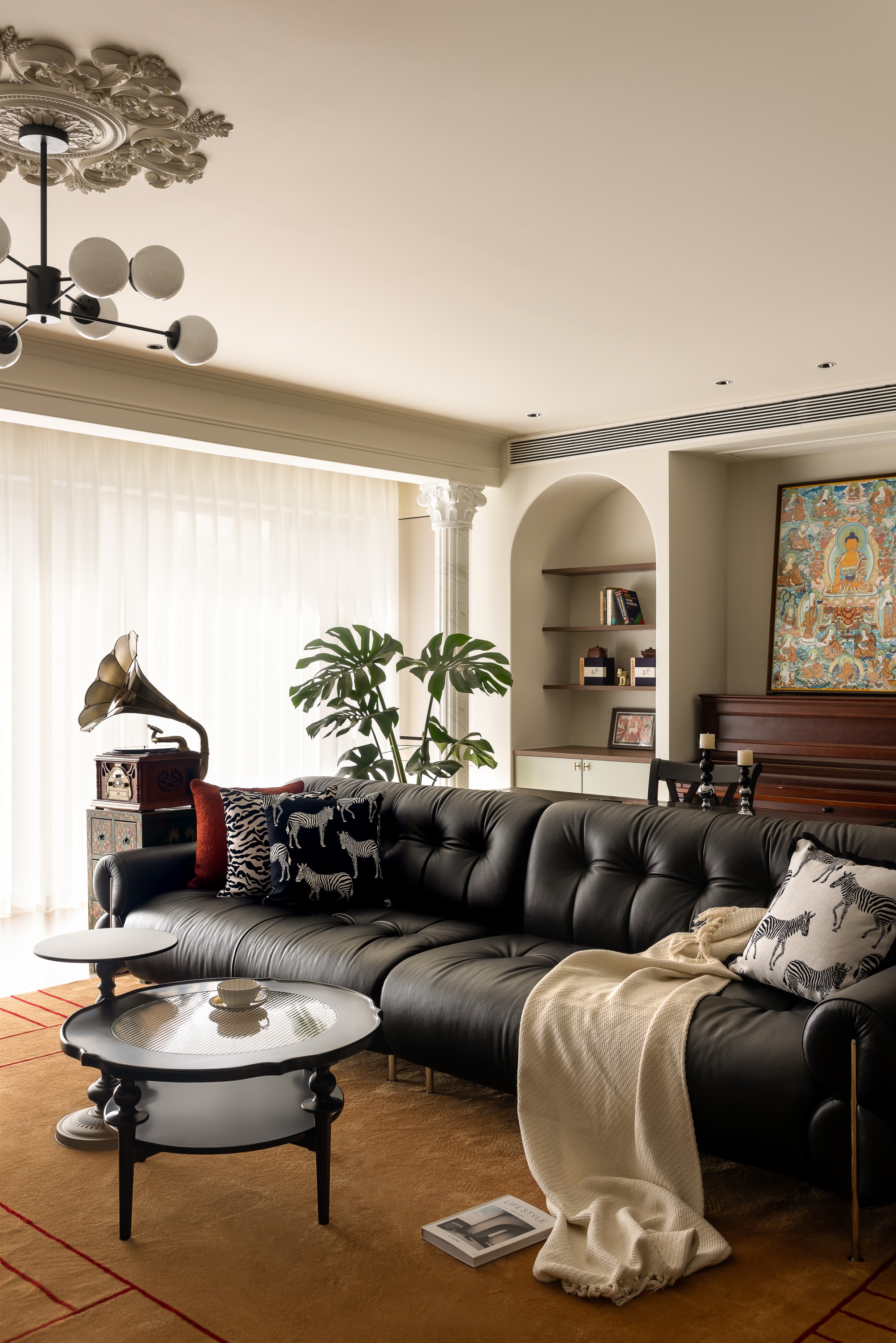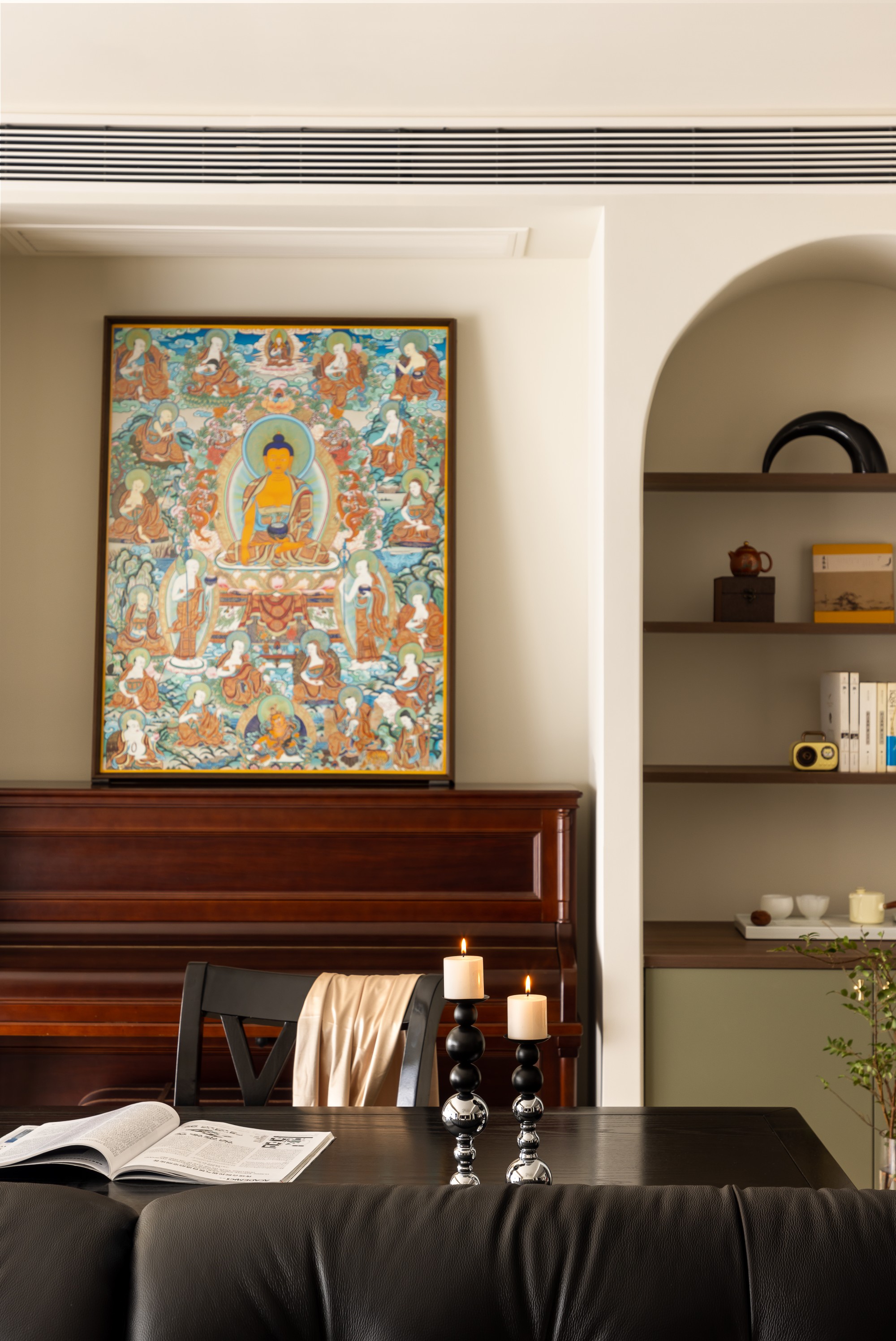 客厅的电视背景墙通过圆弧转角衔接阳台,左侧造型通过比例分割,平衡视觉重点。 客厅的拱形璧龛书架,钢琴,唐卡,将整体的法式中国风体现的淋漓尽致。