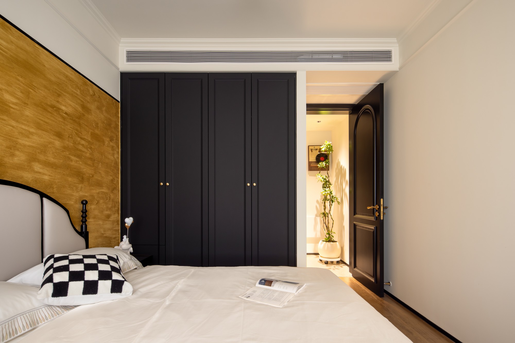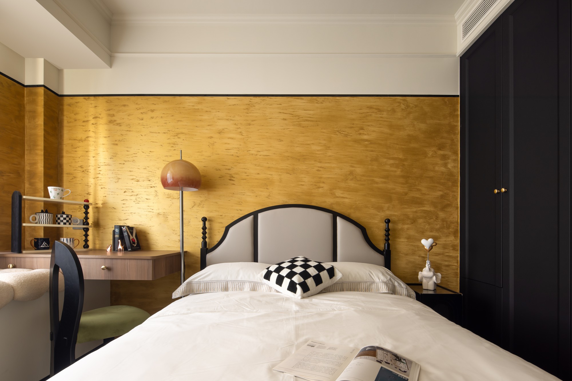 次卧:作为客房,大胆尝试撞色设计。复古金色艺术涂料背景墙与红丝绒窗帘,搭配黑白色系的衣柜与床品,兼具雅致与轻盈感。全部灯光设计:多层次的照明设计,通过主灯、射灯、落地灯,营造温暖的氛围。
