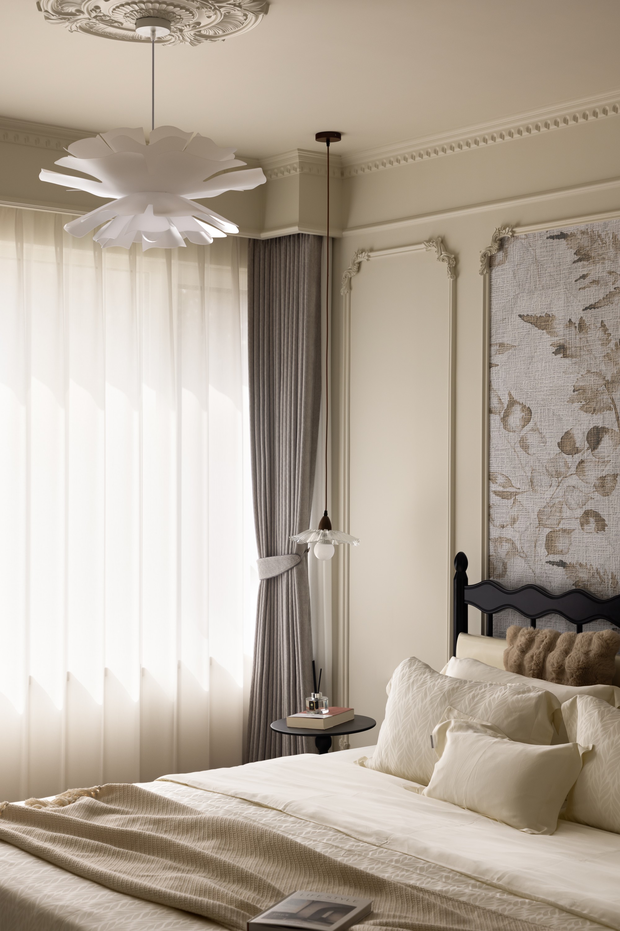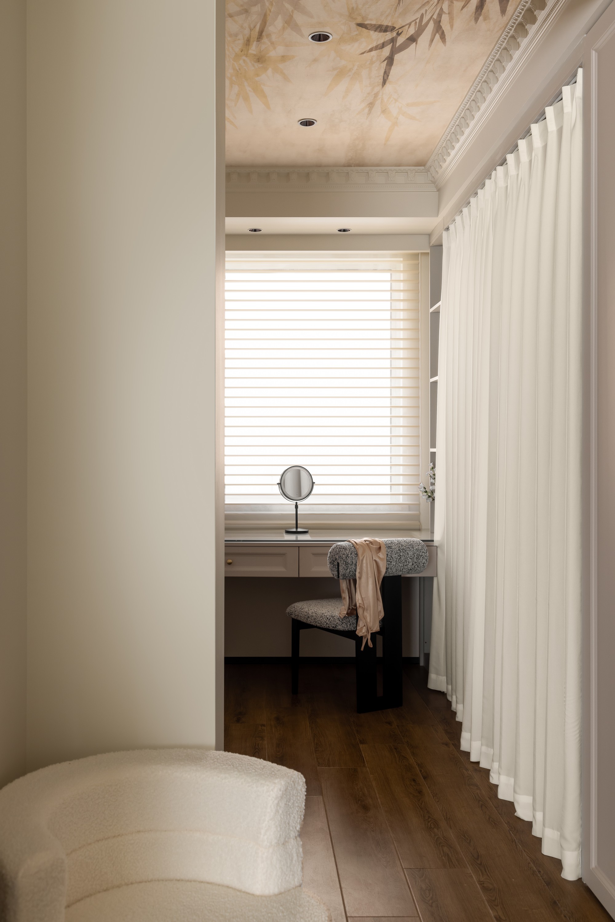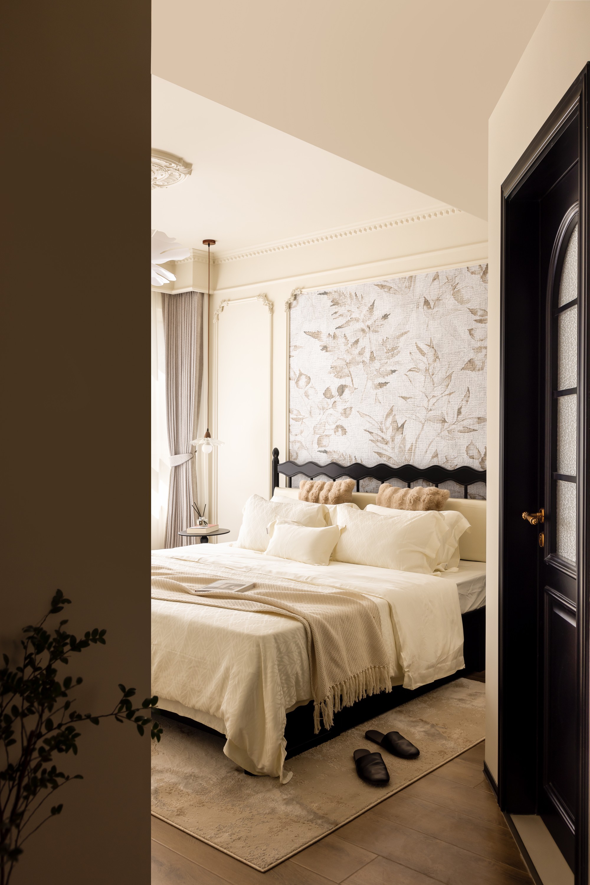 扩大主卧门洞,拱形对开门设计,让回家的仪式感拉满。 主卧床头采用不对称设计,弱化户型的L形窗户,让整个空间得以平衡。主卧衣帽间顶面的竹子壁画搭配法式线条,将整体风格继续延续。