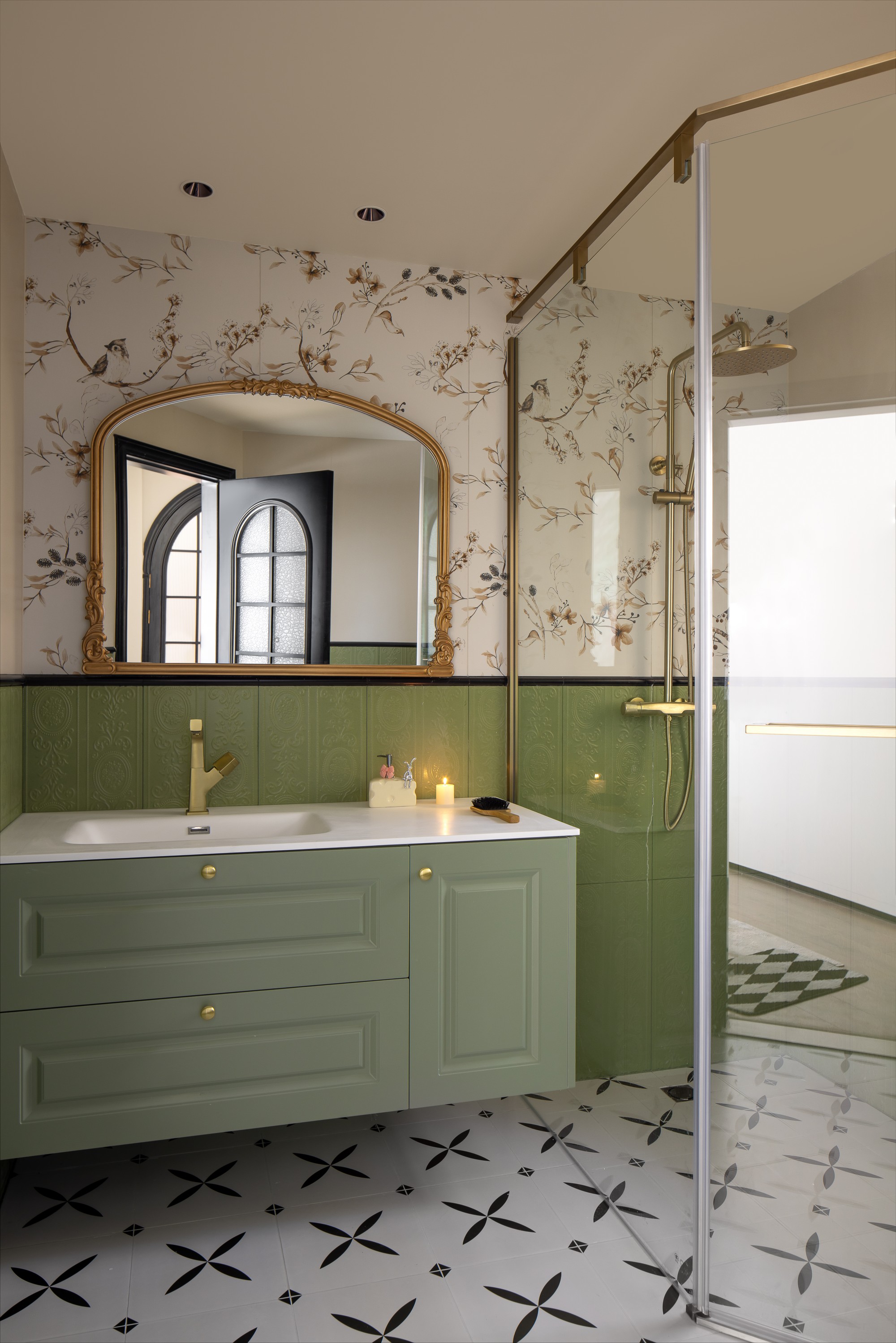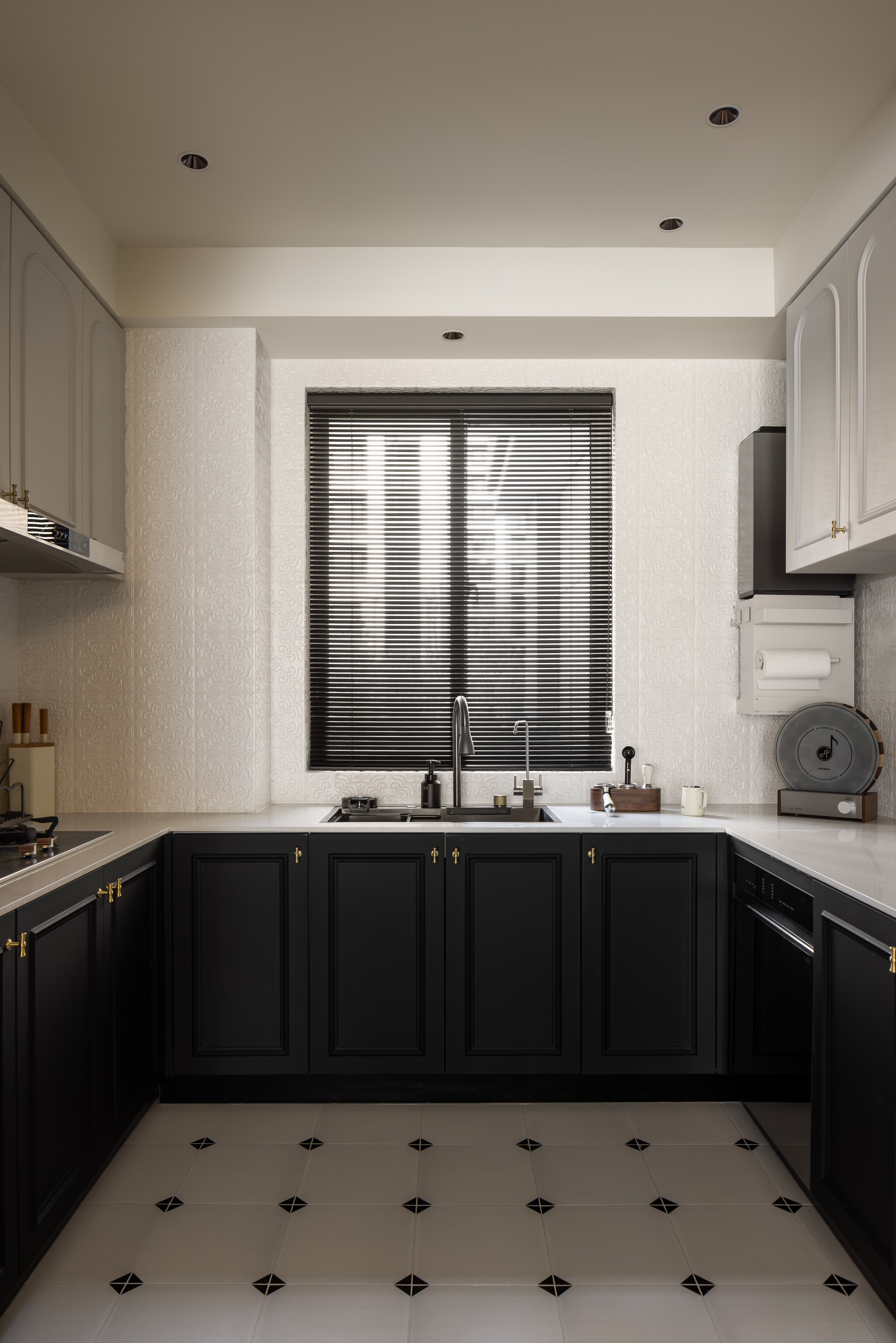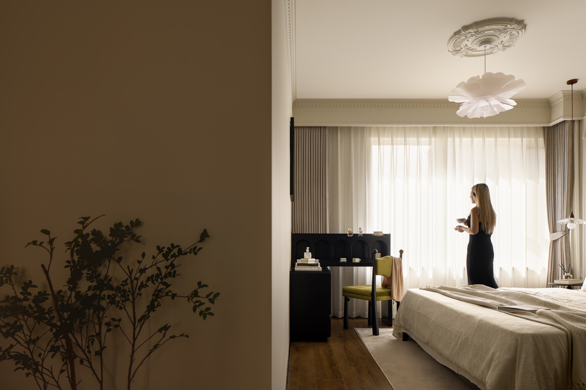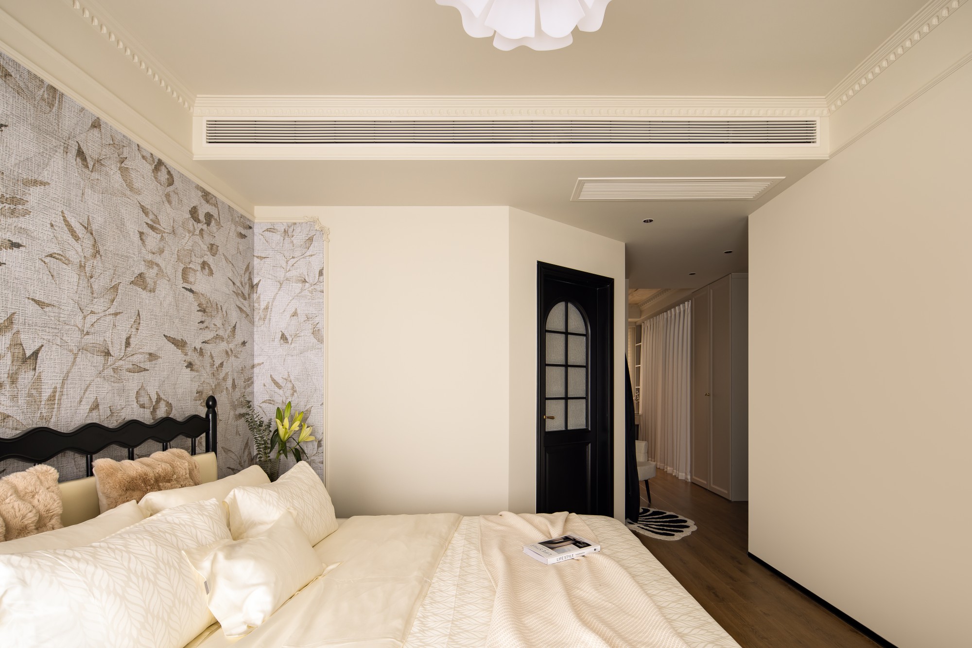 扩大主卧门洞,拱形对开门设计,让回家的仪式感拉满。 主卧床头采用不对称设计,弱化户型的L形窗户,让整个空间得以平衡。主卧衣帽间顶面的竹子壁画搭配法式线条,将整体风格继续延续。