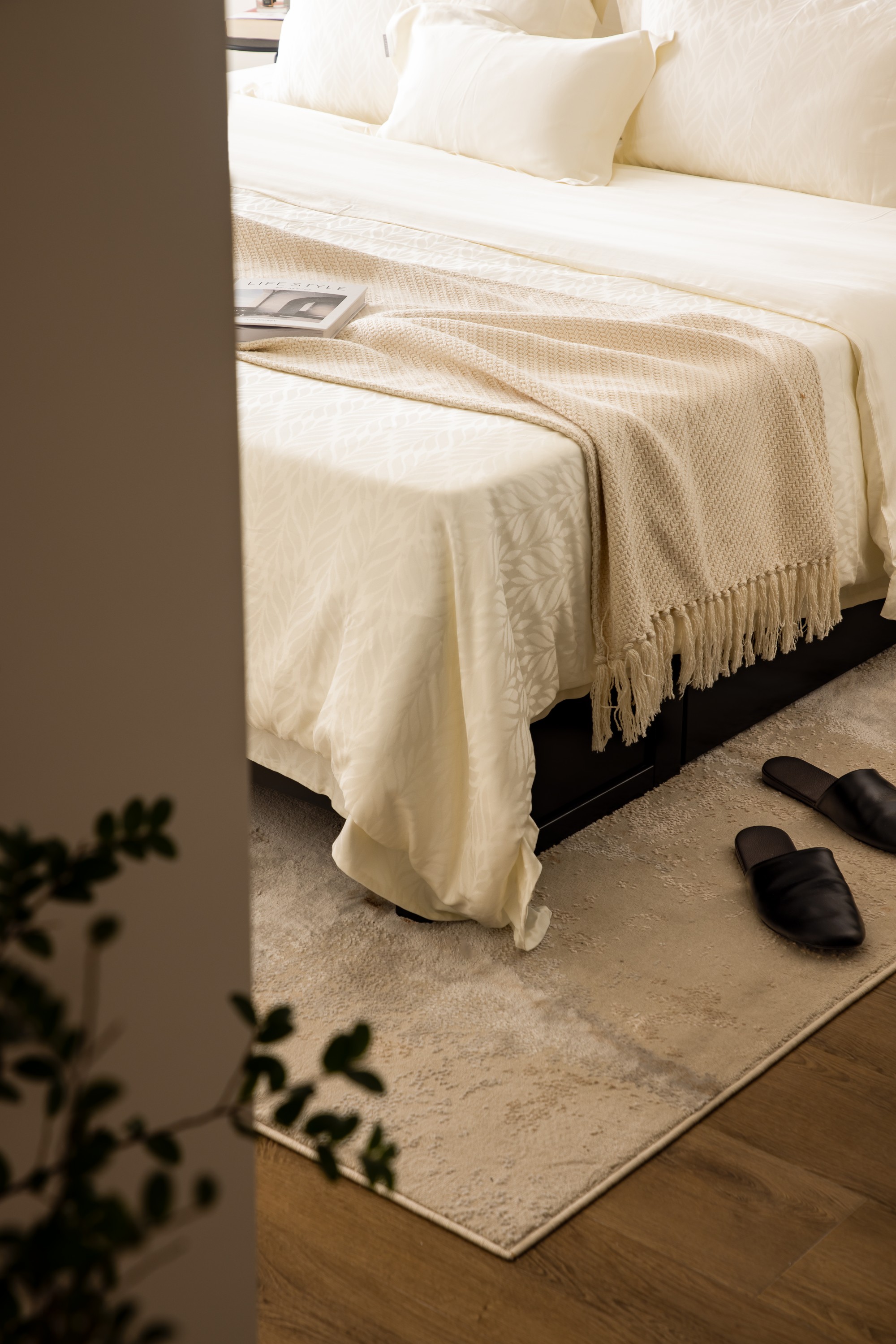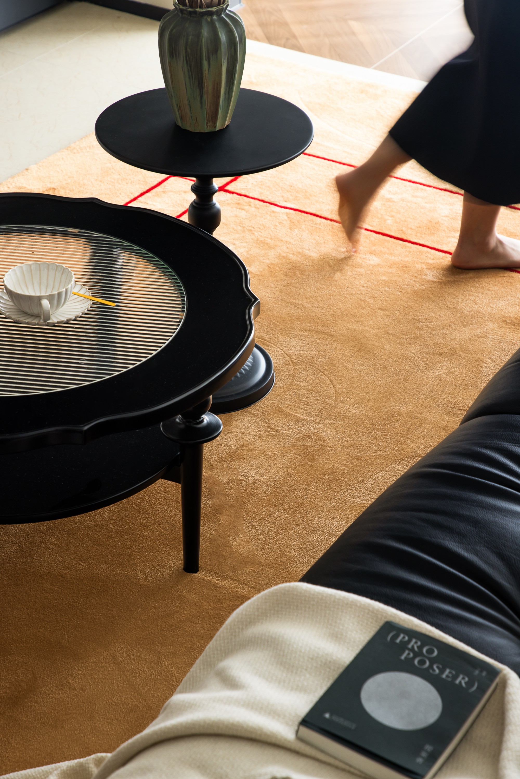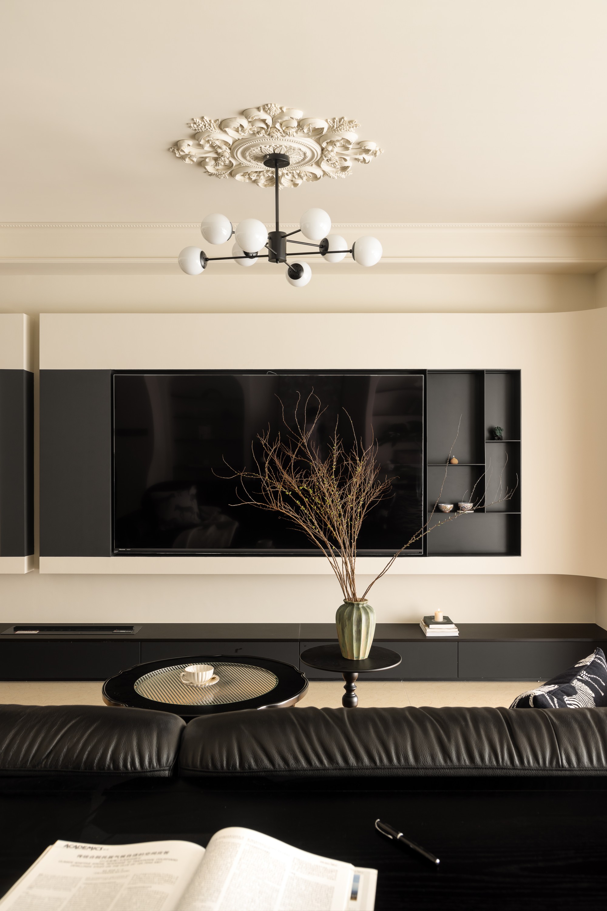 整体空间以奶油色调为环境色,着重于柔和的色彩打造空间。墙顶地均为奶油色系。点缀色采用中国传统色,大繎(客厅单椅、次卧窗帘)、竹青(璧龛书架、主卫生间)、古铜(地毯、次卧背景墙),局部的深色家具(沙发、餐椅、柜子)点缀。黑色皮质拉扣沙发,让典雅的空间增添了一丝摩登感。米白洞石和玻璃吊灯,提升餐厅的质感。衣帽间采用一半柜门一半纱帘的设计,纱帘的柔性质感和顶面的竹子壁画,让衣帽间这个功能性空间,也拥有了更多美感,既经济又美观实用。客厅的落地电视柜采用圆弧设计,除了和电视墙造型呼应以外,由于靠近走廊,也避免了容易磕碰的情况。