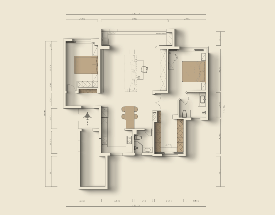 主卧:调整主卫生间门的朝向,消除正对主卧门的不适感。将北次卧和主卧打通,改成集睡眠区+卫生间+衣帽间于一体的套件设计,提高主卧的居住舒适度。