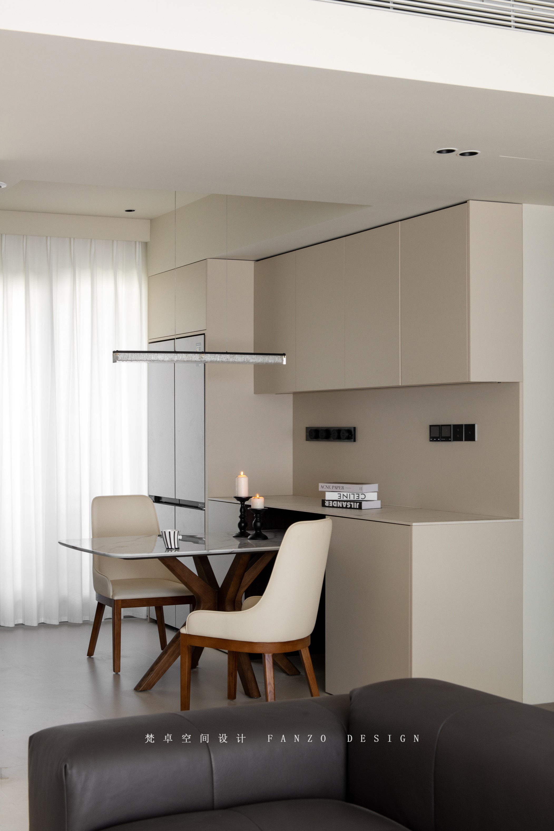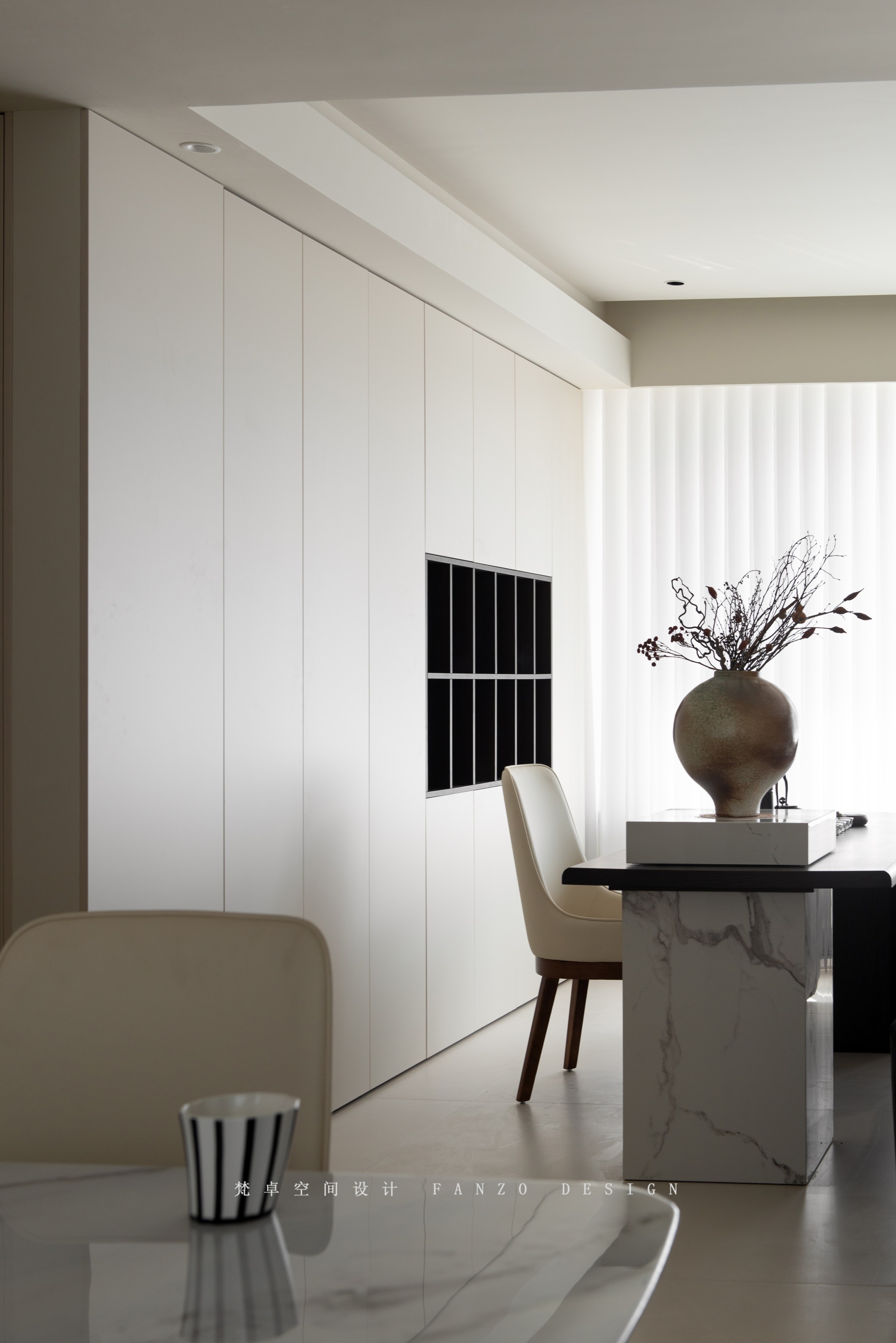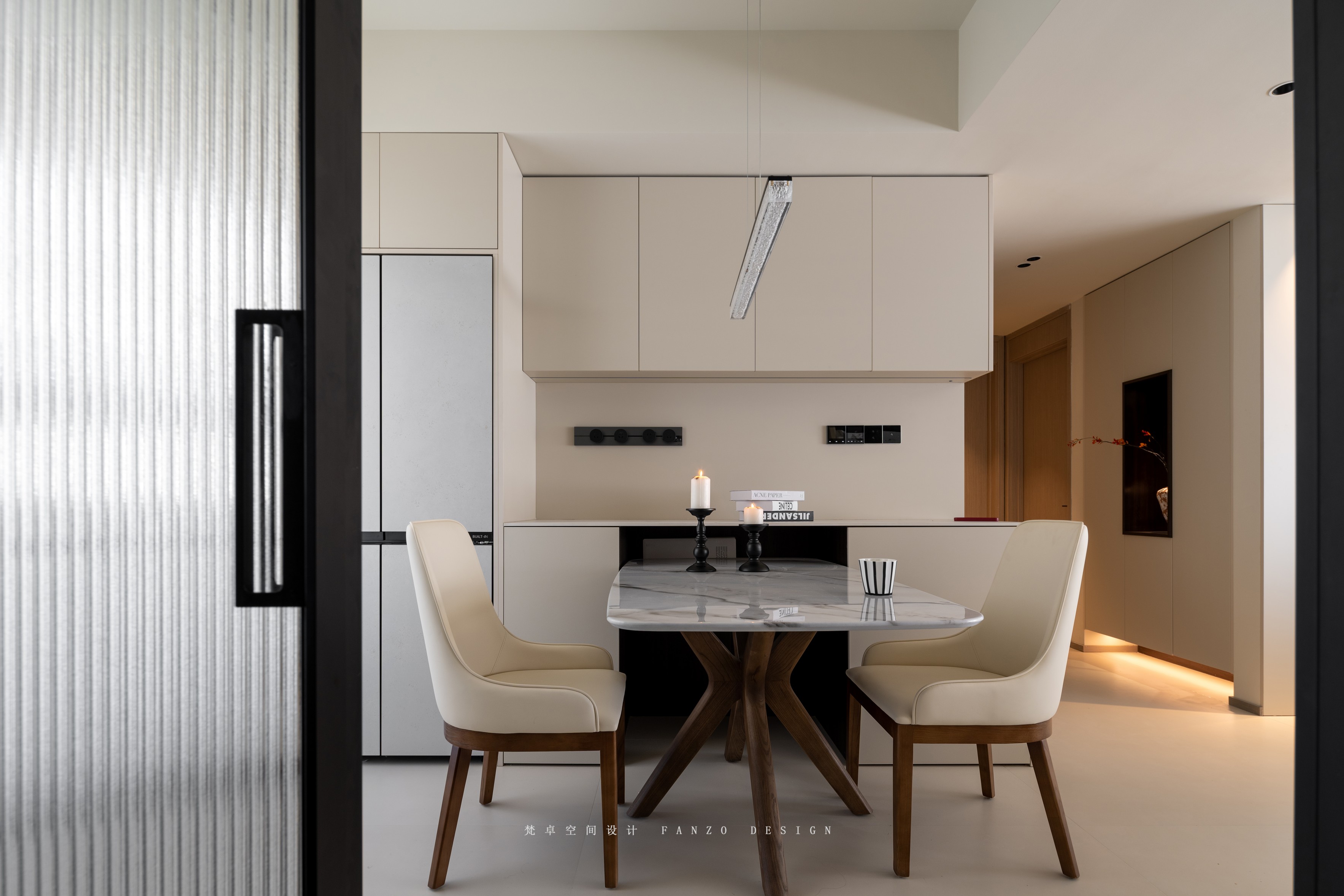 3.餐厨区:本套案例的难点则是在餐厨,需要容纳蒸烤箱,直饮机,洗碗机,冰箱等日常一系列小电器,原始交付标准则是为冰箱预留,我们将冰箱位置做了电器高柜,拆除了交付的柜门,将洗碗机内嵌,实现了业主对厨房的幻想,在将冰箱外移,餐桌则是做了可抽拉餐桌,解决多人用餐的需求,黑白色调的搭配,空间简约而不简单
