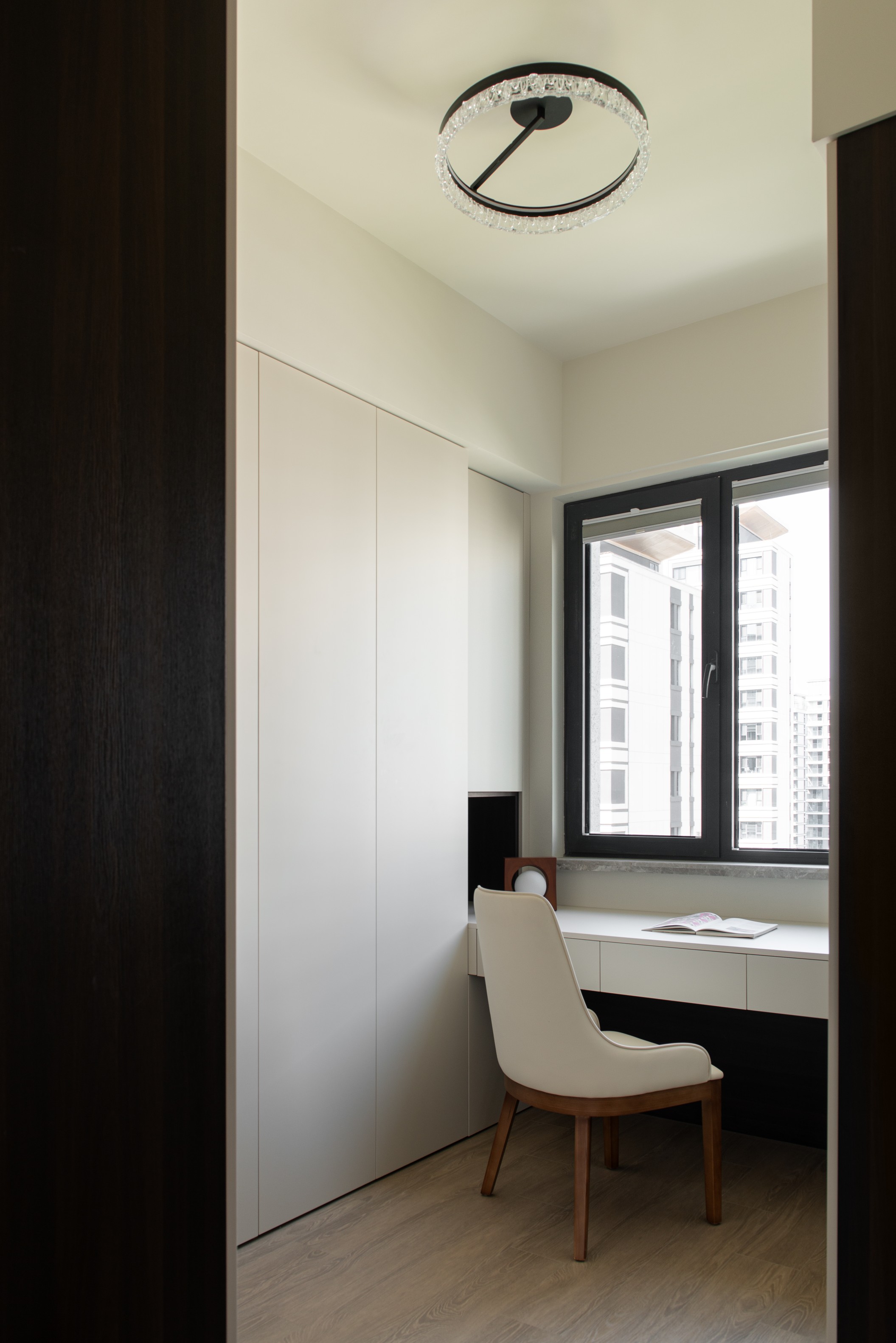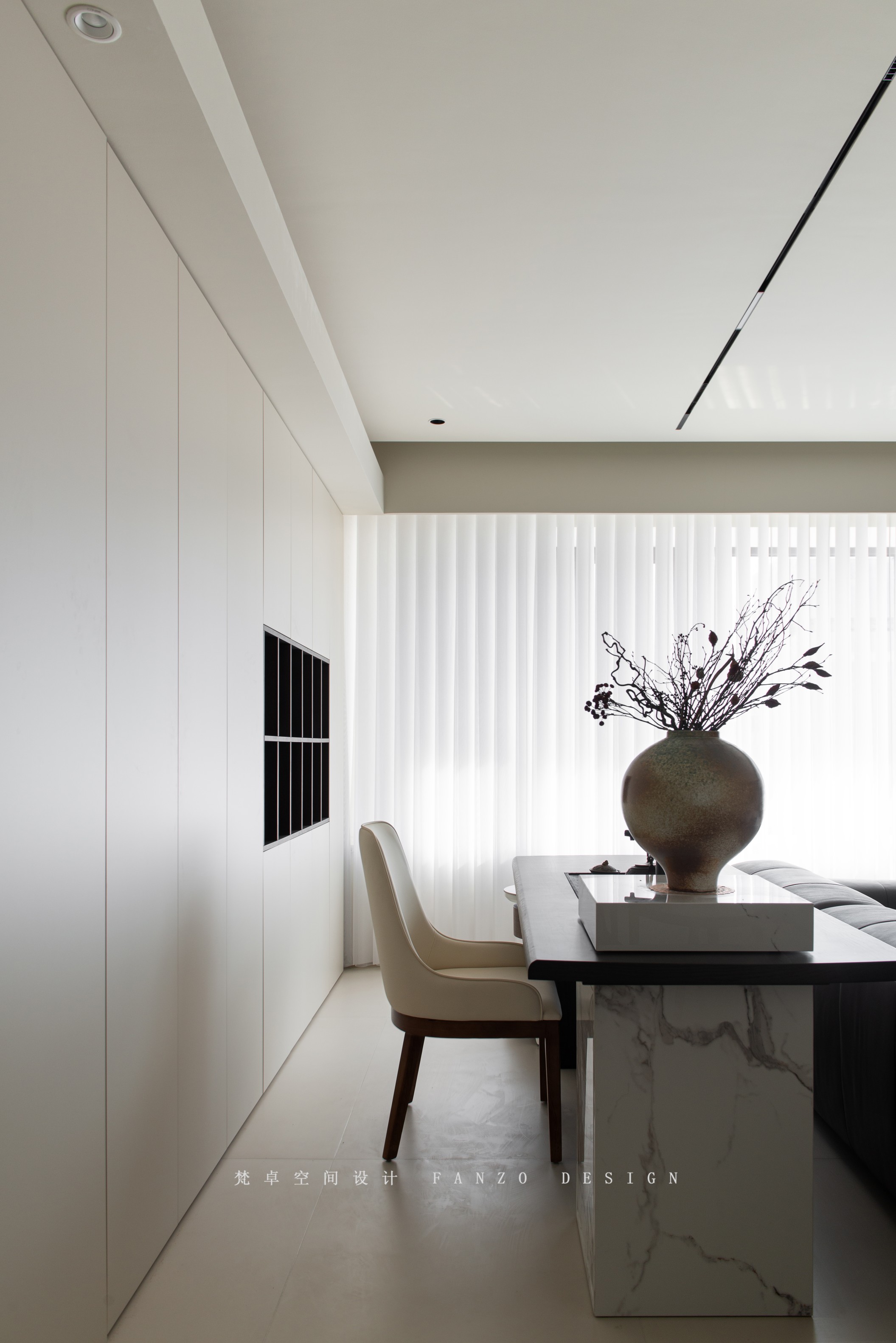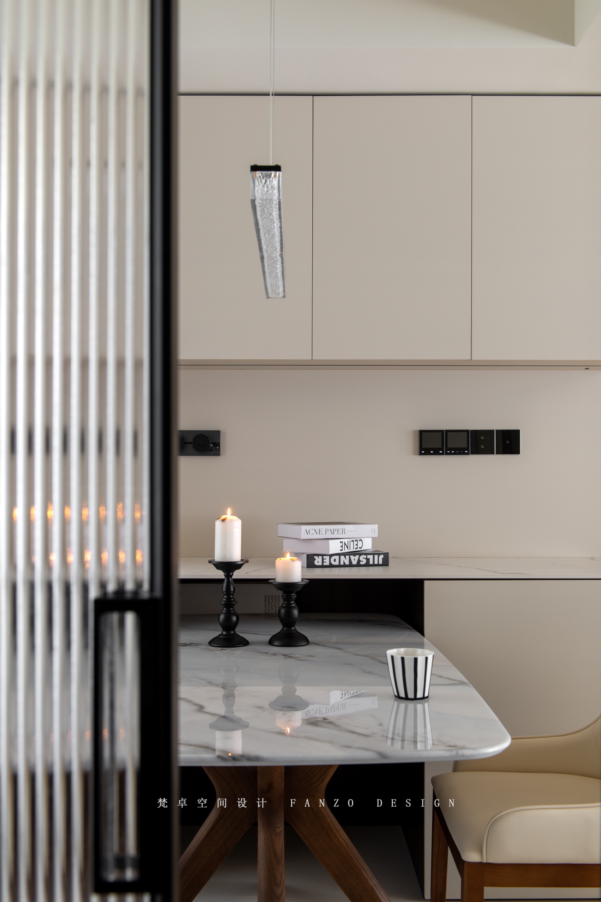 3.餐厨区:本套案例的难点则是在餐厨,需要容纳蒸烤箱,直饮机,洗碗机,冰箱等日常一系列小电器,原始交付标准则是为冰箱预留,我们将冰箱位置做了电器高柜,拆除了交付的柜门,将洗碗机内嵌,实现了业主对厨房的幻想,在将冰箱外移,餐桌则是做了可抽拉餐桌,解决多人用餐的需求,黑白色调的搭配,空间简约而不简单