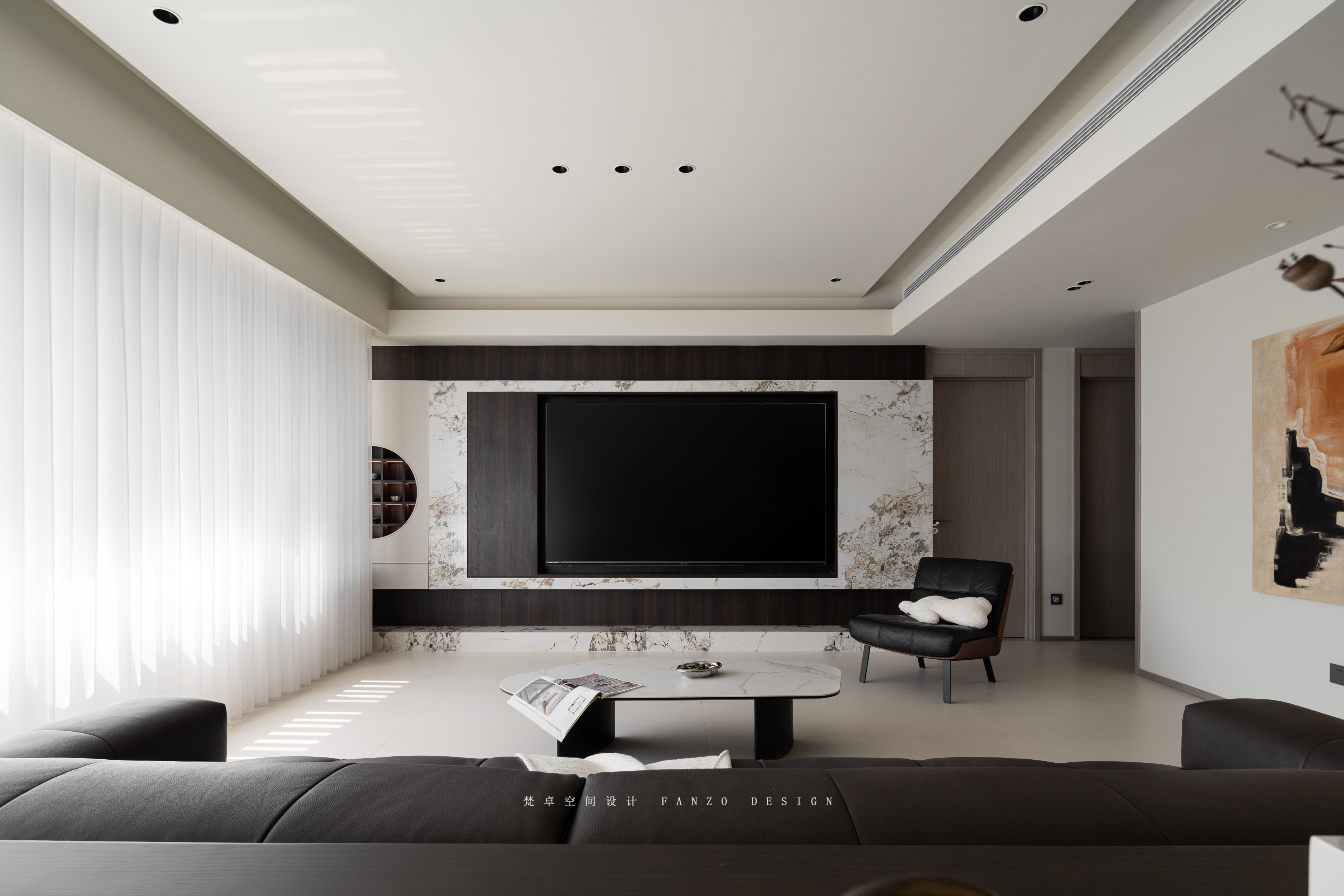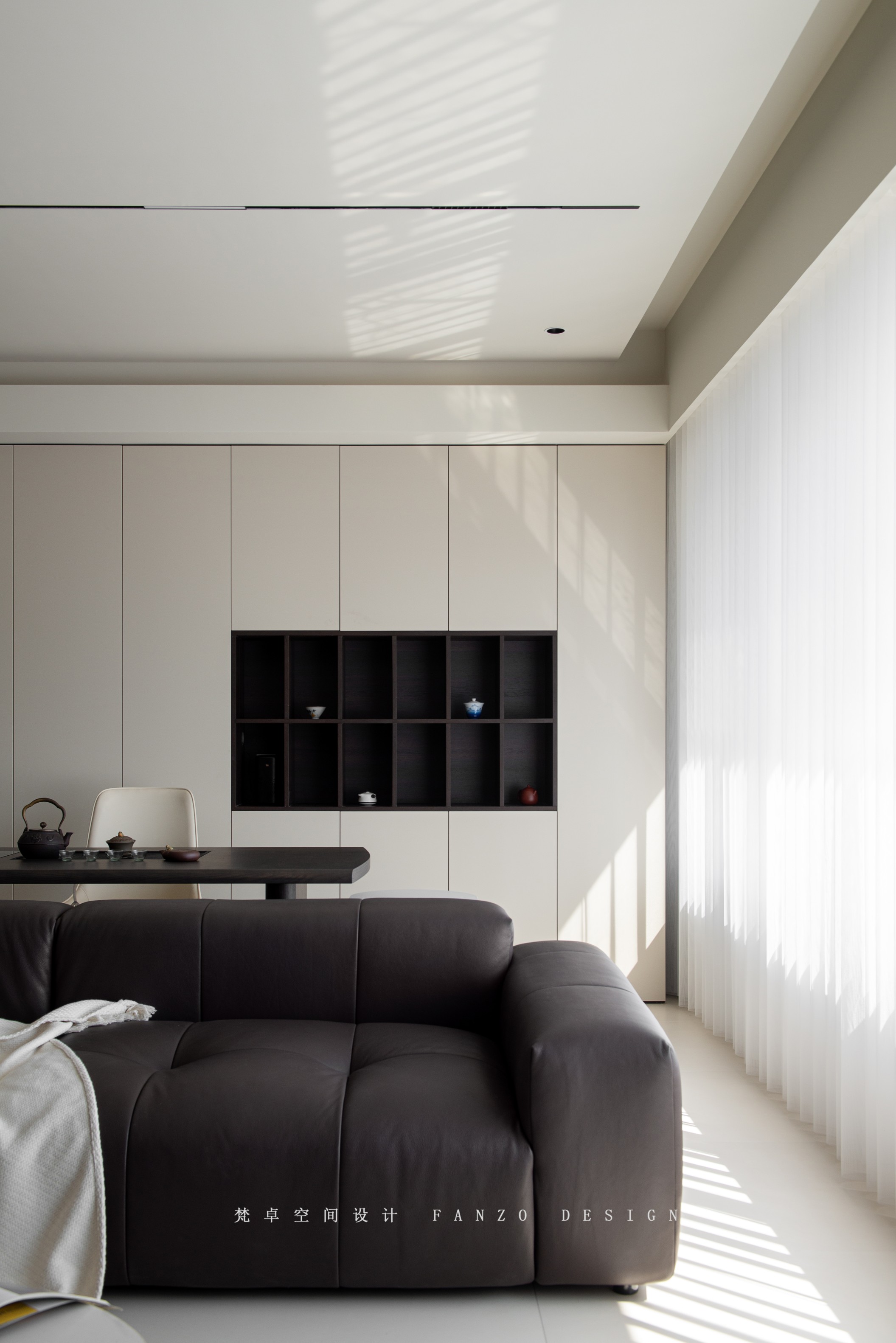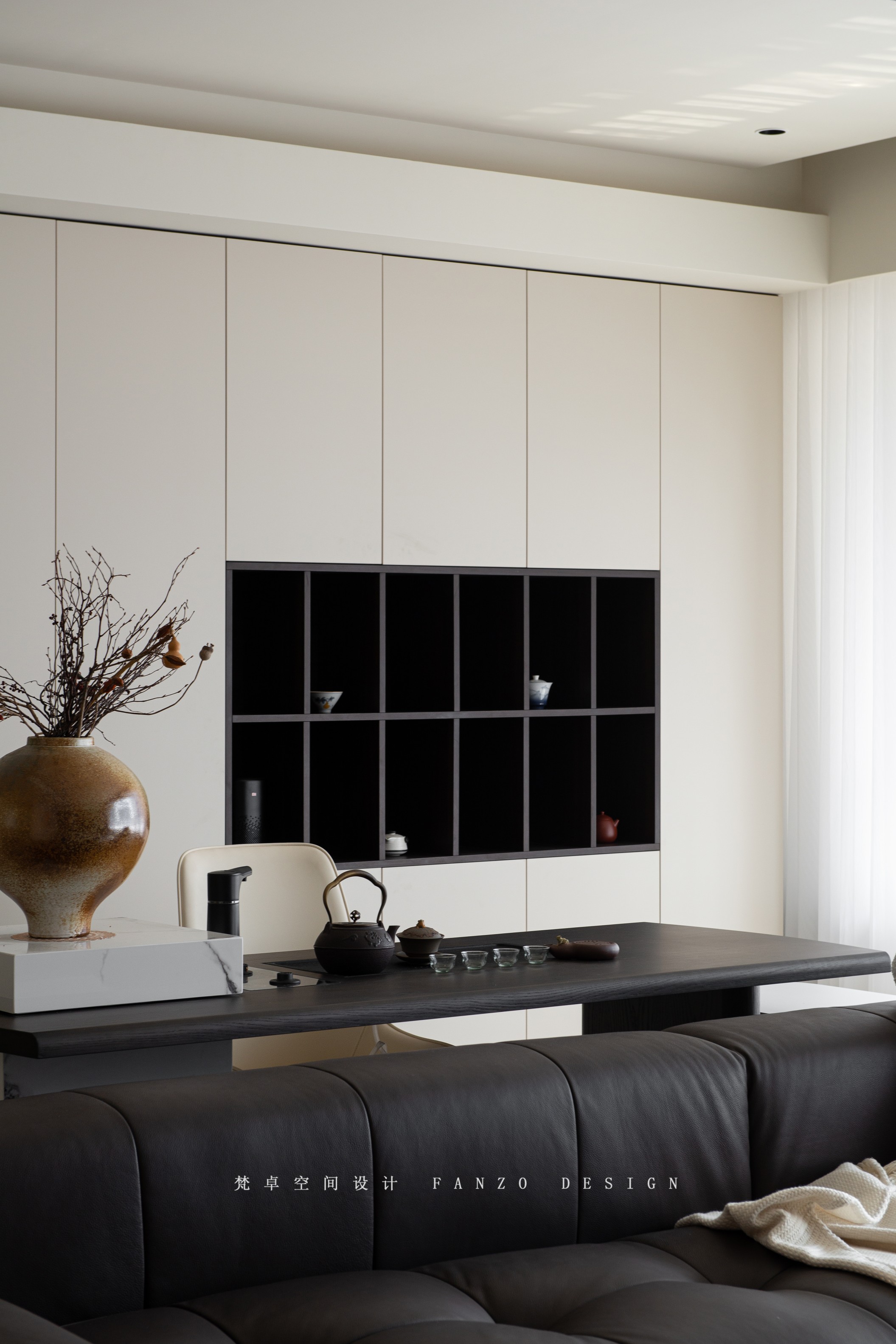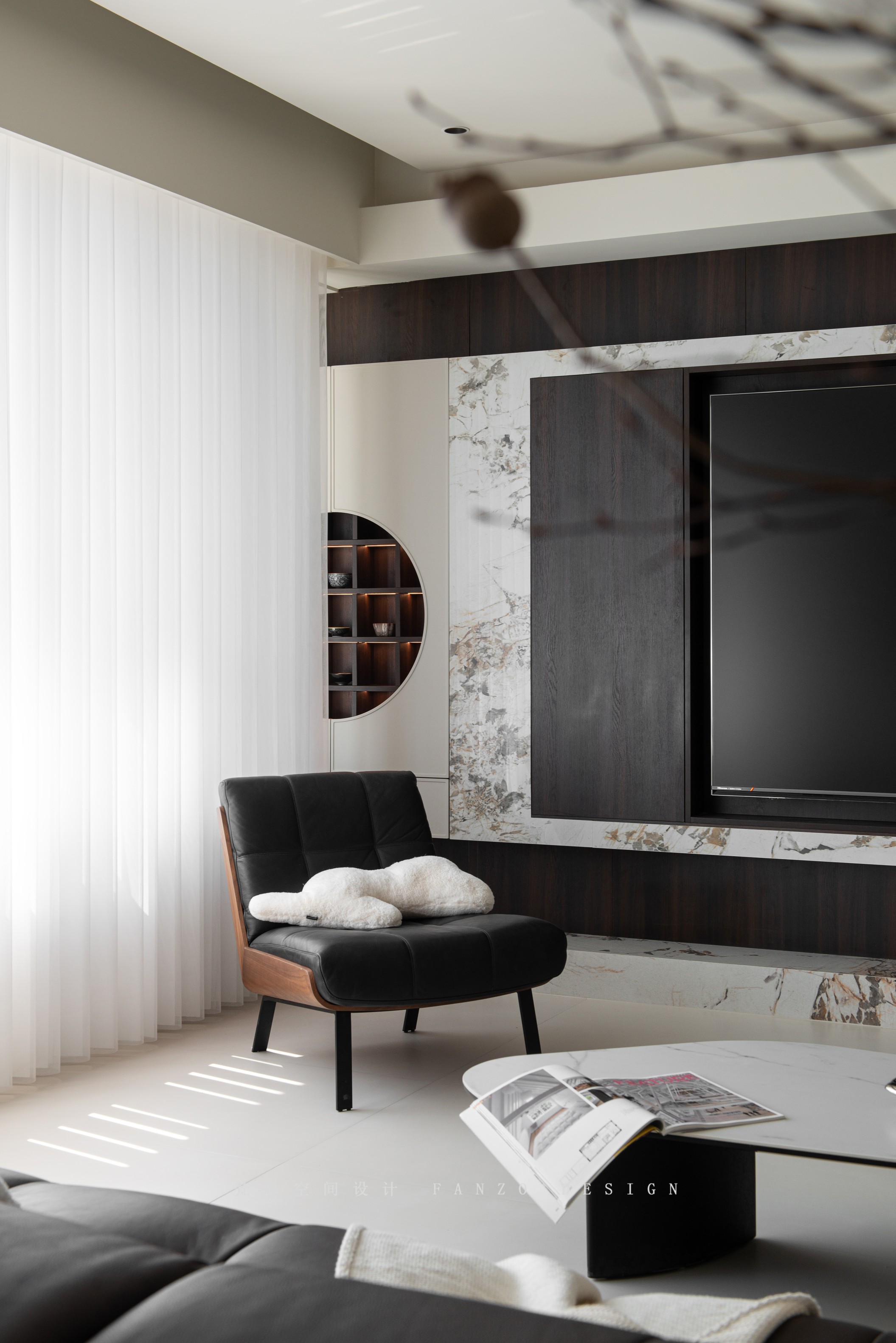 4.客厅:作为6.6米的客厅,一面是整排的收纳柜,一面则作为电视背景墙使用,这里我们将新中式百宝阁做到了飘窗的位置,整个电视墙长4.8米,潘多拉岩板的加入,提升了空间的整体格调,岩板的色彩也是整个空间色彩的整合,诉说着这个家的四季!