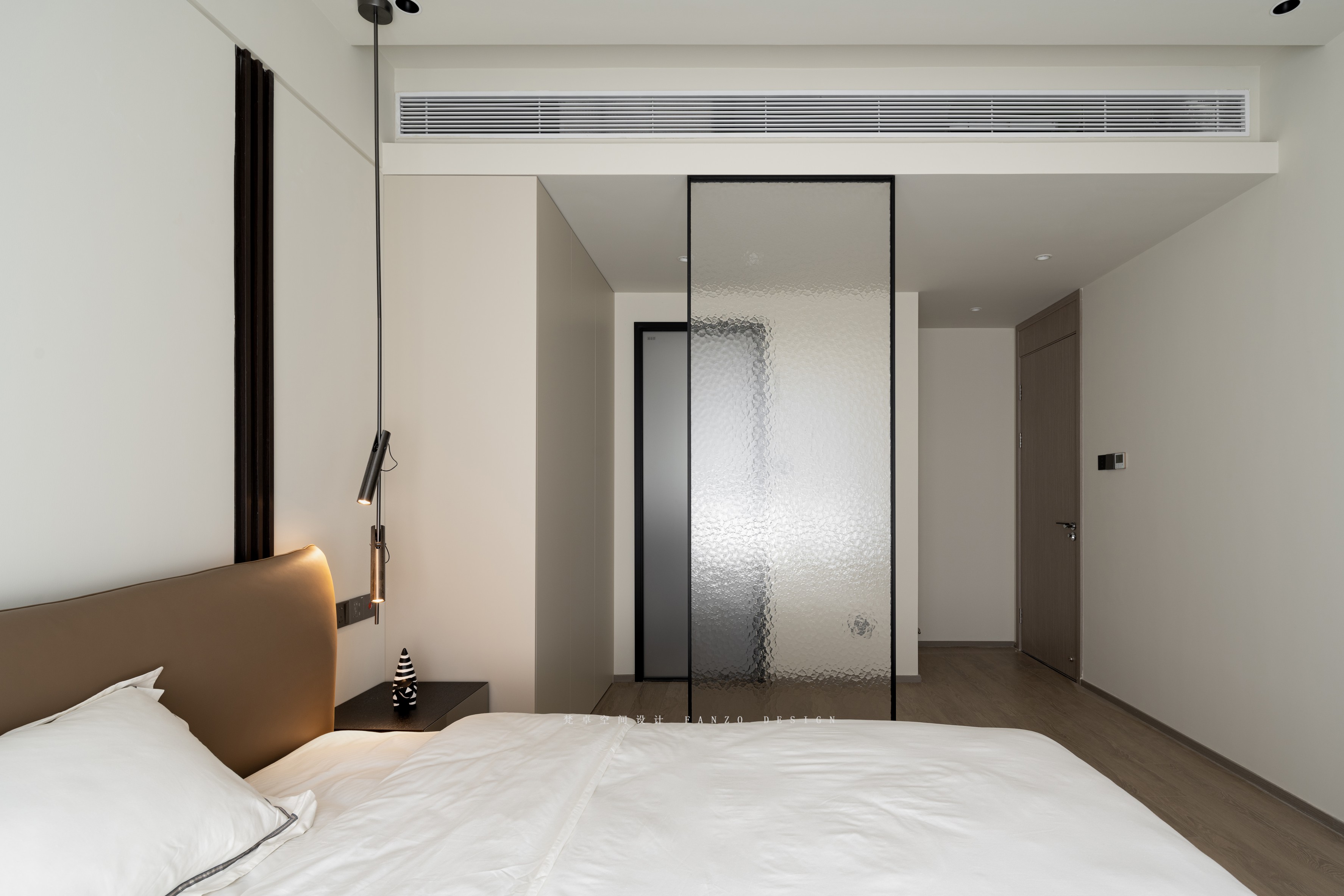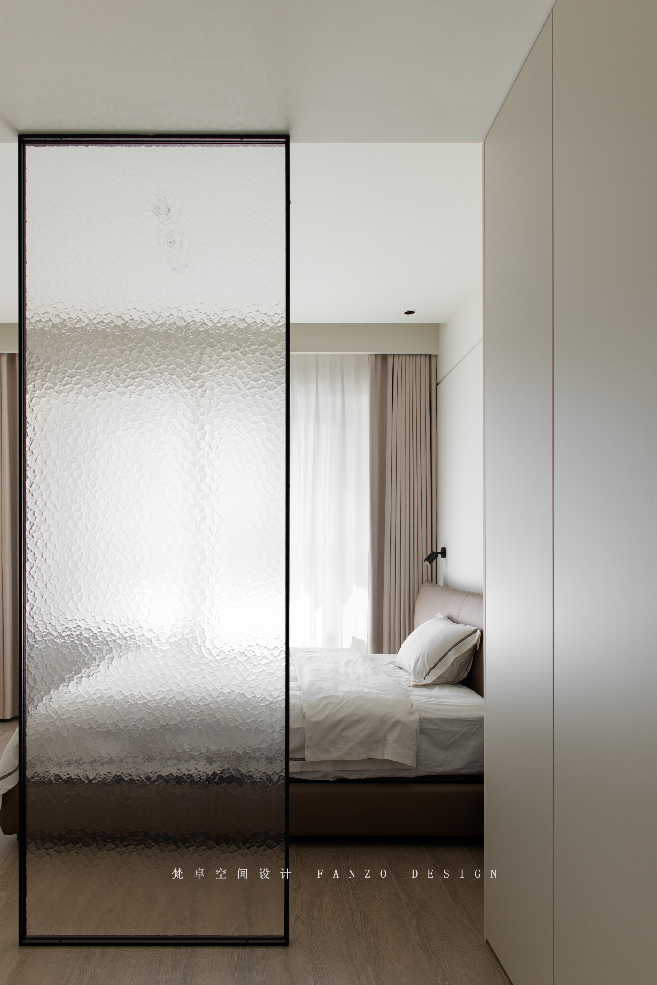 5.主卧:没有去做L型衣柜,而是只做三组衣柜,日常衣物拿取完全足够,用一面工艺玻璃解决床正对卫生间的尴尬,不贵但却很好用,主卫将原始淋浴拆除改为浴缸