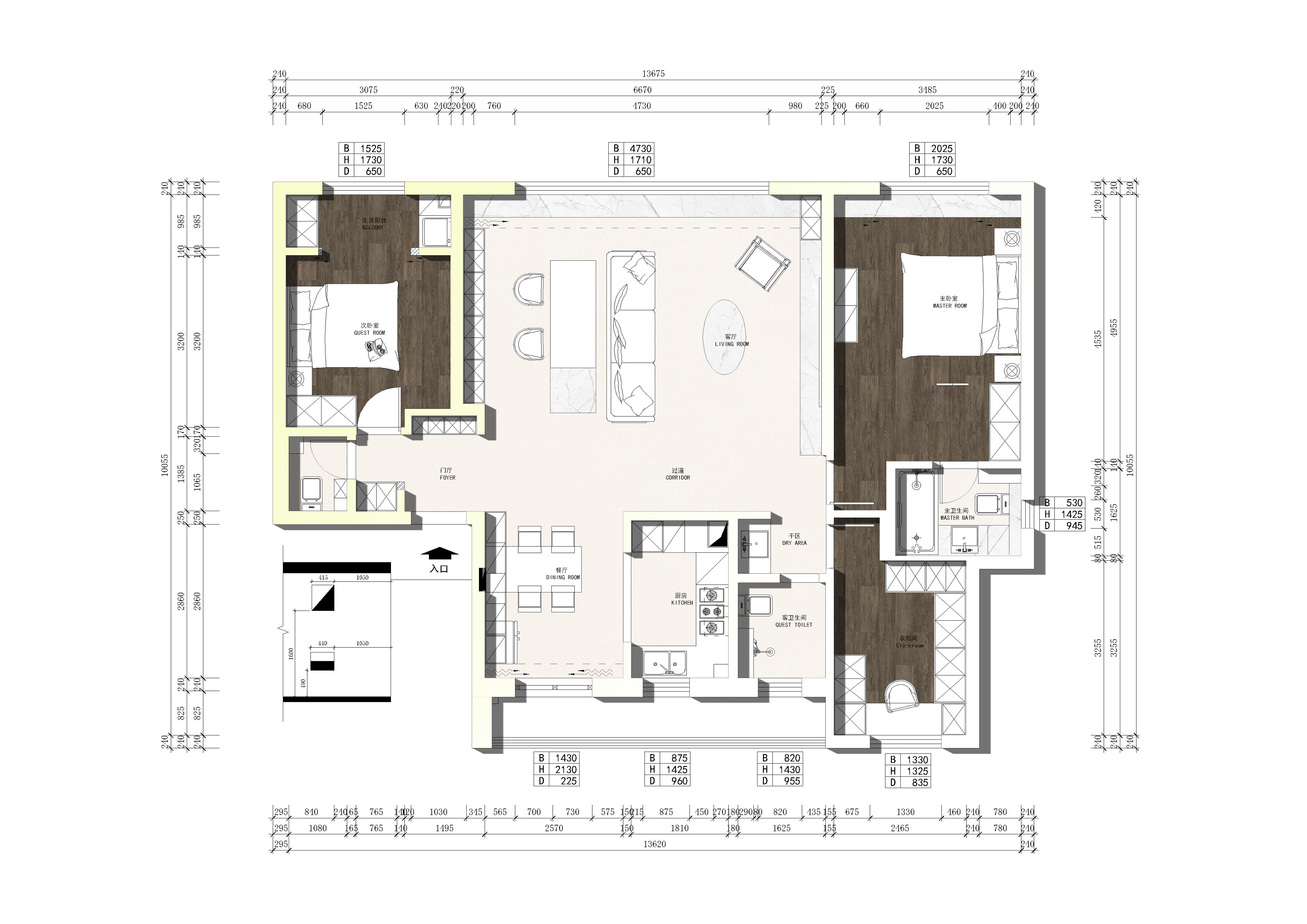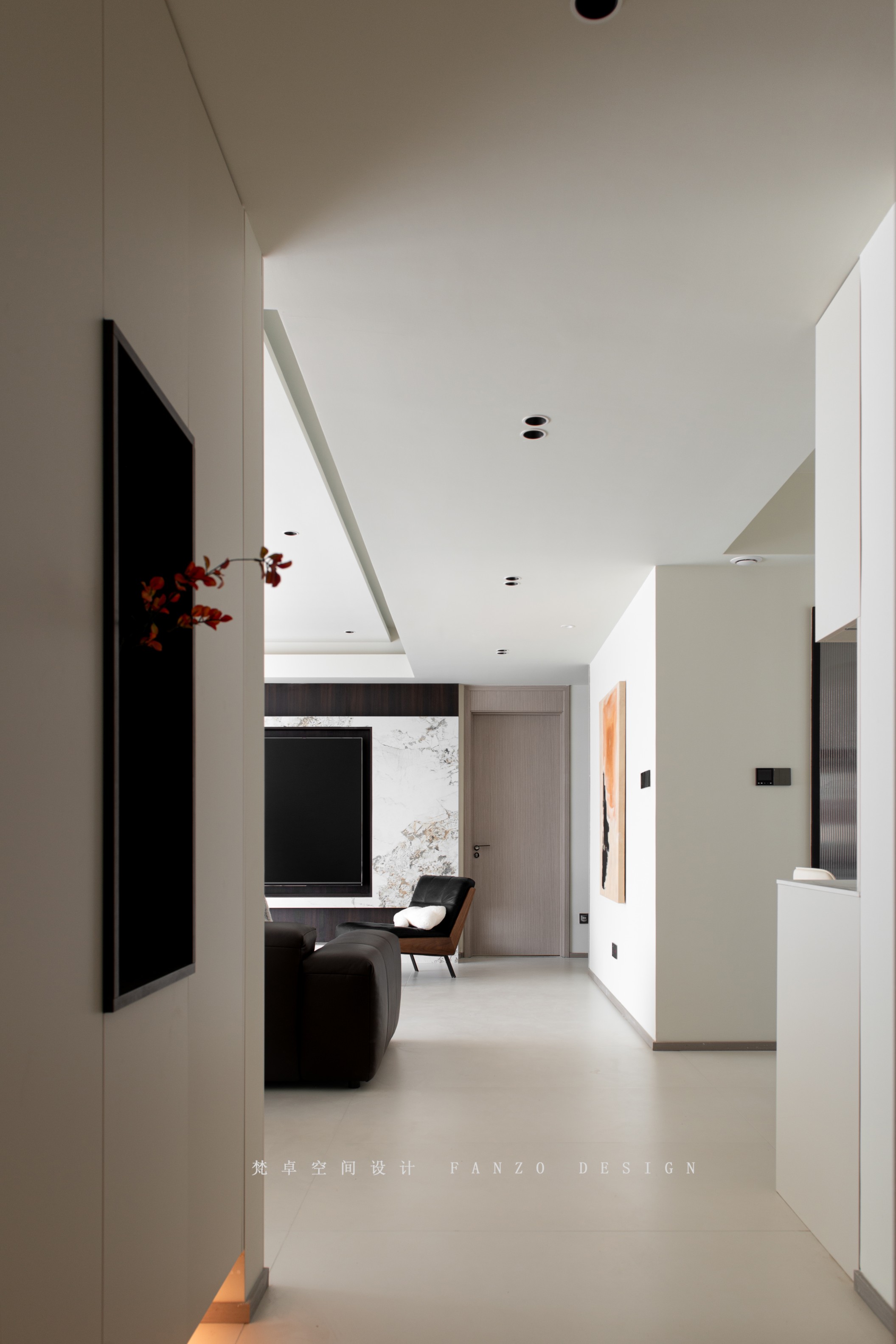 2.入户玄关:做整面的鞋柜与端景,可以摆放不同的花束或陶瓷类工艺品,简约的空间因为入户这一抹景色而变得与众不同,在我们的左手边也是次卧的正对面,原始为次卫卫生间干区,但由于业主不需要,我们将其拆除改为了第二个玄关收纳柜,这边的开架则是用来放置衣物,包包,钥匙,分门别类,整齐划一,整洁的家是排除班味的最好搭档