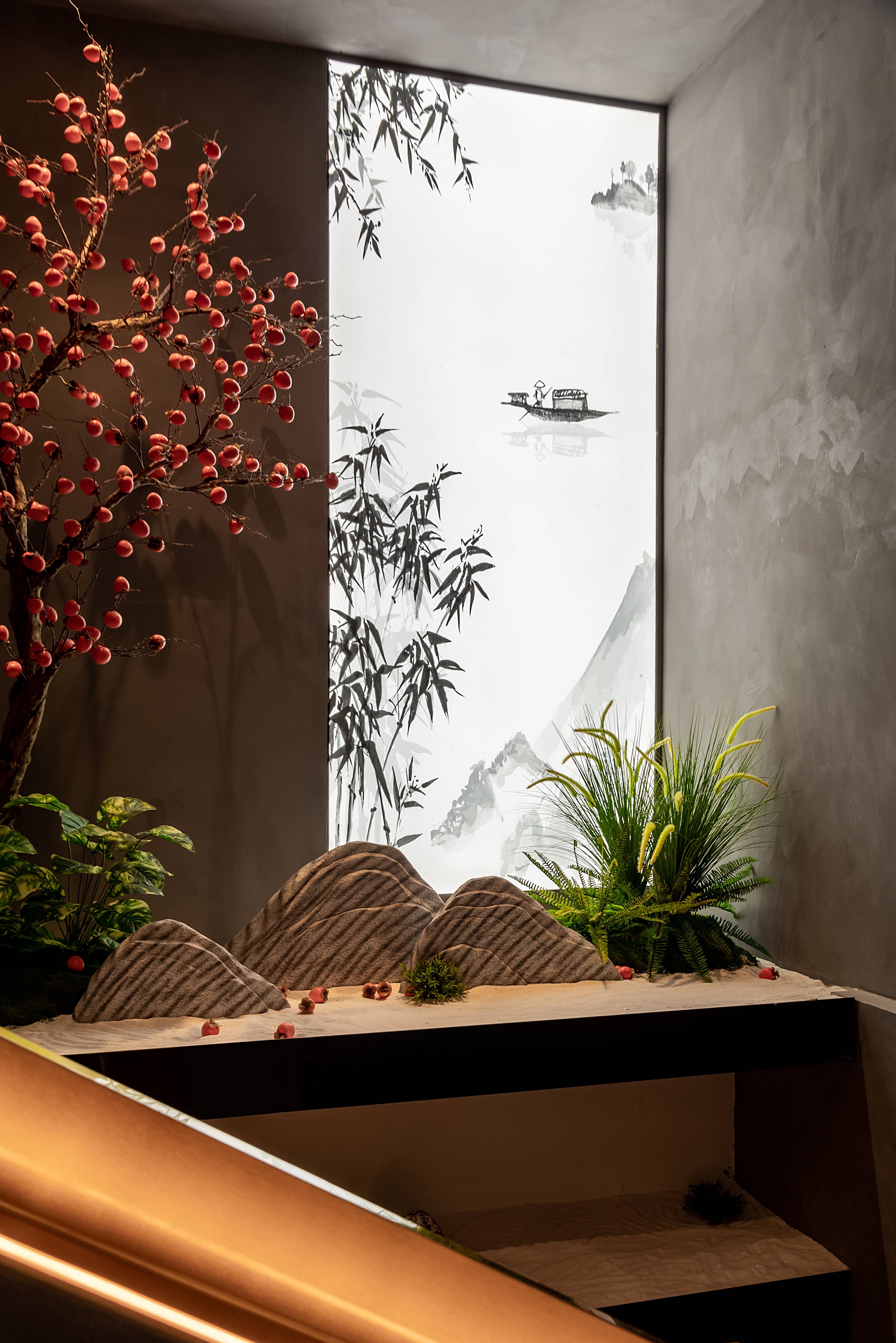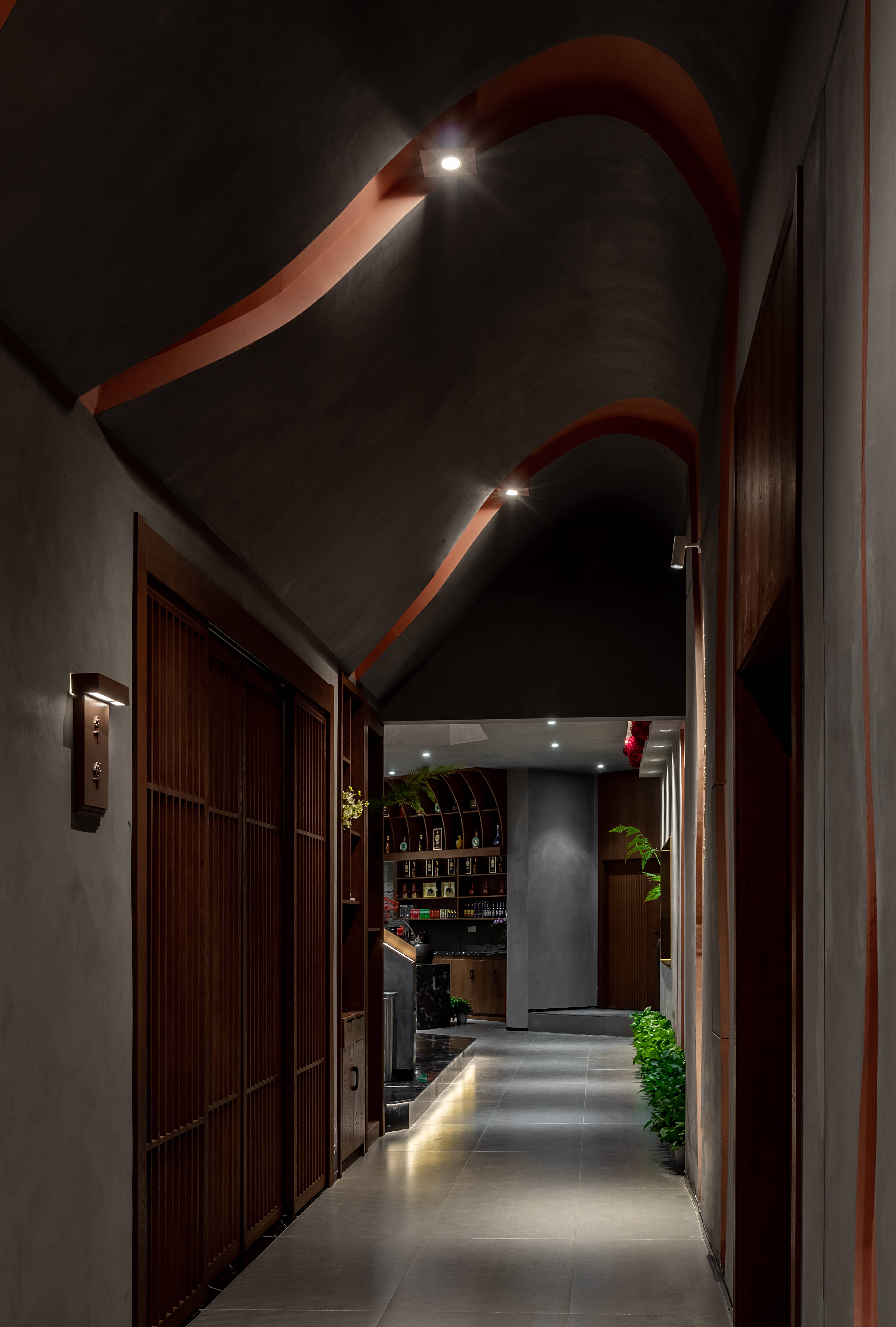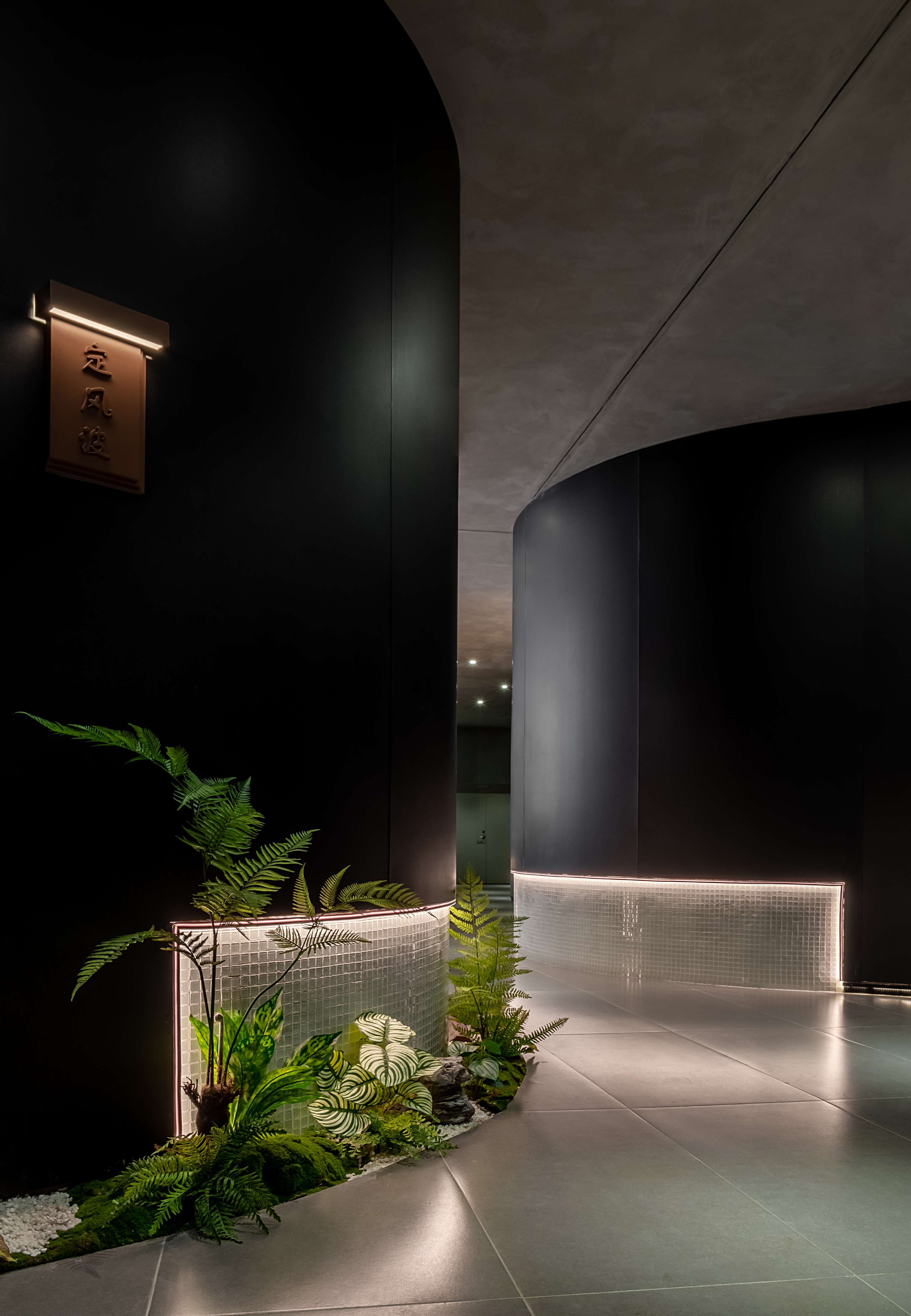 本案以“东方文化”和“古典美学”为品牌的价值核心展开设计。一楼户外用餐区以全木和绿植作为装饰,摒弃华丽和多余的设计,回归自然;一楼大厅以黑色的装饰面,错落有致的光影排布,挑高拓宽的空间动线,形成富有张力的空间;一楼包厢以儒学文化中的“三纲五常”为主题,国风元素贯穿其中,打造雅致的文人空间;一二楼长廊糅合古代“廊”的概念,将迎宾的动线简单化,巧妙营造“景深”的氛围感;二楼的包厢以中国儒学文化中“仁”、“义”、“礼”、“智”、“信”作为设计主题,古典和国风元素的融合,尽显东方韵味。