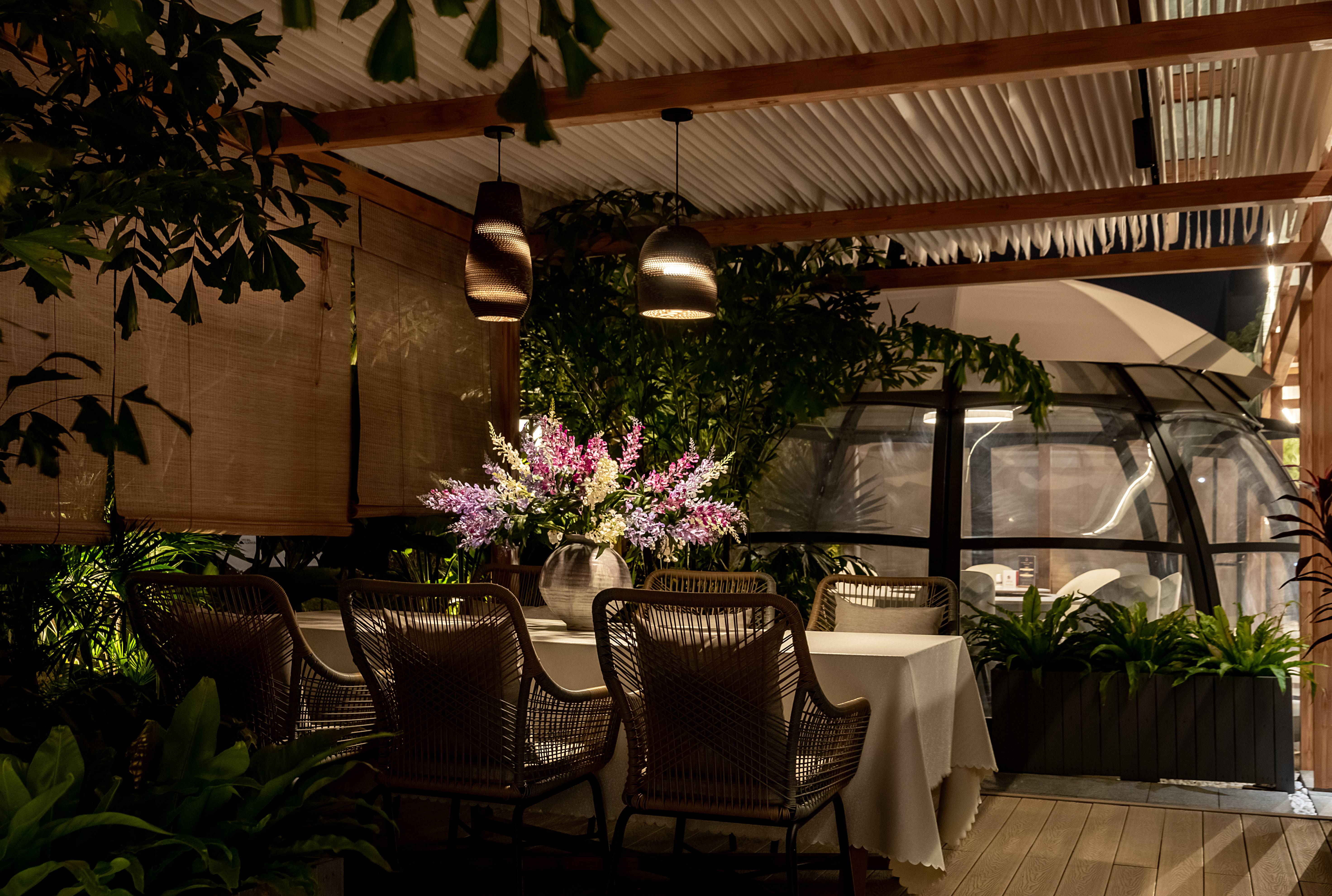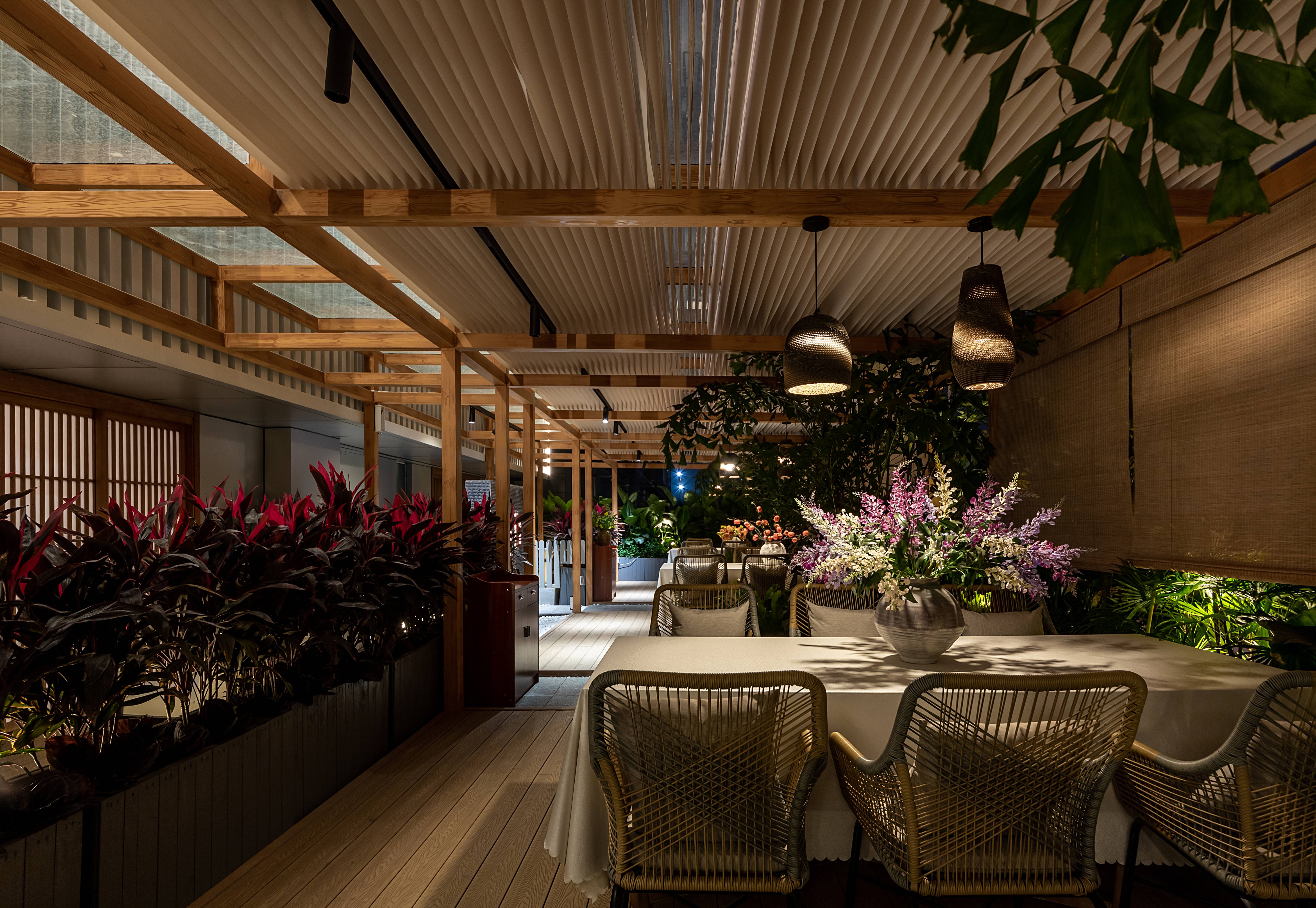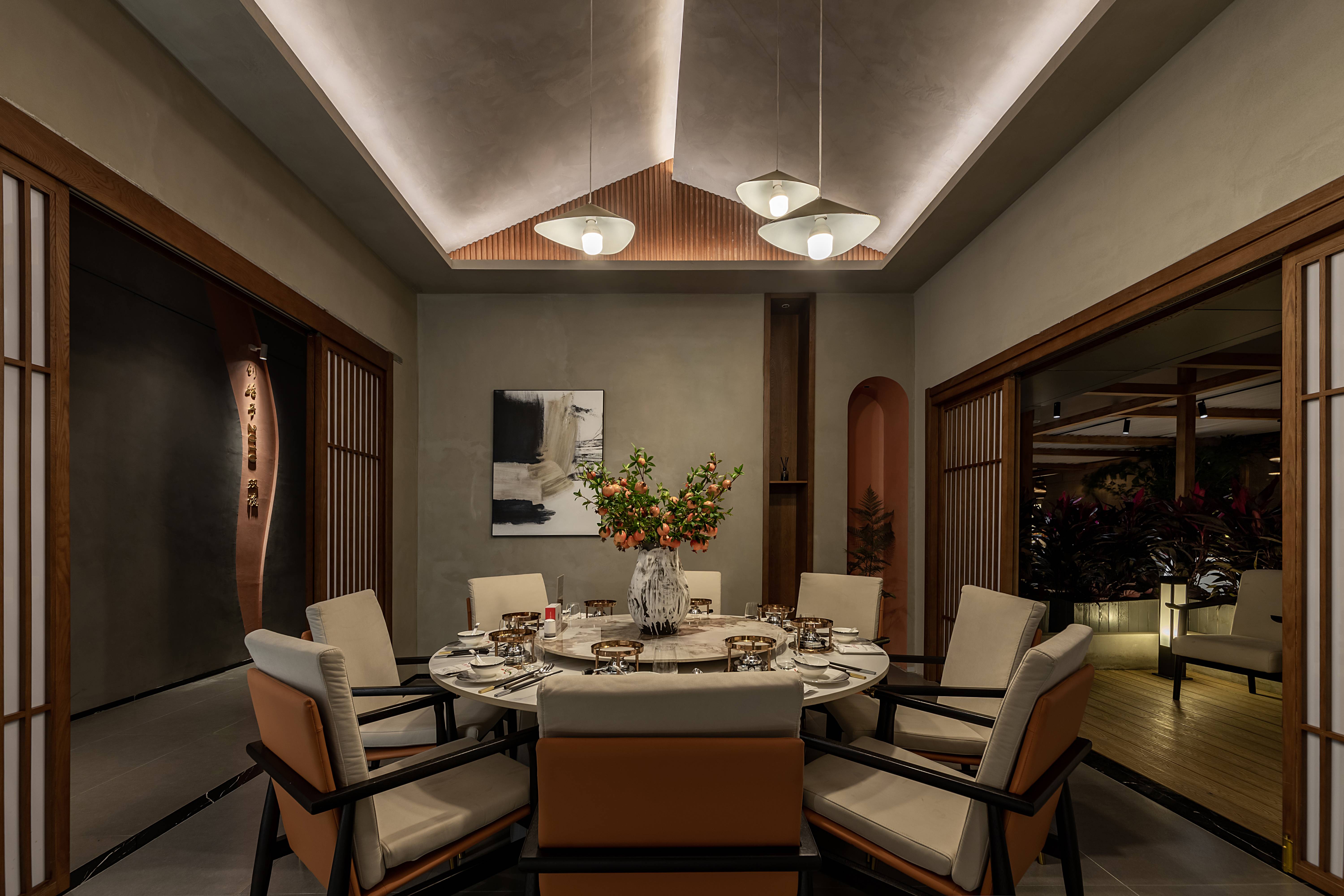 本案以“东方文化”和“古典美学”为品牌的价值核心展开设计。一楼户外用餐区以全木和绿植作为装饰,摒弃华丽和多余的设计,回归自然;一楼大厅以黑色的装饰面,错落有致的光影排布,挑高拓宽的空间动线,形成富有张力的空间;一楼包厢以儒学文化中的“三纲五常”为主题,国风元素贯穿其中,打造雅致的文人空间;一二楼长廊糅合古代“廊”的概念,将迎宾的动线简单化,巧妙营造“景深”的氛围感;二楼的包厢以中国儒学文化中“仁”、“义”、“礼”、“智”、“信”作为设计主题,古典和国风元素的融合,尽显东方韵味。