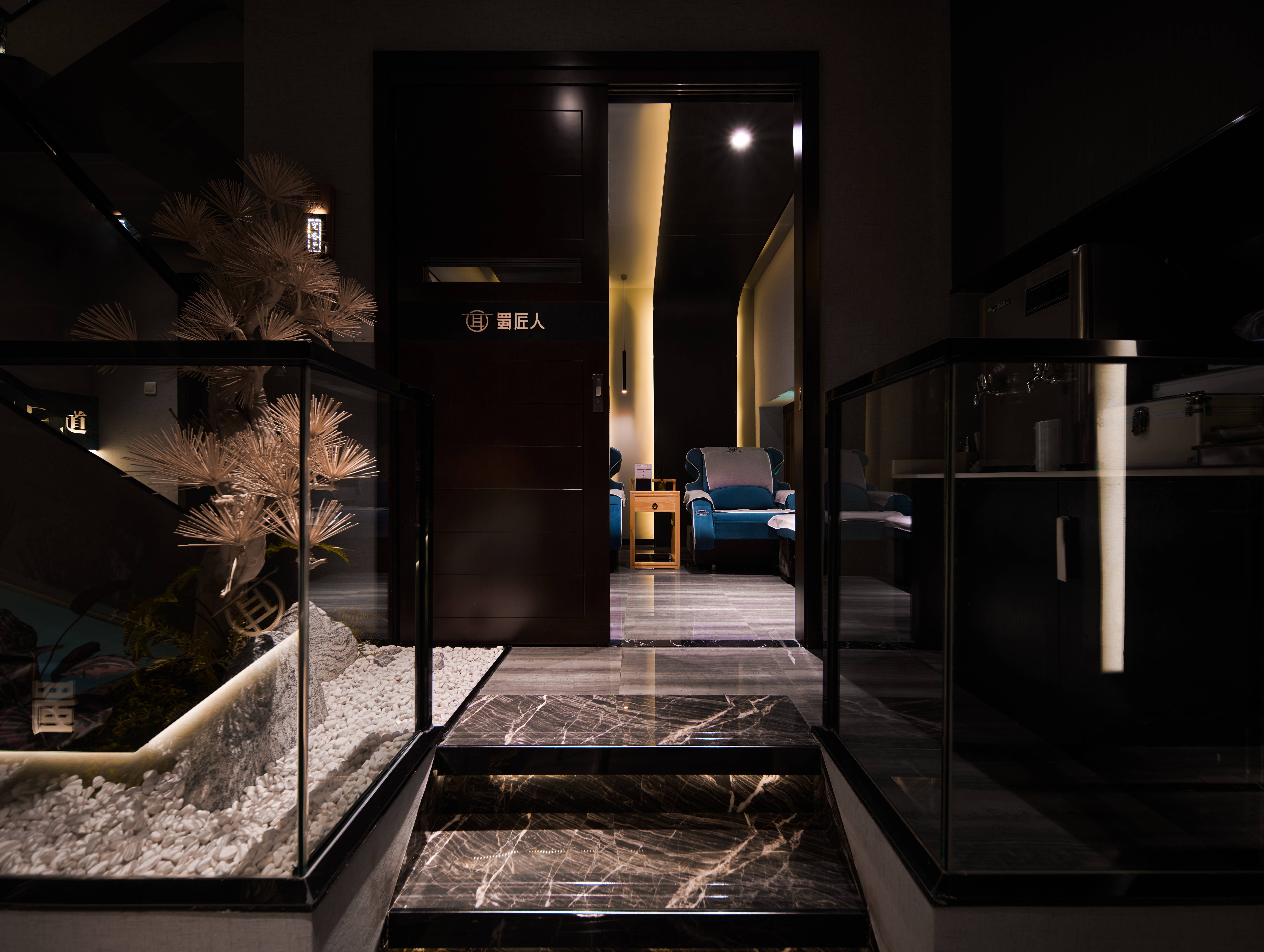 我们倾心于人文氛围的营造,更注重简洁与独立的表达。这是一座独特的浴足采耳养生馆,它的存在就像一首简洁的诗篇,张扬着简洁与独立的个性。我们摒弃了浓墨重彩和繁复的工艺,却用黑色描绘出沉稳与高贵的质感。黄色的灯光则如同家的温暖,它流淌在每一寸空间,为蜀匠人赋予了灵动且温馨的氛围。