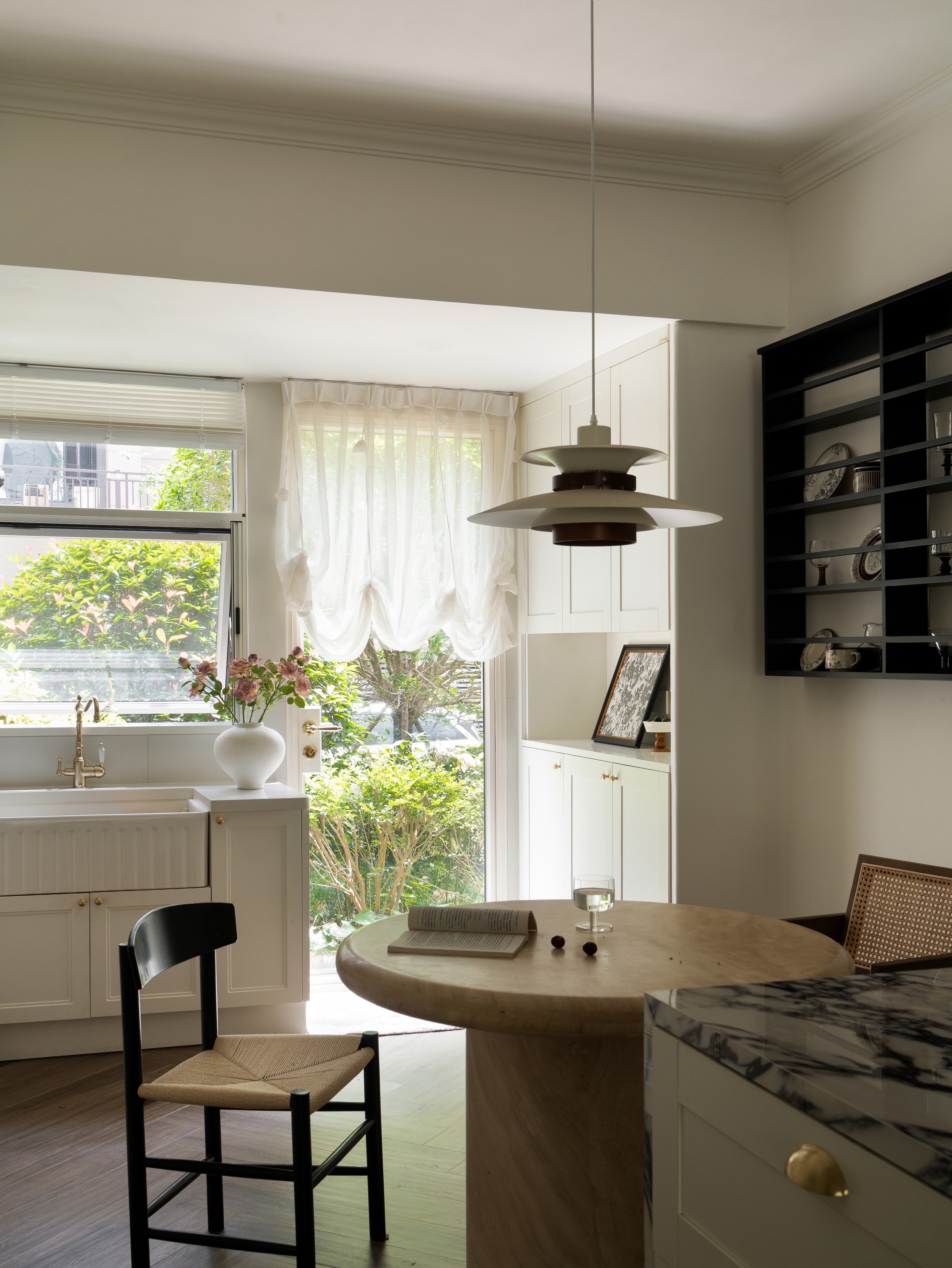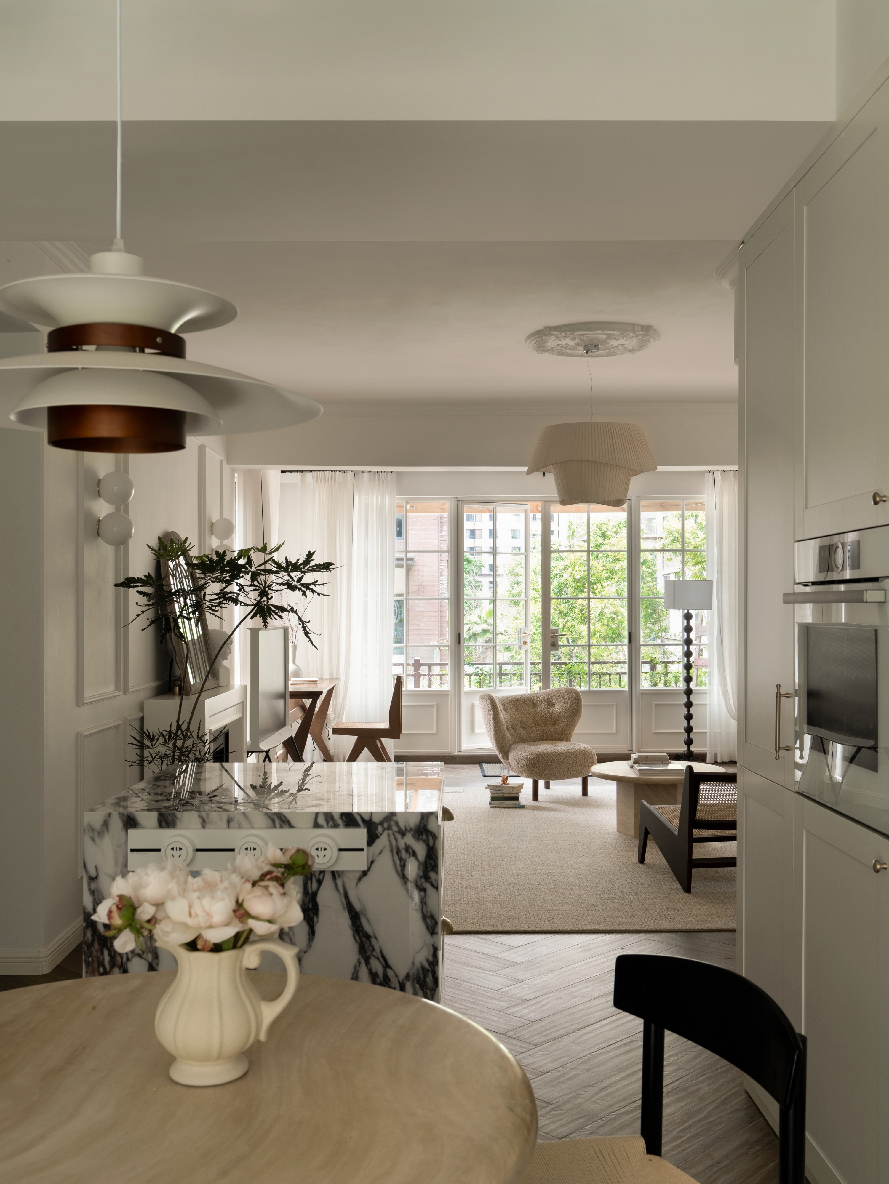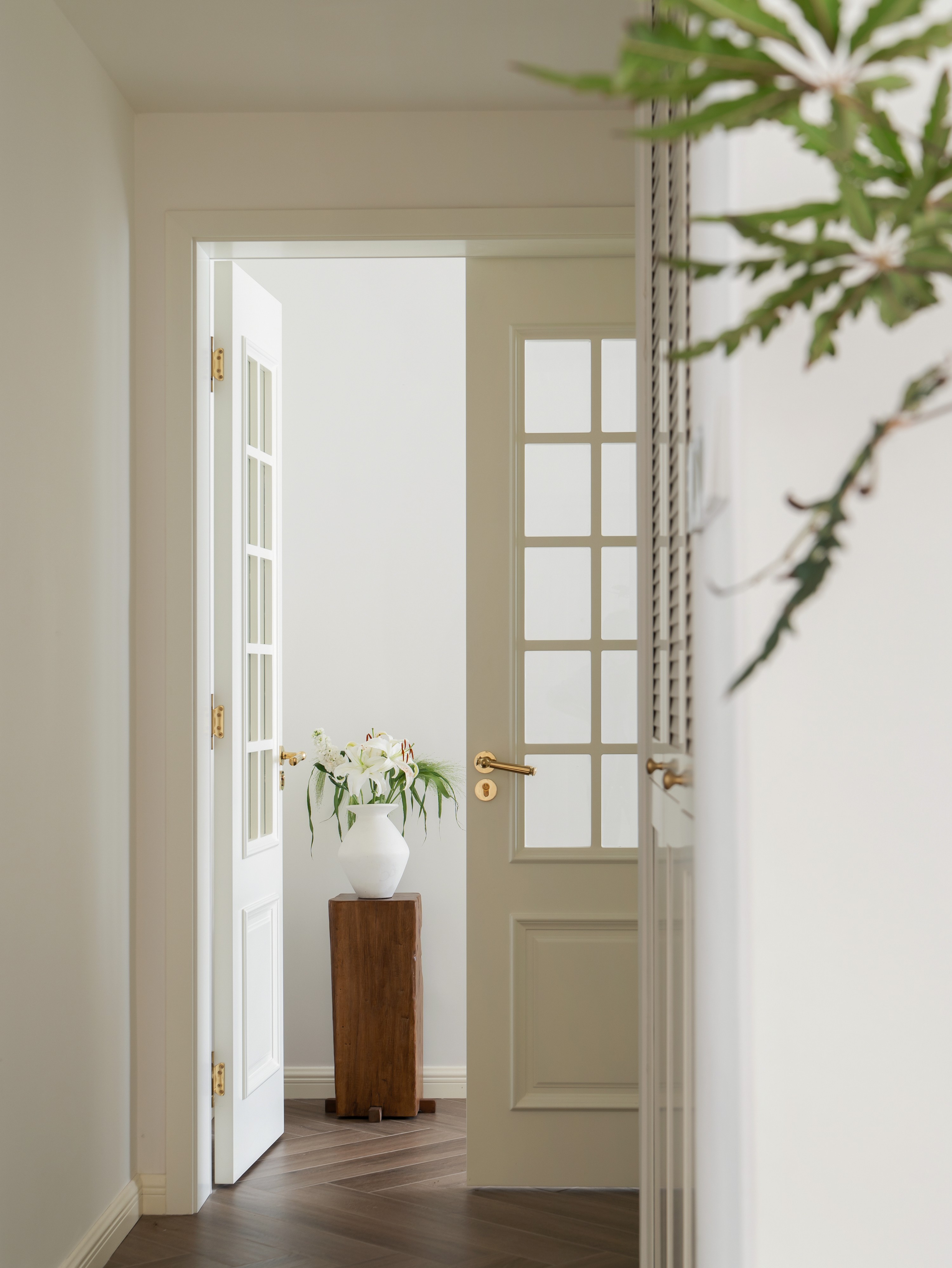 这套住宅没有特定的风格,混搭了一个非常舒适的家,法式古典的优雅结合大量的中古家具。整体上以纯净、质朴、自然的风格为主,很少使用大面积艳丽的色彩,整体选择以白色为主基调,突显木制人自拼地砖。