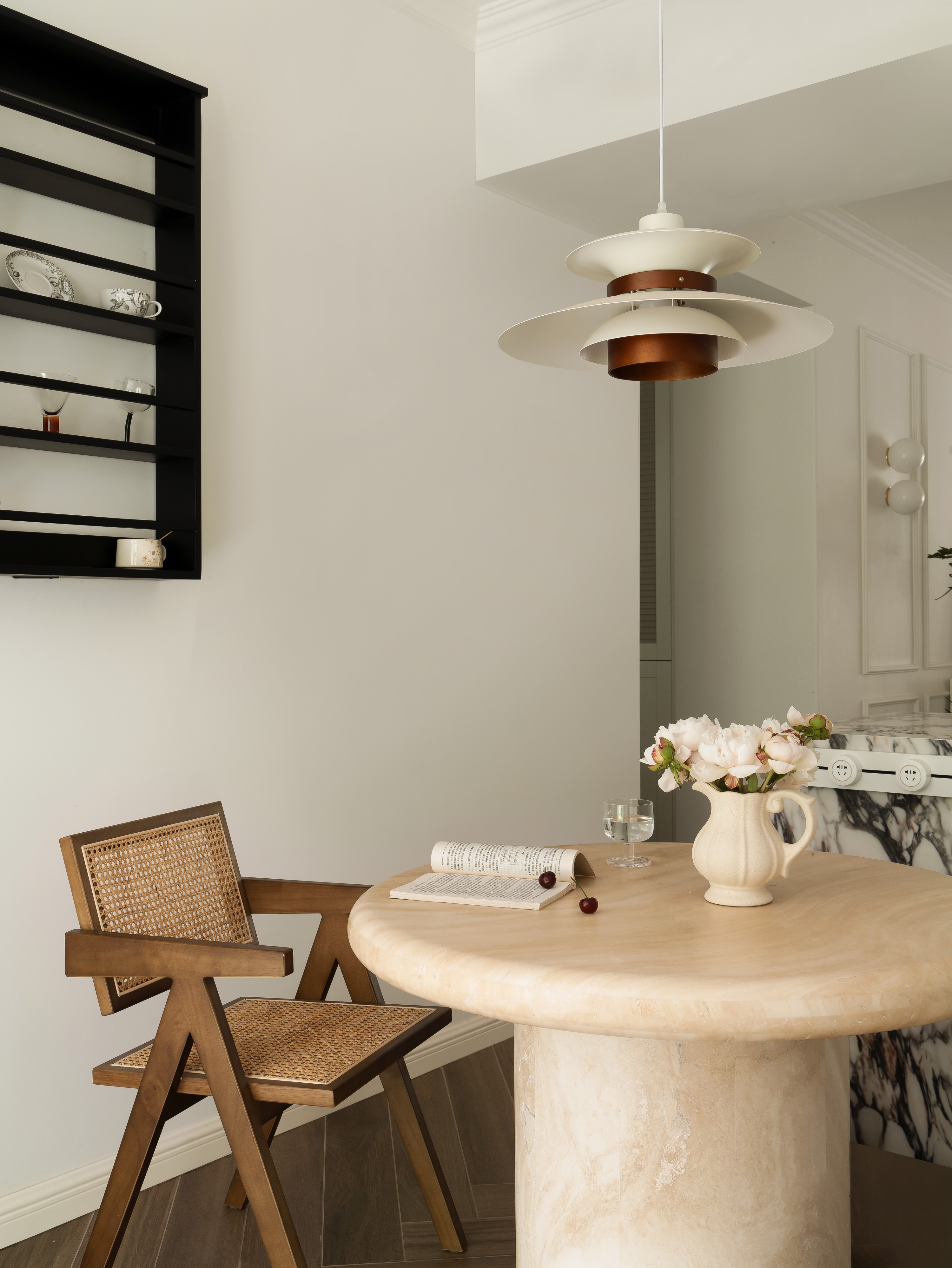 软装上选择了宝格丽石材,木材,陶艺,棉麻,藤条,百叶,这些自然的材质,天然的纹理在他的客厅中巧妙的碰撞。