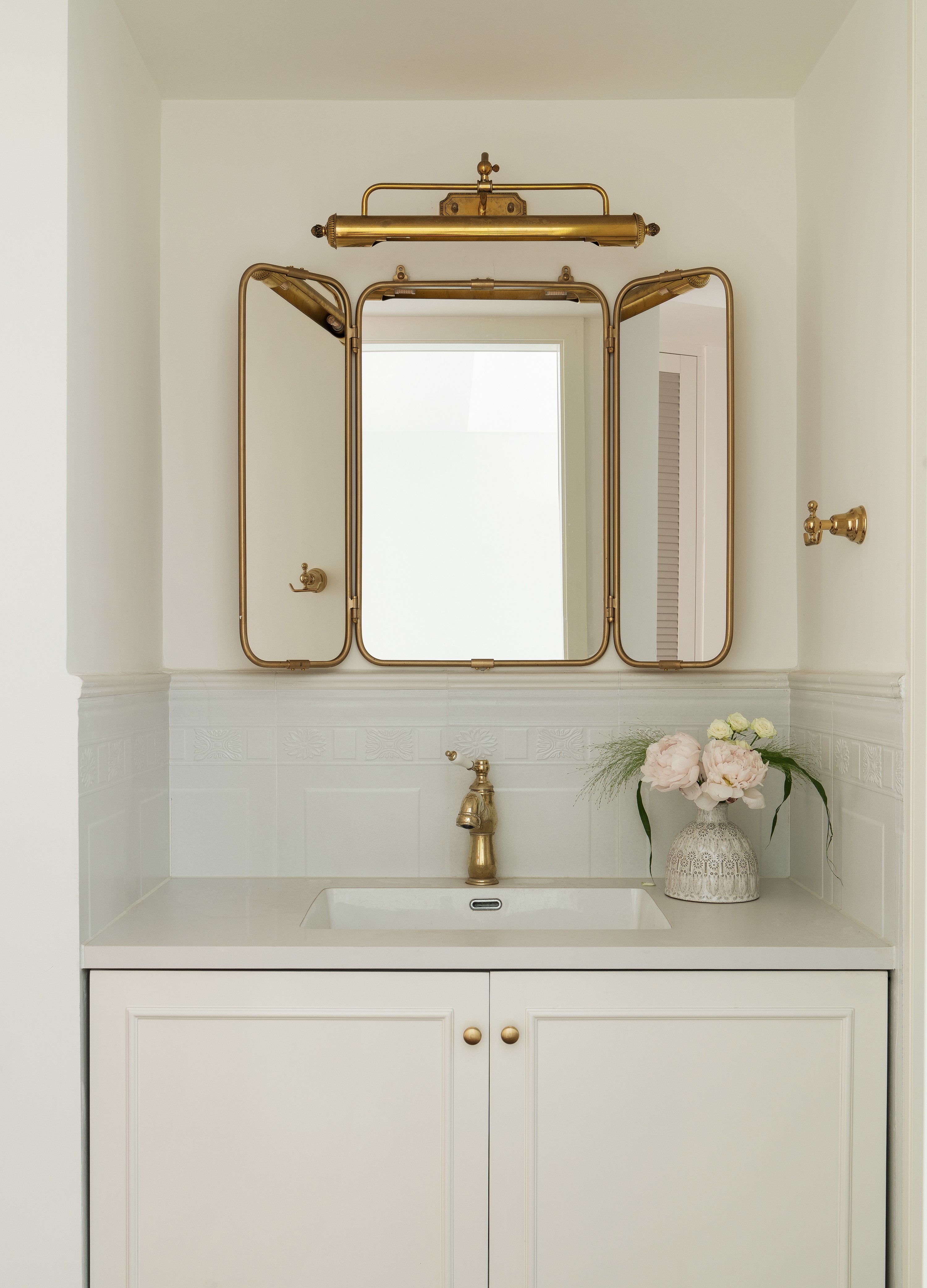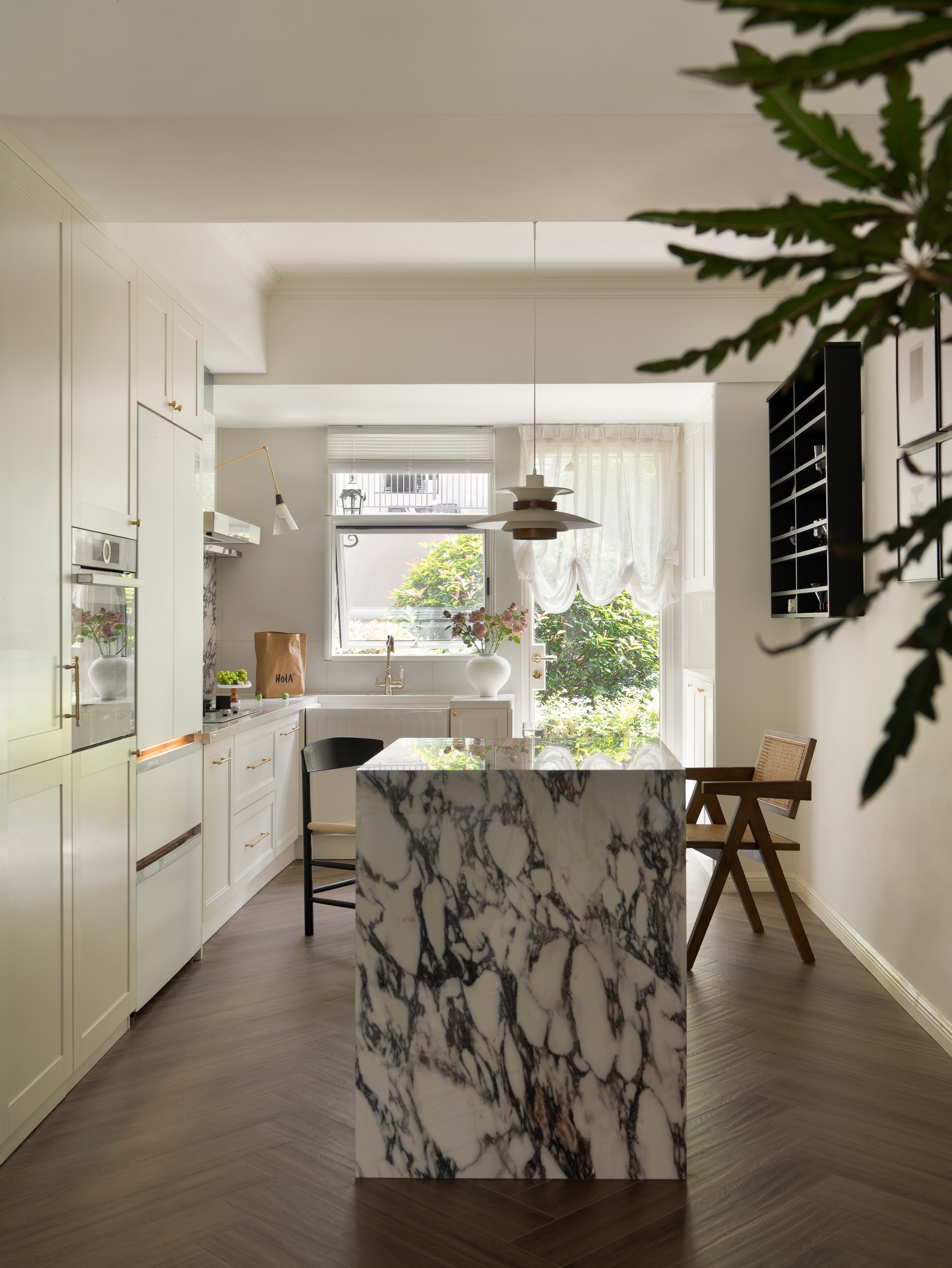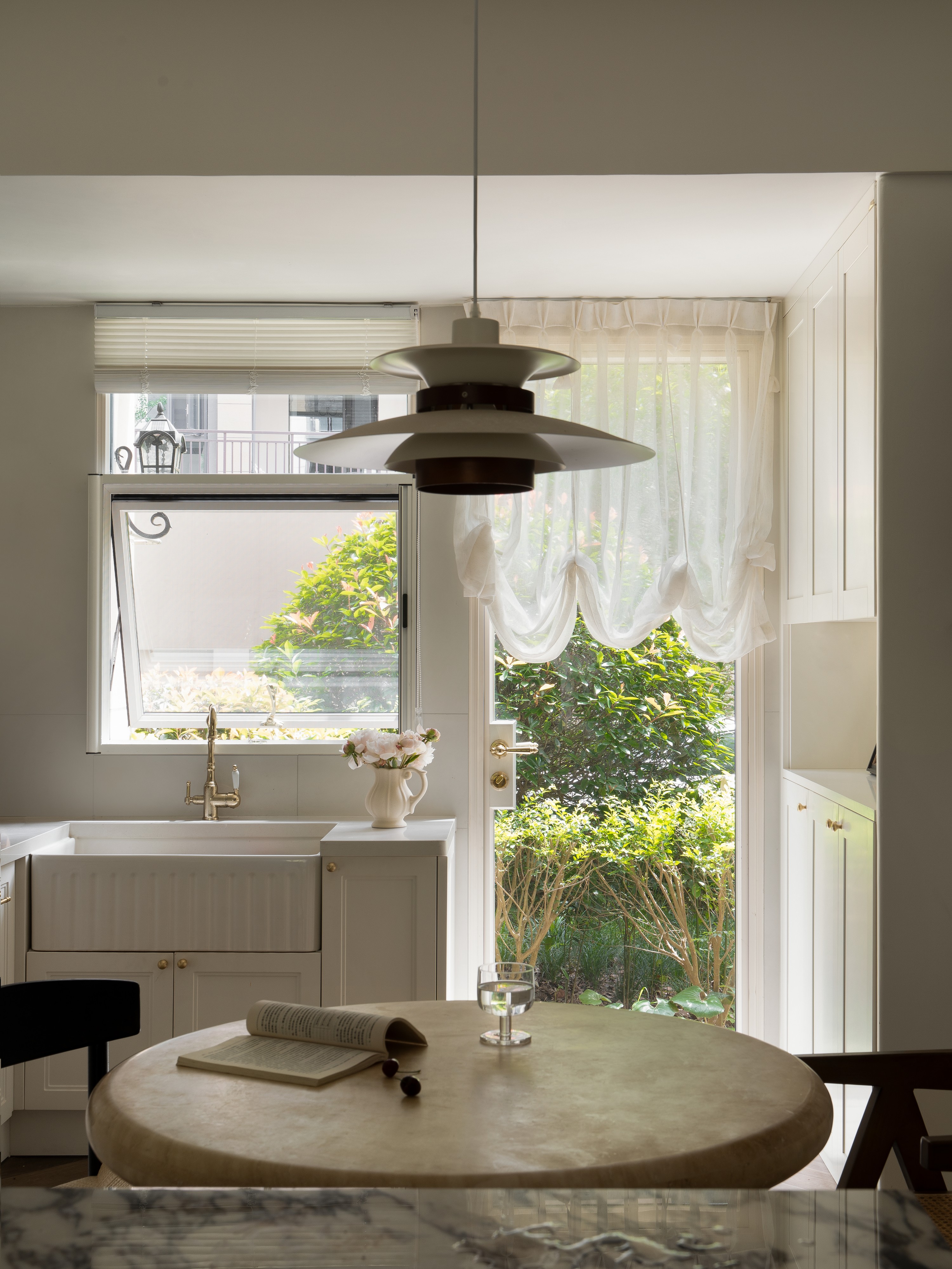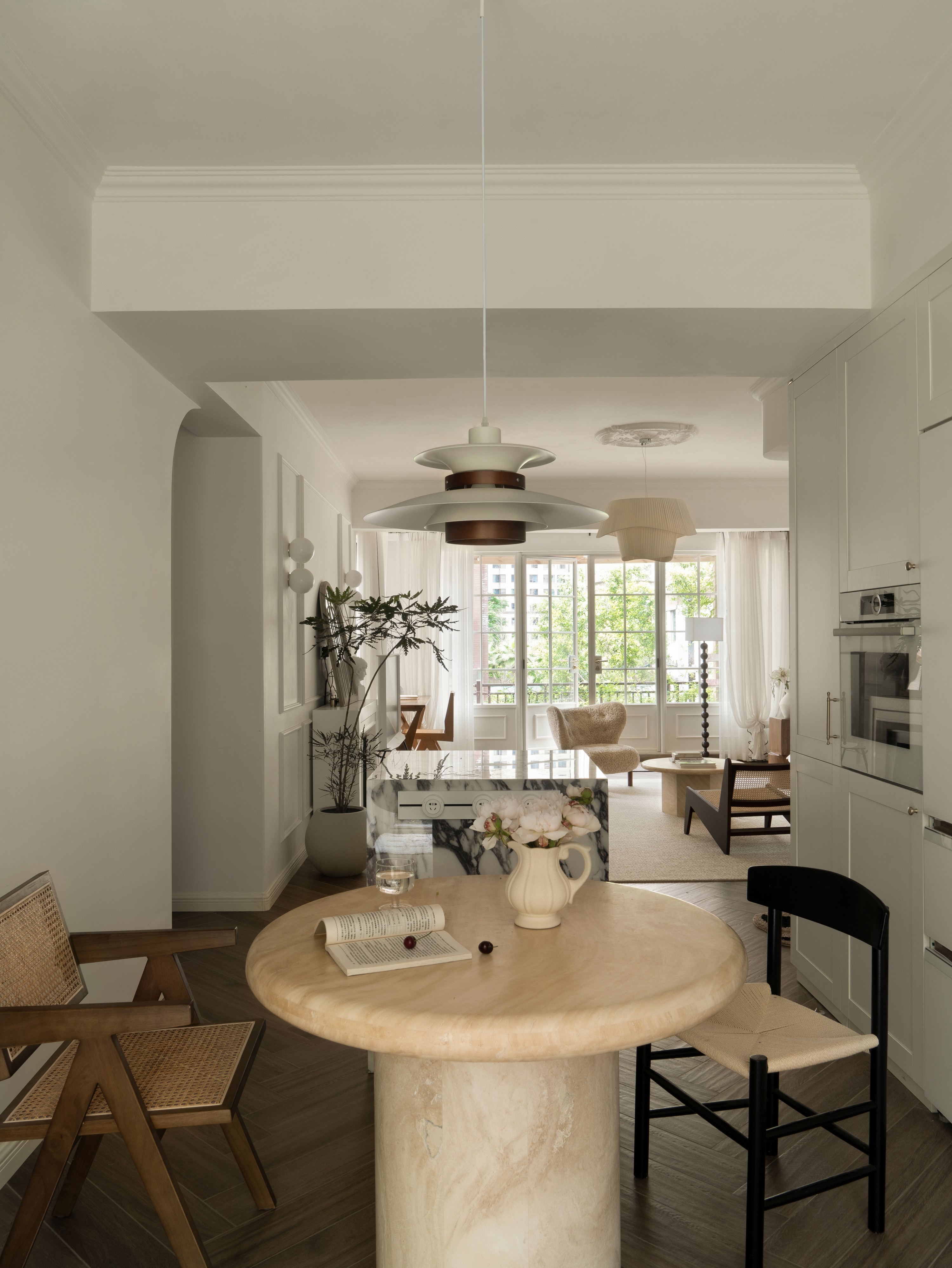 在改造上由于客户需求以及结构的限制,所以更多是通过整体定制柜体,地砖的色彩和材质作为基调,再加丰富软装的趣味,多元性。抛弃繁琐的法式雕花,把细节融进软装搭配。客厅落地平开法式门窗与户外花园造景融合。