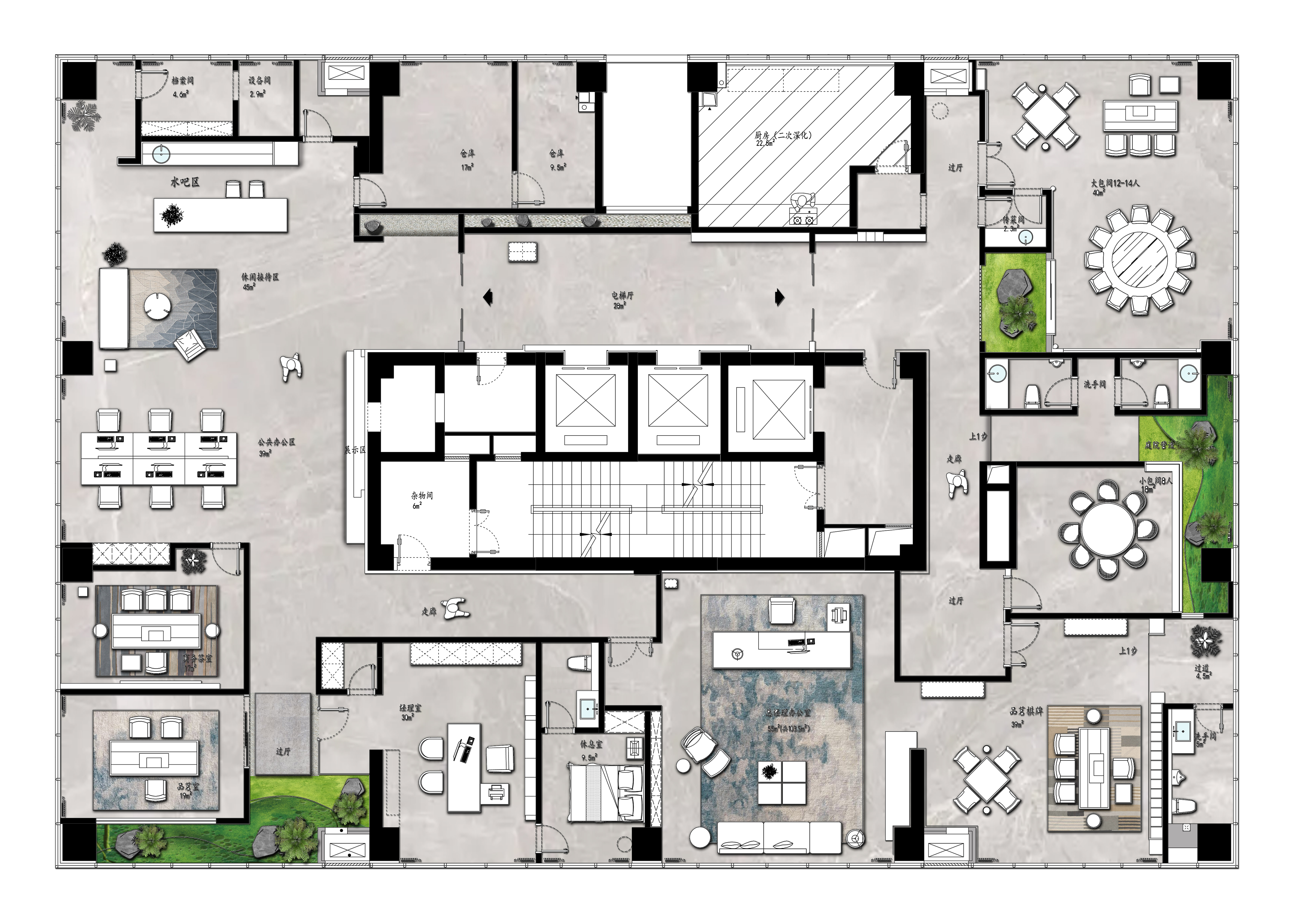 充分考虑了自然元素,让整个空间充满了生机和活力。大量的绿色植物,不仅美化了环境,还能让人感到放松和愉悦。明暗交错,动静相宜:利用自然光线与人工照明的巧妙搭配,营造出光影交错的效果,让空间既有活力又不失宁静。