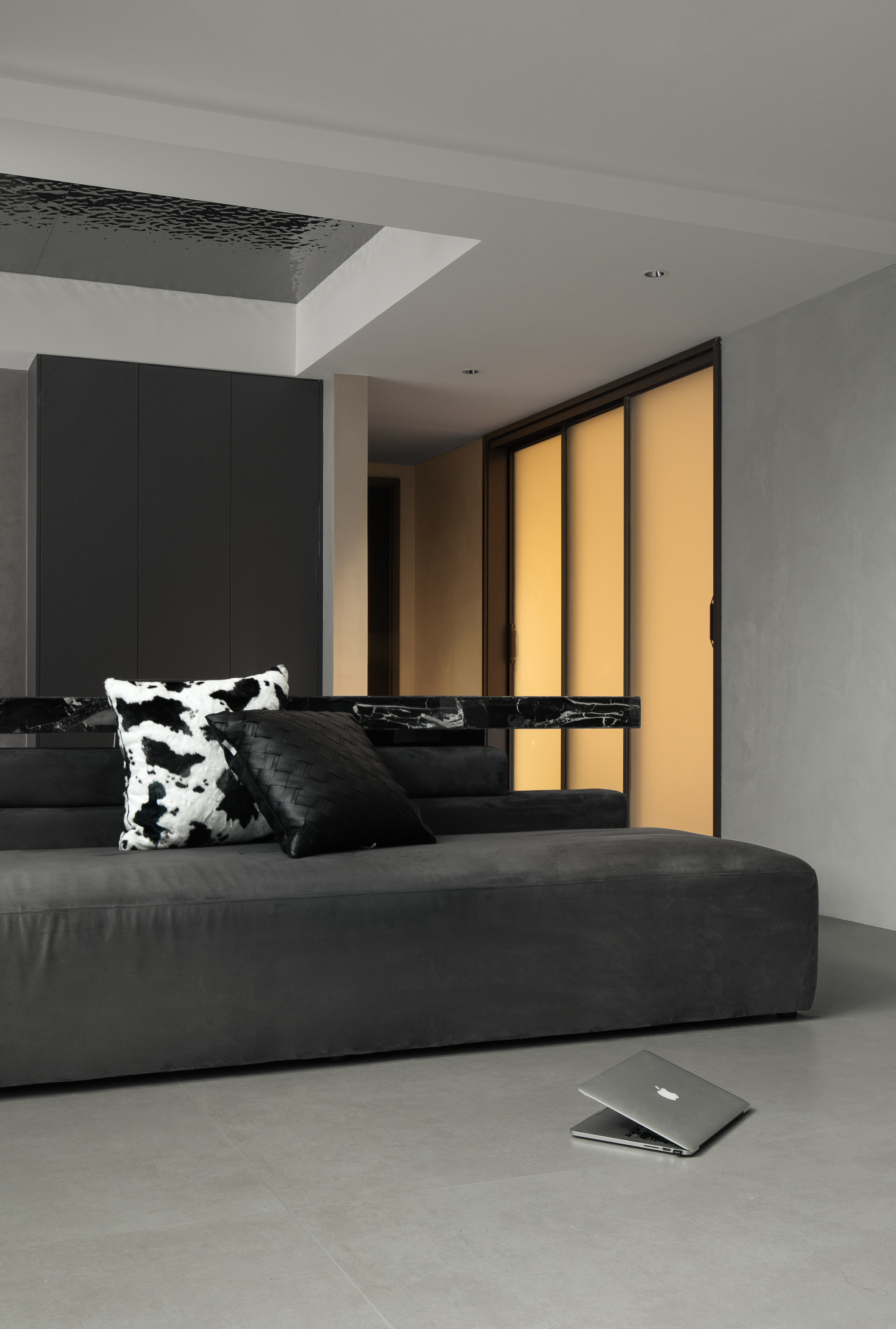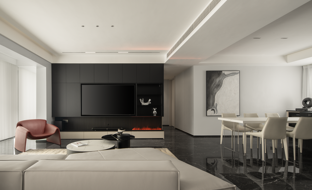 定制纯黑的沙发和电视墙颜色相呼应,让整体空间更高级!
