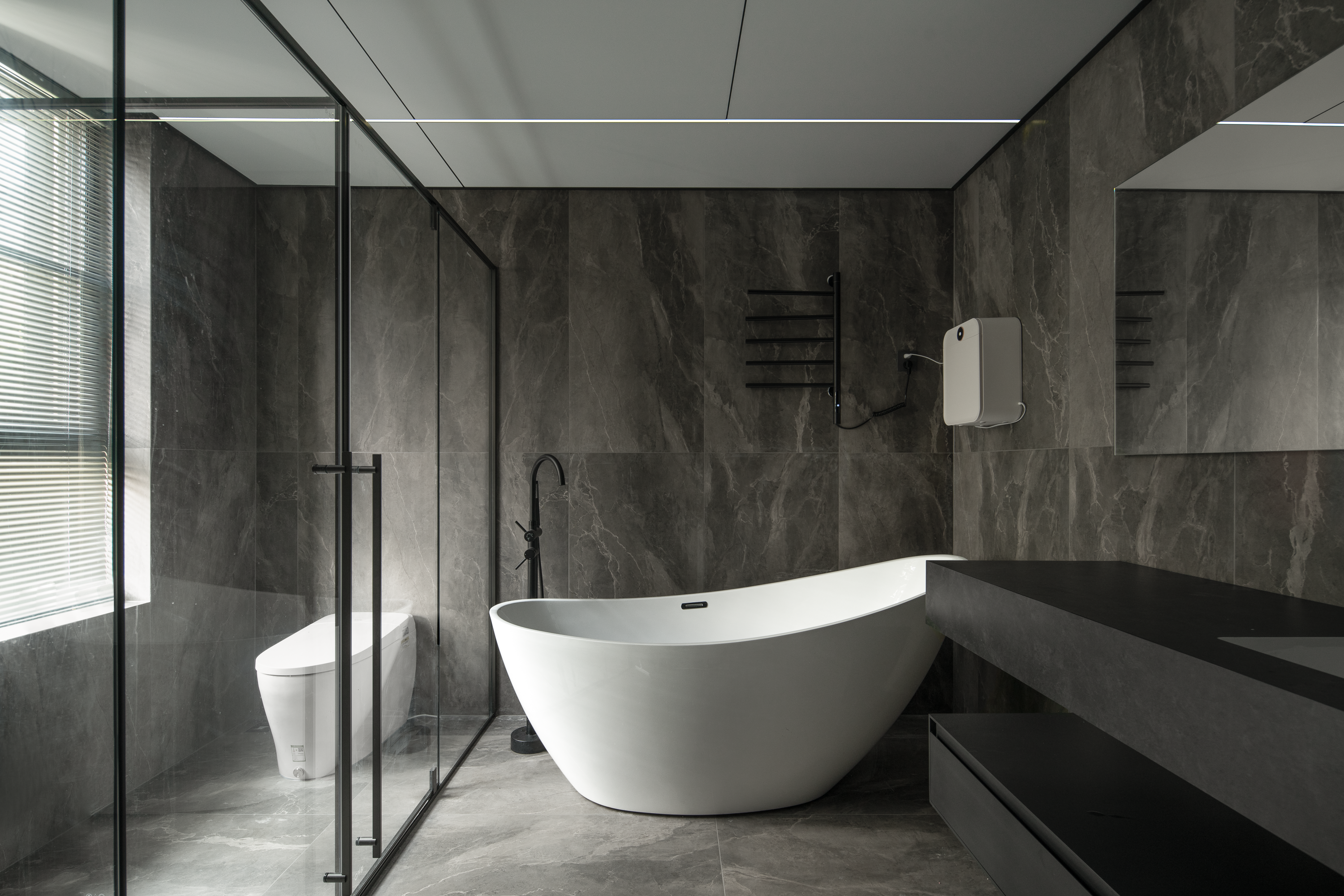 酒店式卫浴结构的空间,深色的墙面,搭配白色的卫浴用品,在色彩上行程强烈的反差
