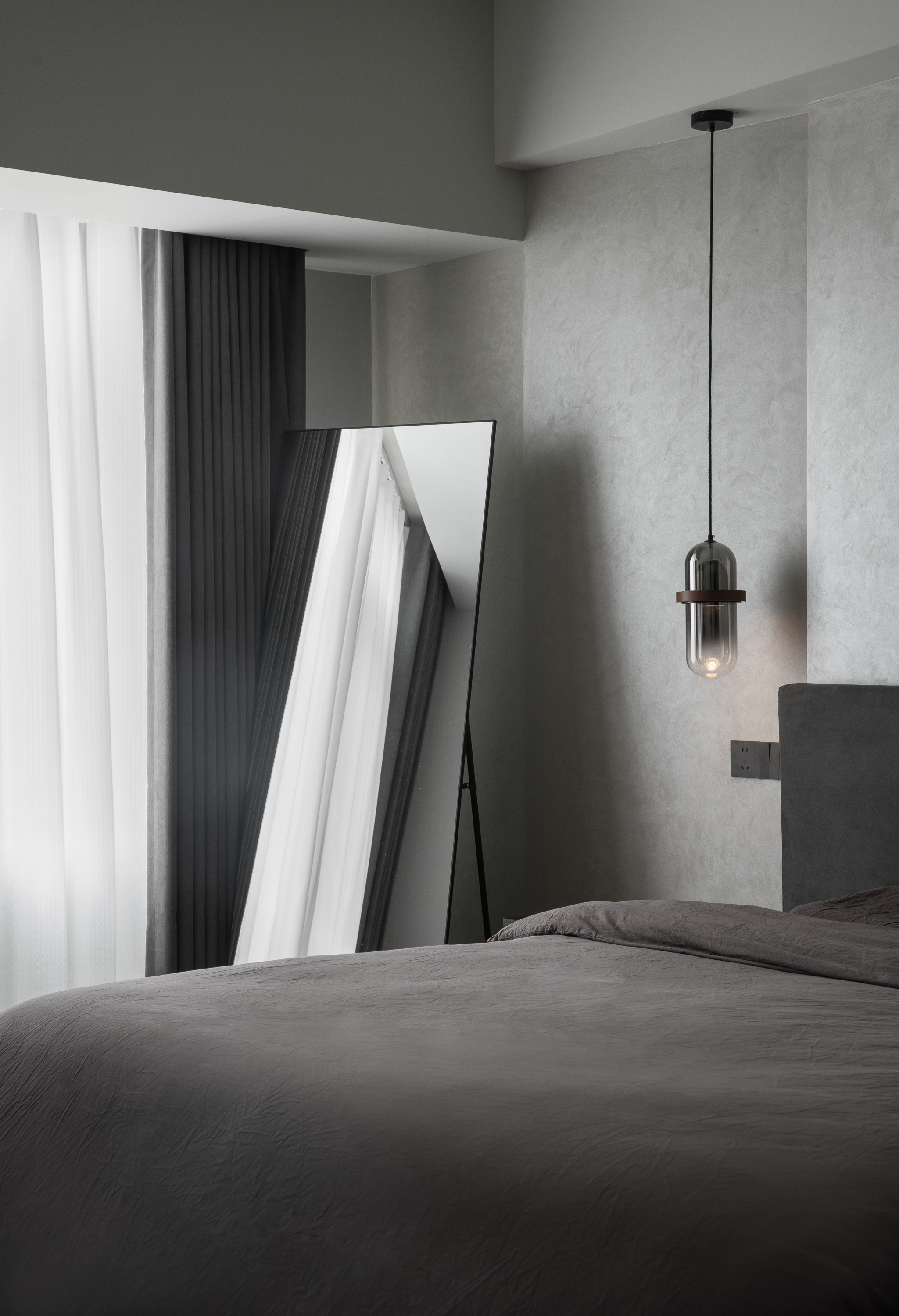 吊线灯的使用让空间更丰富,角落的镜子,实际也告诉我们,男孩子也是爱美的!