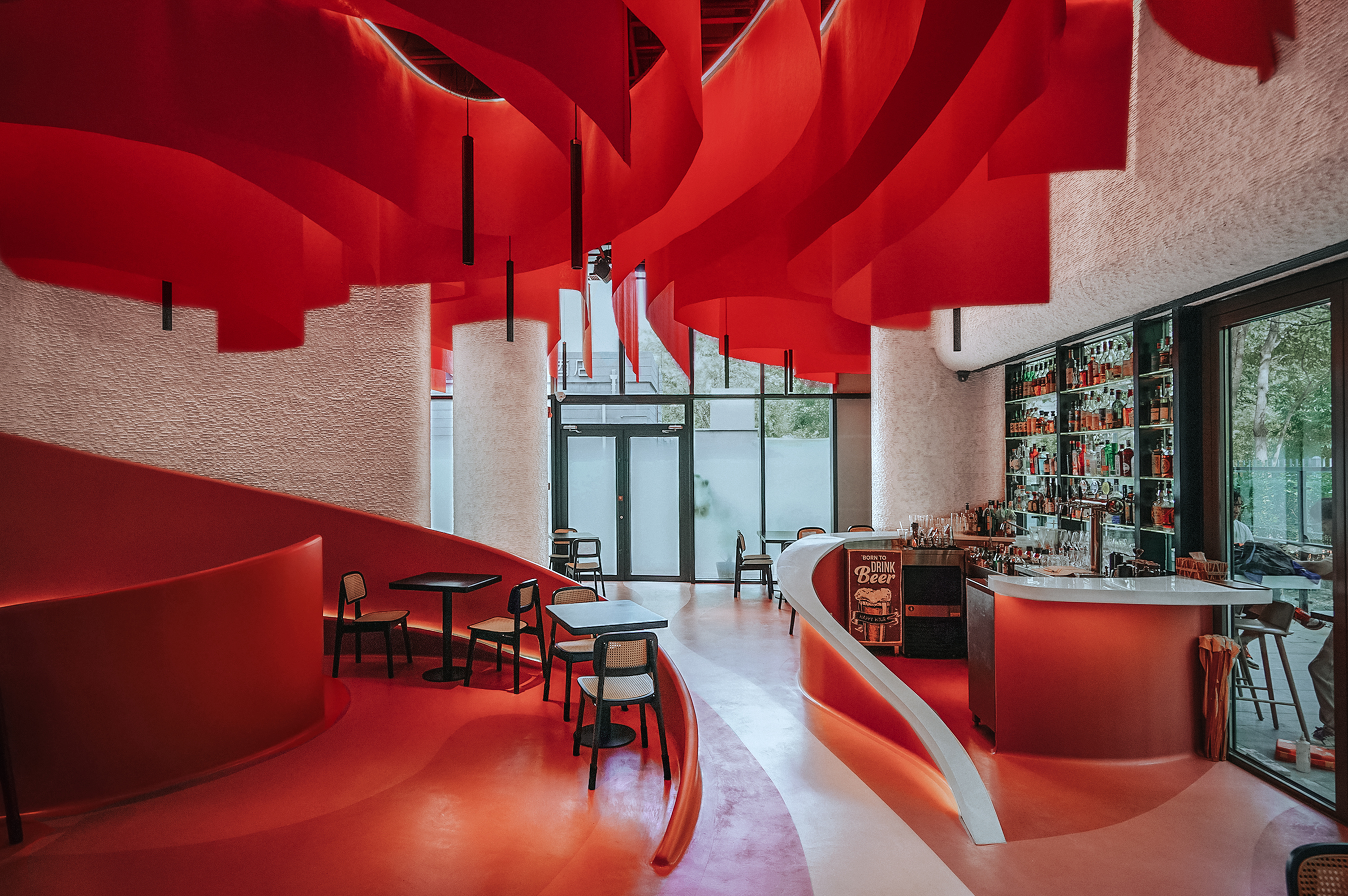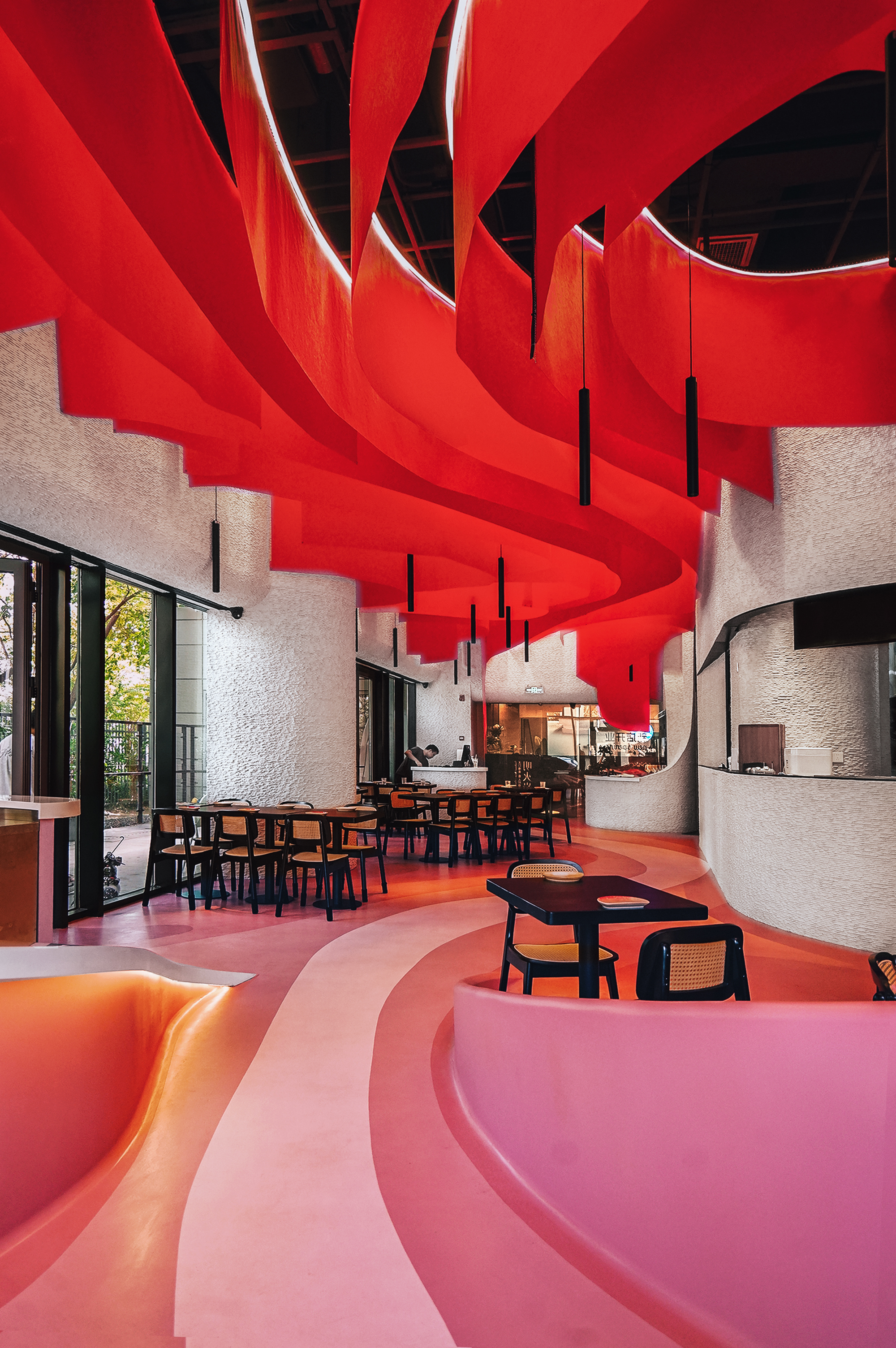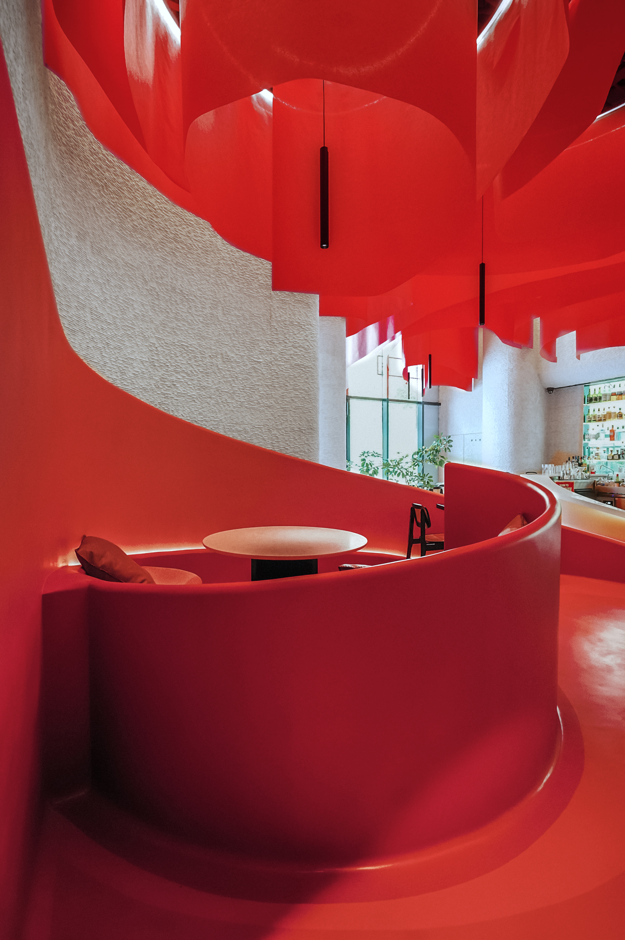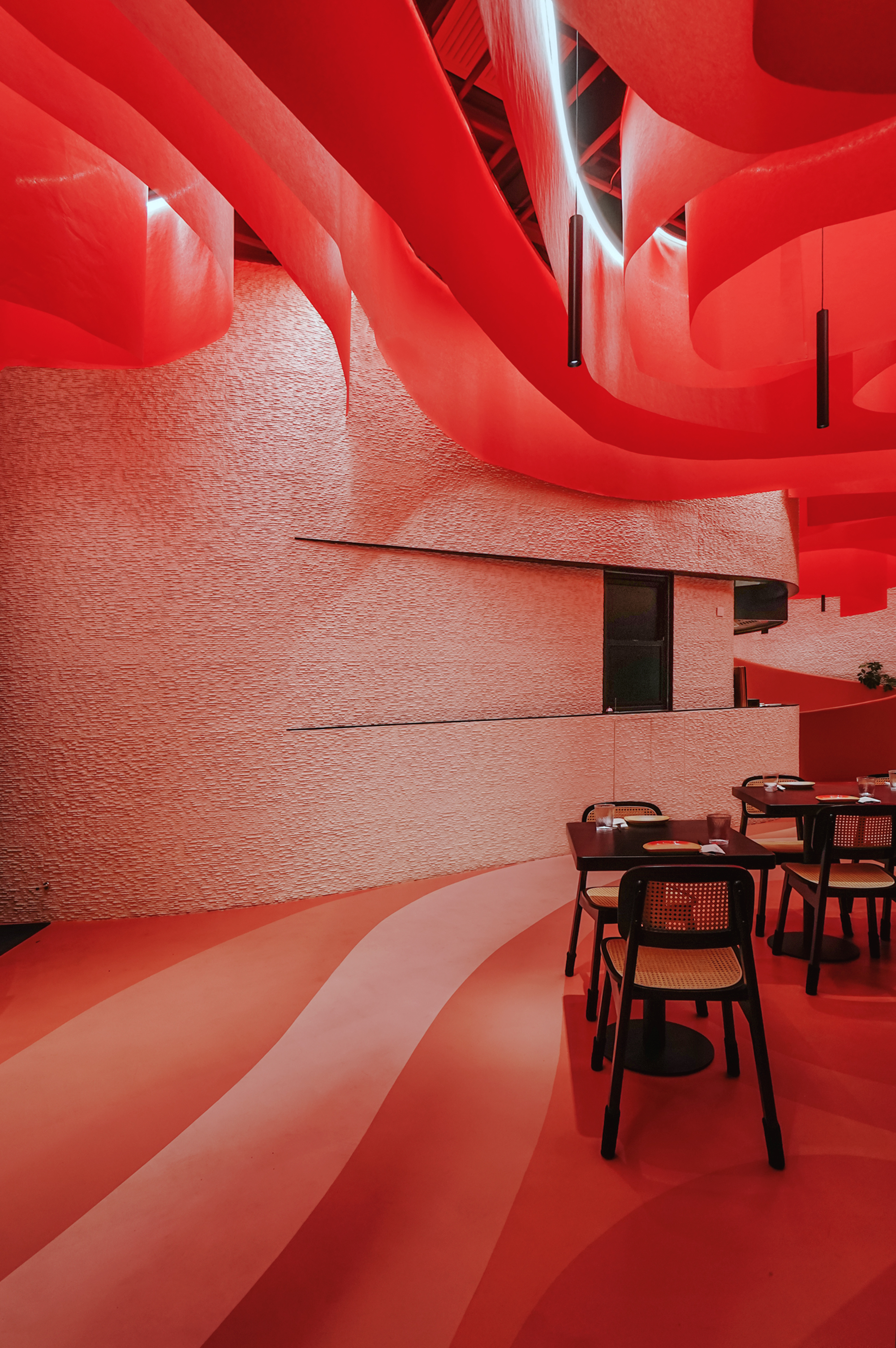 空间意境:整个餐厅以红色和白色为主色调,红色的纹理纸有着一定的透光度,在自然光和灯带的照射下形成了丰富的色彩系统,不同色阶的嫣红更是把地面的层次勾勒出来,在形成丰富的空间层次的同时,更营造出一种浪漫而温馨的空间氛围。 在白天和夜晚也呈现出完全不一样的视觉体验。Somesome餐厅流动空间的设计,流畅且灵动,打破了传统餐厅餐桌沿着墙体排列的常规,和横平竖直呆板沉闷的排布方式。随着空间的流动,餐桌的排布以及朝向似乎也受到这种社会力推动而达到的平衡状态,每一组就餐空间通过这种牵引和博弈形成了既连贯又相对独立和私密的小空间。