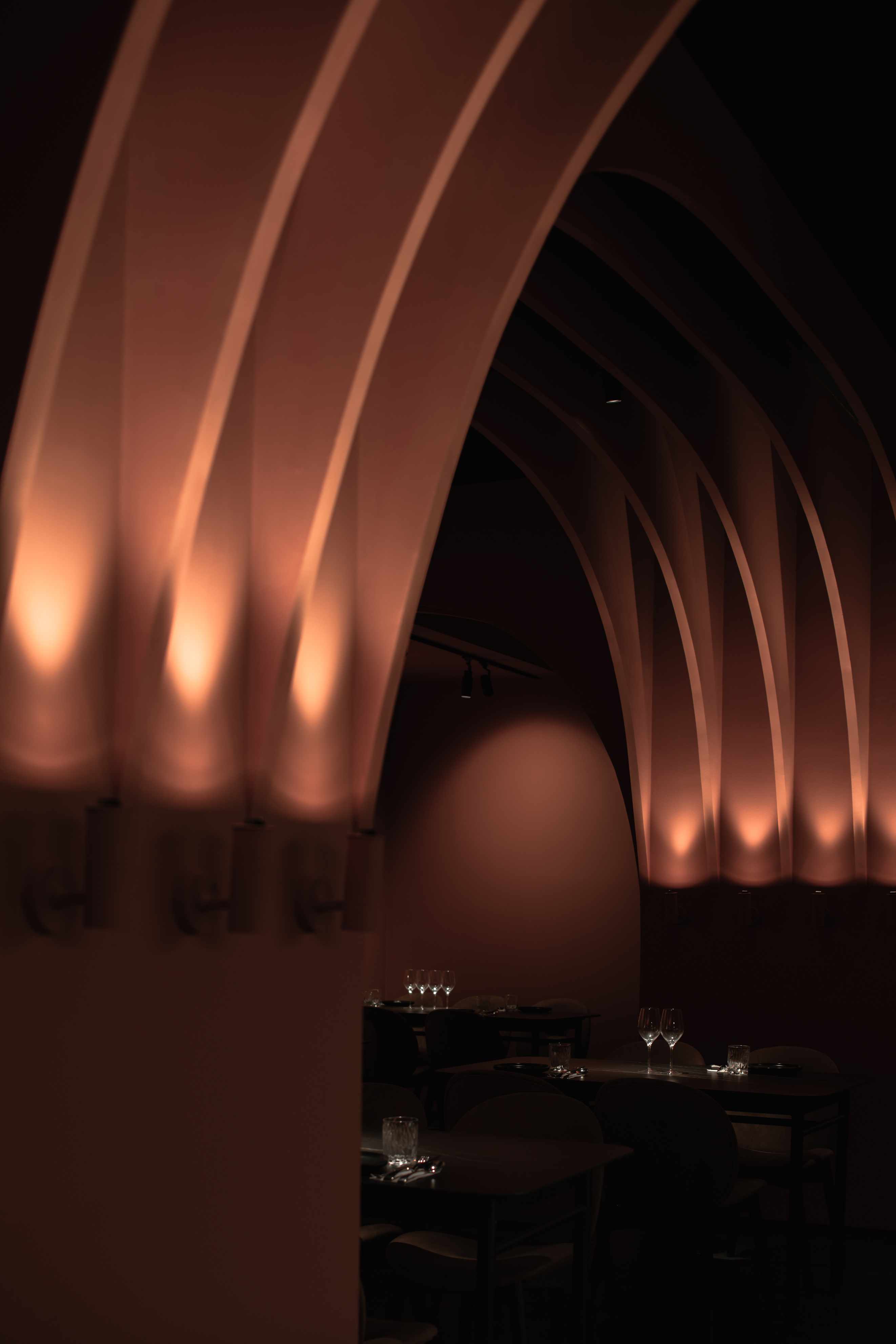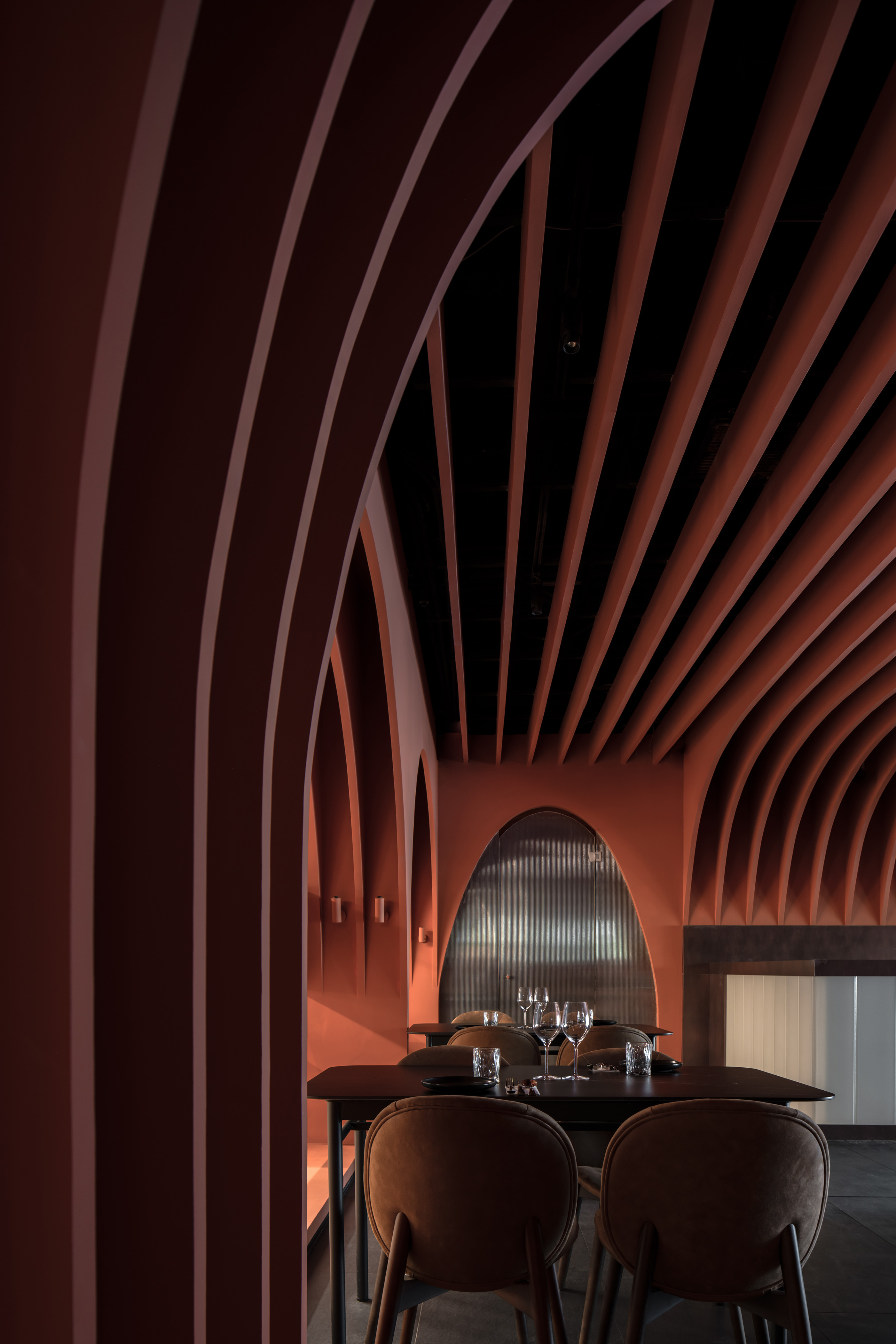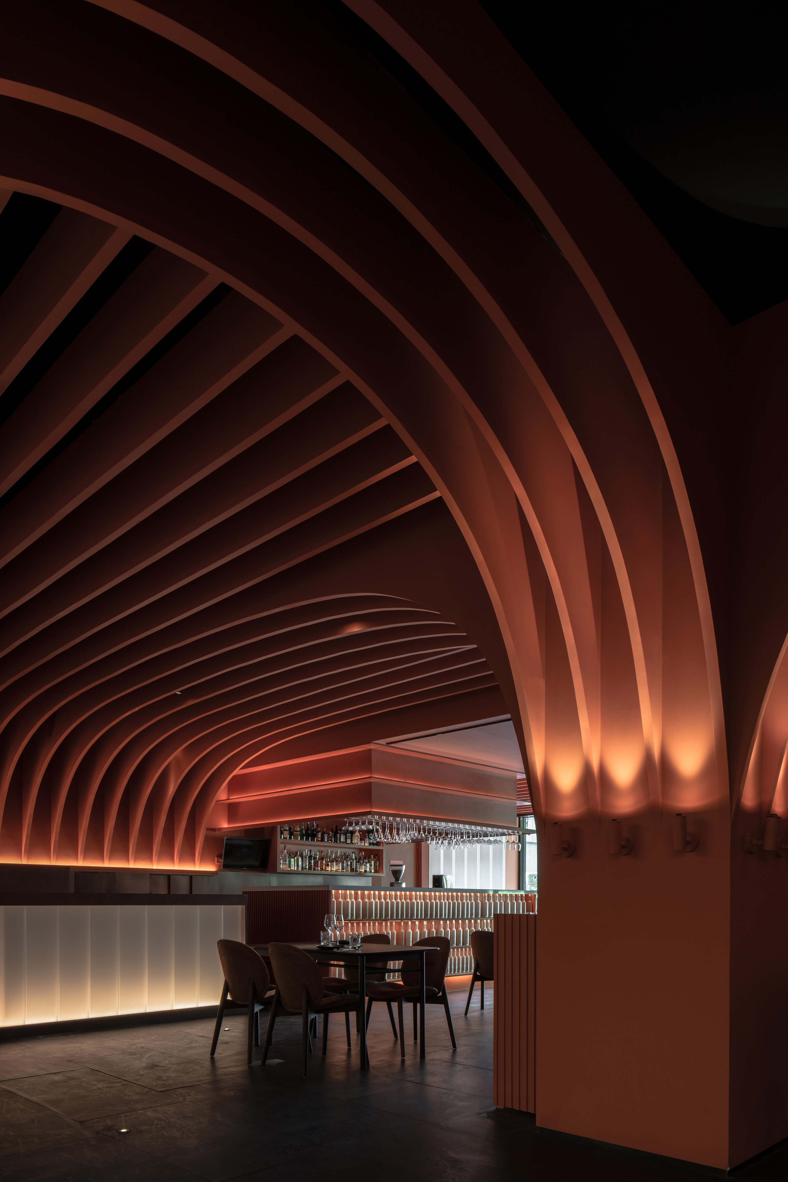 室内空间相对方正,我们以场地内现有的结构柱为形态的发生点,由柱至顶形成多层的薄片拱形,对空间进行重组与划分。就餐空间采用较为灵活的设计,没有任何的固定卡座,纯粹通过桌椅的组合来营造微妙的就餐氛围。空间内的主要构筑元素为拱形的薄片,在场地内划分出不同的就餐区域,且每个角度都有自己的构筑组合方式。拱形结构利用了建筑的照明手法,在构筑物的底端增加了辅助照明,以强调出空间内的建筑序列感。