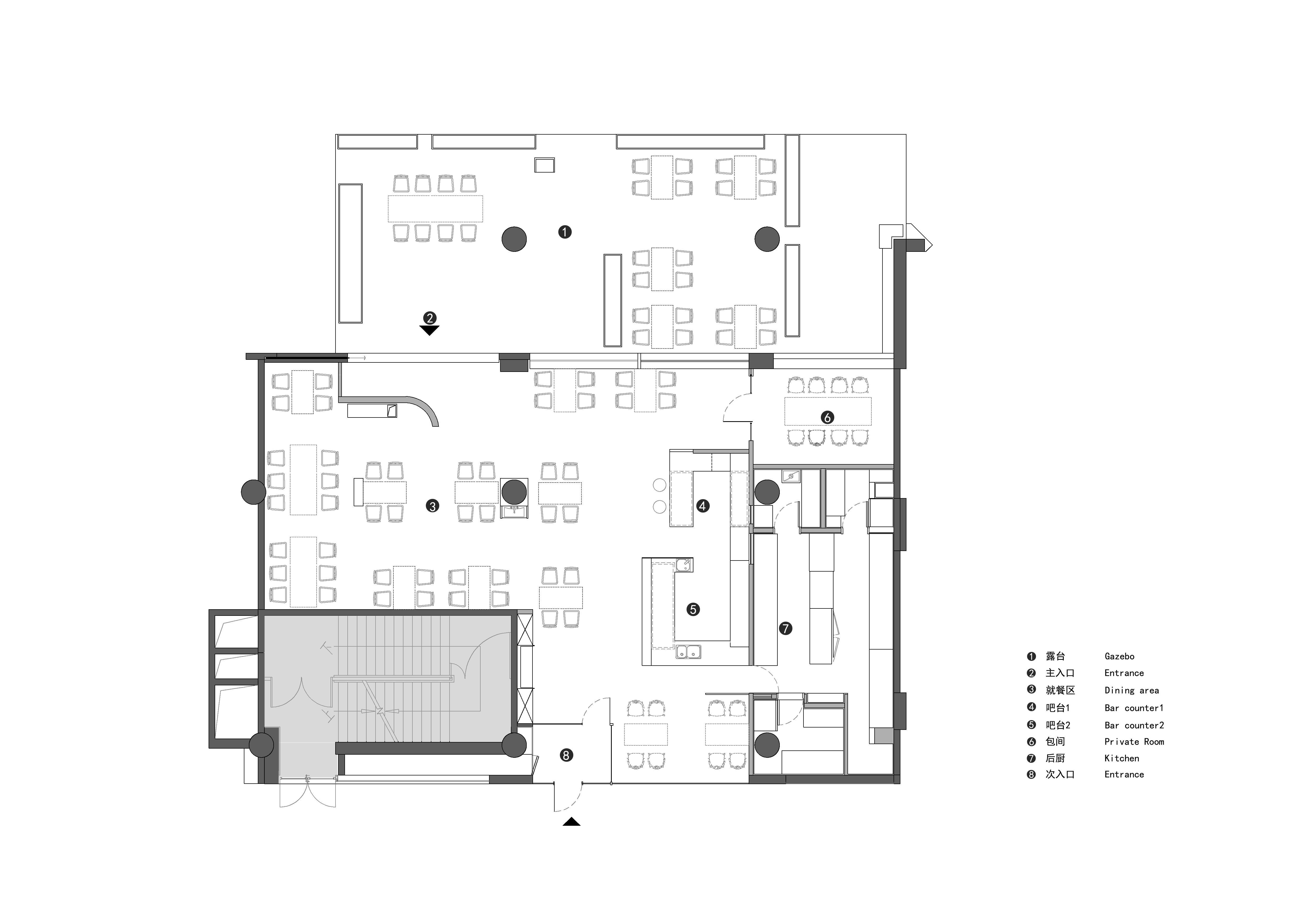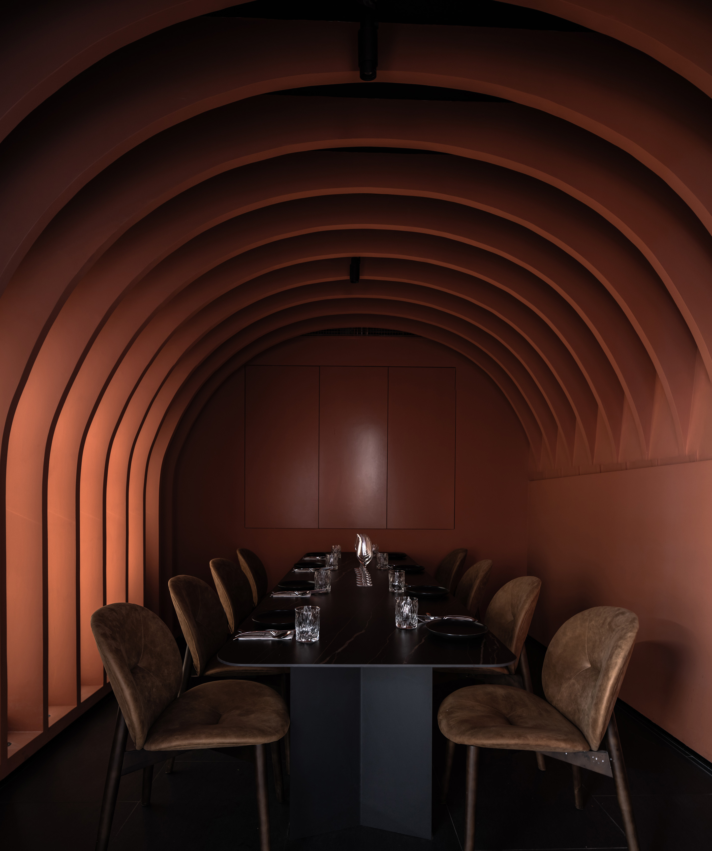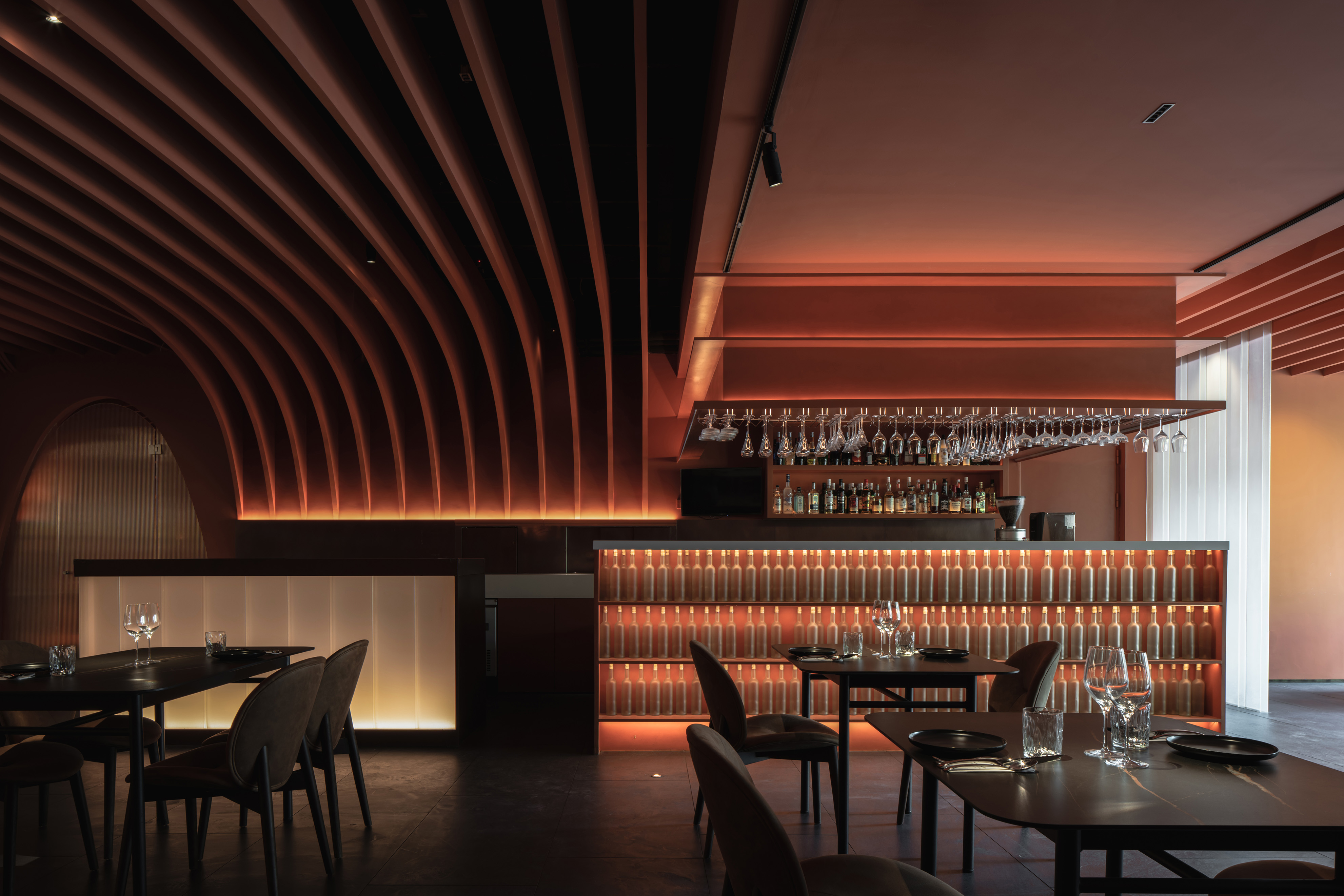 室内空间相对方正,我们以场地内现有的结构柱为形态的发生点,由柱至顶形成多层的薄片拱形,对空间进行重组与划分。就餐空间采用较为灵活的设计,没有任何的固定卡座,纯粹通过桌椅的组合来营造微妙的就餐氛围。空间内的主要构筑元素为拱形的薄片,在场地内划分出不同的就餐区域,且每个角度都有自己的构筑组合方式。拱形结构利用了建筑的照明手法,在构筑物的底端增加了辅助照明,以强调出空间内的建筑序列感。