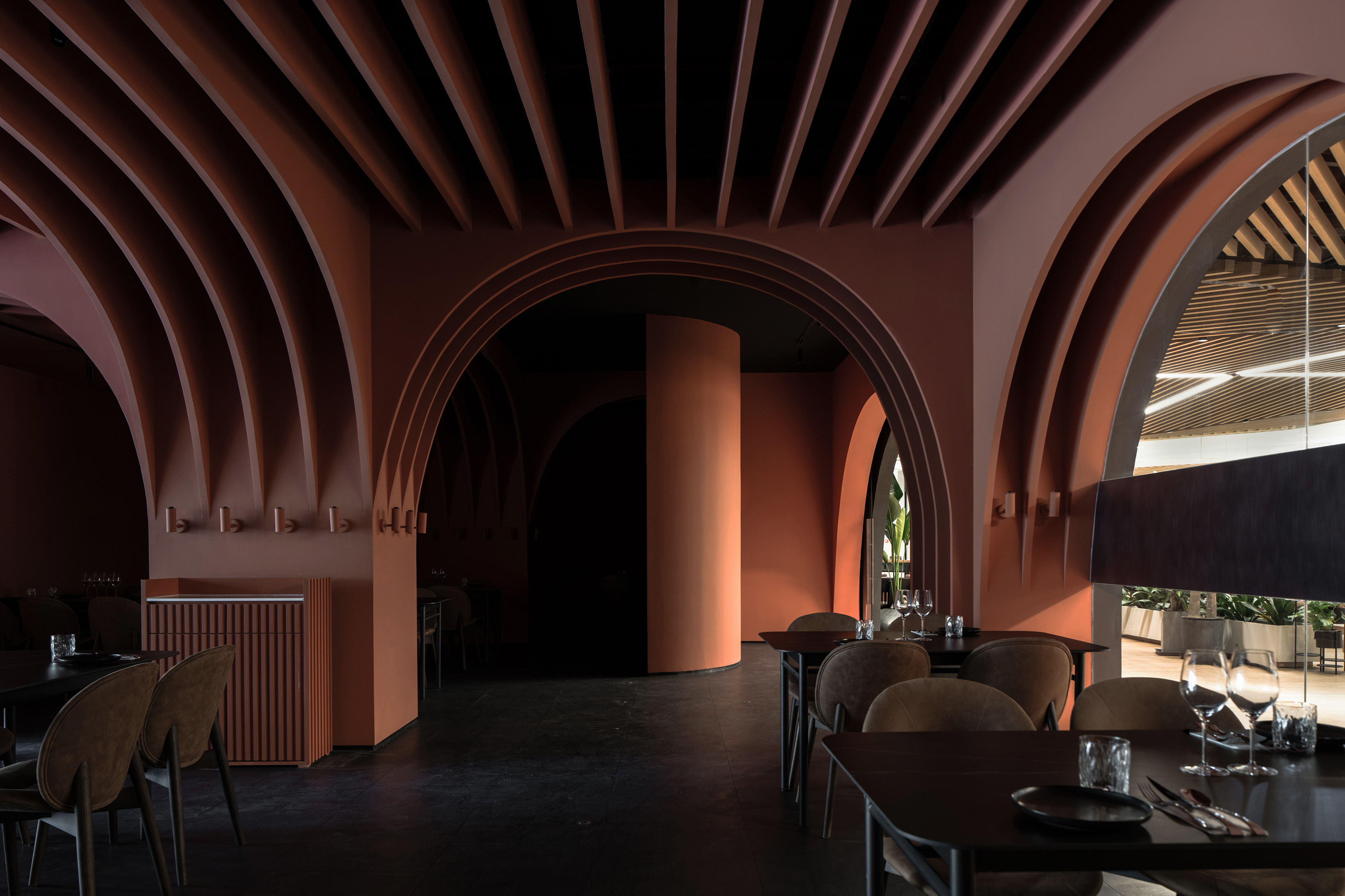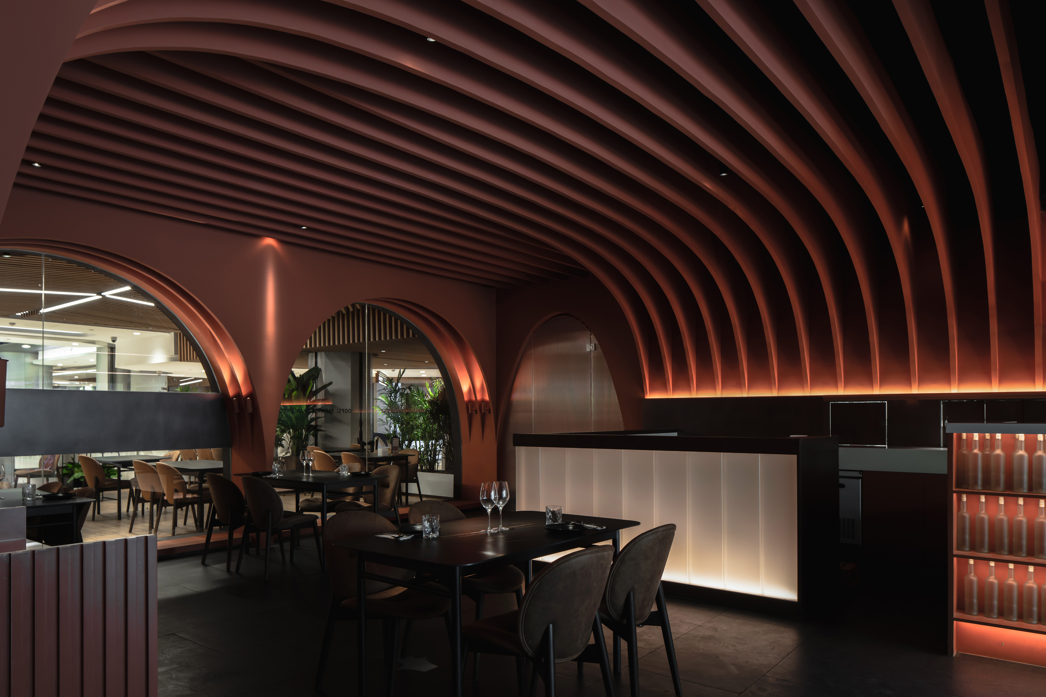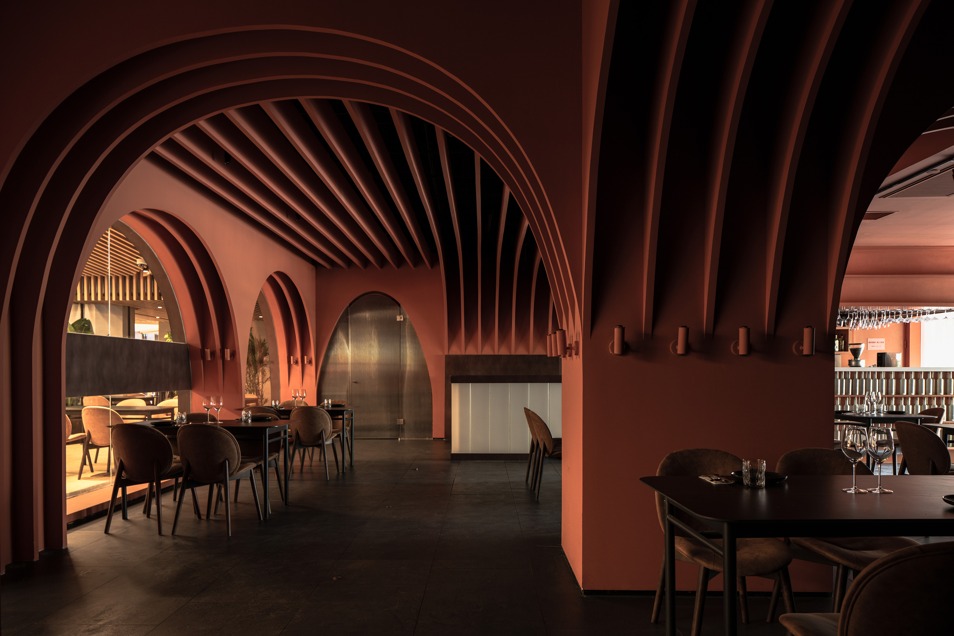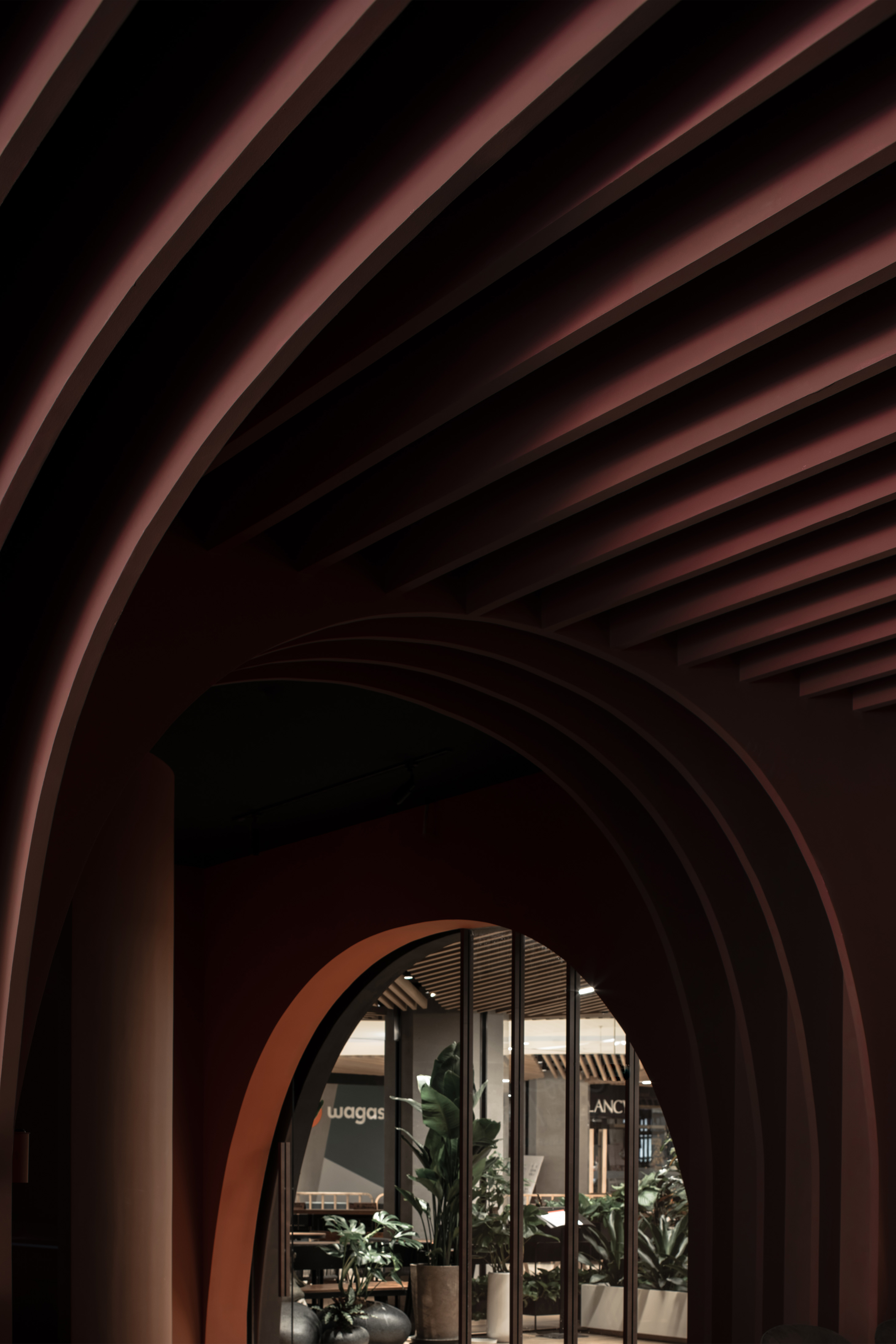 商场内部由各类餐饮构成,人工照明亮度大且不统一,导致场地入口处光环境混乱,为此我们在入口处打造特有的场域氛围:外墙由简约的深色拱形构成,在视觉上从混杂的环境中脱颖而出;内部绛红色的空间同外侧形成鲜明而强烈的对比,营造出“马德里街头拱形建筑结构下就餐的走廊”,吸引路人步入体验内部空间。