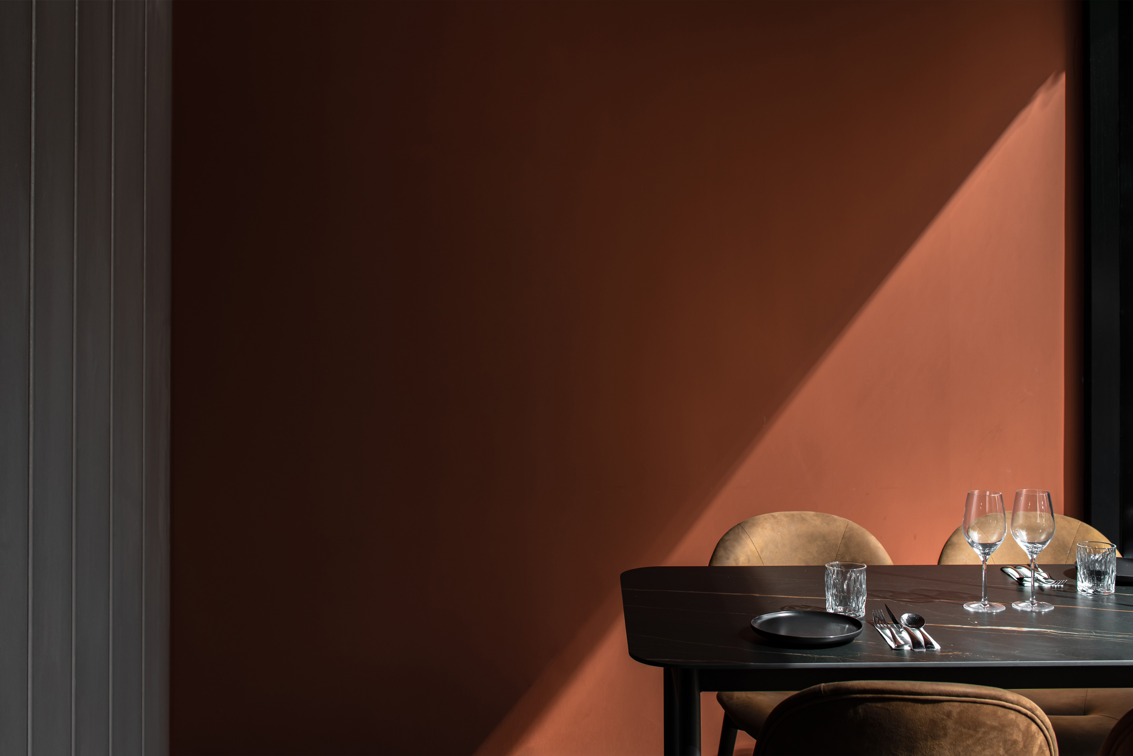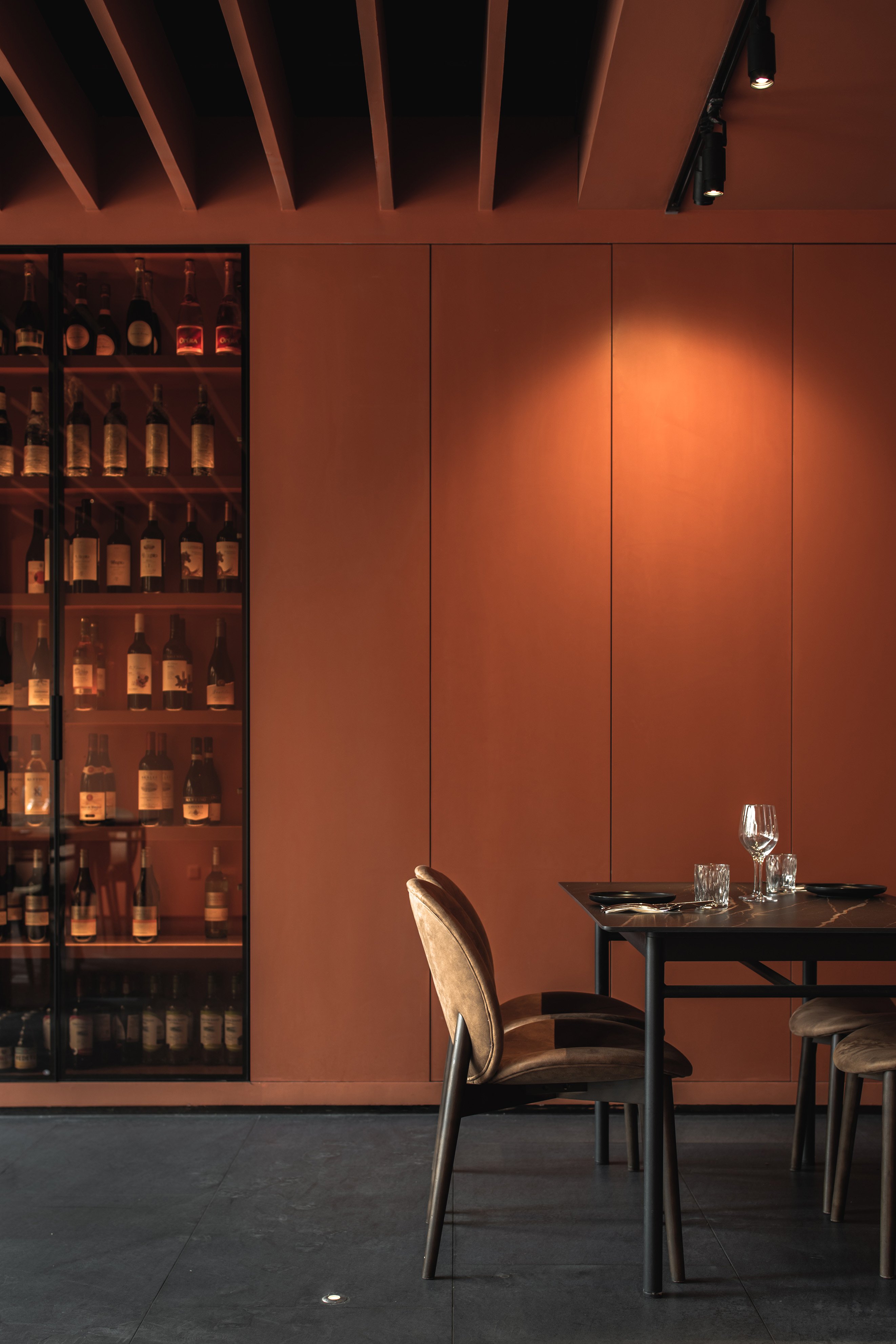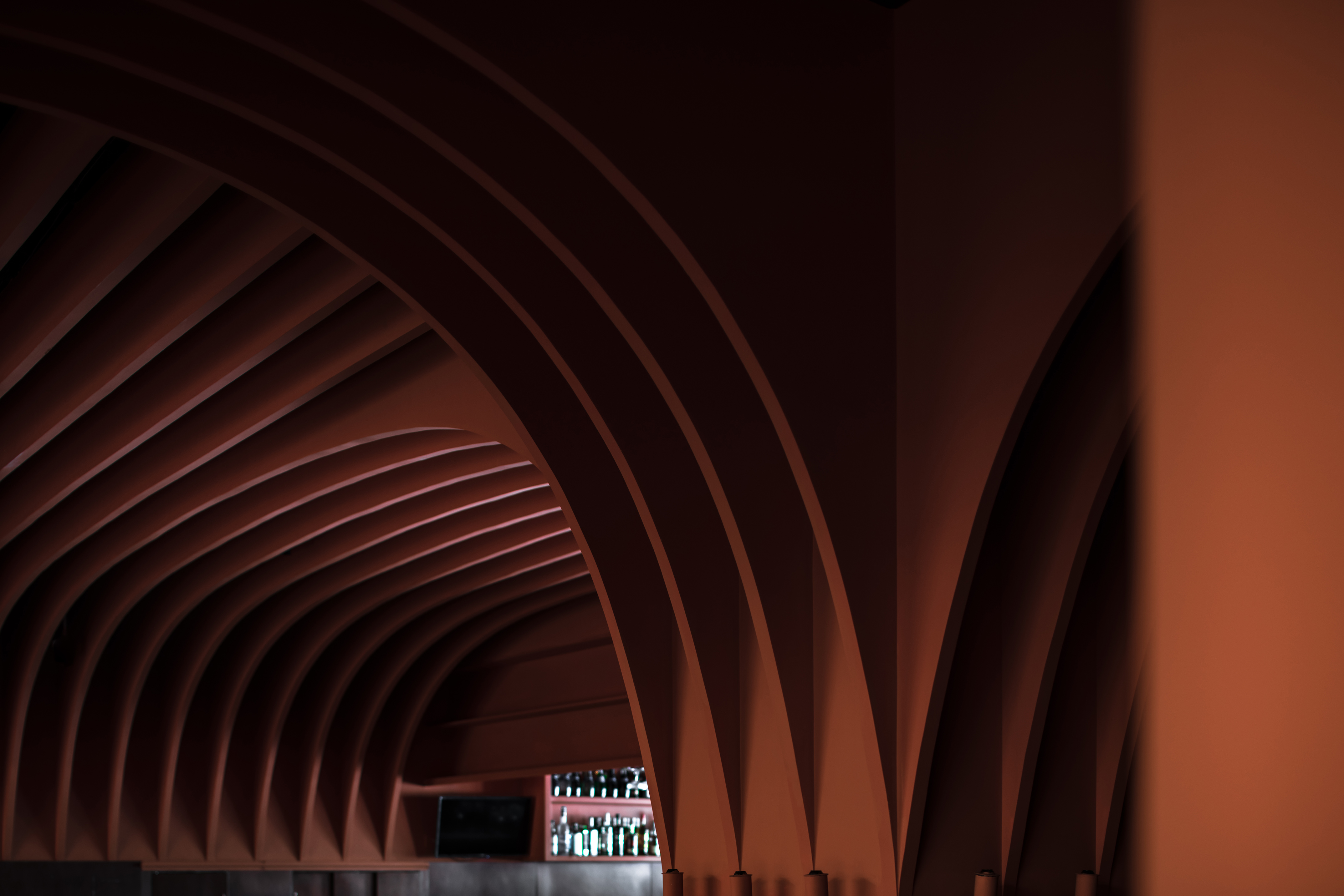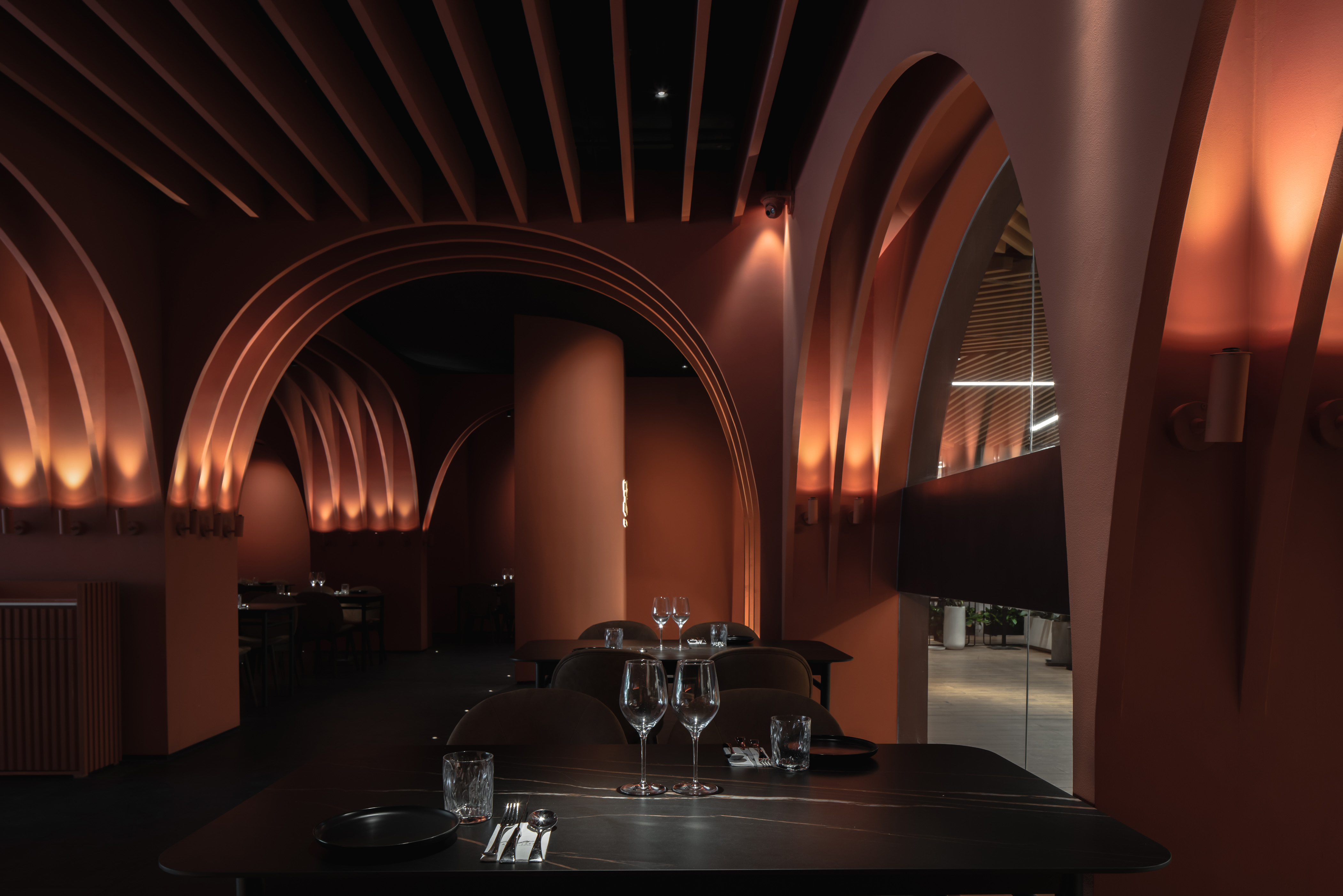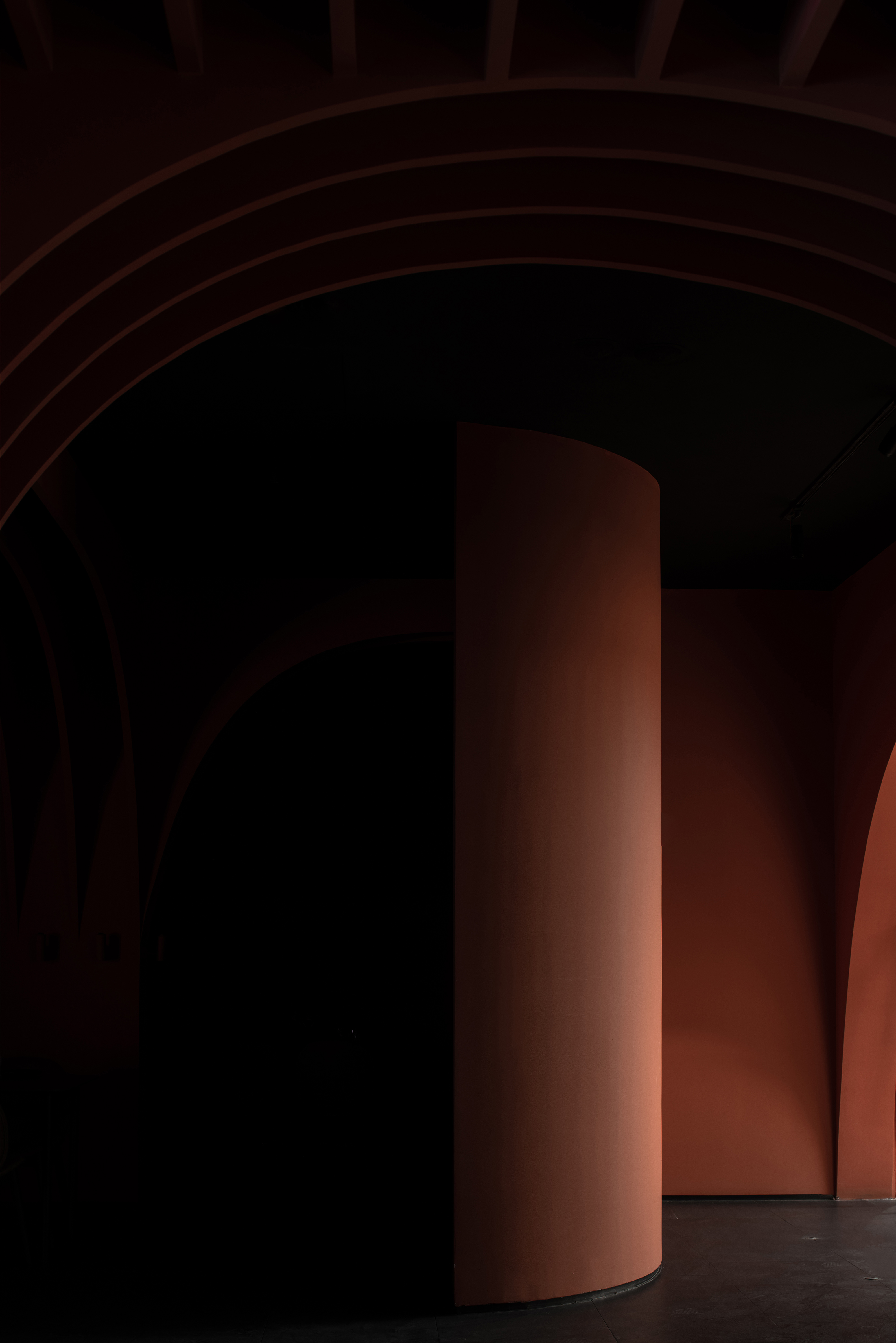 商场内部由各类餐饮构成,人工照明亮度大且不统一,导致场地入口处光环境混乱,为此我们在入口处打造特有的场域氛围:外墙由简约的深色拱形构成,在视觉上从混杂的环境中脱颖而出;内部绛红色的空间同外侧形成鲜明而强烈的对比,营造出“马德里街头拱形建筑结构下就餐的走廊”,吸引路人步入体验内部空间。