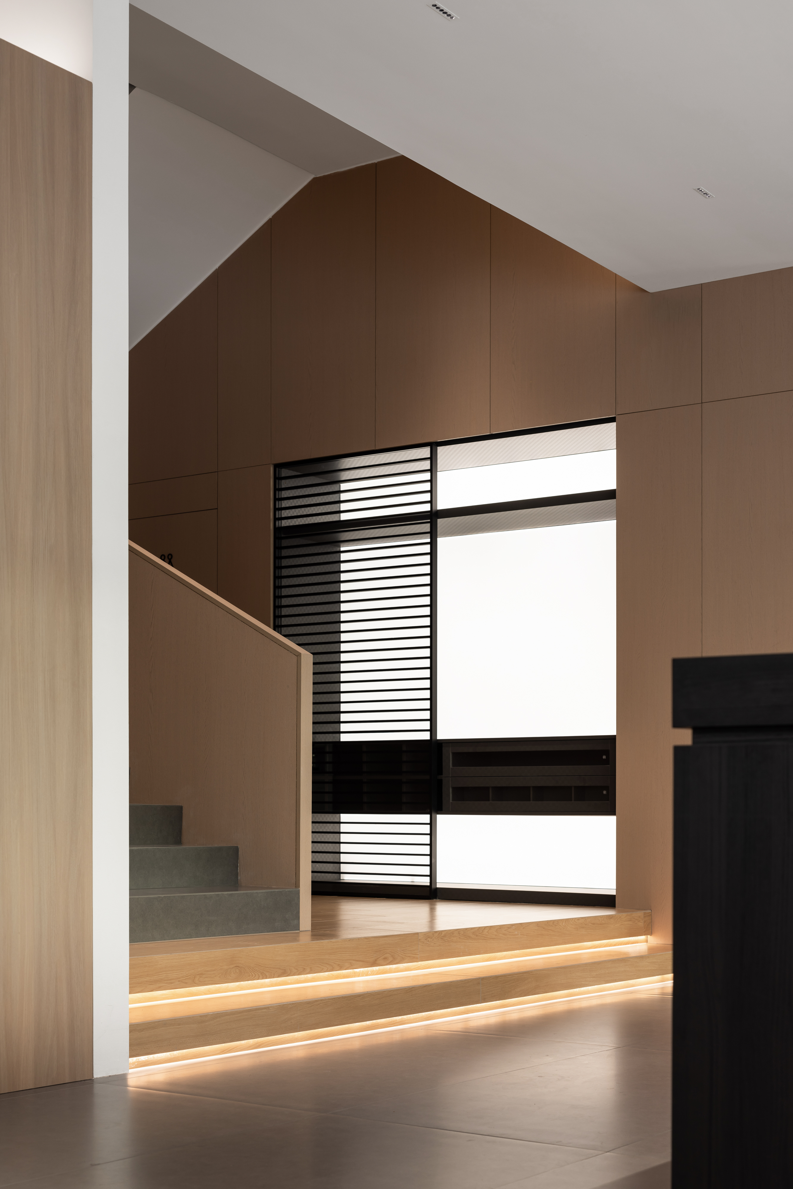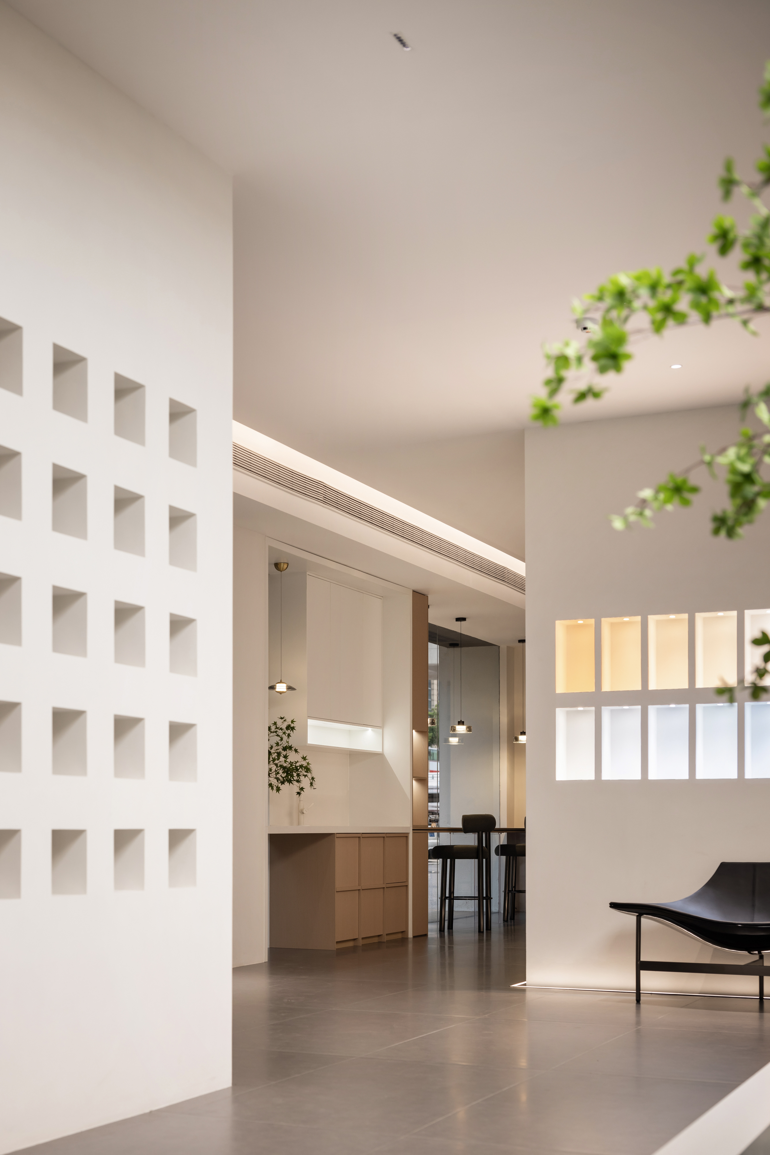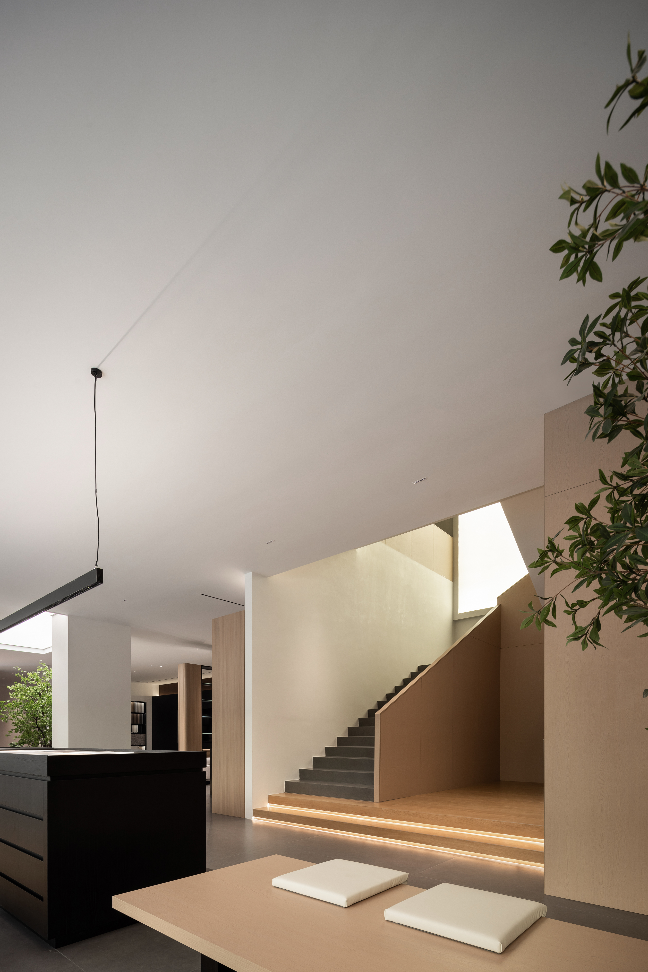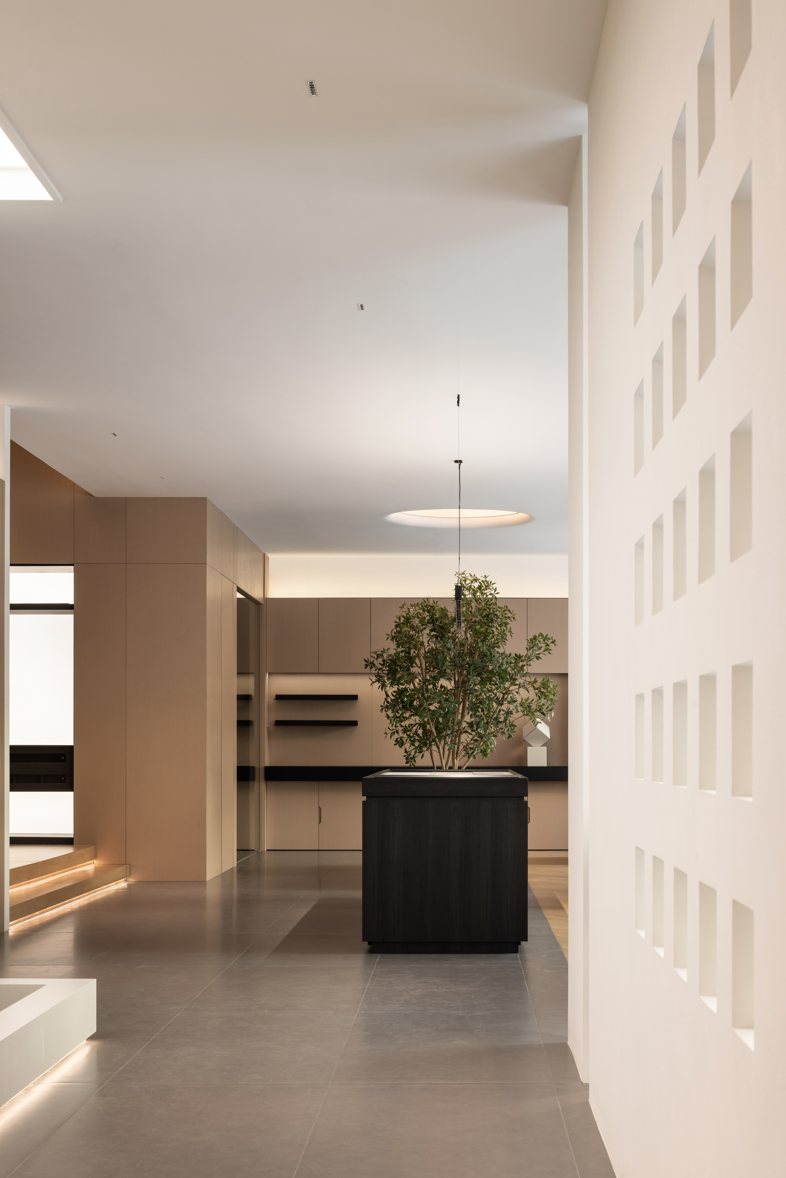 空间用材为定制板材、艺术涂料、哑光瓷砖和木纹瓷砖,整体给人带来素雅、宁静的感觉。