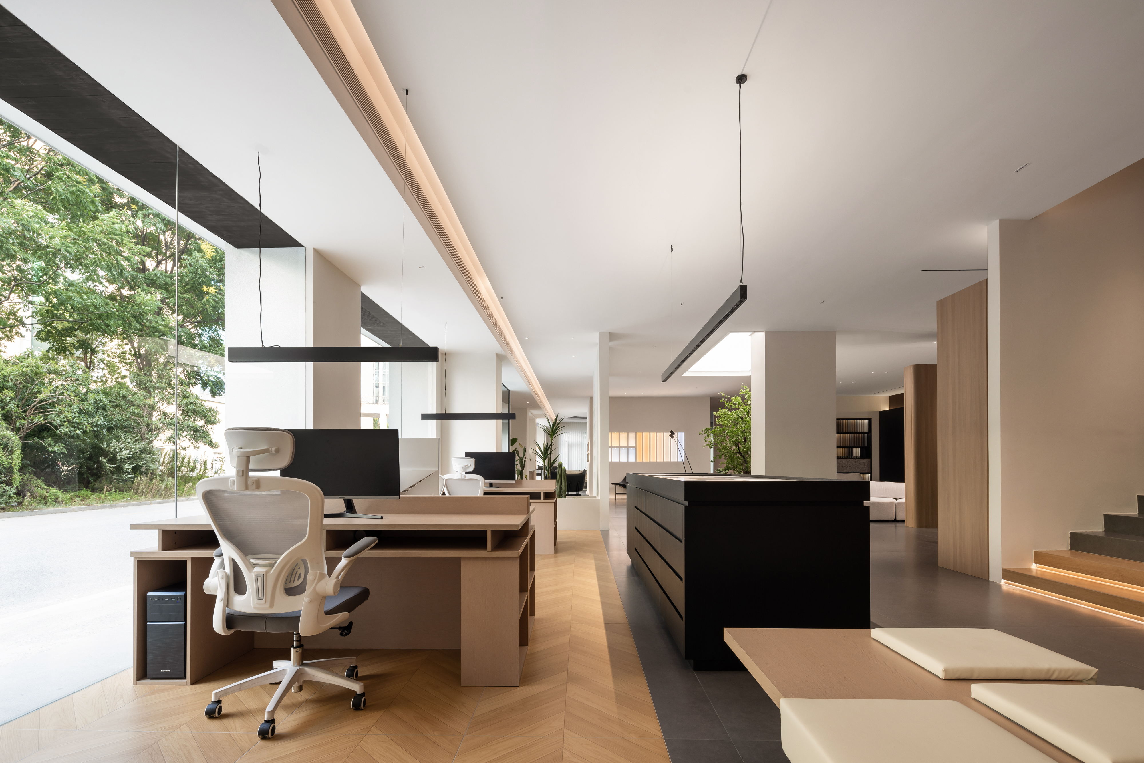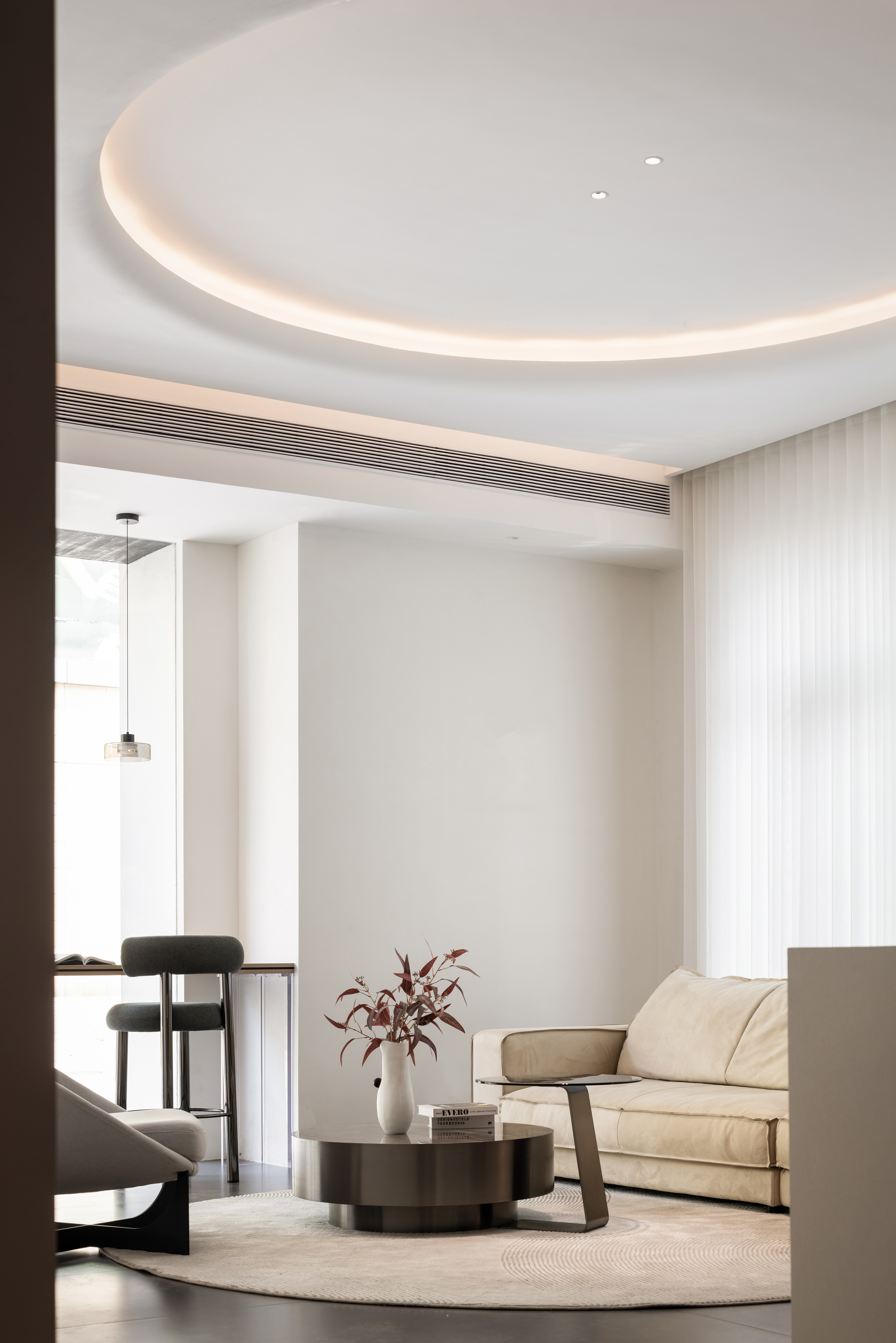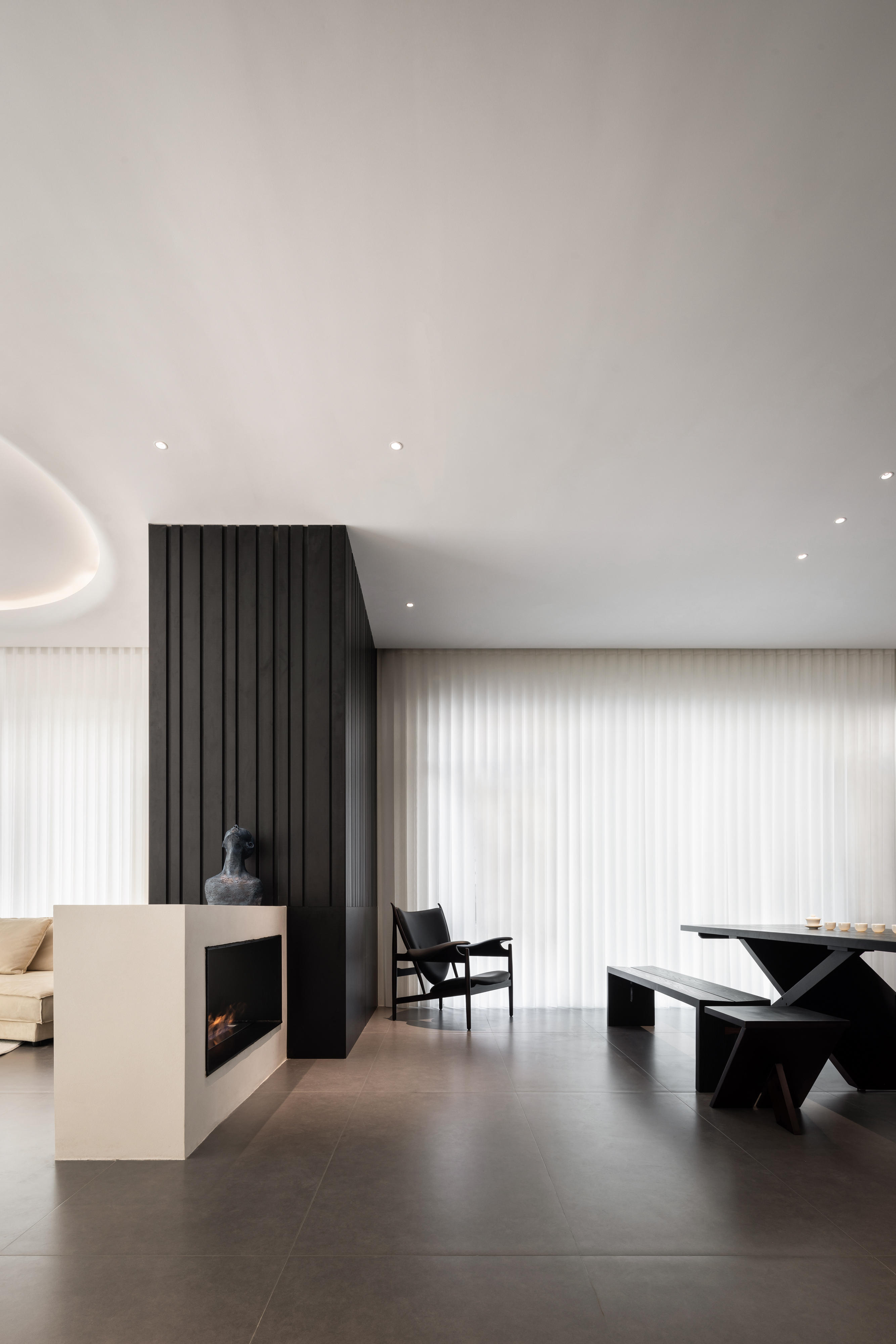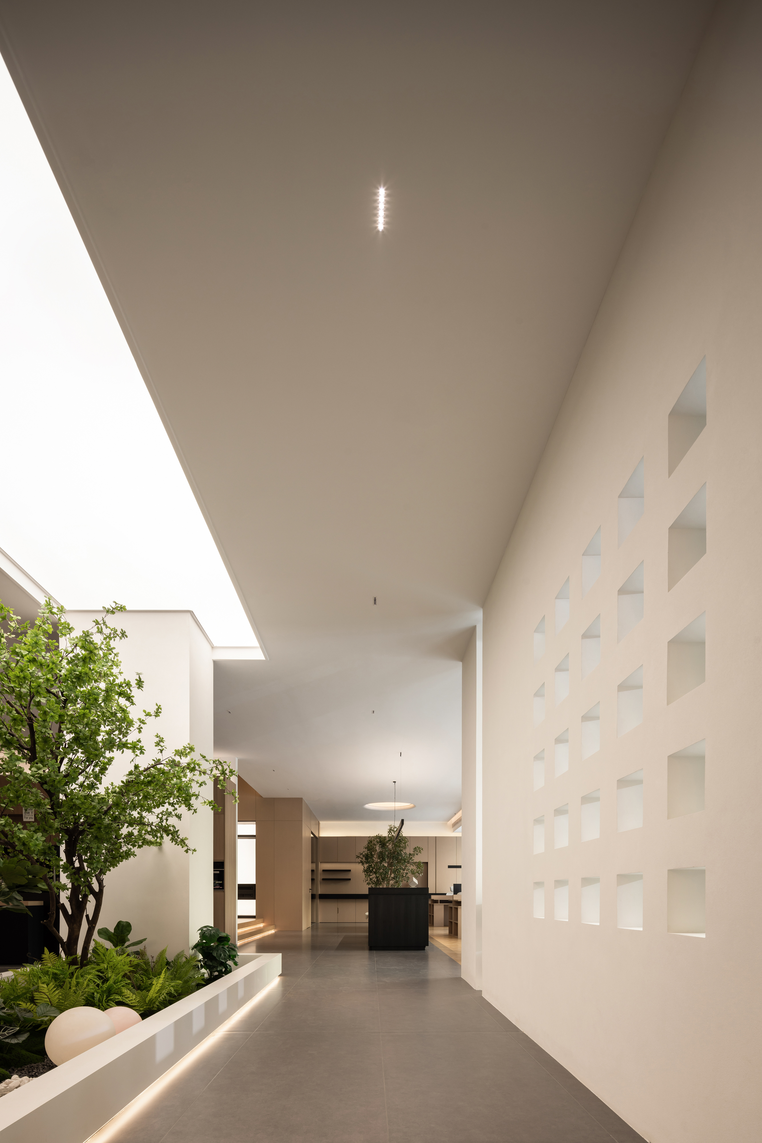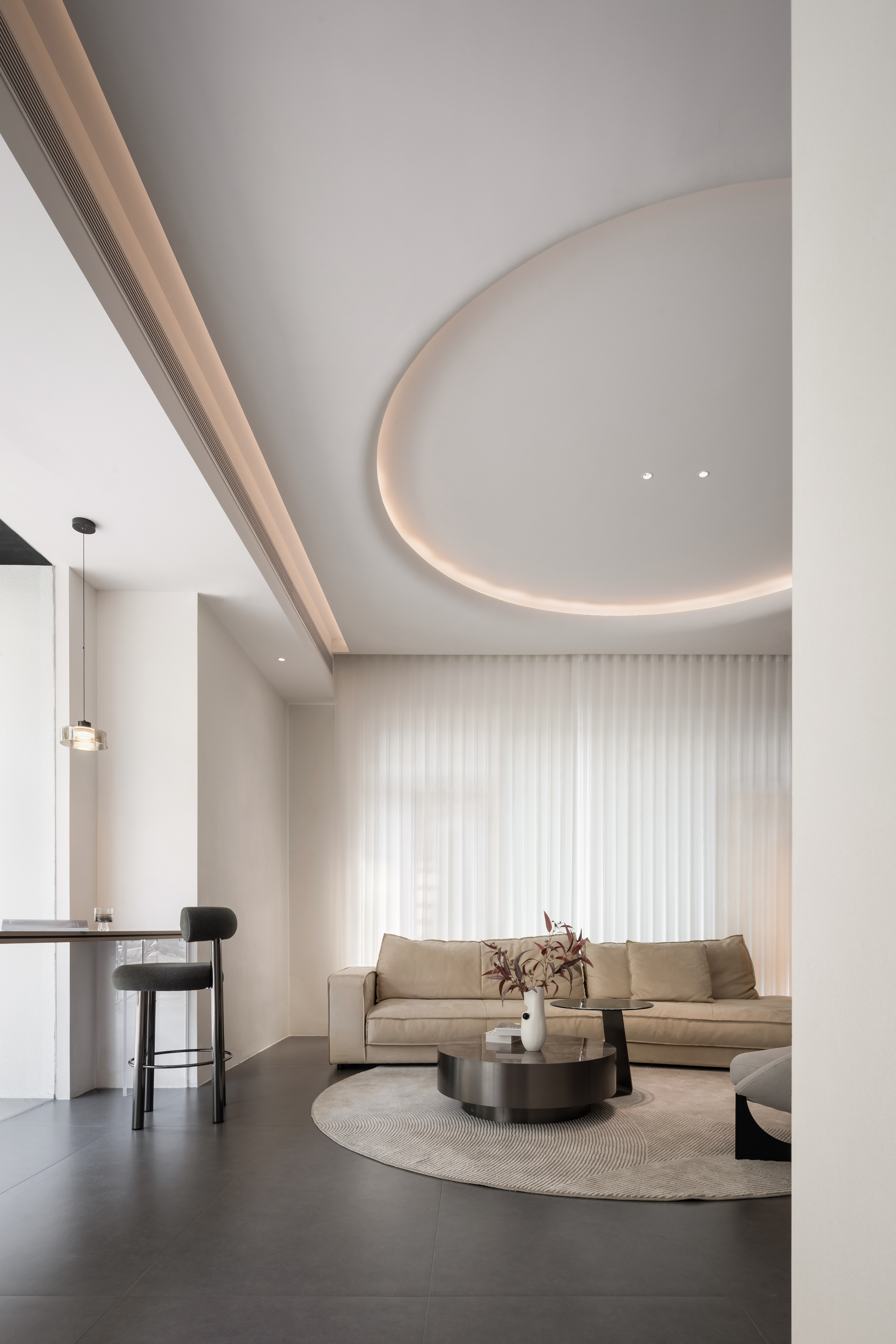 空间用材为定制板材、艺术涂料、哑光瓷砖和木纹瓷砖,整体给人带来素雅、宁静的感觉。