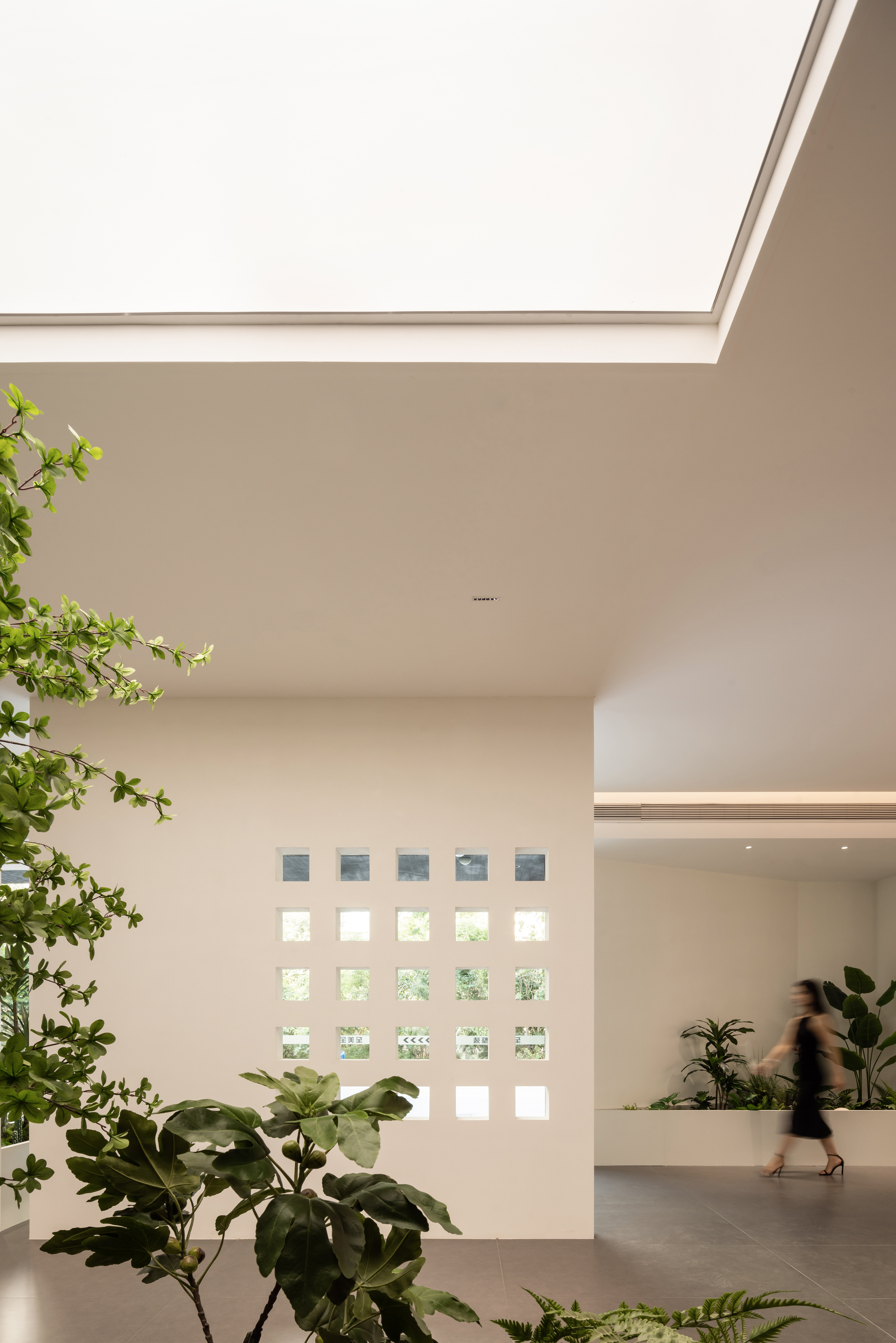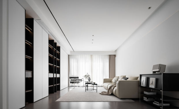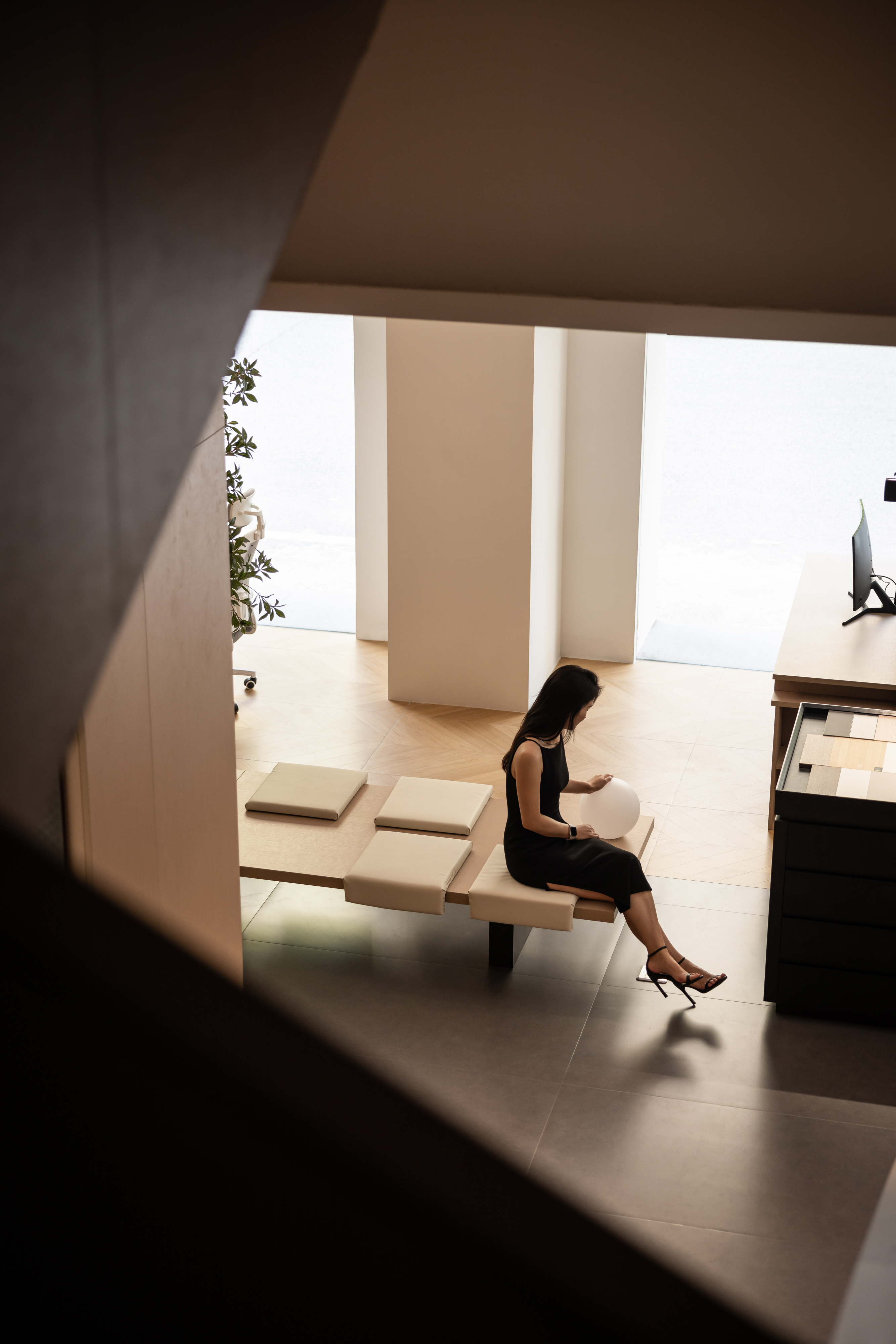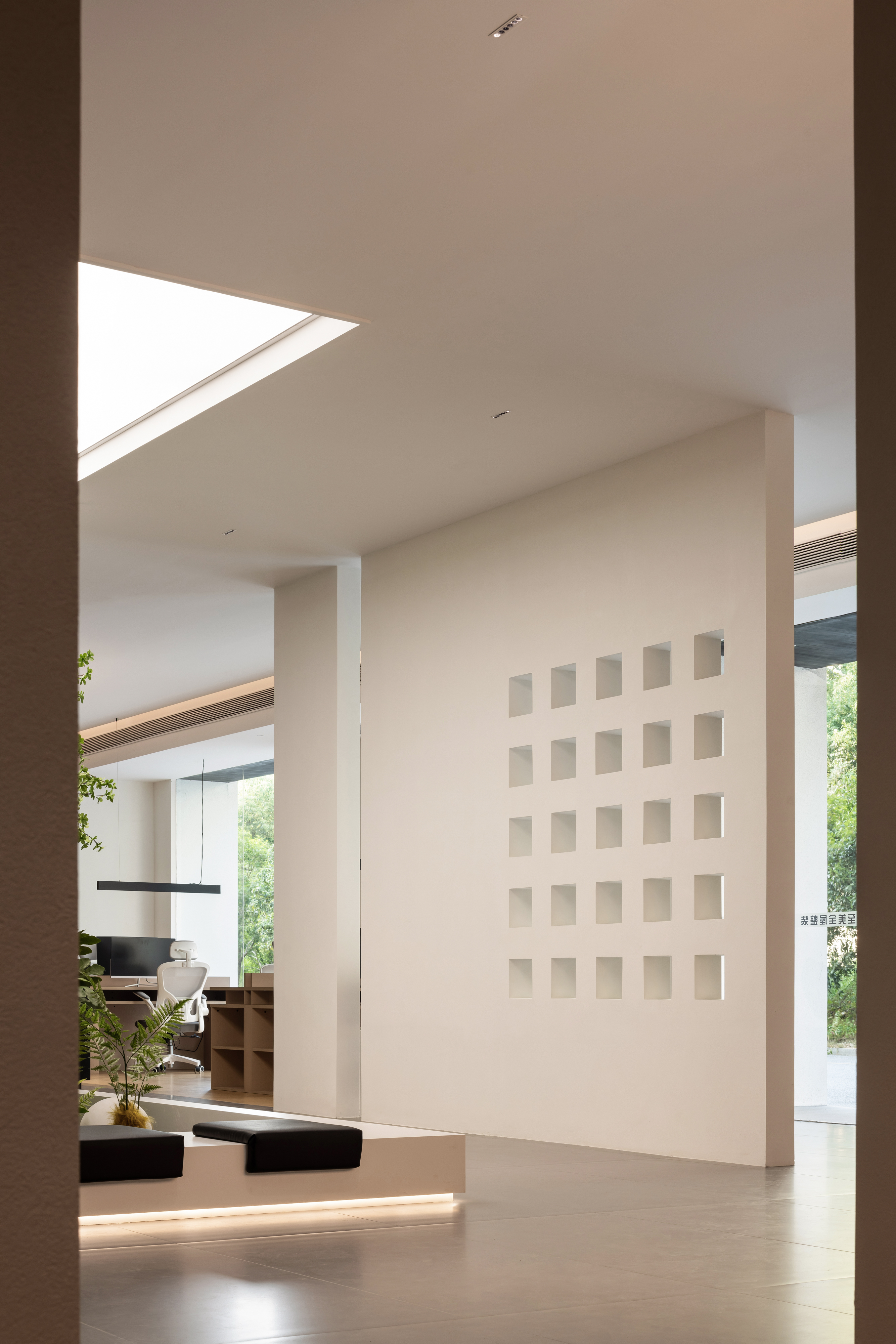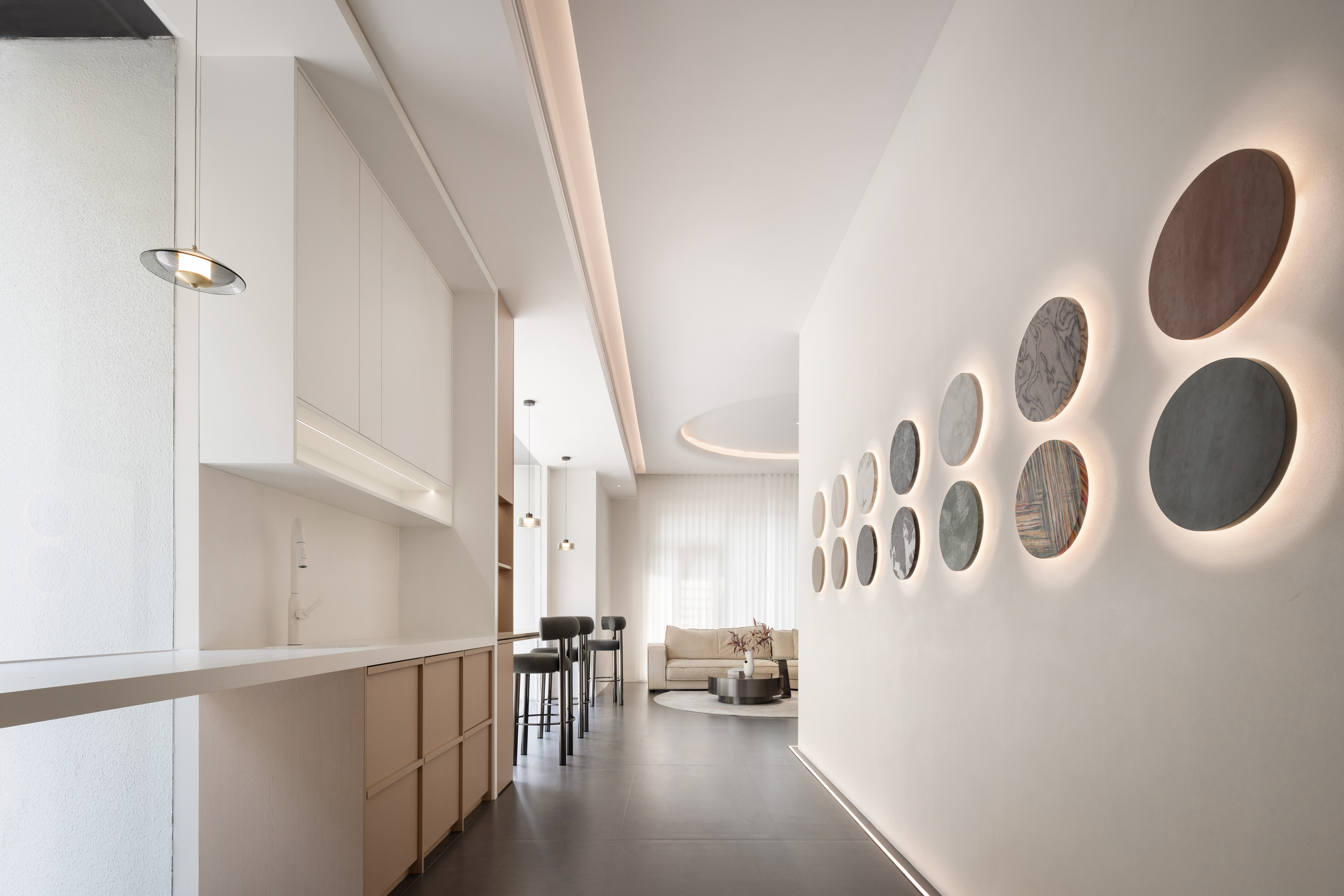 空间用材为定制板材、艺术涂料、哑光瓷砖和木纹瓷砖,整体给人带来素雅、宁静的感觉。
