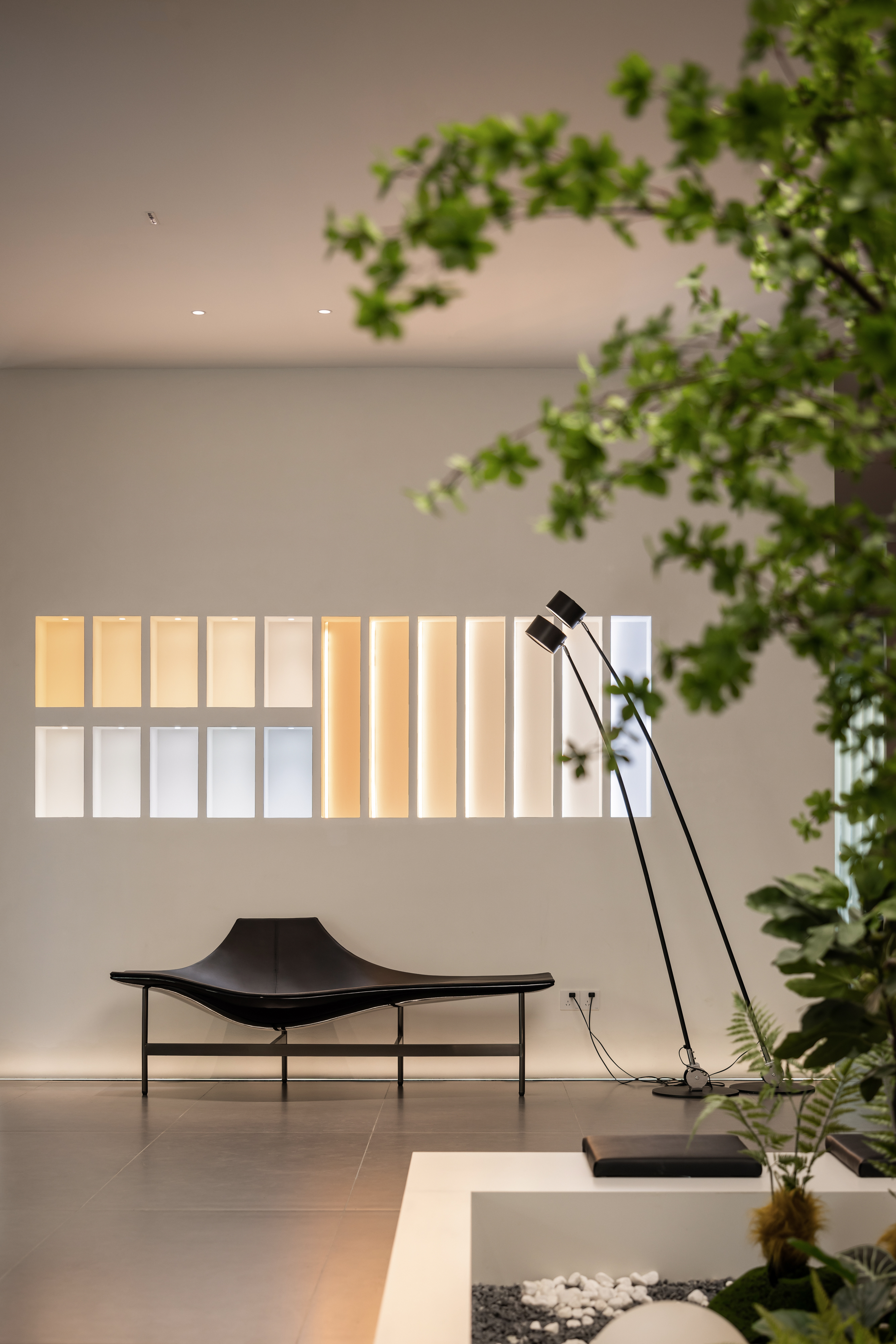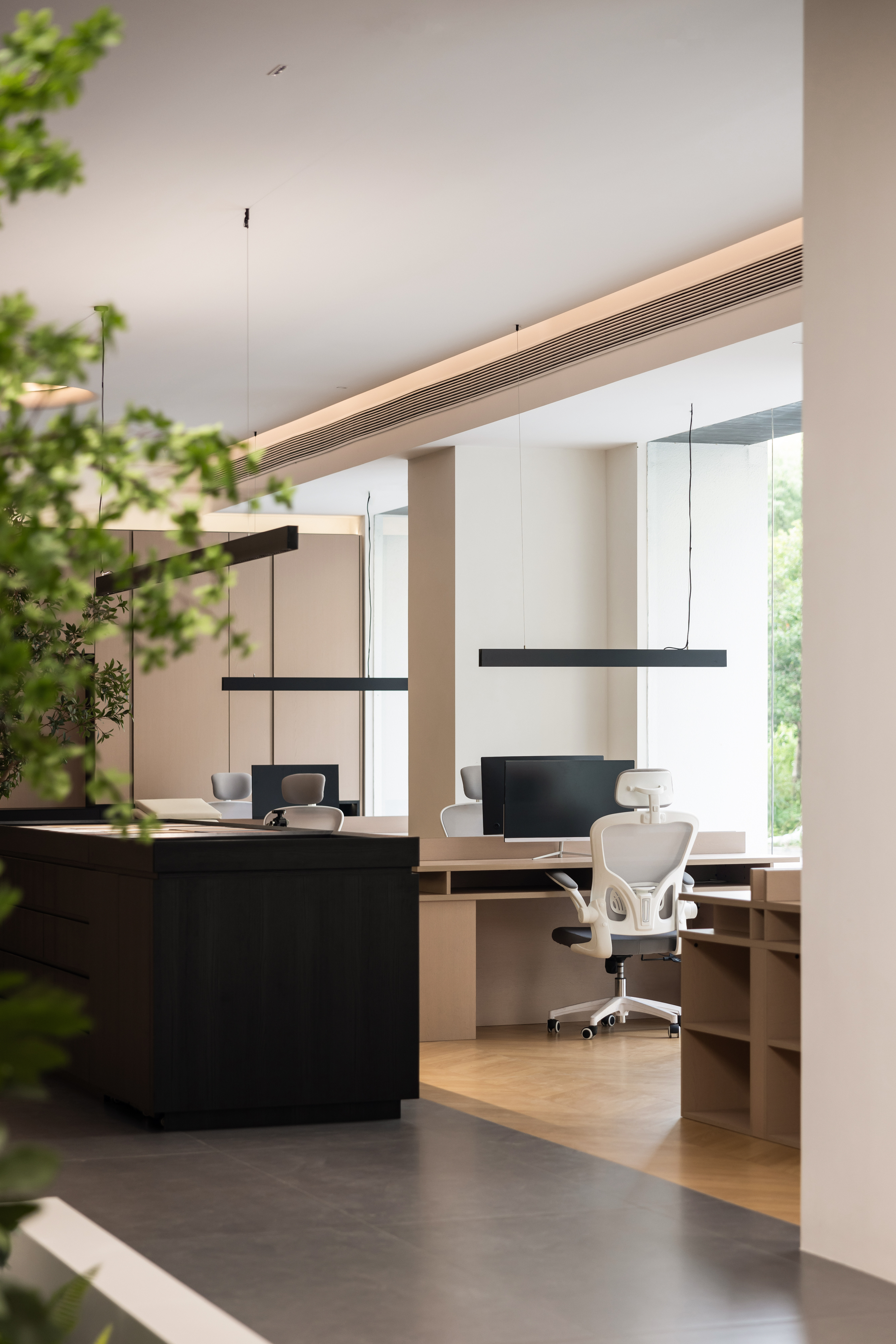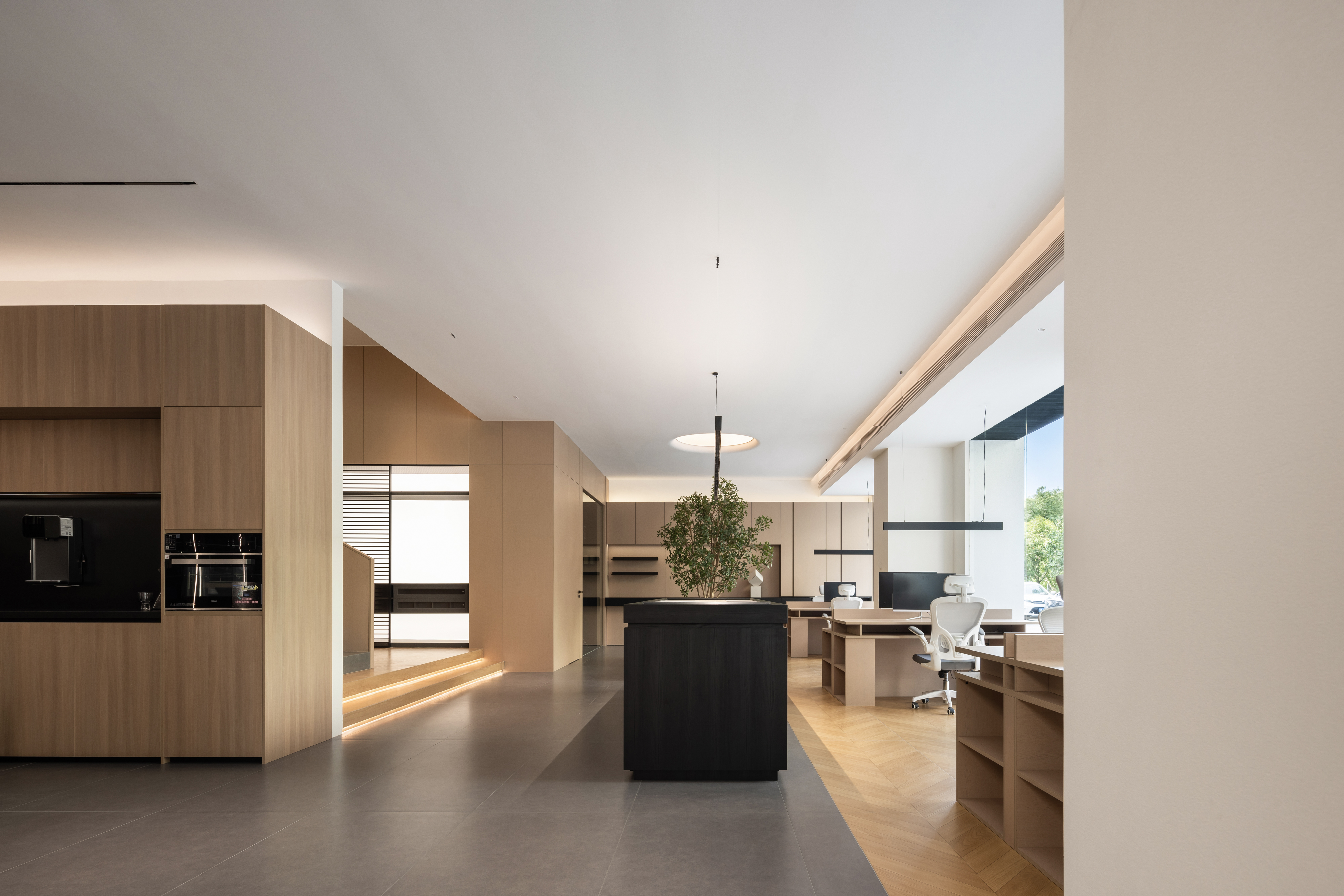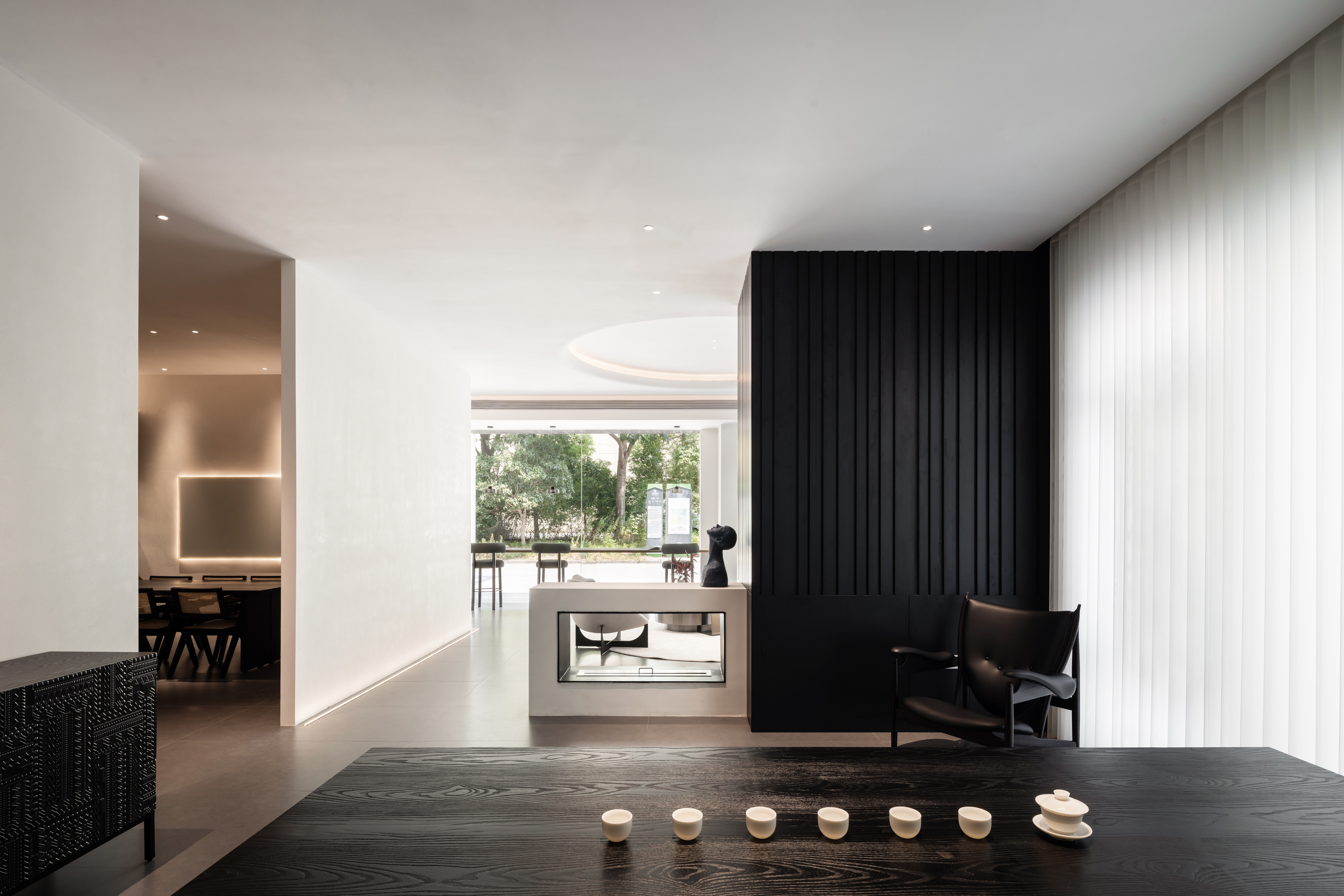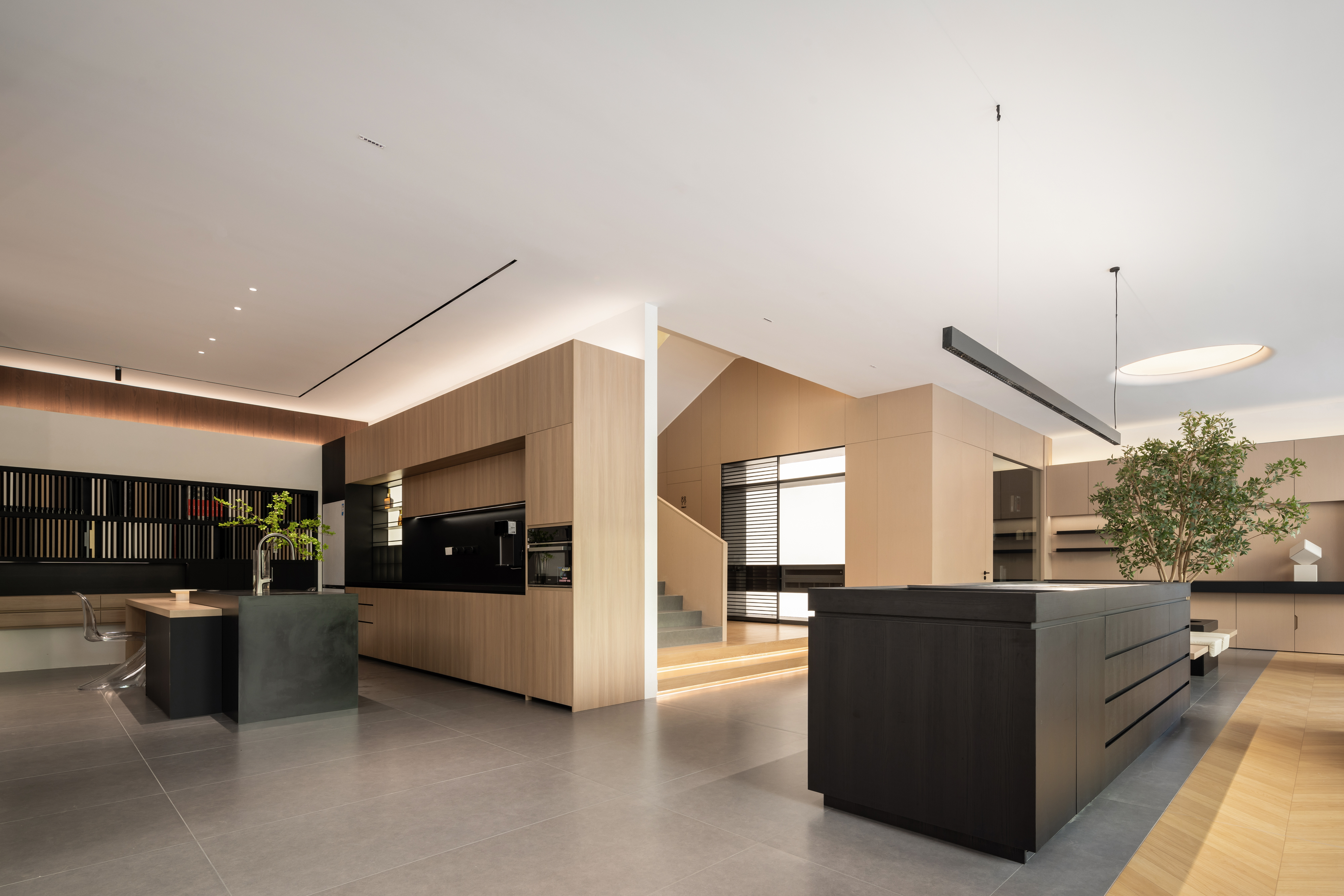 体色调上采用黑白灰加原木色,黑白灰色调并不等于单调,通过不同的材质和纹理创造出丰富的层次感,黑色木饰面,家具,灰色和原木色相接的地面,白色的天花和墙面,以及原木色,增加氛围感,散发出独特的魅力。多处设置的绿植景观给空间带来更多的生命力。