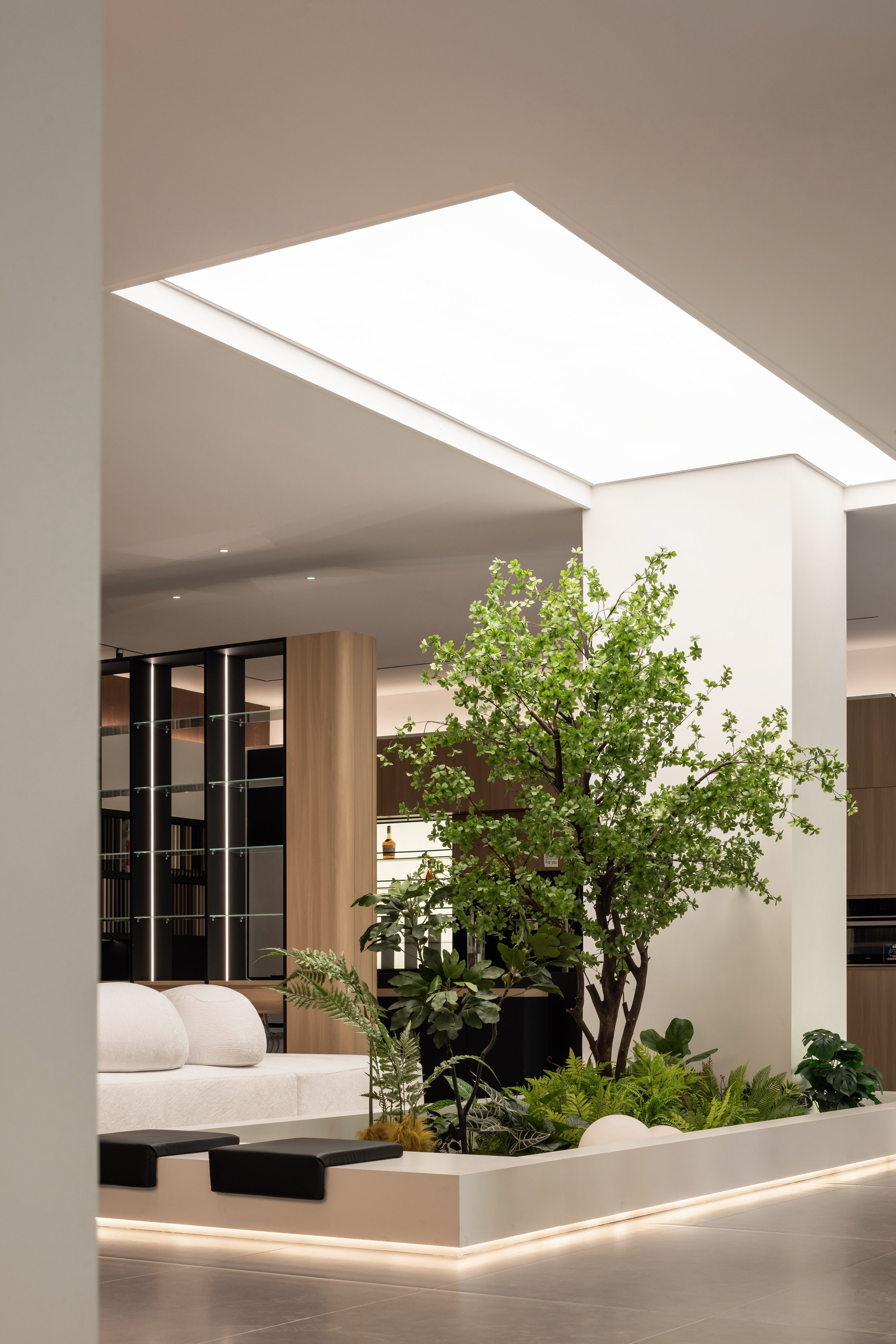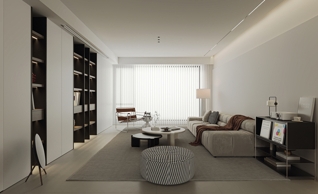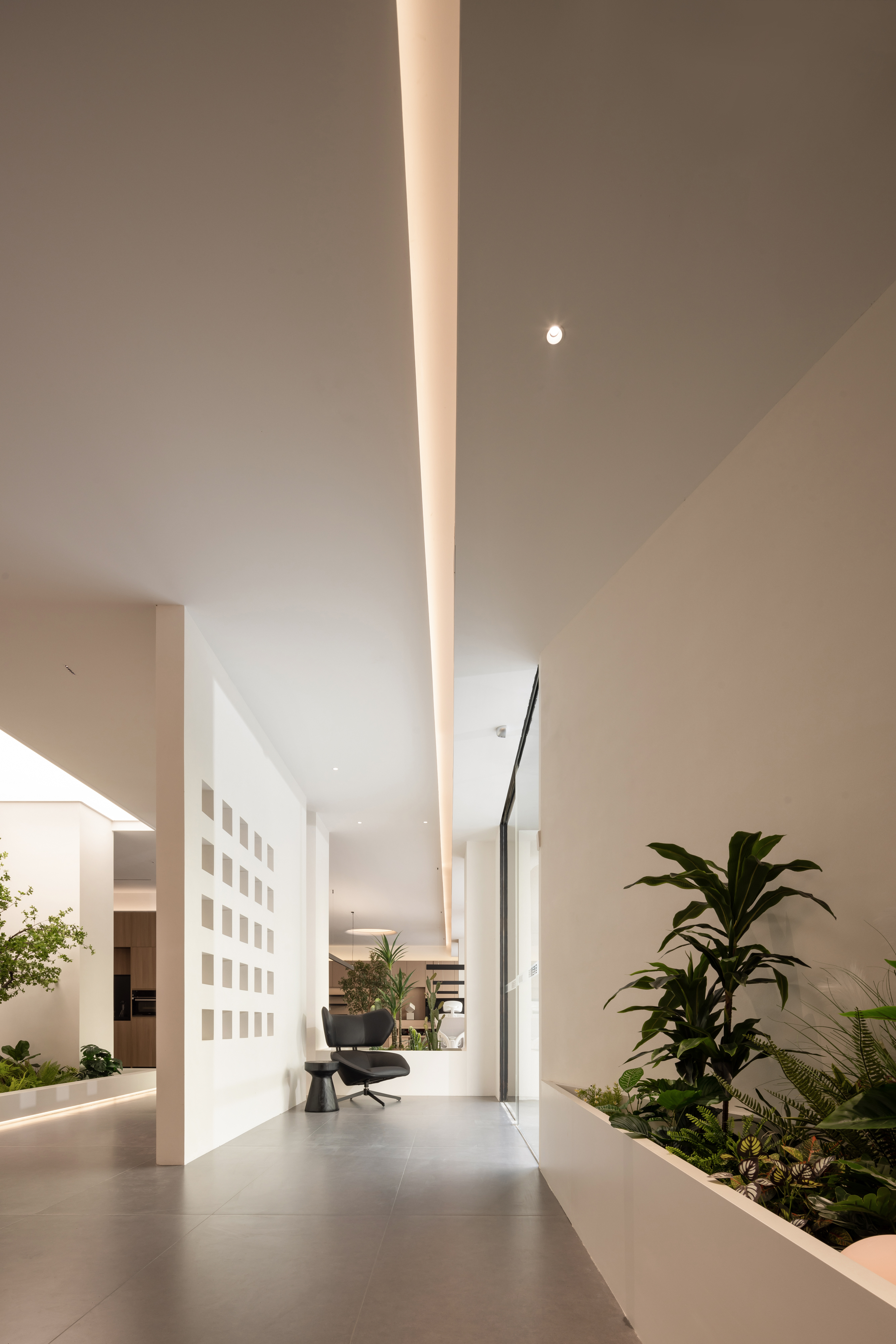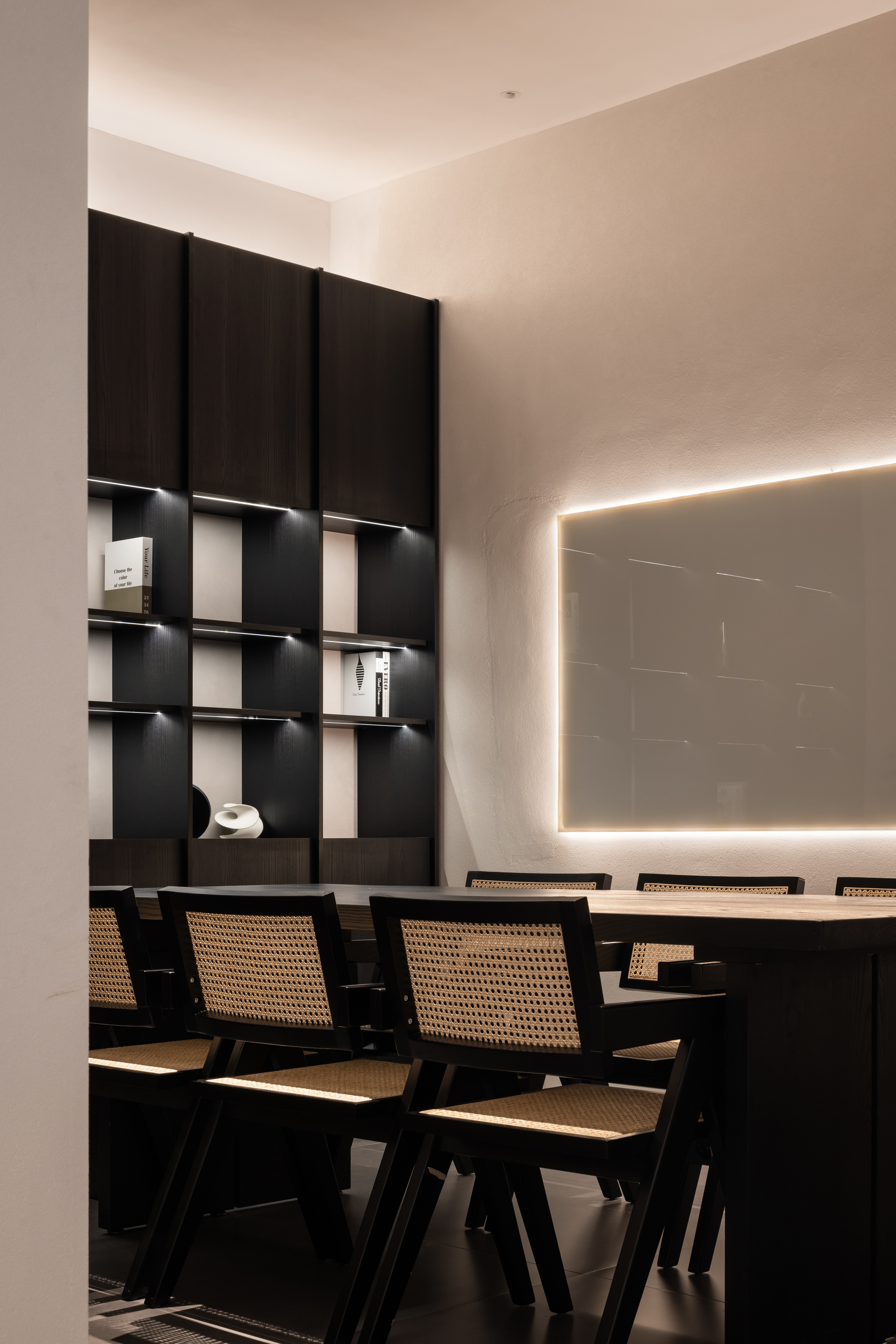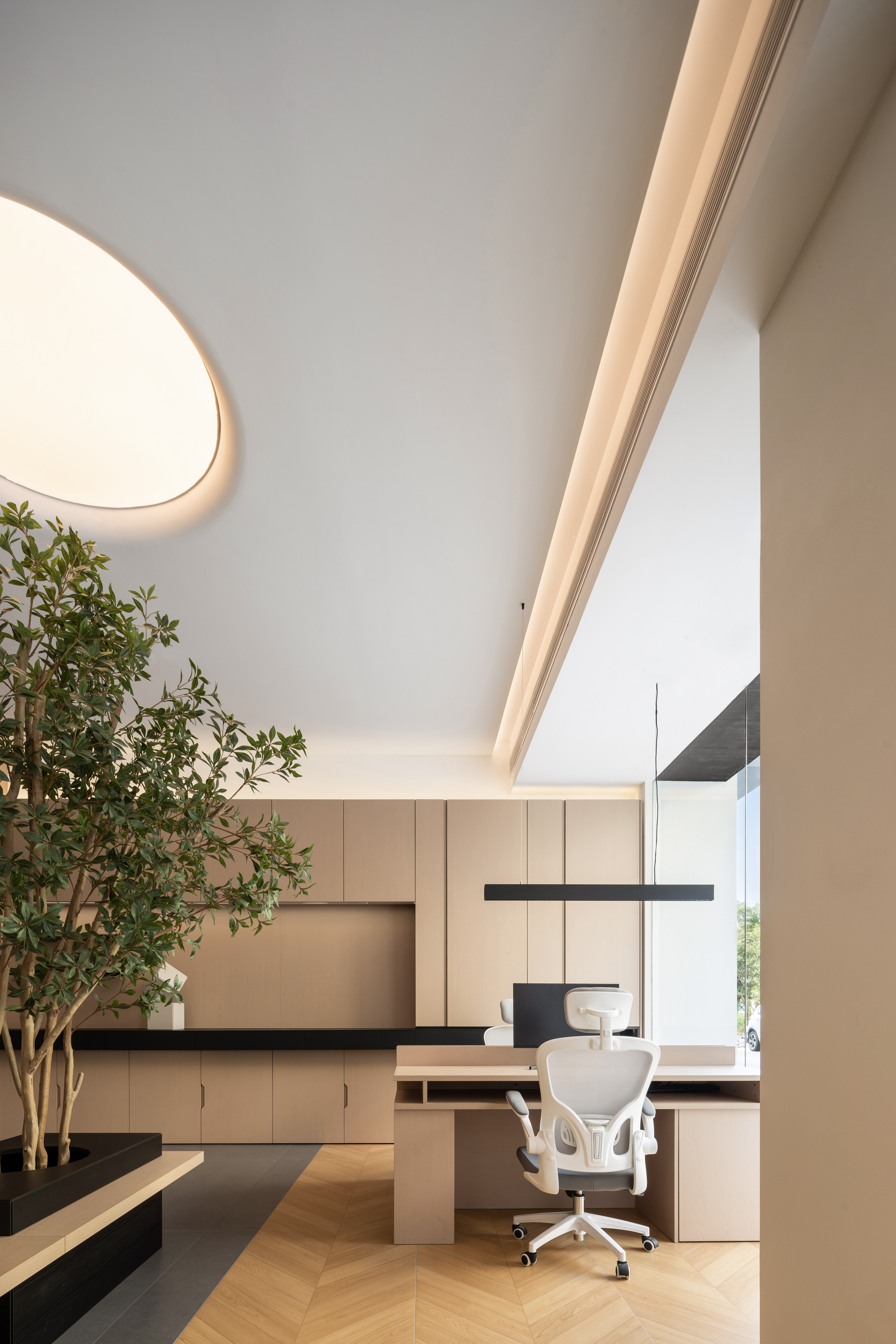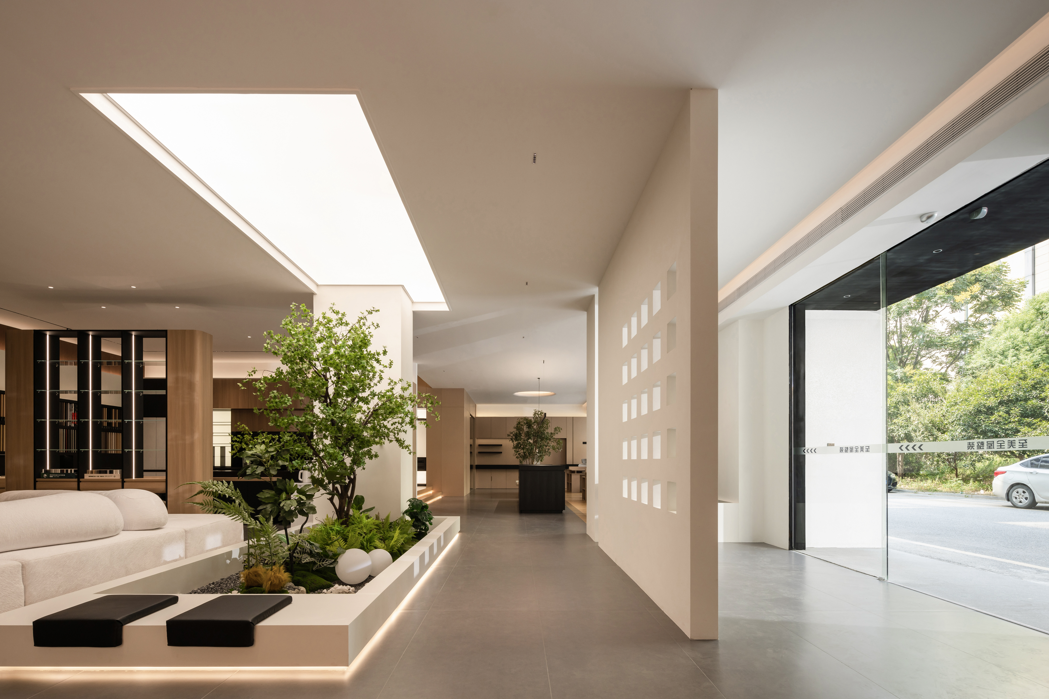 体色调上采用黑白灰加原木色,黑白灰色调并不等于单调,通过不同的材质和纹理创造出丰富的层次感,黑色木饰面,家具,灰色和原木色相接的地面,白色的天花和墙面,以及原木色,增加氛围感,散发出独特的魅力。多处设置的绿植景观给空间带来更多的生命力。