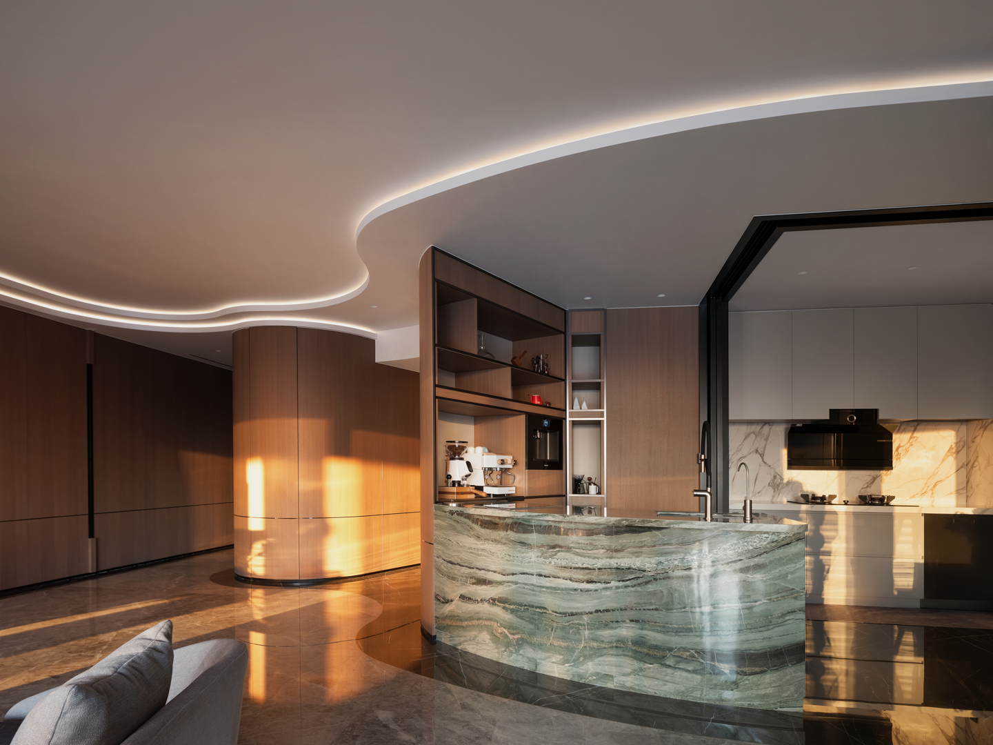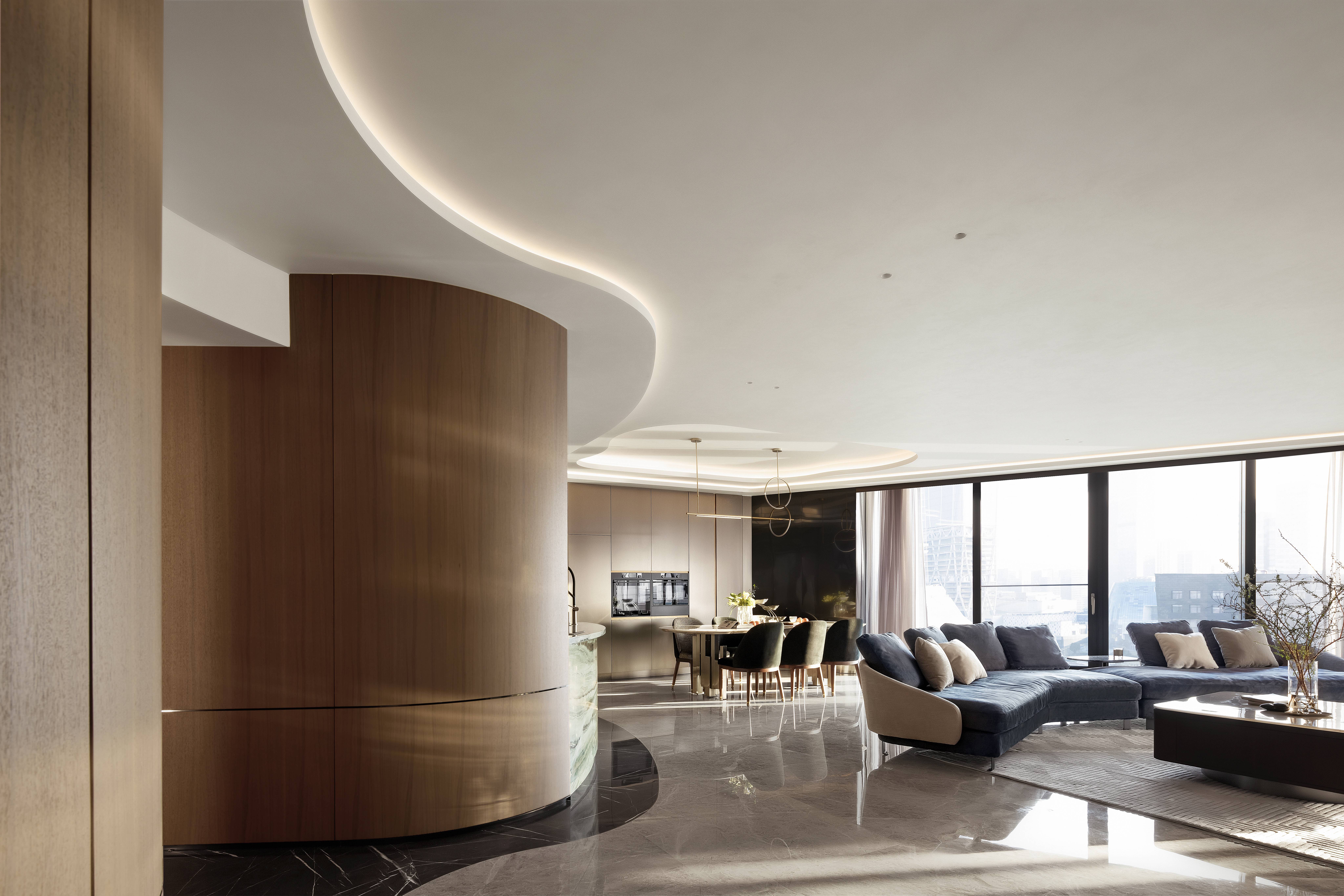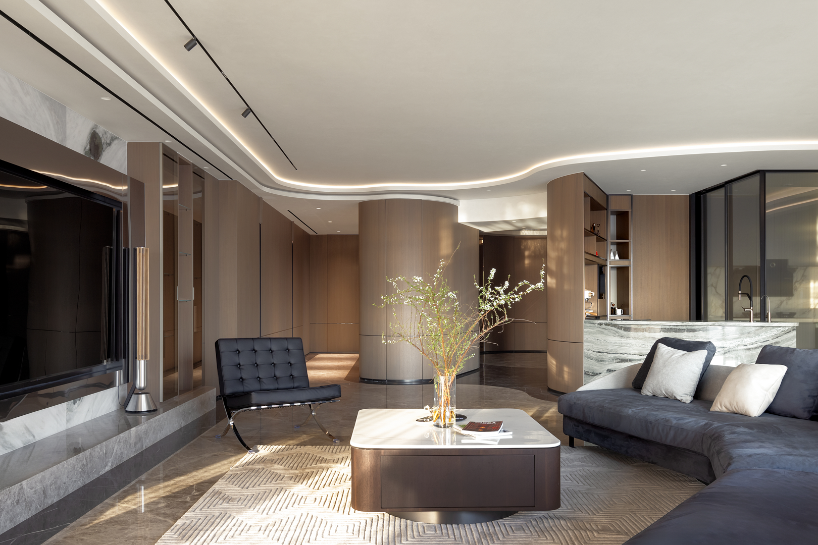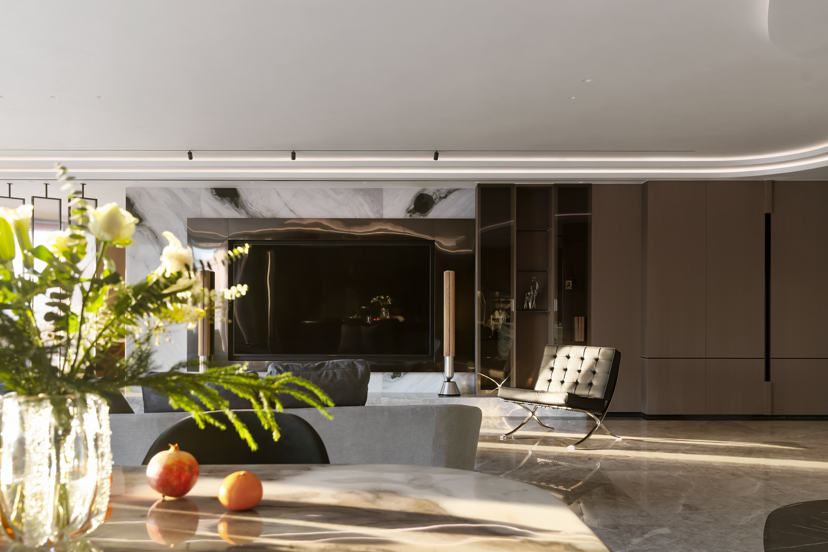 以低炮和的咖、灰、米色来呈现,内敛而不失品质,优雅自然而成。线性灯光顺着流畅简约的顶部线条氙鱼开来,石材和金属材质带来的天然色泽,蛋兰色的极简意式沙发,精致的皮椅,创造出一个舒道现代的居住空间