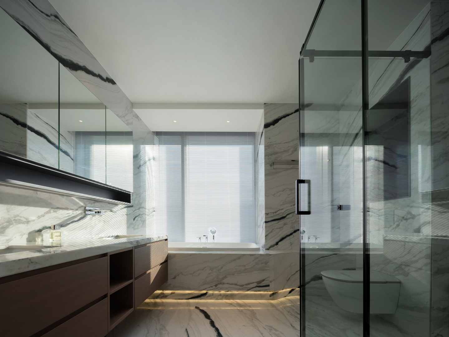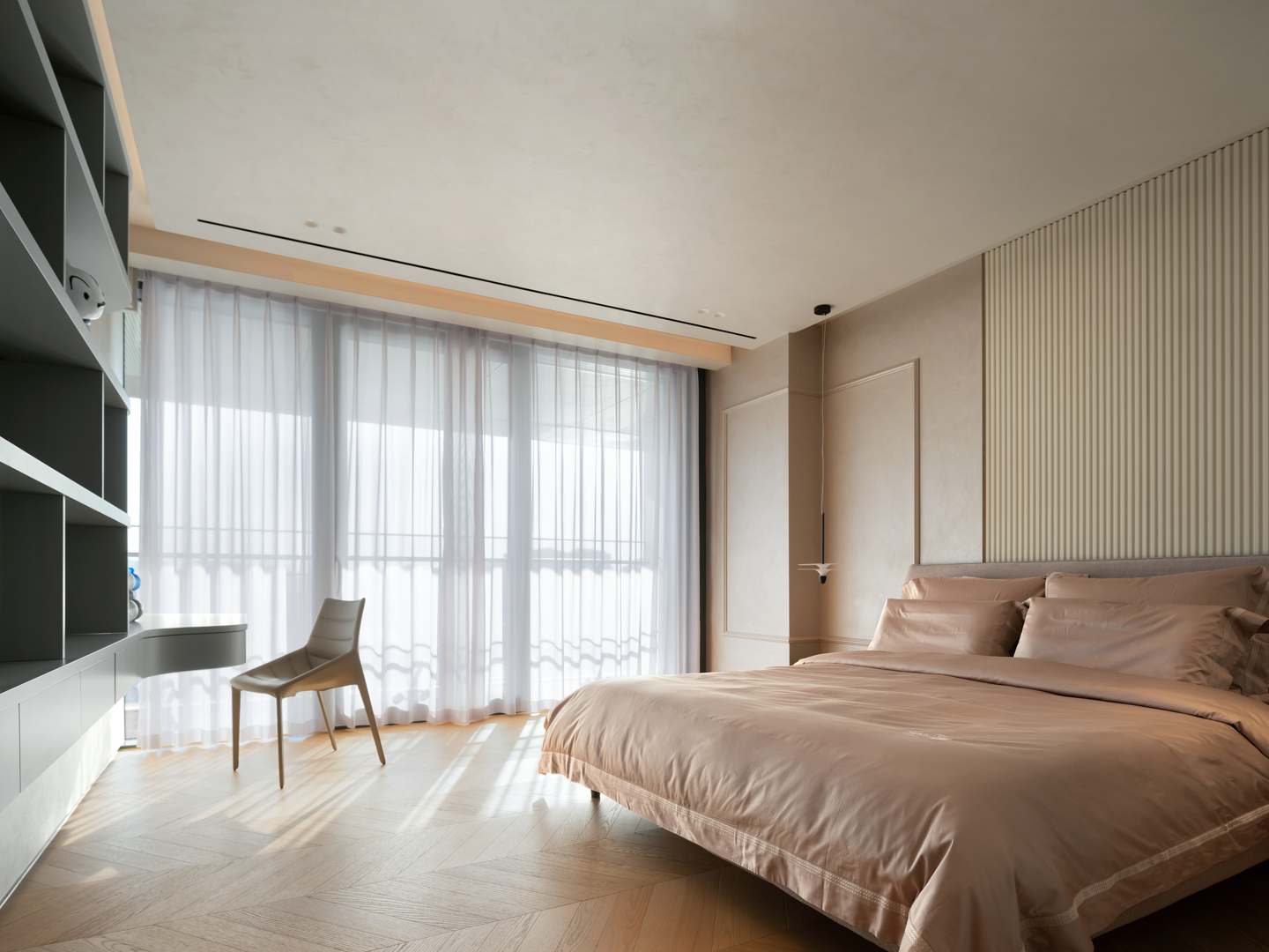 用镜面设计来表达摩登的空间质感,柔和的线条结合精致的居家配色,多元的软装和搭配自由切换,弥漫着家的温度与舒适。