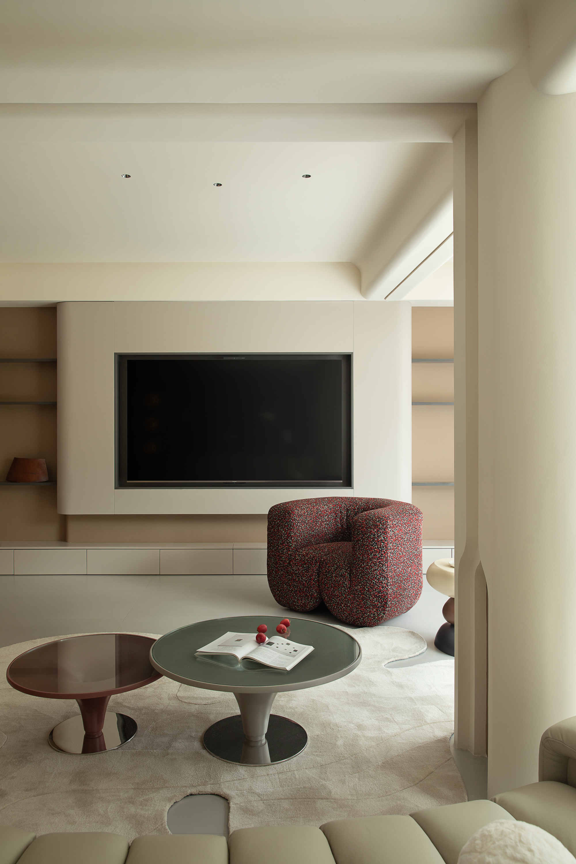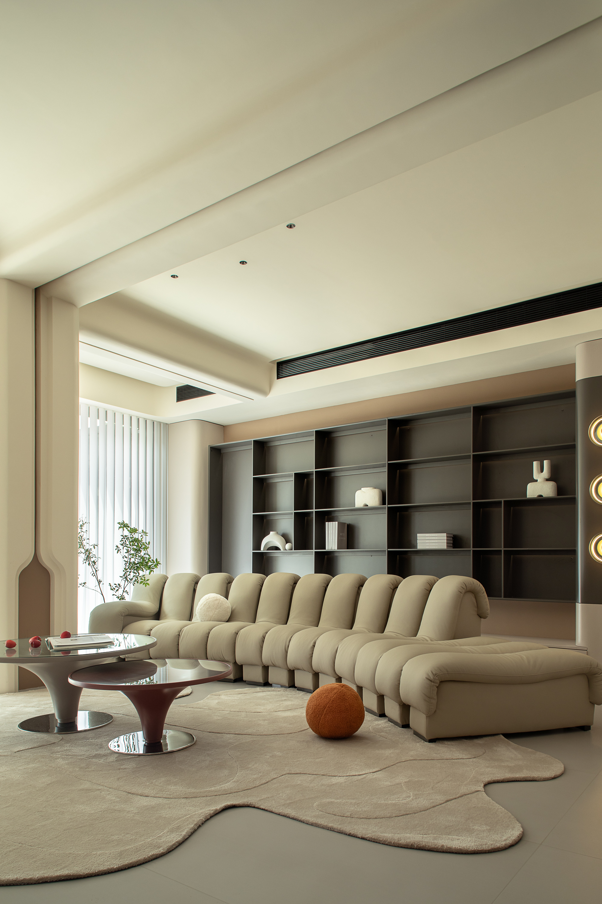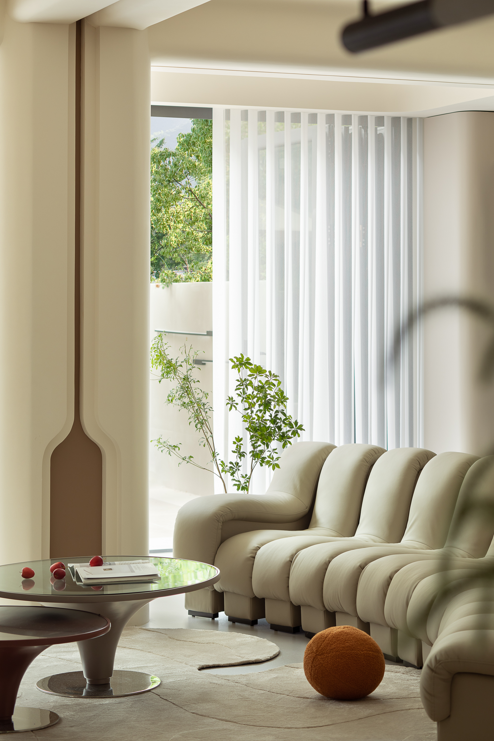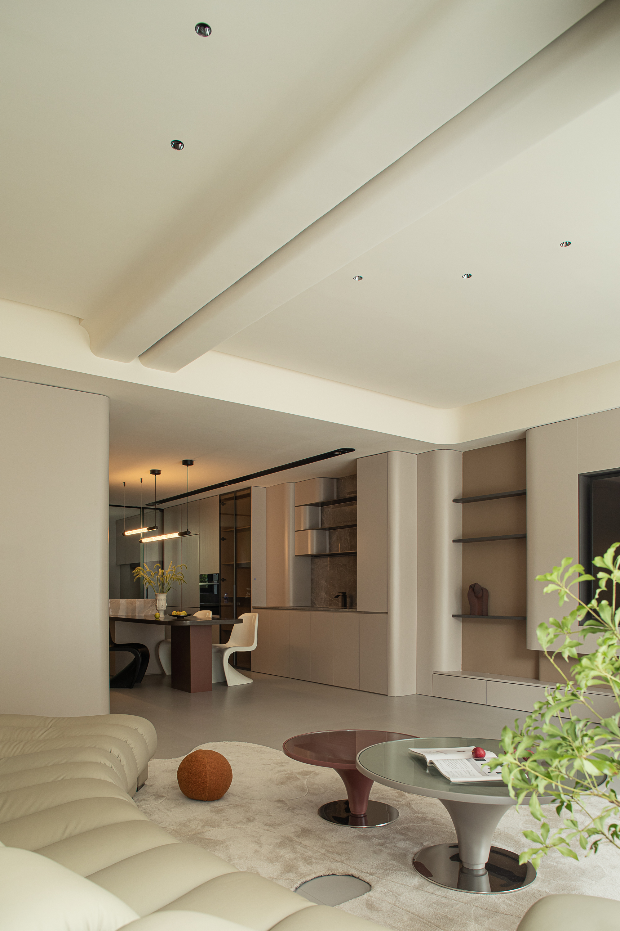 区别于传统的客厅形式,设计师采用空间外扩的策略,围绕原有的承重柱构建出环绕式的动线。