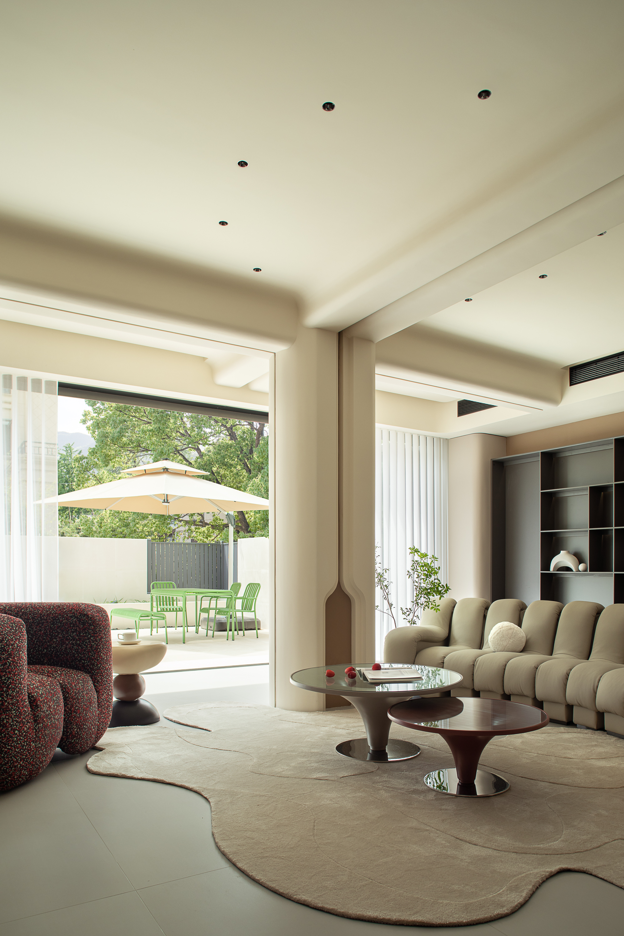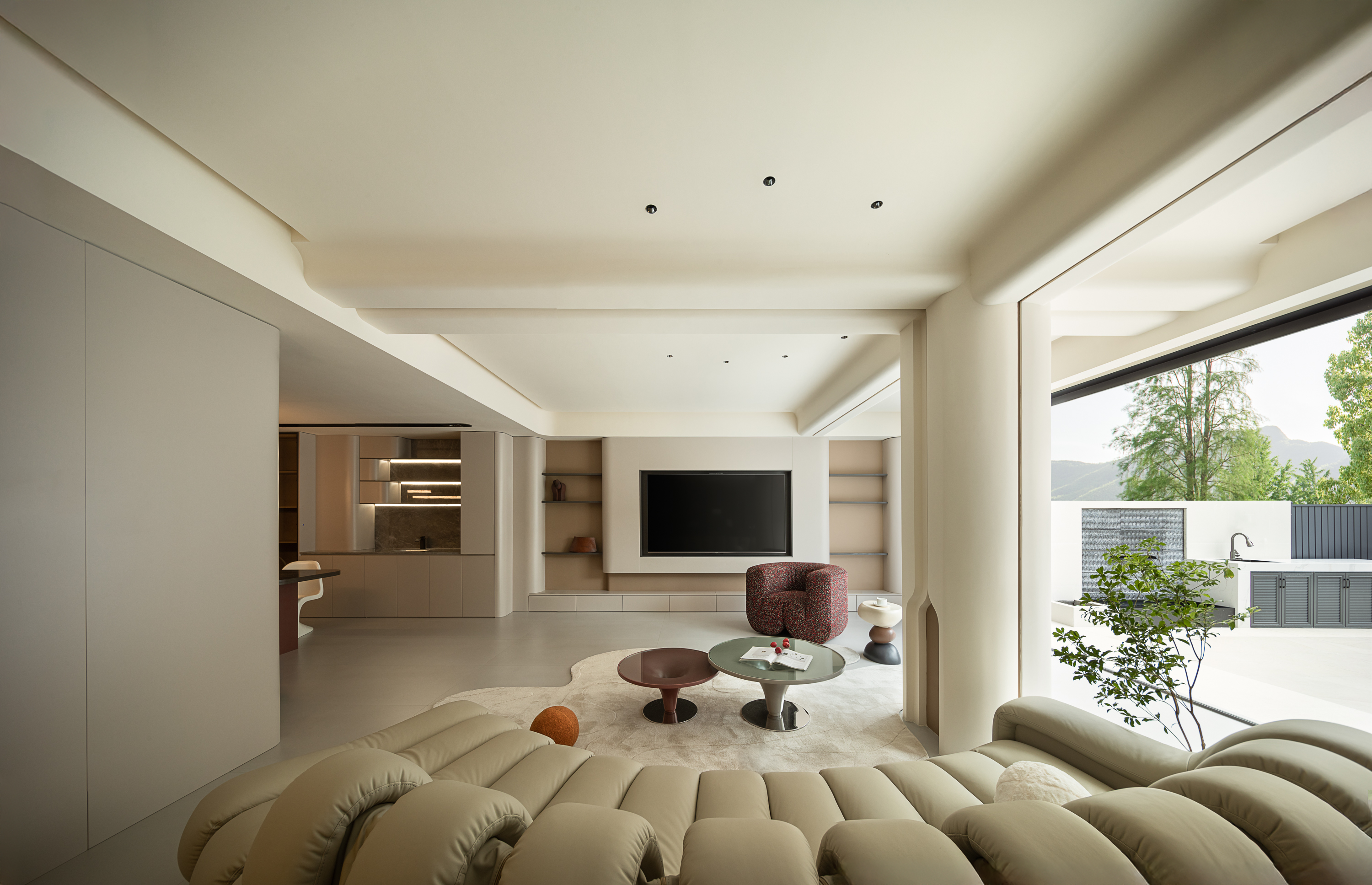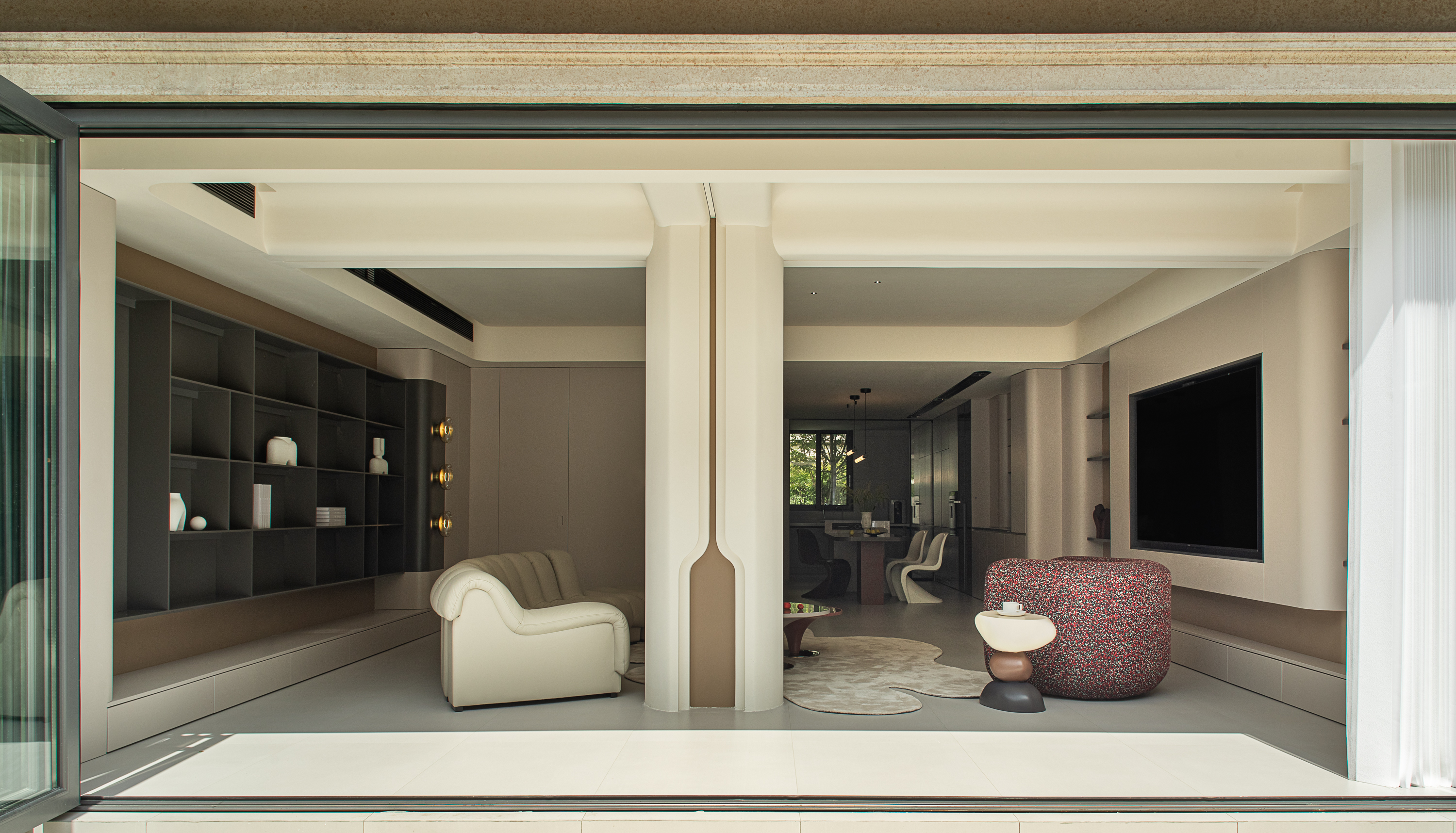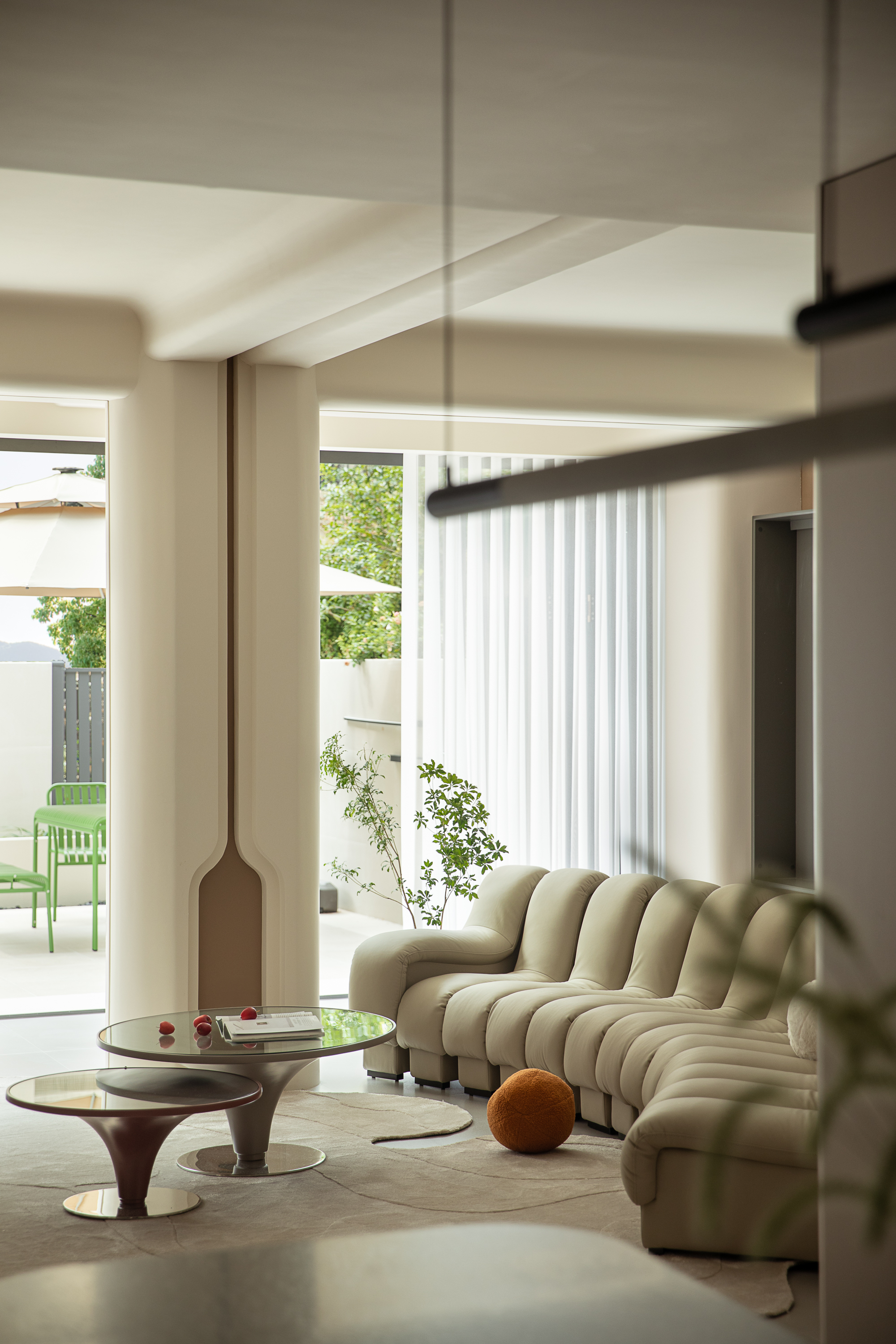 区别于传统的客厅形式,设计师采用空间外扩的策略,围绕原有的承重柱构建出环绕式的动线。 全景落地折叠玻璃门窗设计将室外自然风景引入客厅,阳光、微风、生机扑面而来,拉近了人与自然的距离感。