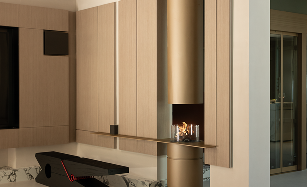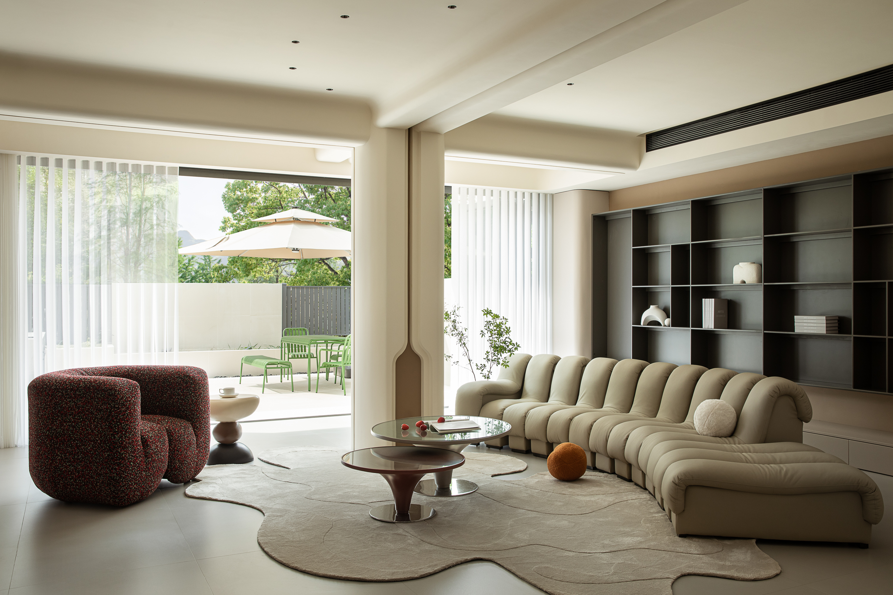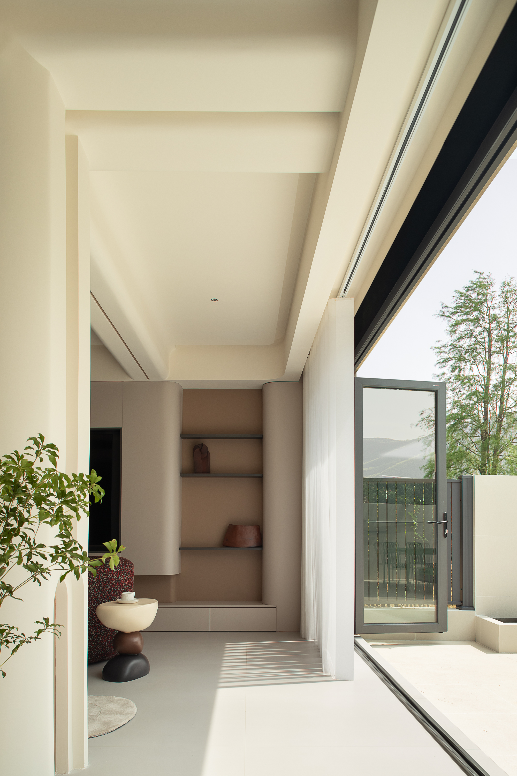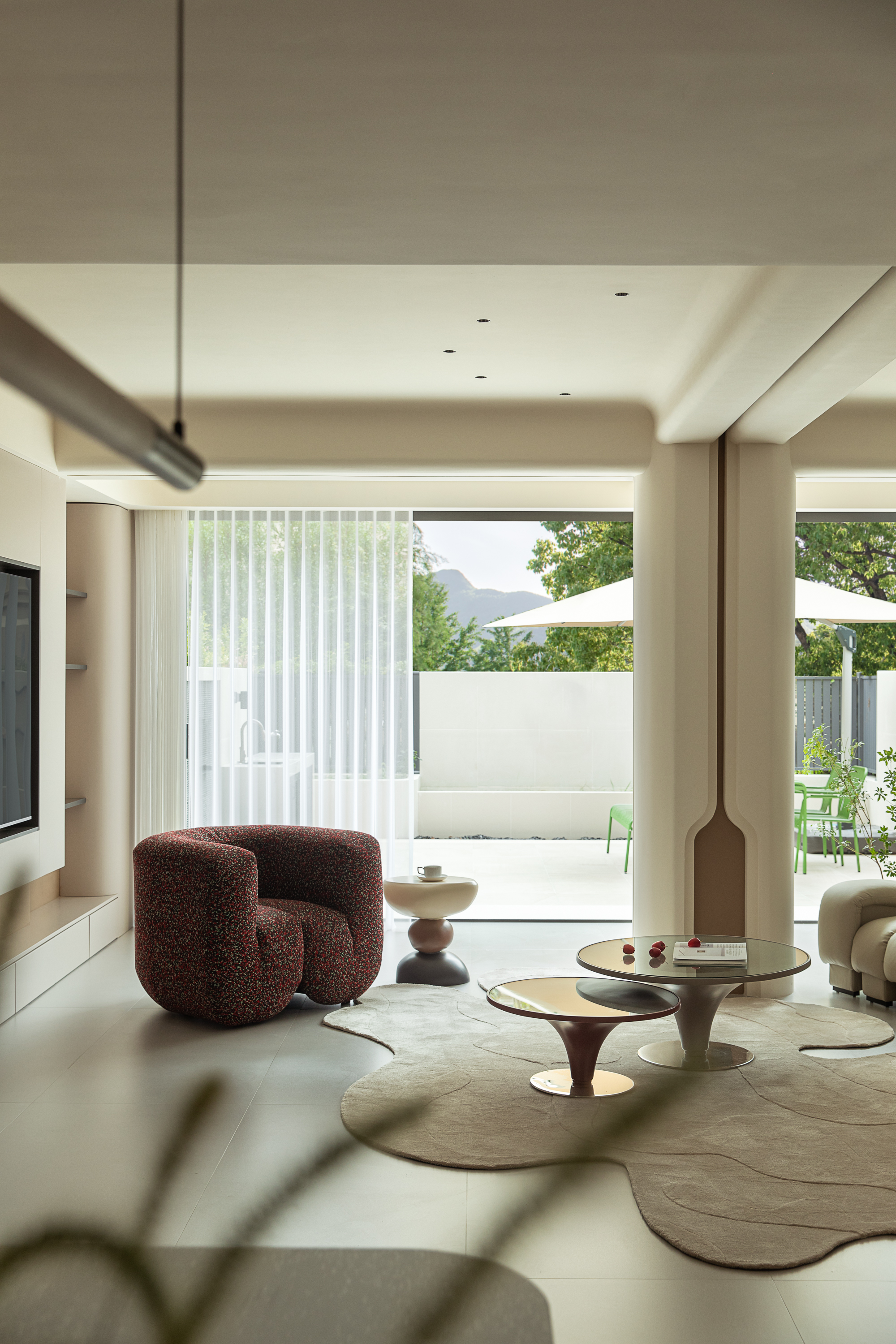 区别于传统的客厅形式,设计师采用空间外扩的策略,围绕原有的承重柱构建出环绕式的动线。 全景落地折叠玻璃门窗设计将室外自然风景引入客厅,阳光、微风、生机扑面而来,拉近了人与自然的距离感。