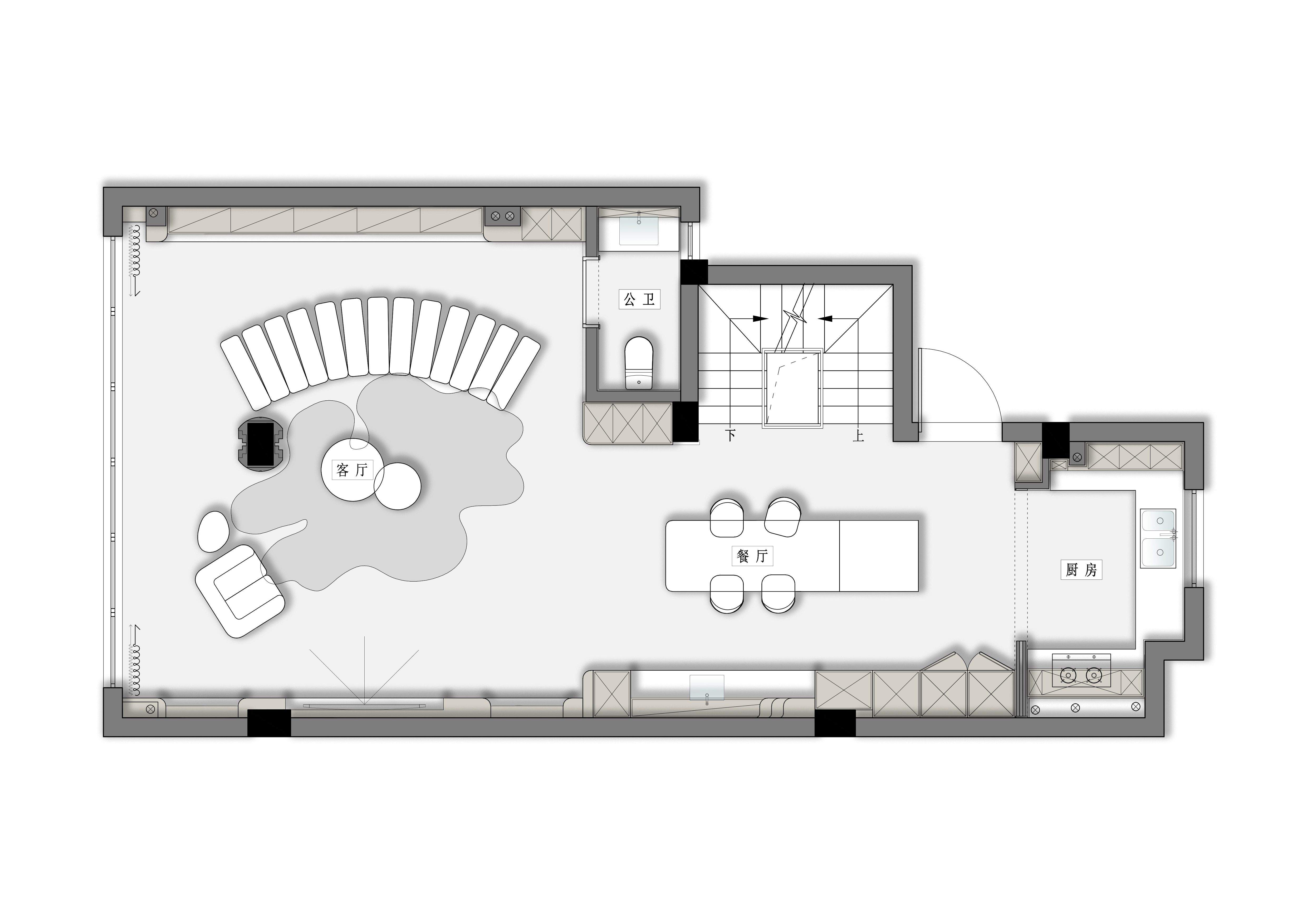 通透无界的空间中,在满足日常生活、互动交流、家庭聚会等功能的同时,也兼顾了形式美感,充分利用每一方寸,将公卫隐藏于客厅一角,寥寥几笔就勾勒出了居家的舒适氛围。 -