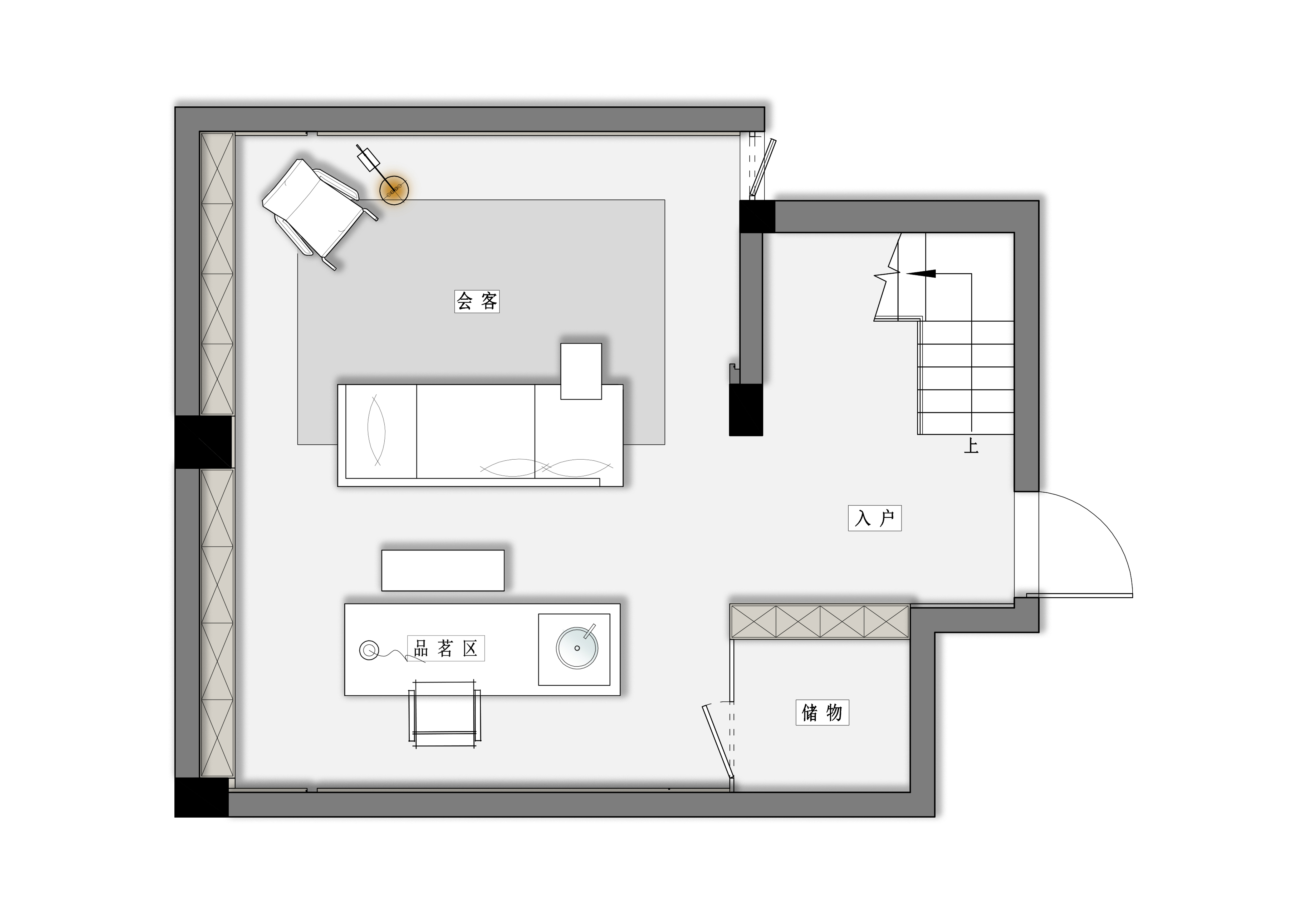 停好车从地下二层进入室内,入户处的鞋帽区设计,有效的让空间的功能性与仪式感达到了最佳,在温润的色调中,完成了外部至内部的情绪转换。 考虑到男业主偶尔居家办公,地下二层品茶区与会客区的设立,兼顾了功能性与体验感。