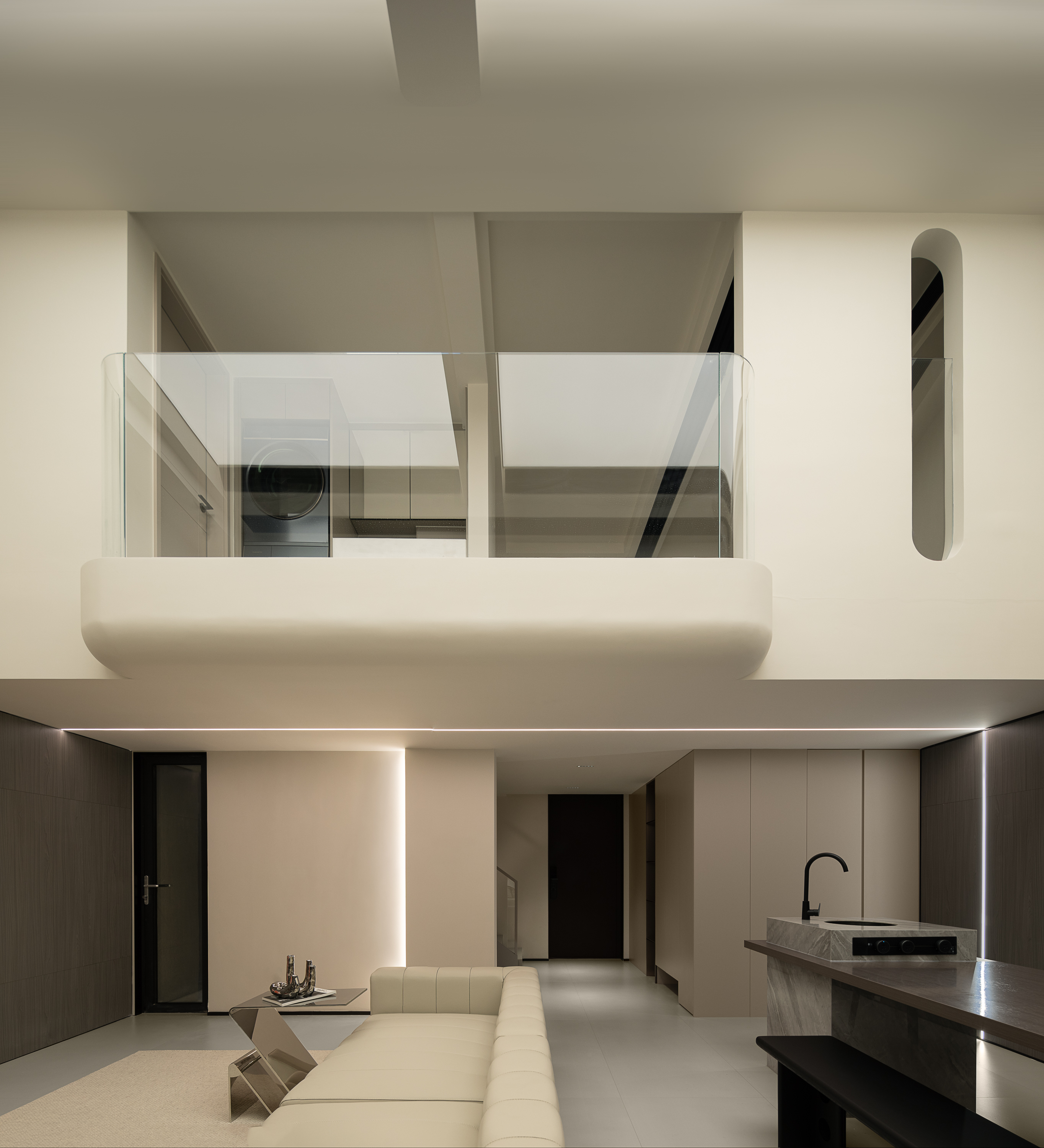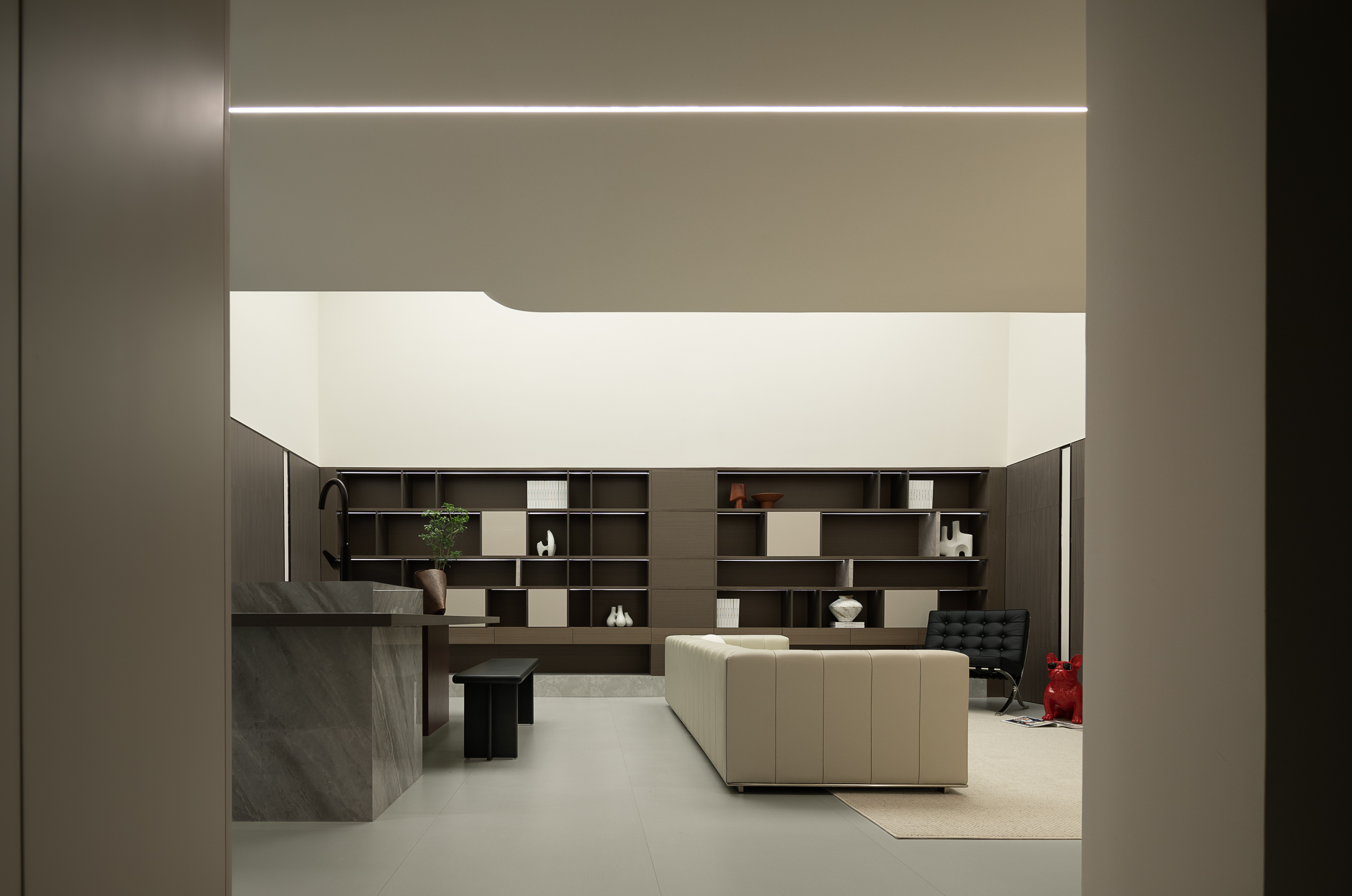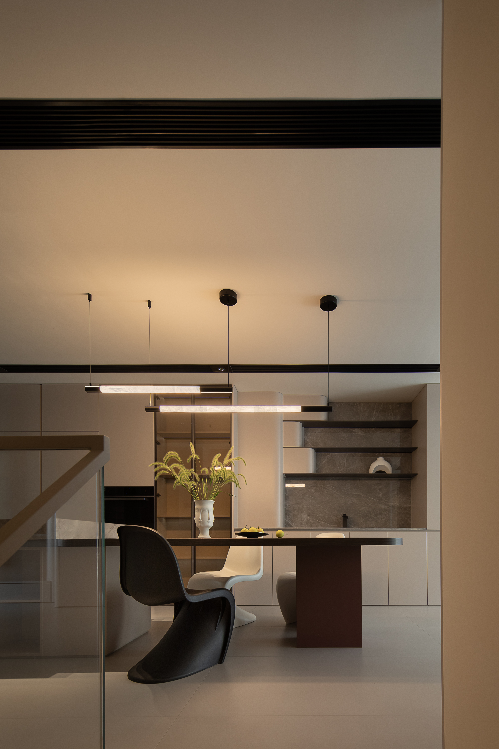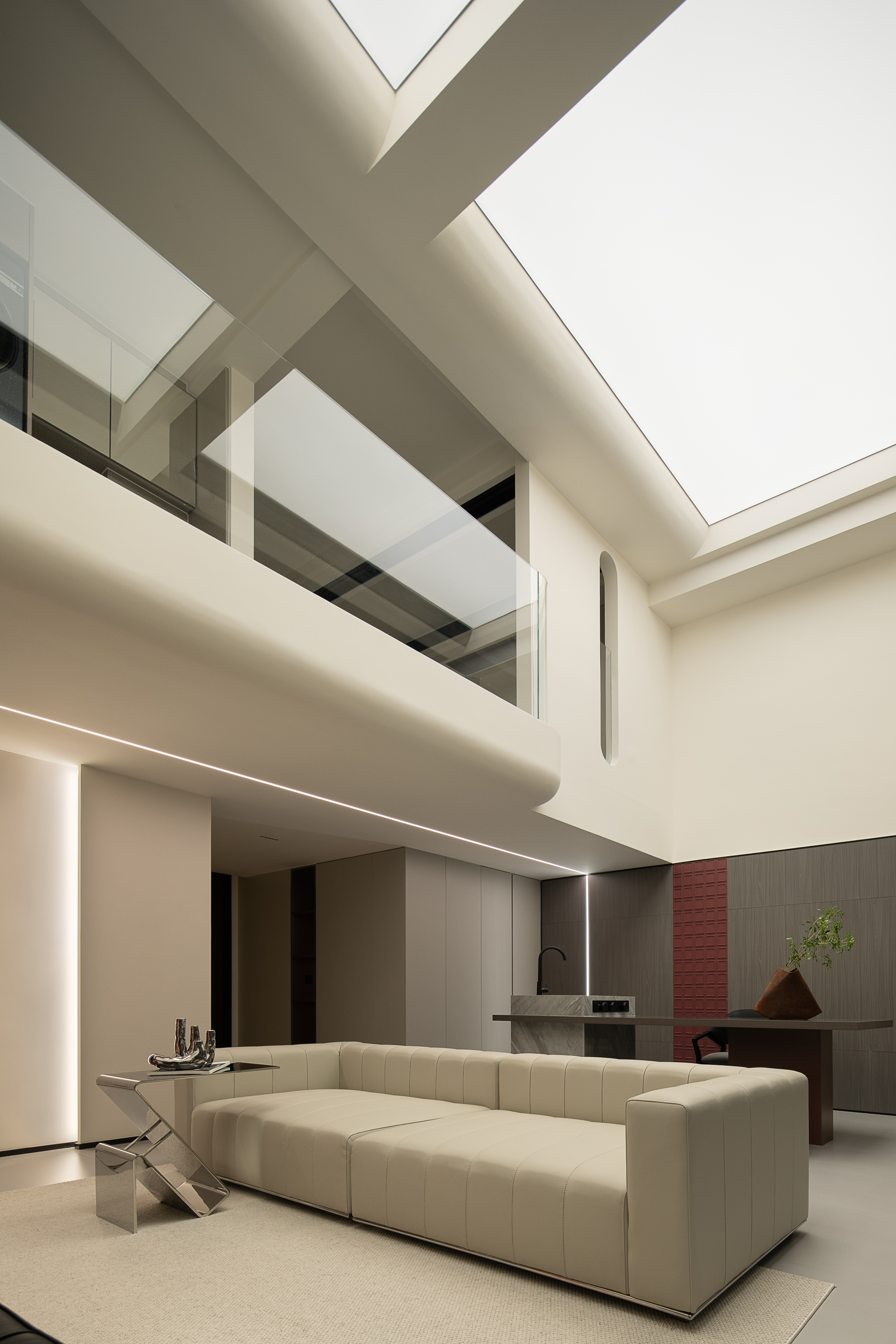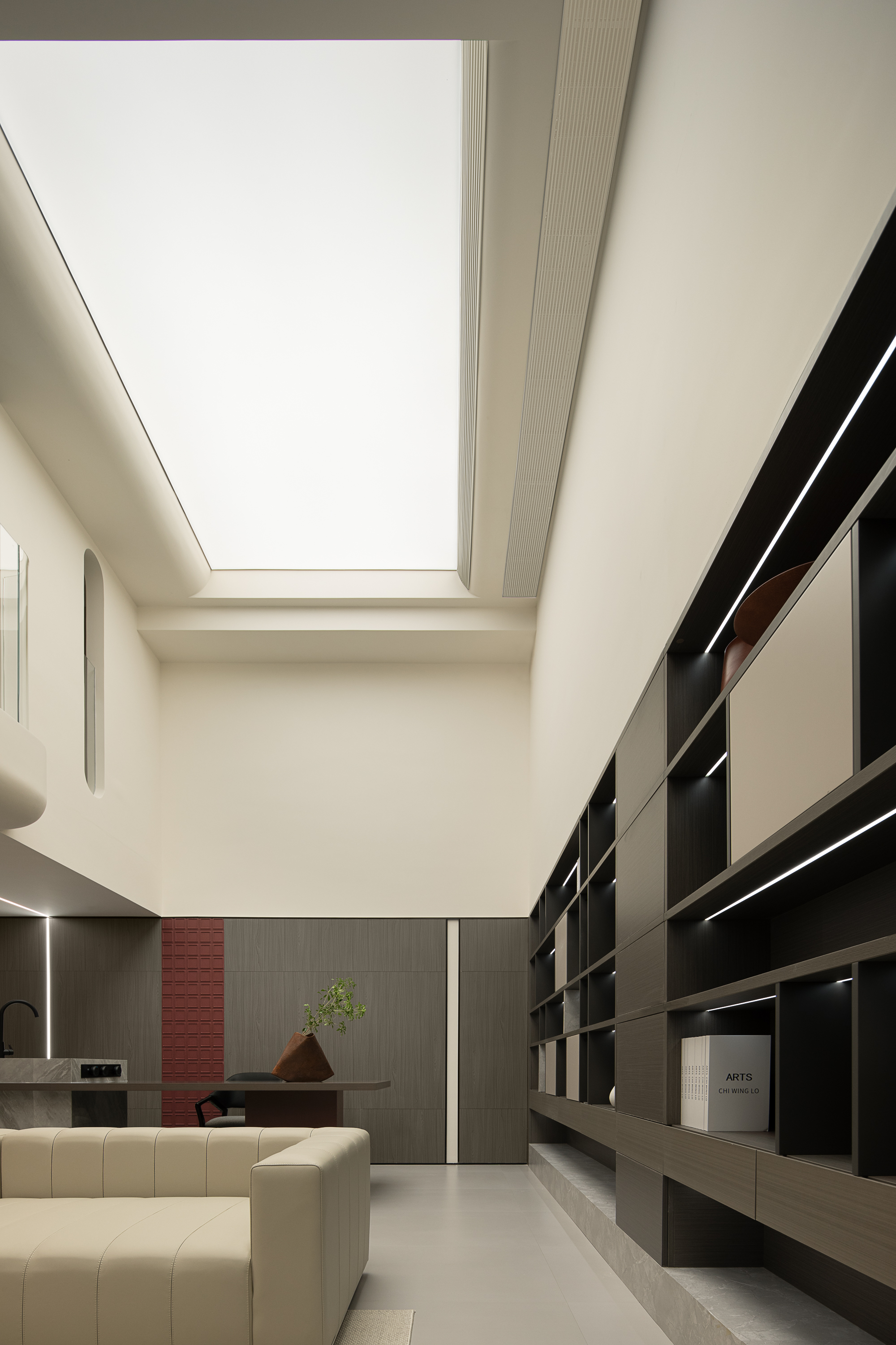 挑高的纵向空间处理,结合顶部的灯膜应用,提升了室内的采光及视觉开阔性。在空间中,需求能够催生出不同的空间组合方式。