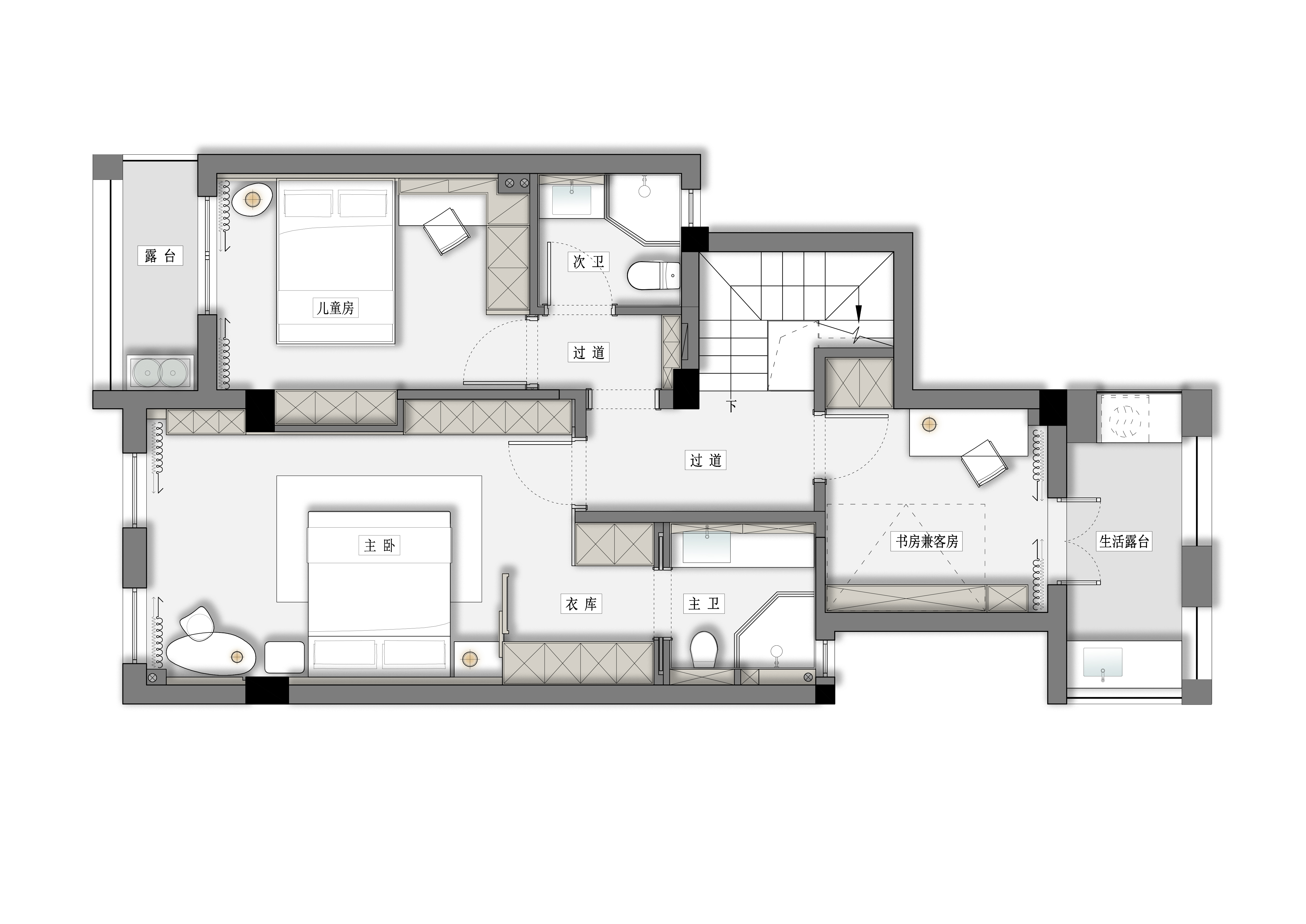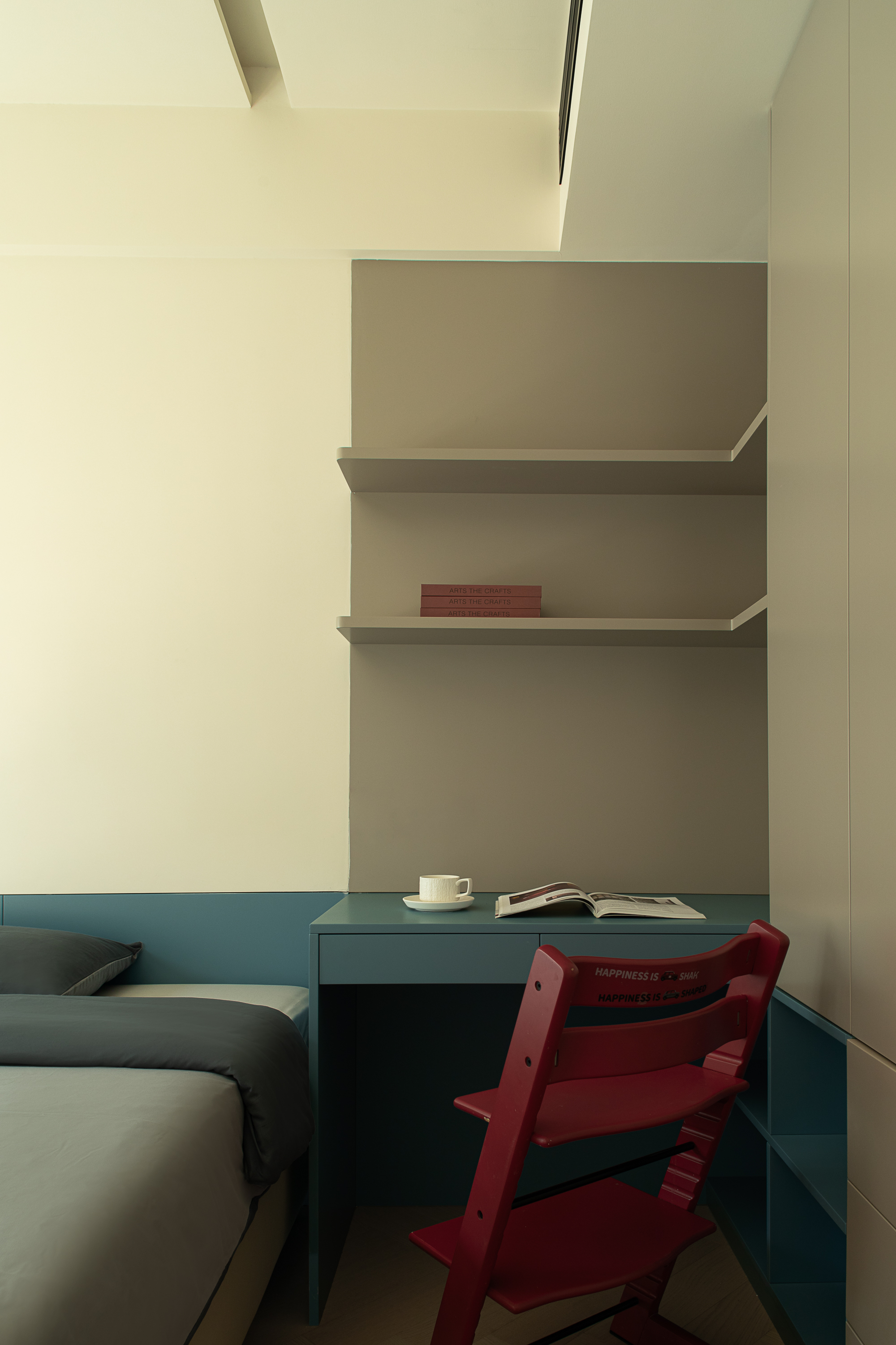 二层空间打开了家庭生活中的另一界面,去除多余的表面装饰,回归至纯粹的休憩功能。主卧、儿童房与书房(兼客房),各具特色,强调舒适度与个性化体验。内部每一寸人性化的设计细节,不经意间唤醒了居住者对生活的微妙感受,置身于其中,都能找到最为舒适的状态。
