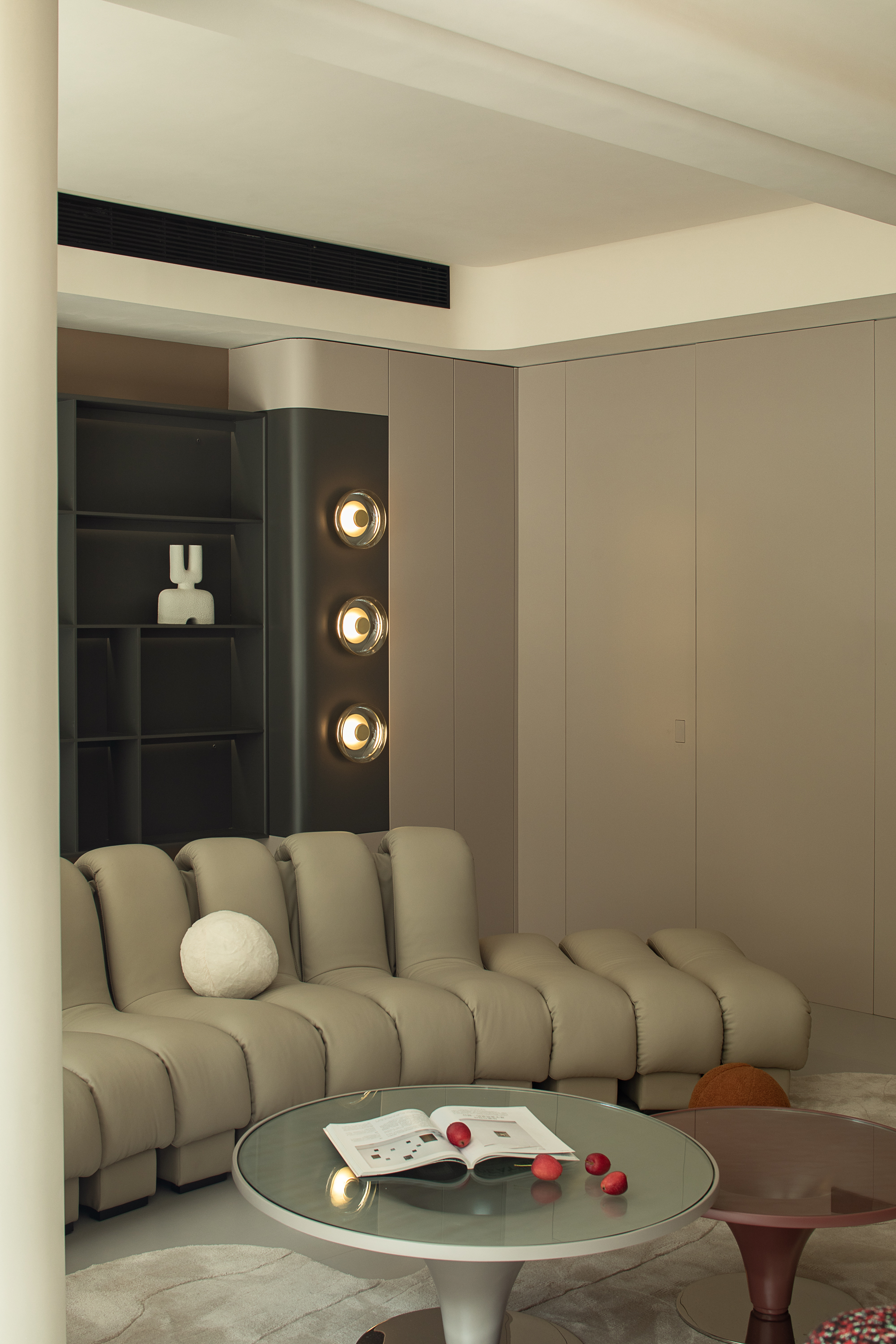 挑高的纵向空间处理,结合顶部的灯膜应用,提升了室内的采光及视觉开阔性。在空间中,需求能够催生出不同的空间组合方式。 墙体本身凹凸不平,为了展现美观整洁的感觉,设计师在柜体上方建构了一面假墙,使得柜子有嵌入墙体的视觉感。一整面的开放格,更便于摆放业主喜欢的书籍及艺术品。 开放的地下一层,设计上不做过多定义,聚合了多场景模式,为生活预留出更多可能性。在这里,父母与孩子也可以一起玩耍享受亲子时光。