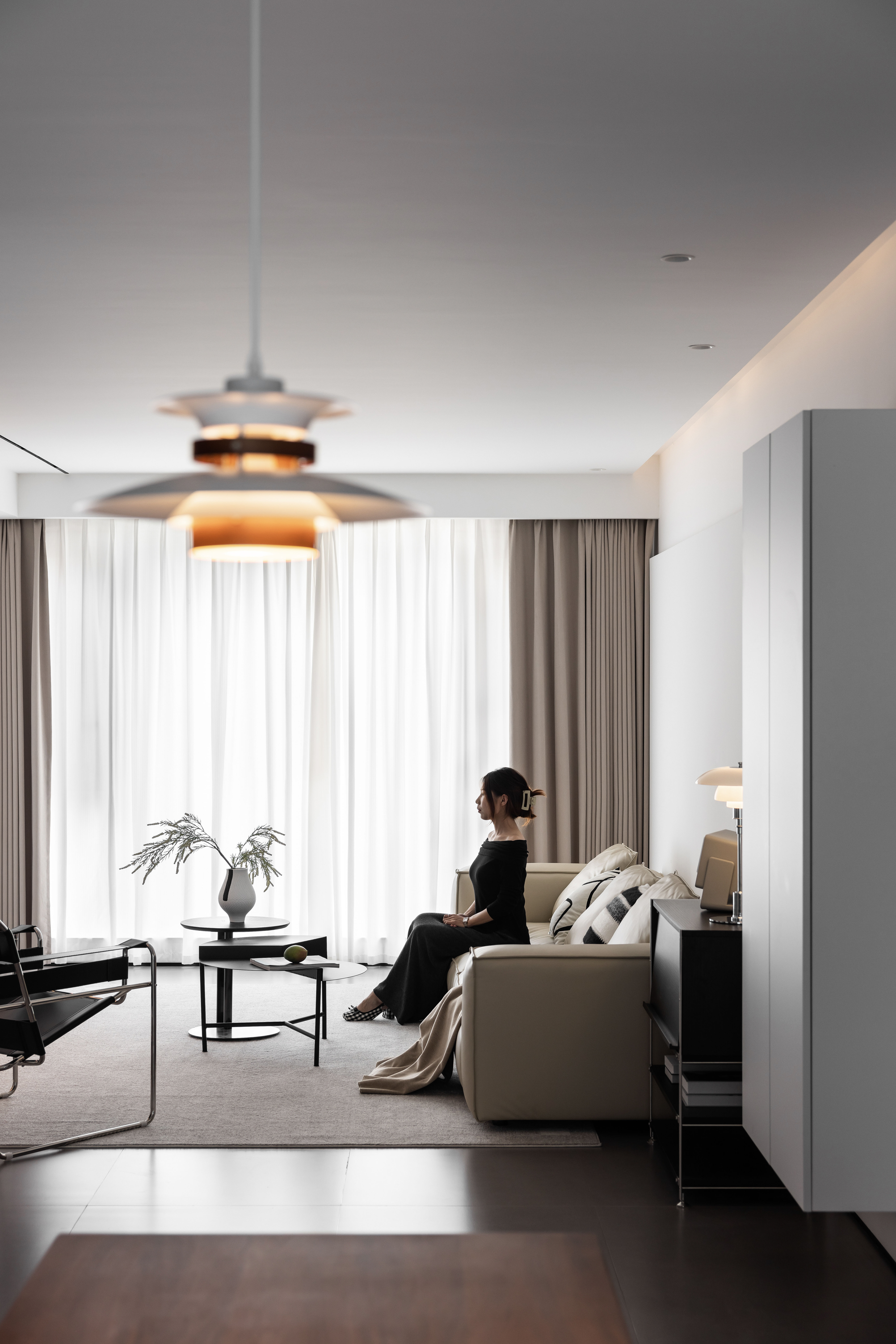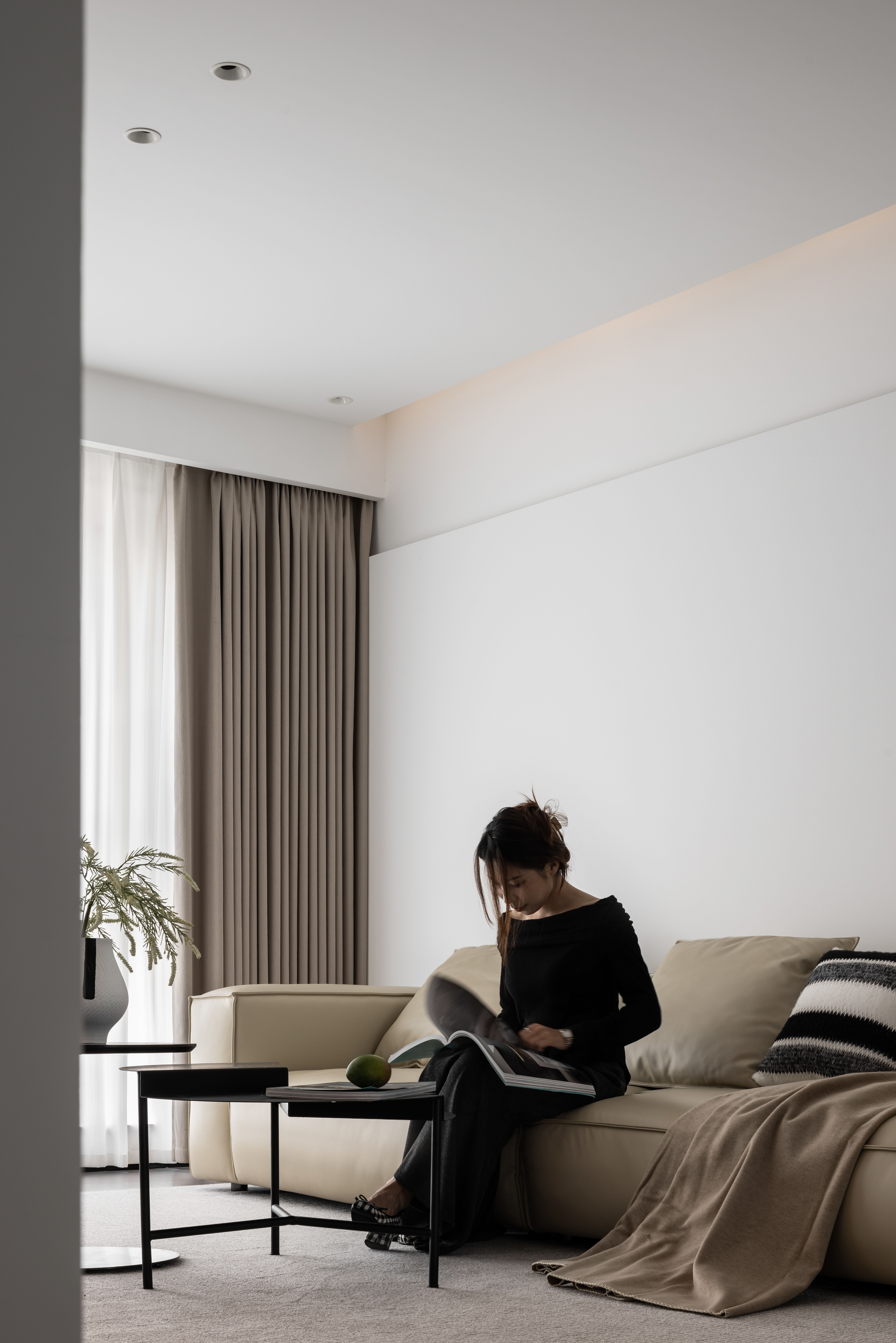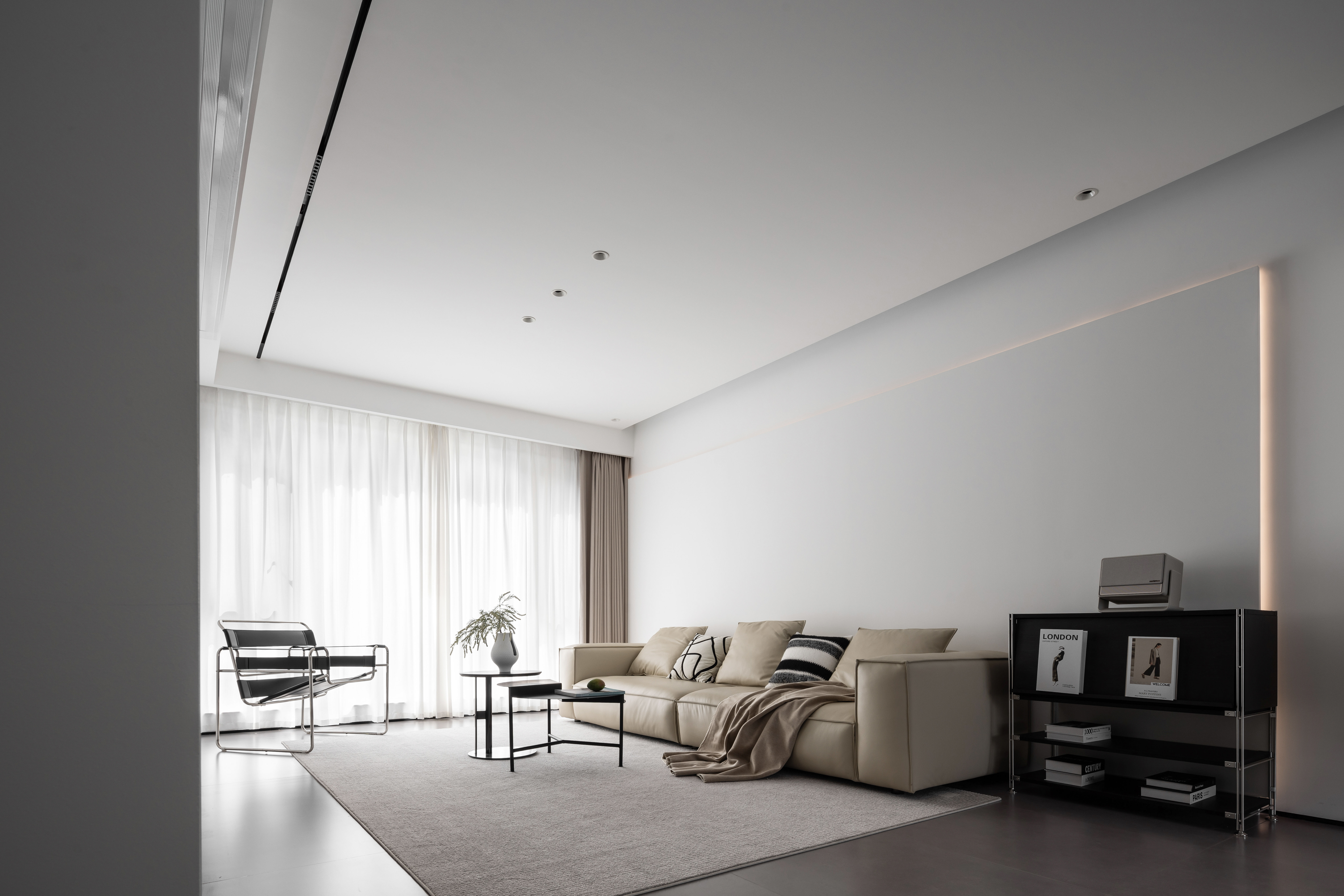 空间意境:全房以极简主义的线条和柔和的色彩搭配,营造出一种宁静而温馨的氛围,大面积的底色留白,给予空间最大尺度的自由,视觉层次赋能生活精雅的品味彰显。巨大的落地窗为空间带来充沛的光线力量,用更具开放式的布局,引导居住者去探索更自在,惬意的生活方式。