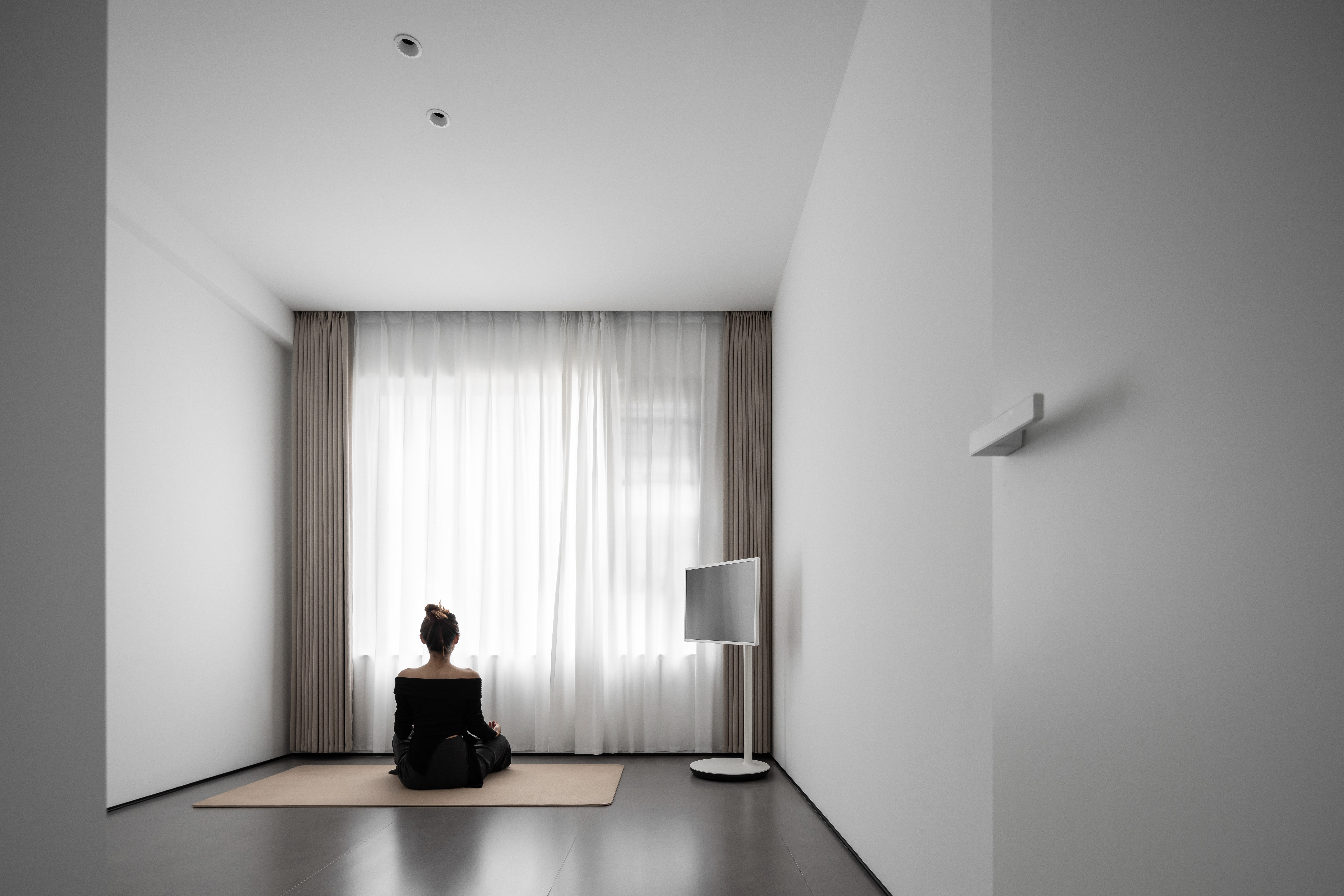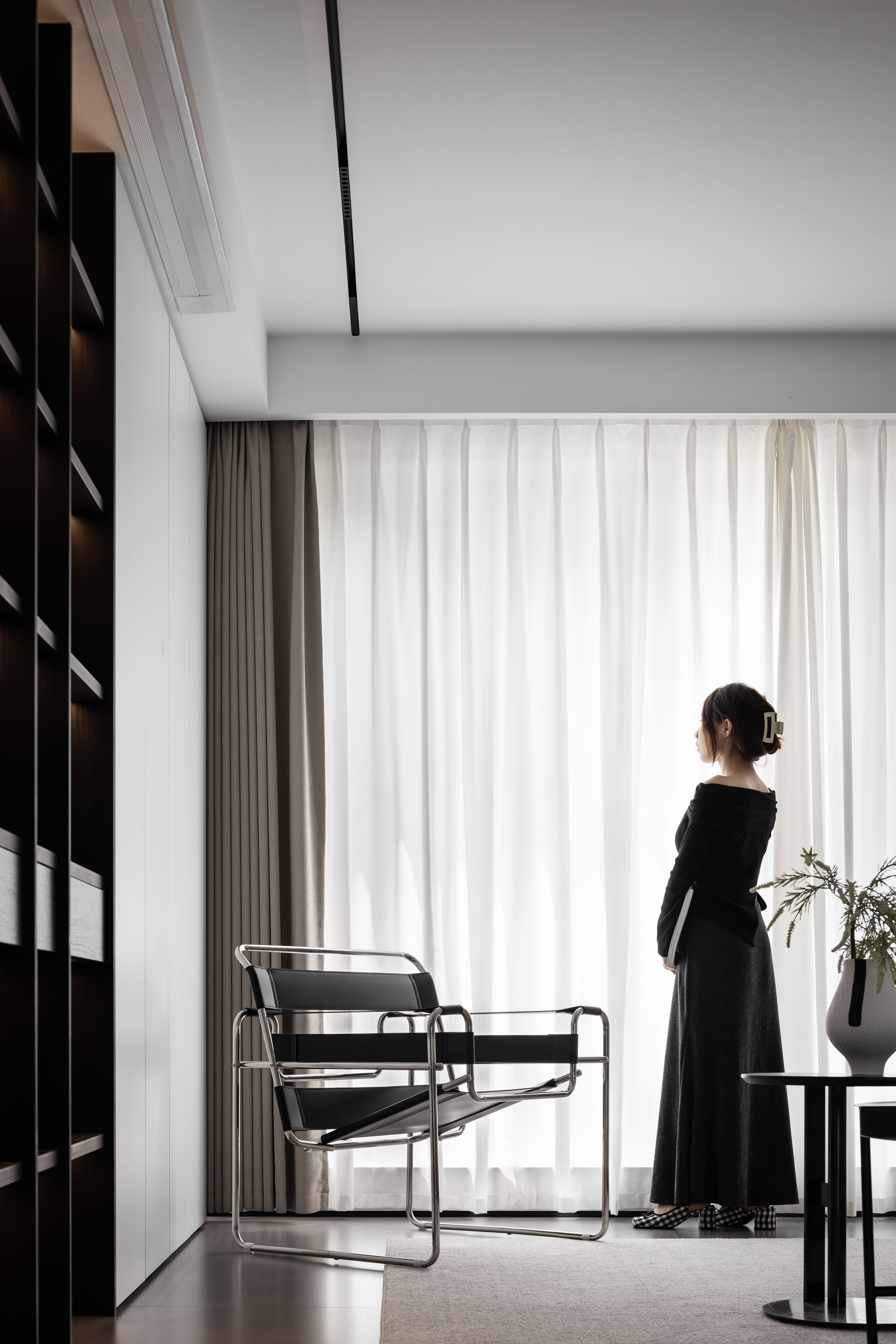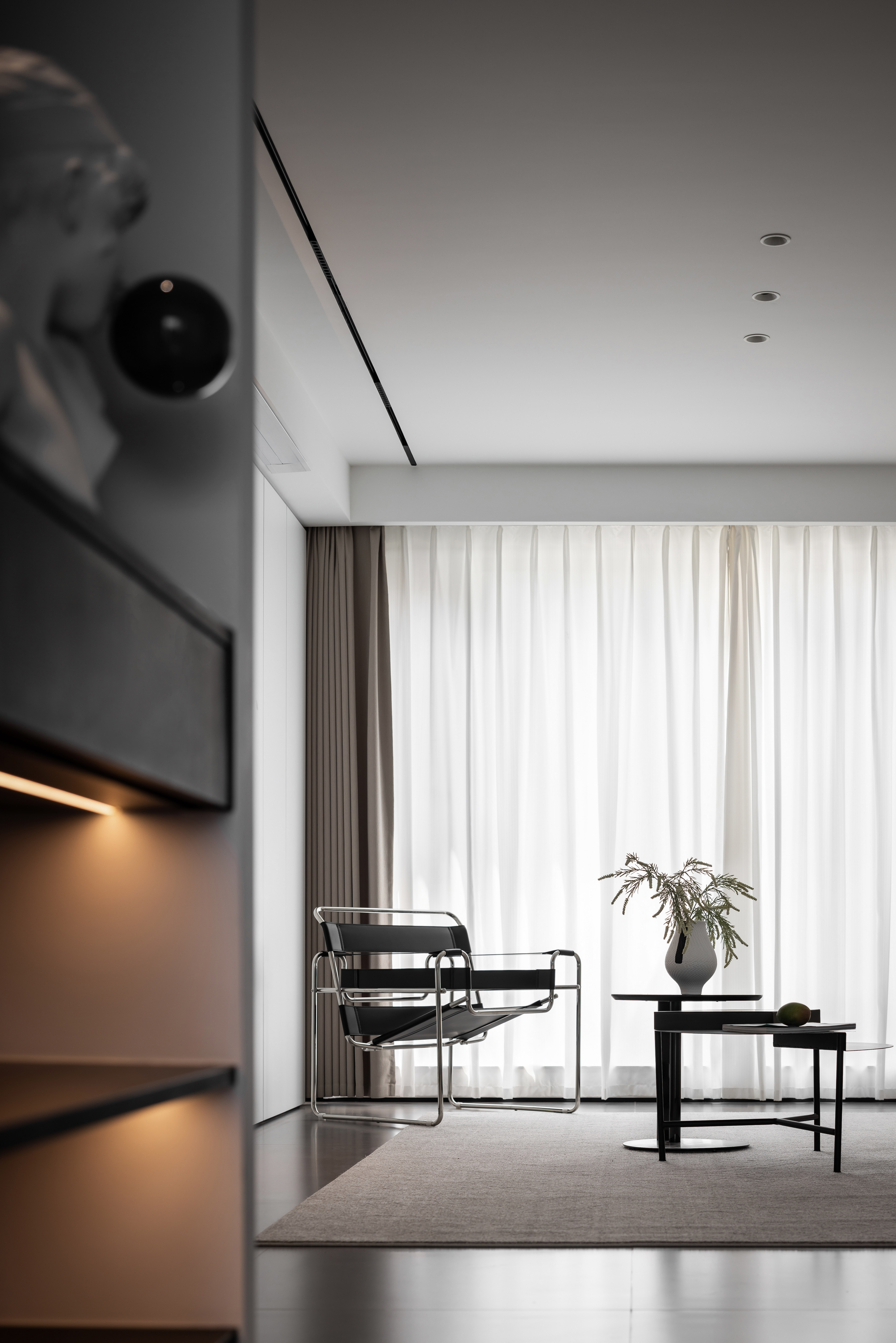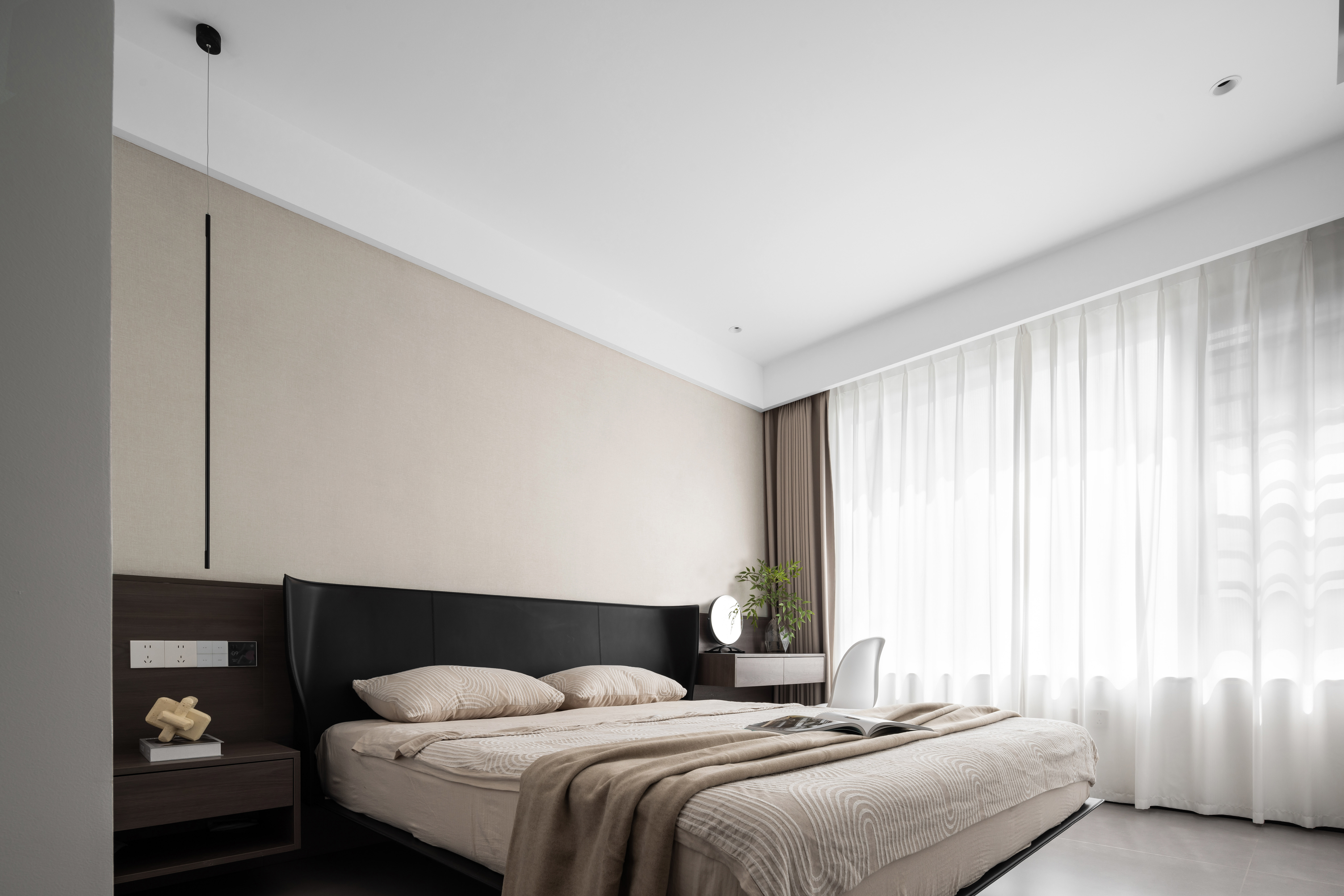 空间意境:全房以极简主义的线条和柔和的色彩搭配,营造出一种宁静而温馨的氛围,大面积的底色留白,给予空间最大尺度的自由,视觉层次赋能生活精雅的品味彰显。巨大的落地窗为空间带来充沛的光线力量,用更具开放式的布局,引导居住者去探索更自在,惬意的生活方式。