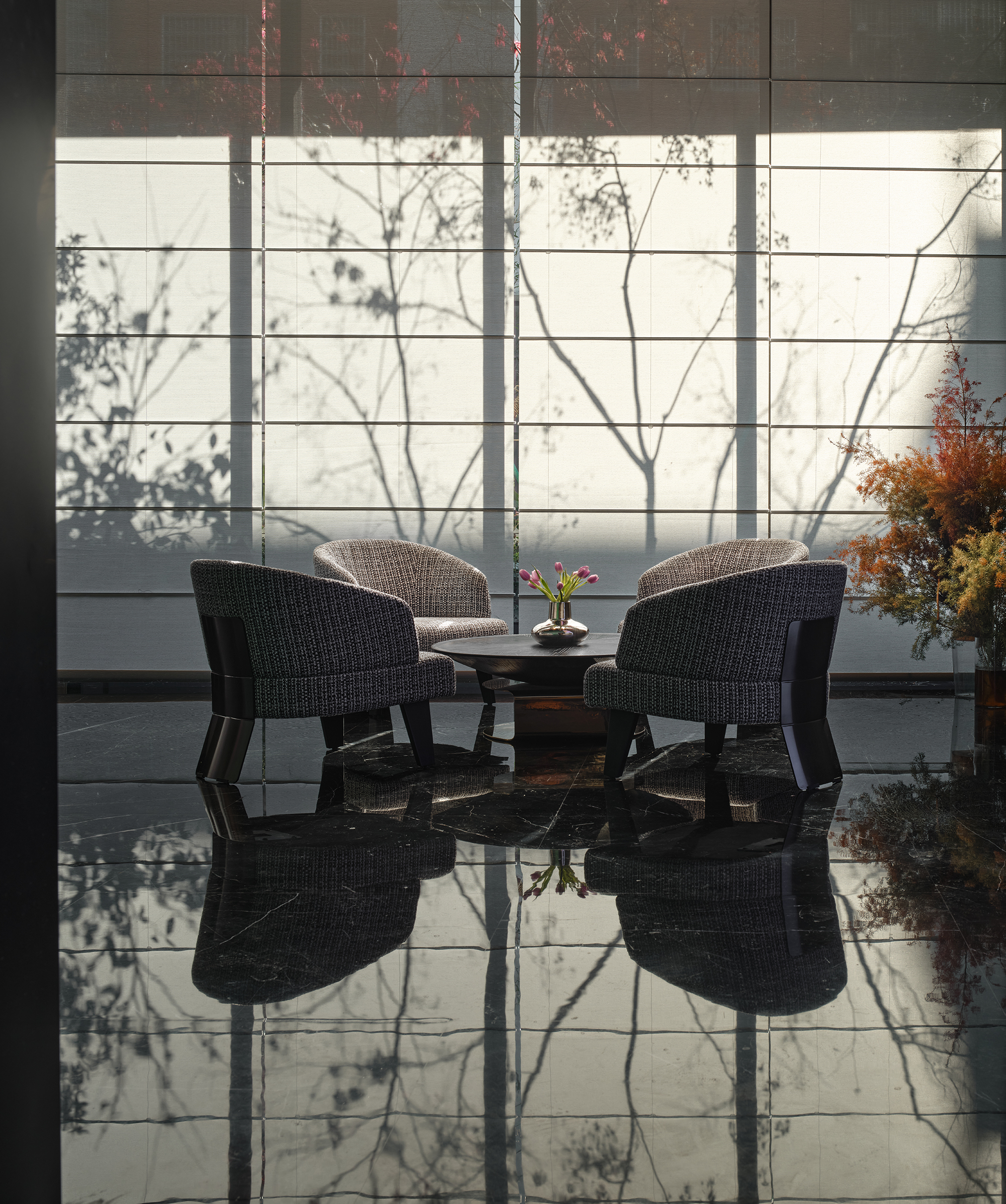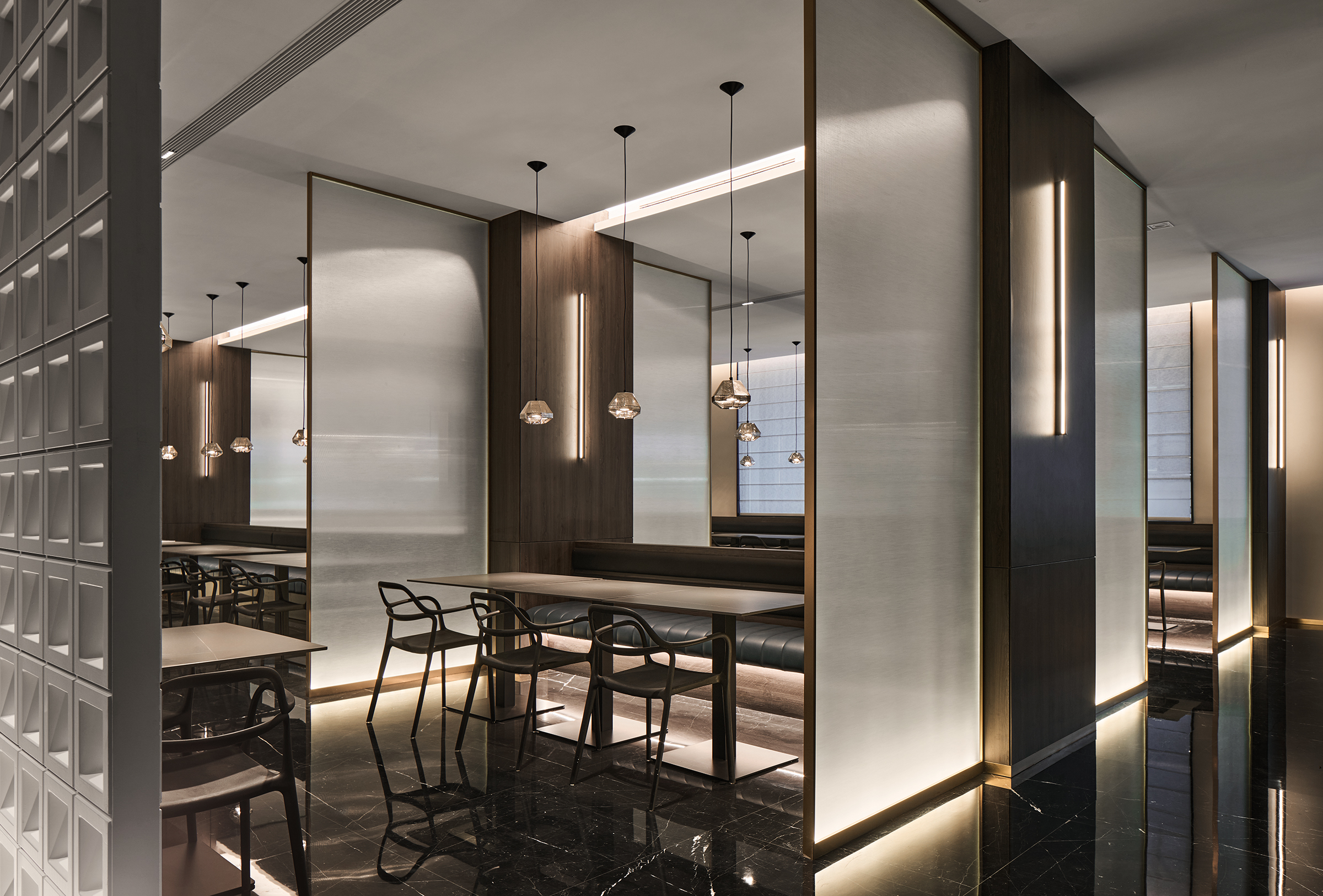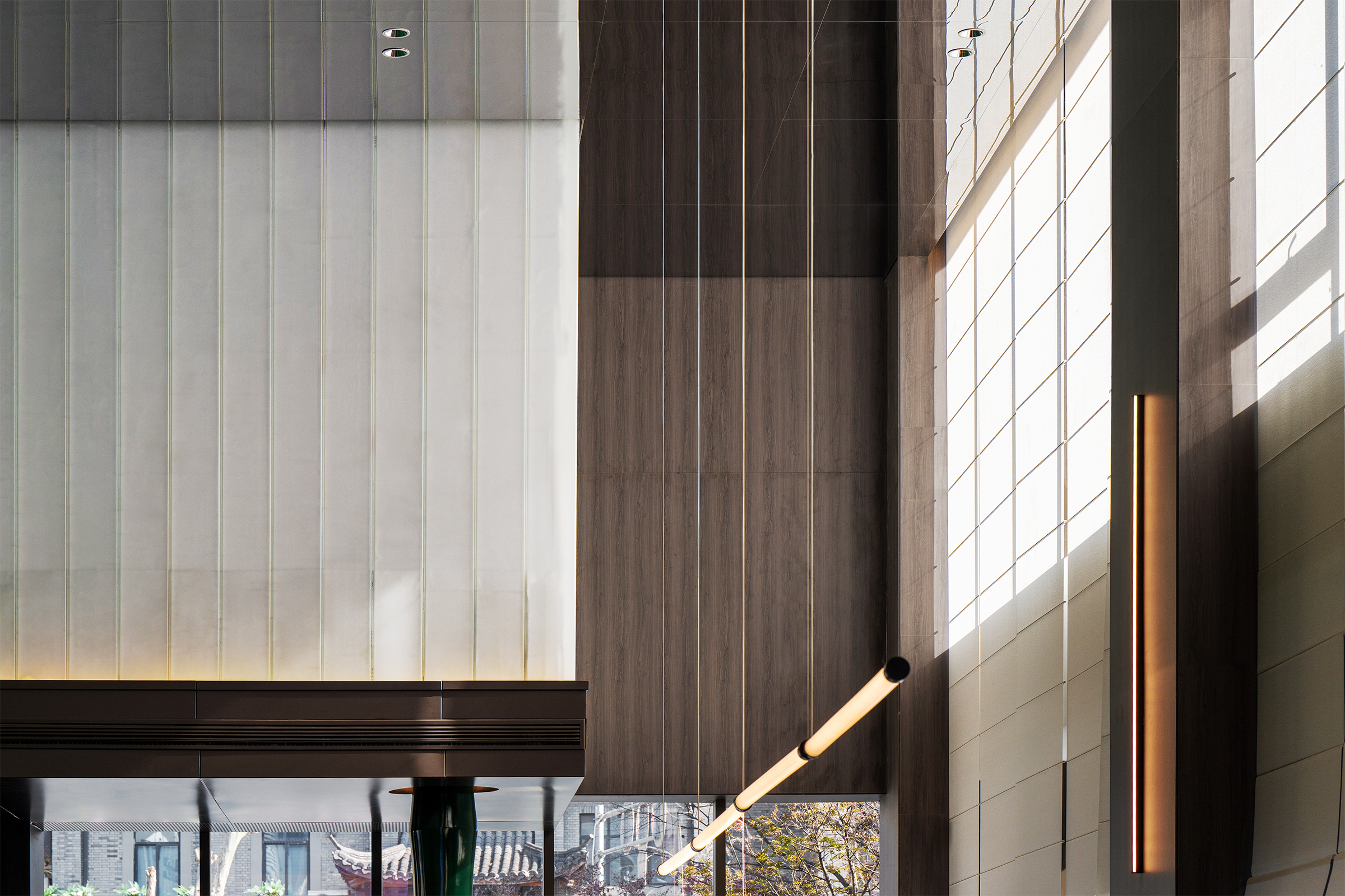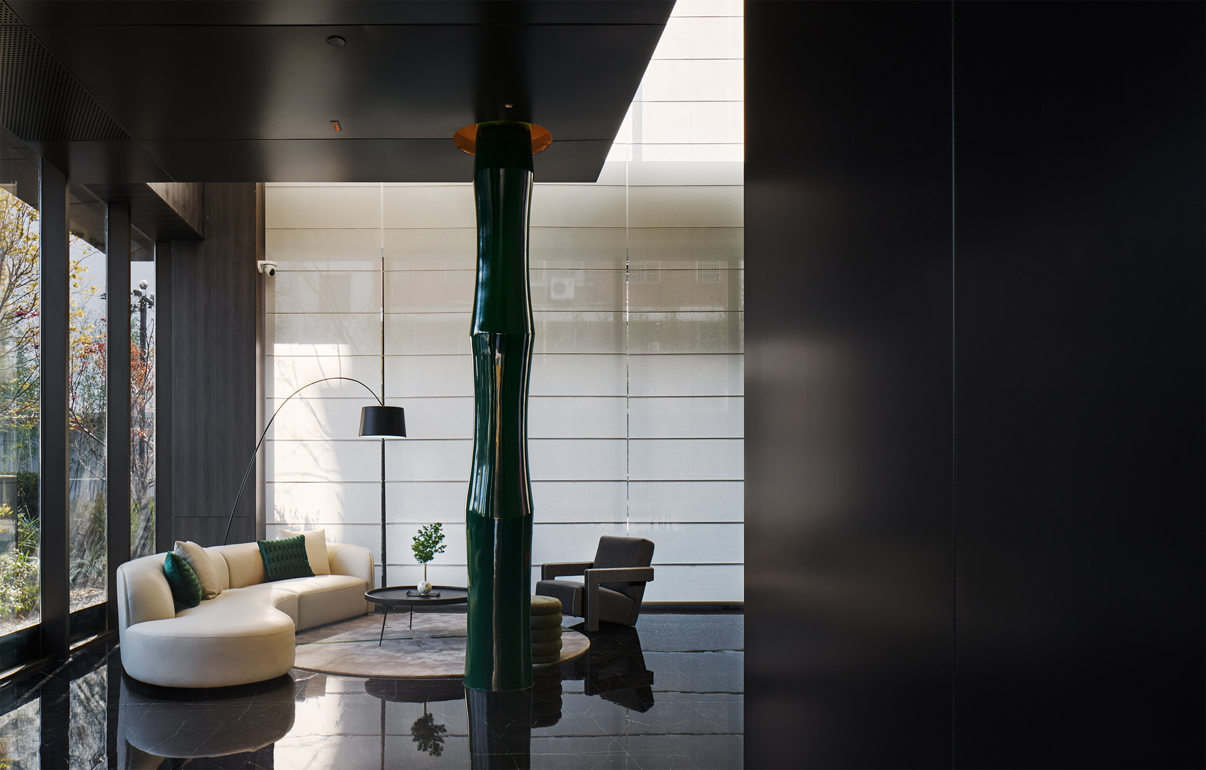 空间布局:环绕式的落地窗将内景与外景的水域与竹林相连接,打破空间的边界。酒店前台与竹墙对立安置、顺道延展,竹墙上倒映着林间余晖,宁静而温柔,述说着自然之美。现代化与自然感的雅致,是人类文明与大自然对话的体现。踏入相对较低的空间,转弯即刻进入狭长的空间。我们捕捉着空间的独有特征,试图赋予它更深层次的意义。于是,我们用镜面不锈钢的材质对空间顶部进行处理,使其呈现出如同峡谷般的窄长感。走进这一空间,个体的渺小与狭长空间形成显著对比,将真实体验转化为对空间本质的感知。